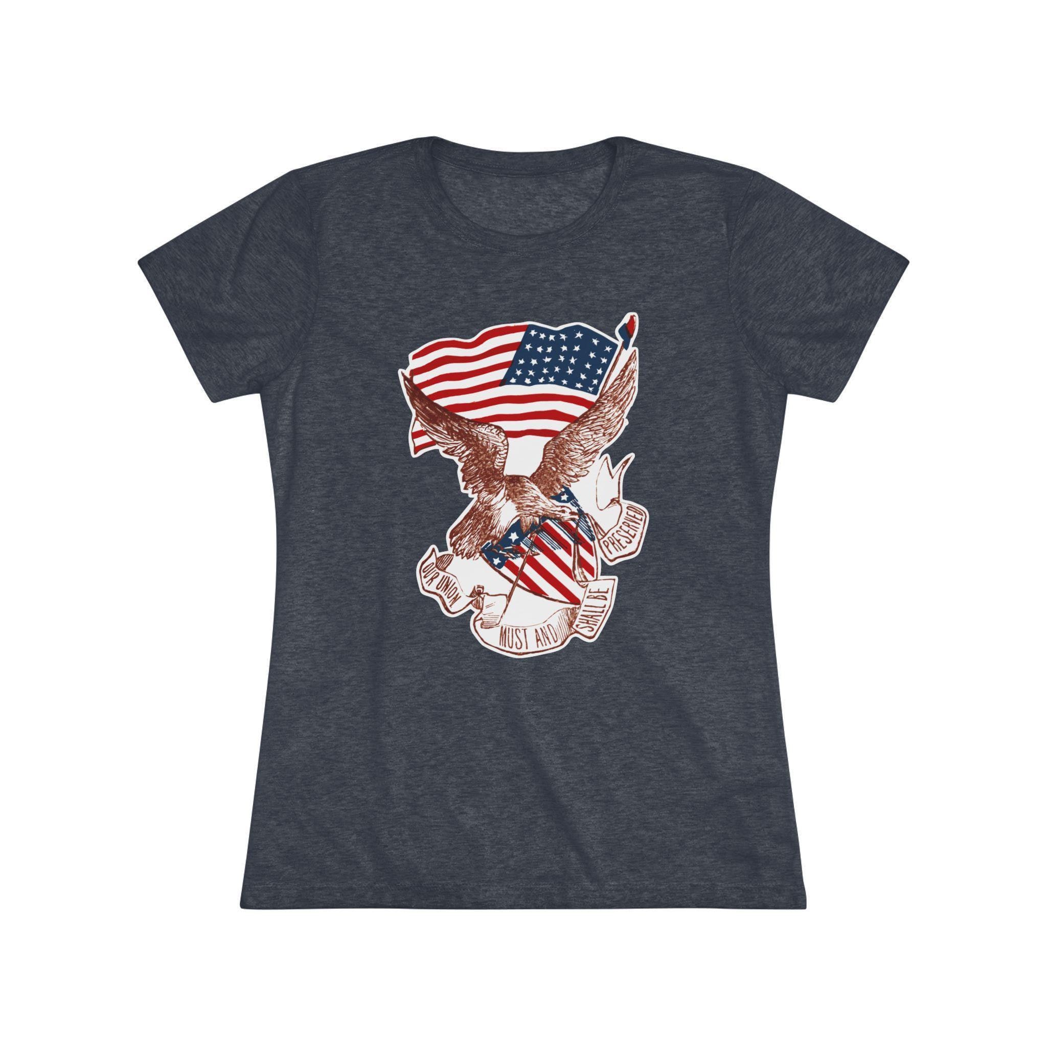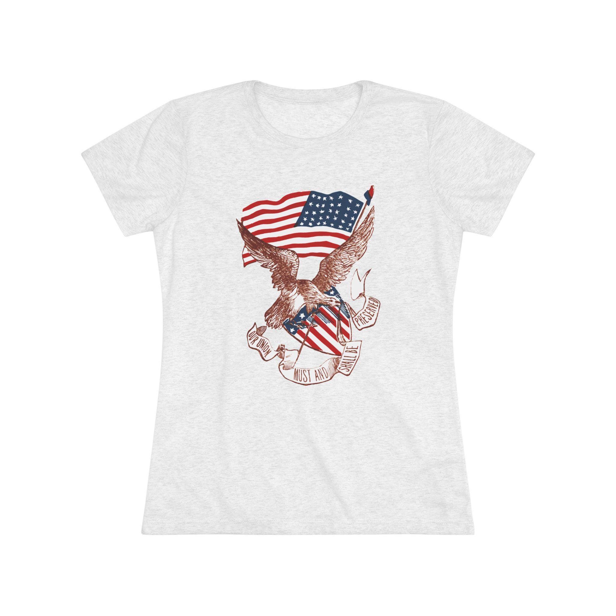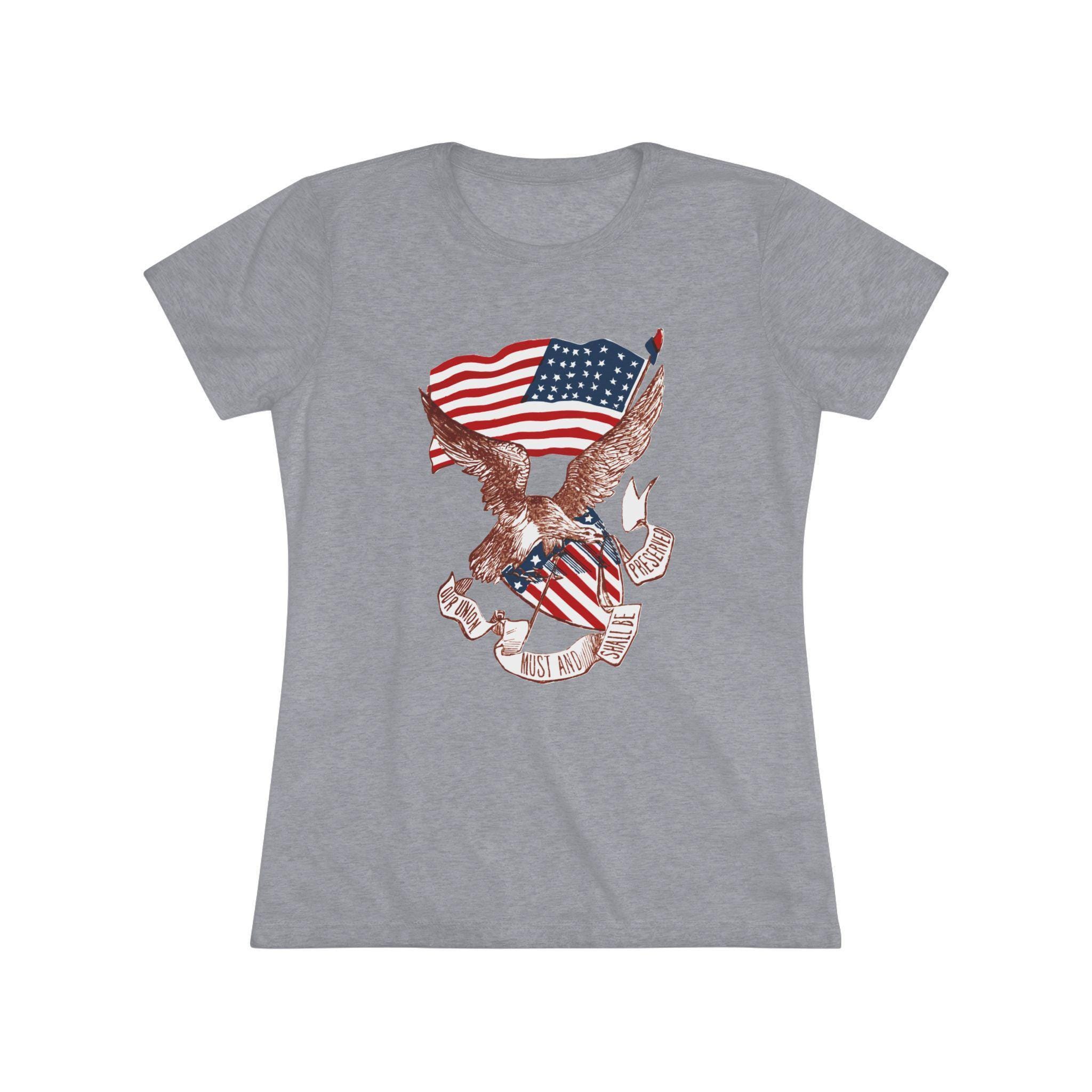 This women's t-shirt combines a powerful piece of American history with a comfortable and stylish fit. The design is a restored pro-Union stamp from the Civil War, featuring a majestic eagle paired with a Phrygian "Liberty Cap" to symbolize the fight for freedom. The banner's vow, "OUR UNION MUST AND SHALL BE PRESERVED," is an uncompromising statement of resolve. This soft, contoured tee is a perfect way to wear a piece of profound history that speaks to the core principles of the nation.