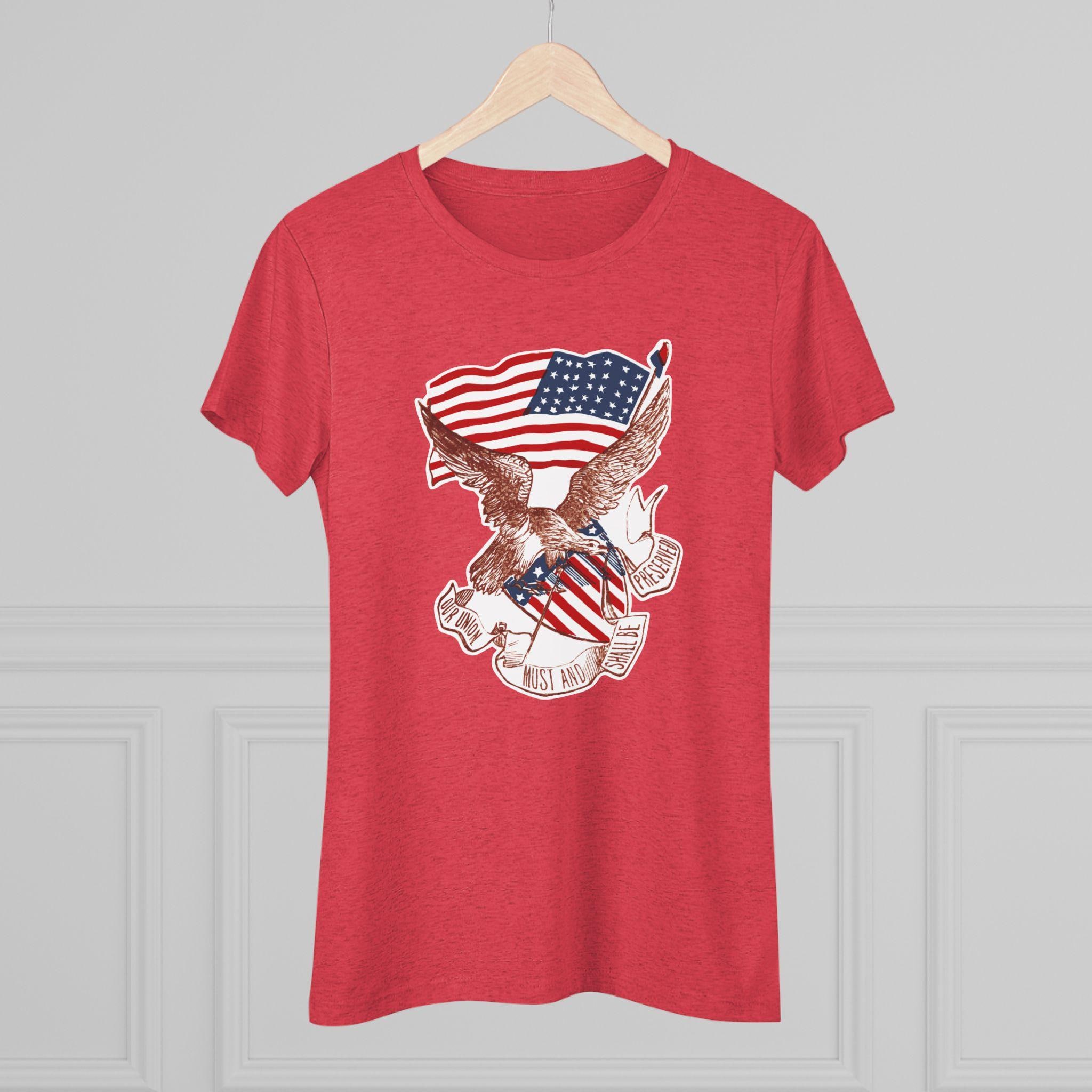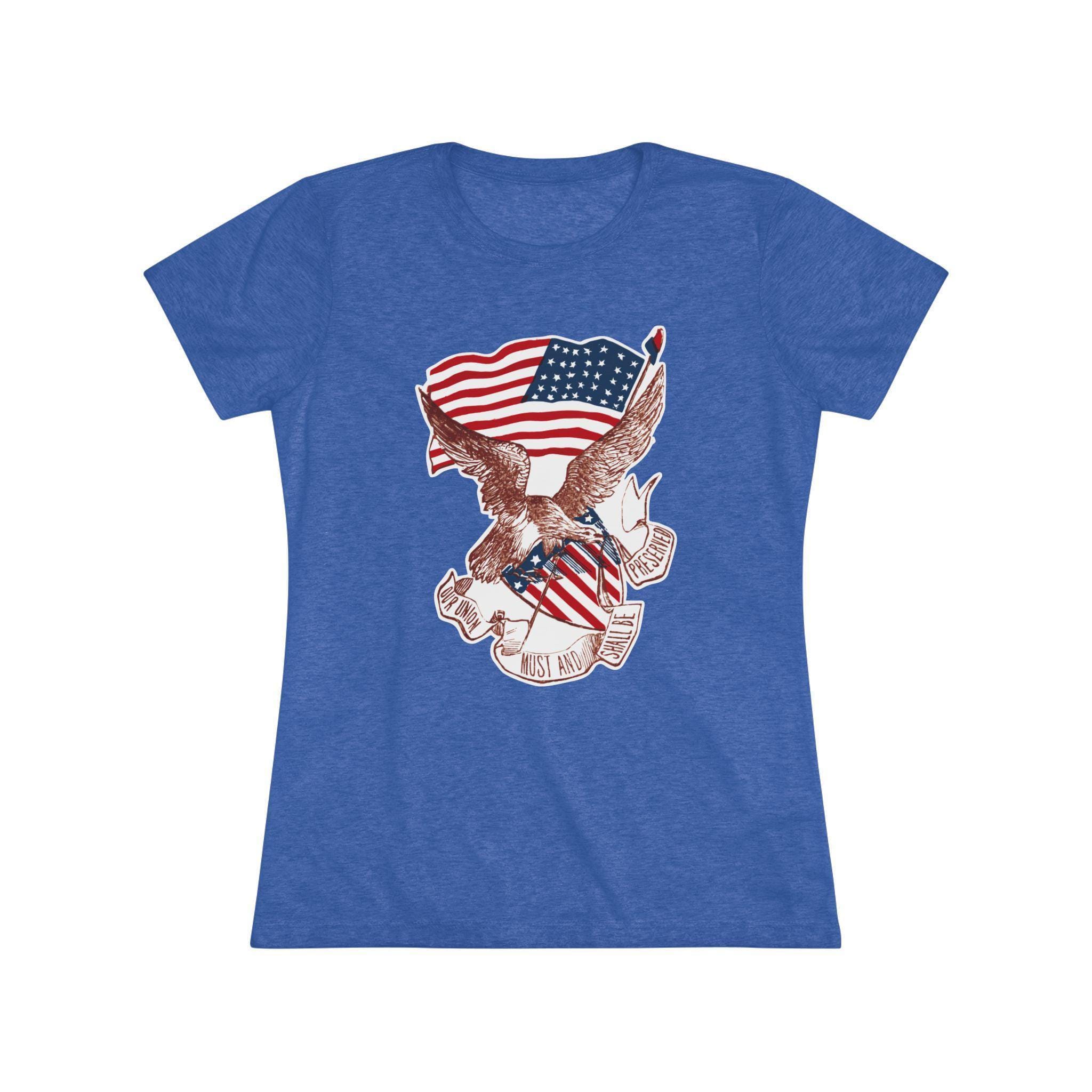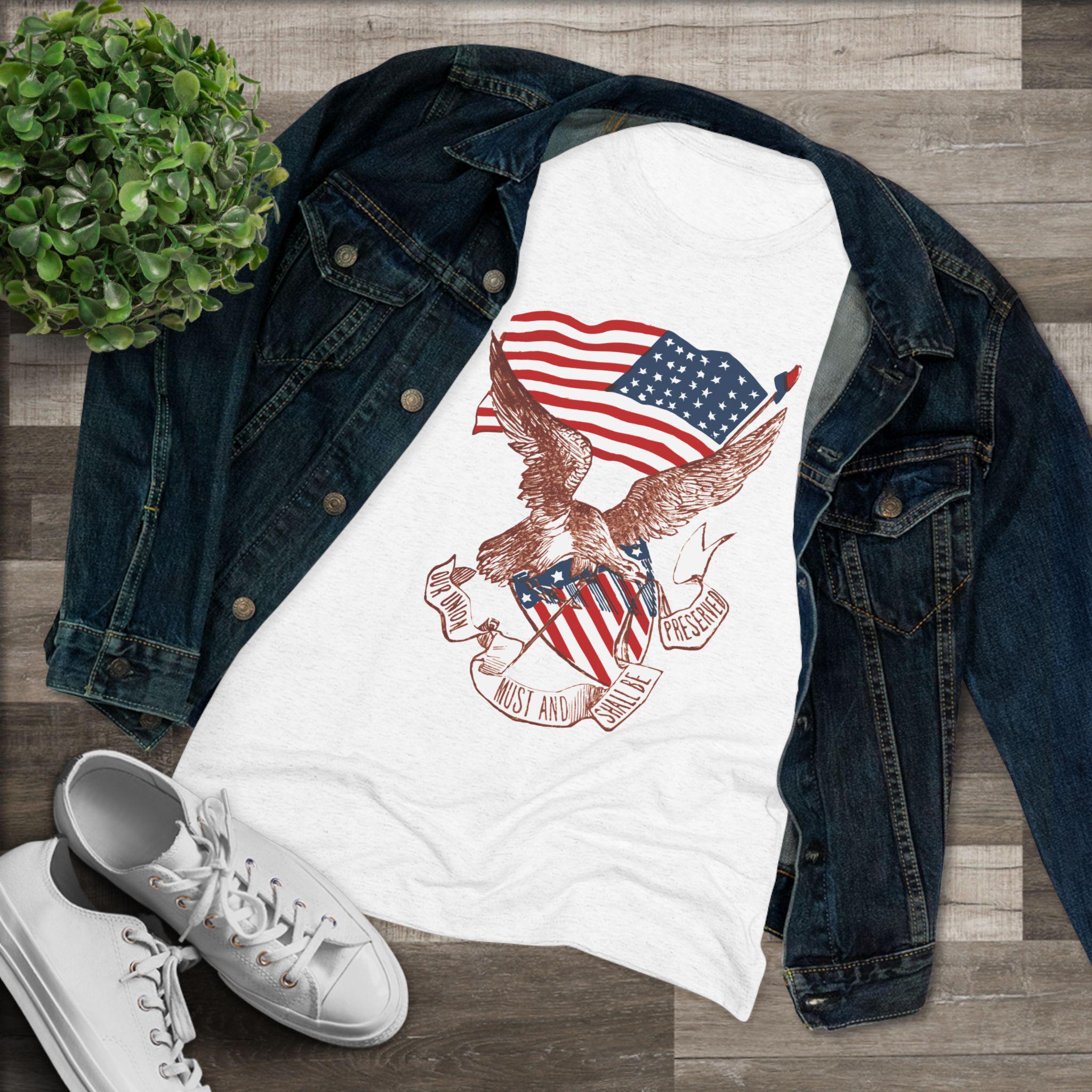This women's t-shirt combines a powerful piece of American history with a comfortable and stylish fit. The design is a restored pro-Union stamp from the Civil War, featuring a majestic eagle paired with a Phrygian "Liberty Cap" to symbolize the fight for freedom. The banner's vow, "OUR UNION MUST AND SHALL BE PRESERVED," is an uncompromising statement of resolve. This soft, contoured tee is a perfect way to wear a piece of profound history that speaks to the core principles of the nation.