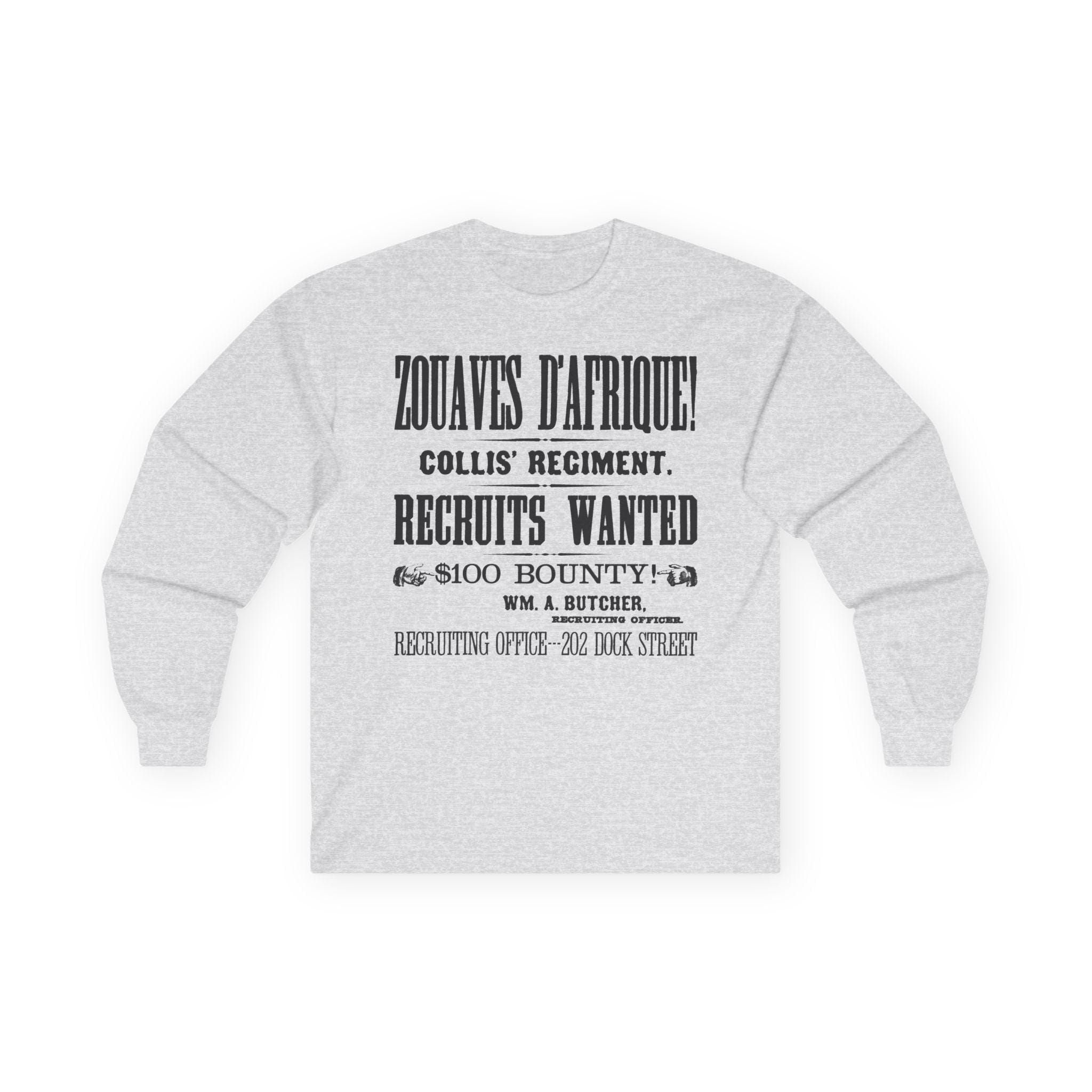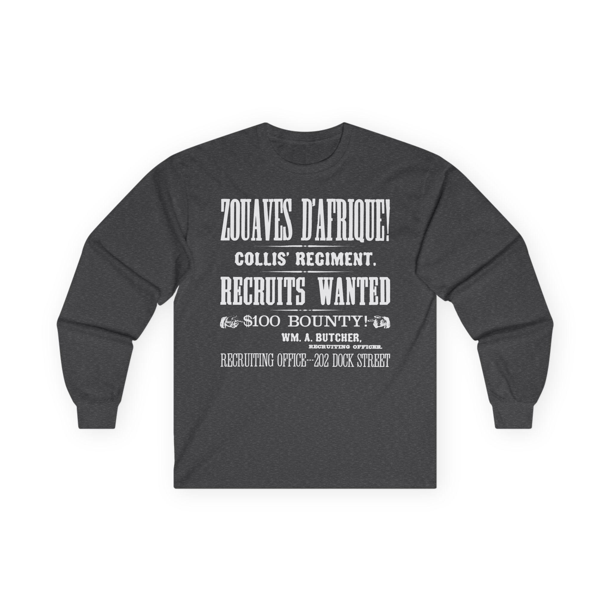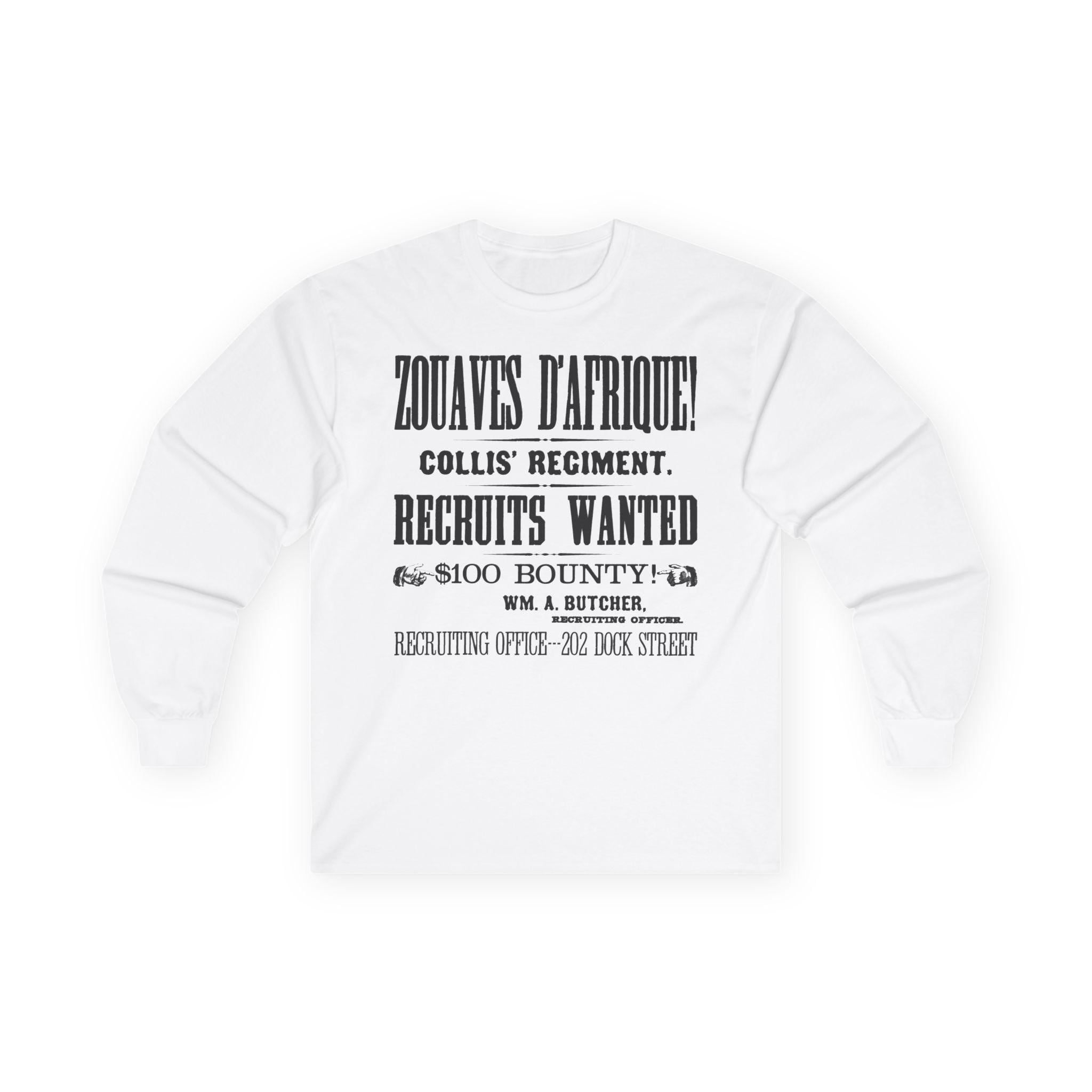 This comfortable longsleeve tee is the perfect layer for fall and a fantastic conversation starter. The design is a restored, abbreviated version of a 19th-century recruitment poster for Collis' Regiment of Zouaves d'Afrique. It features all the key details—the unit's name, the call for recruits, the $100 bounty, and the Philadelphia recruiting office—all rendered in stunning, period-authentic typography. It's a stylish, minimalist take on a rich historical document.