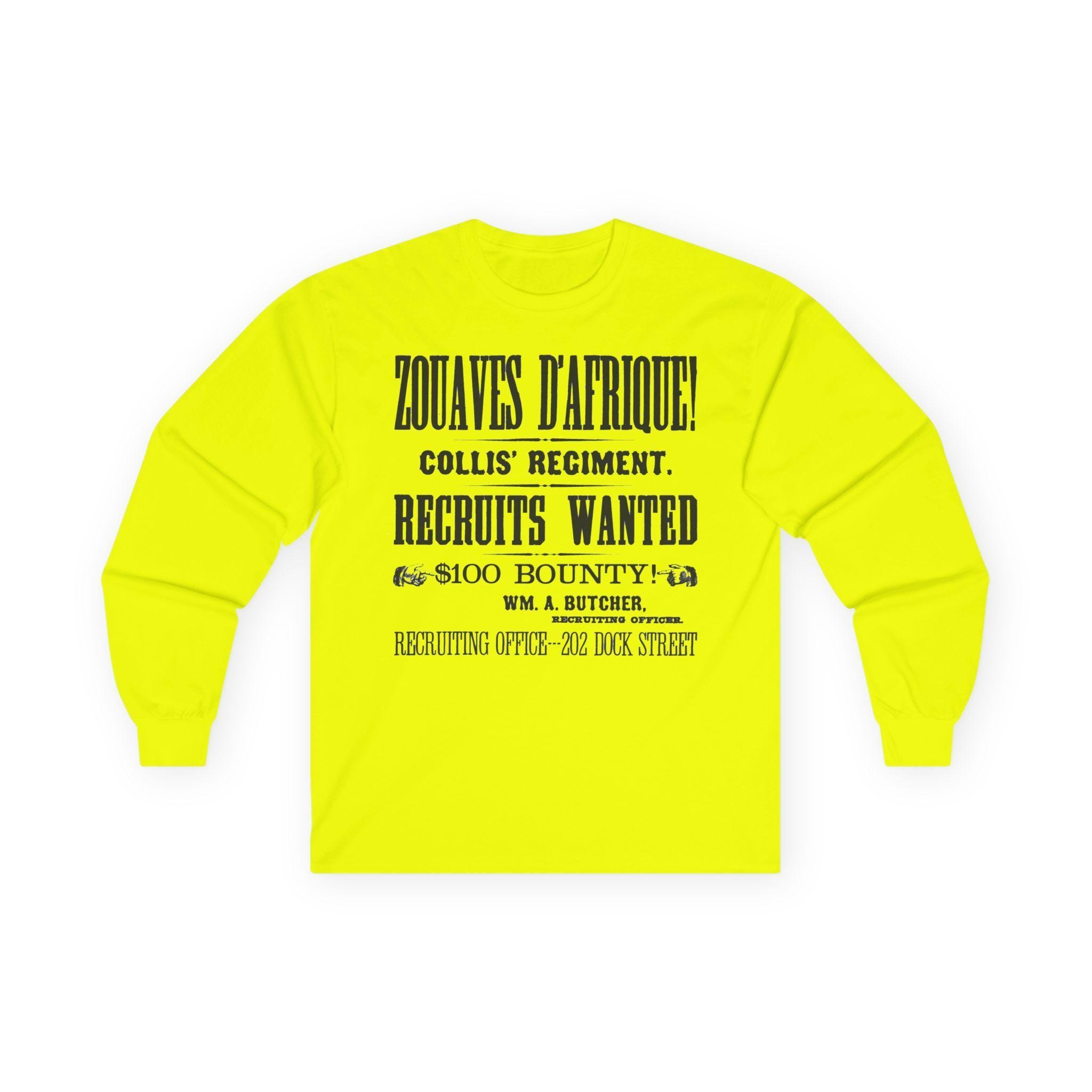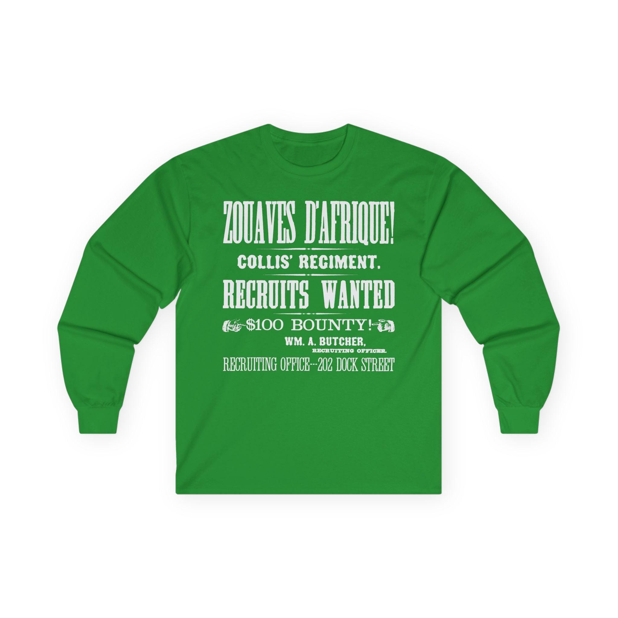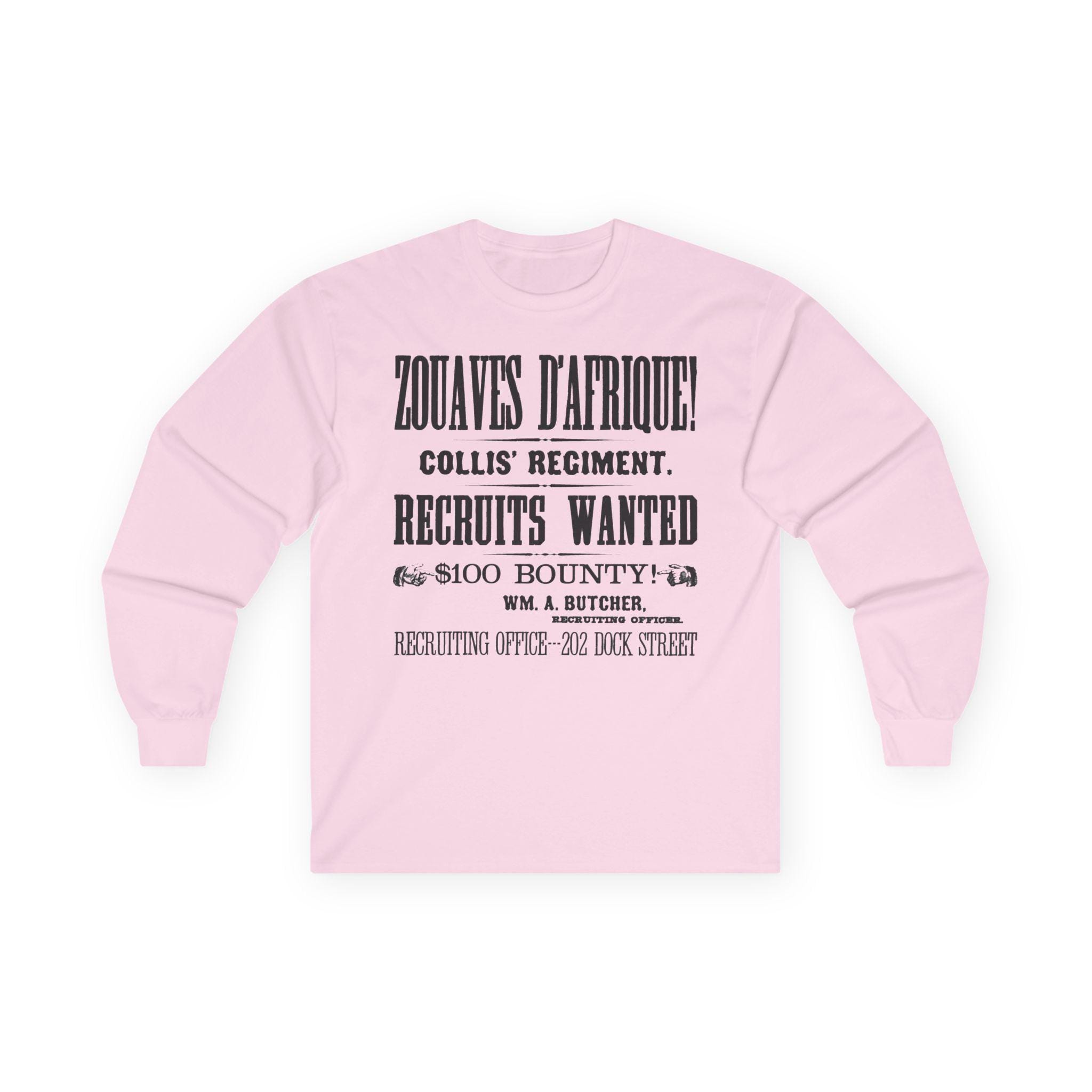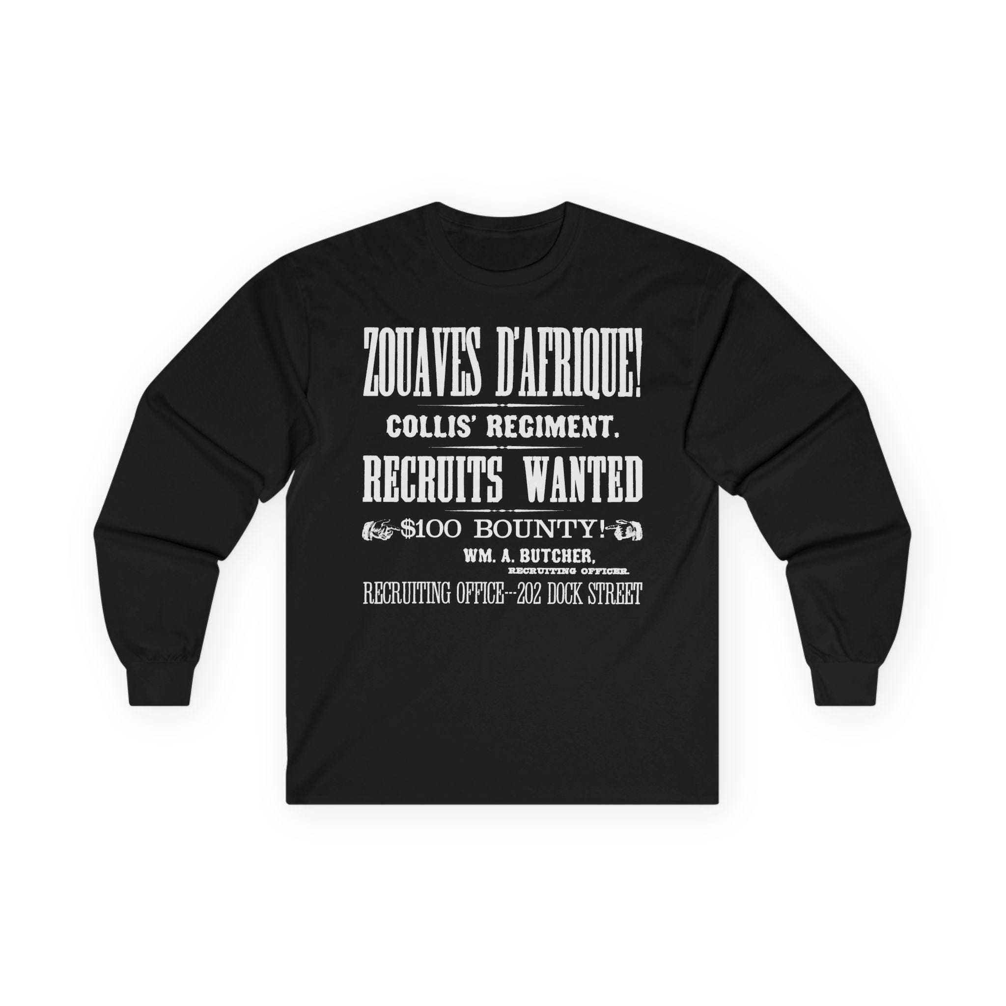 This comfortable longsleeve tee is the perfect layer for fall and a fantastic conversation starter. The design is a restored, abbreviated version of a 19th-century recruitment poster for Collis' Regiment of Zouaves d'Afrique. It features all the key details—the unit's name, the call for recruits, the $100 bounty, and the Philadelphia recruiting office—all rendered in stunning, period-authentic typography. It's a stylish, minimalist take on a rich historical document.
