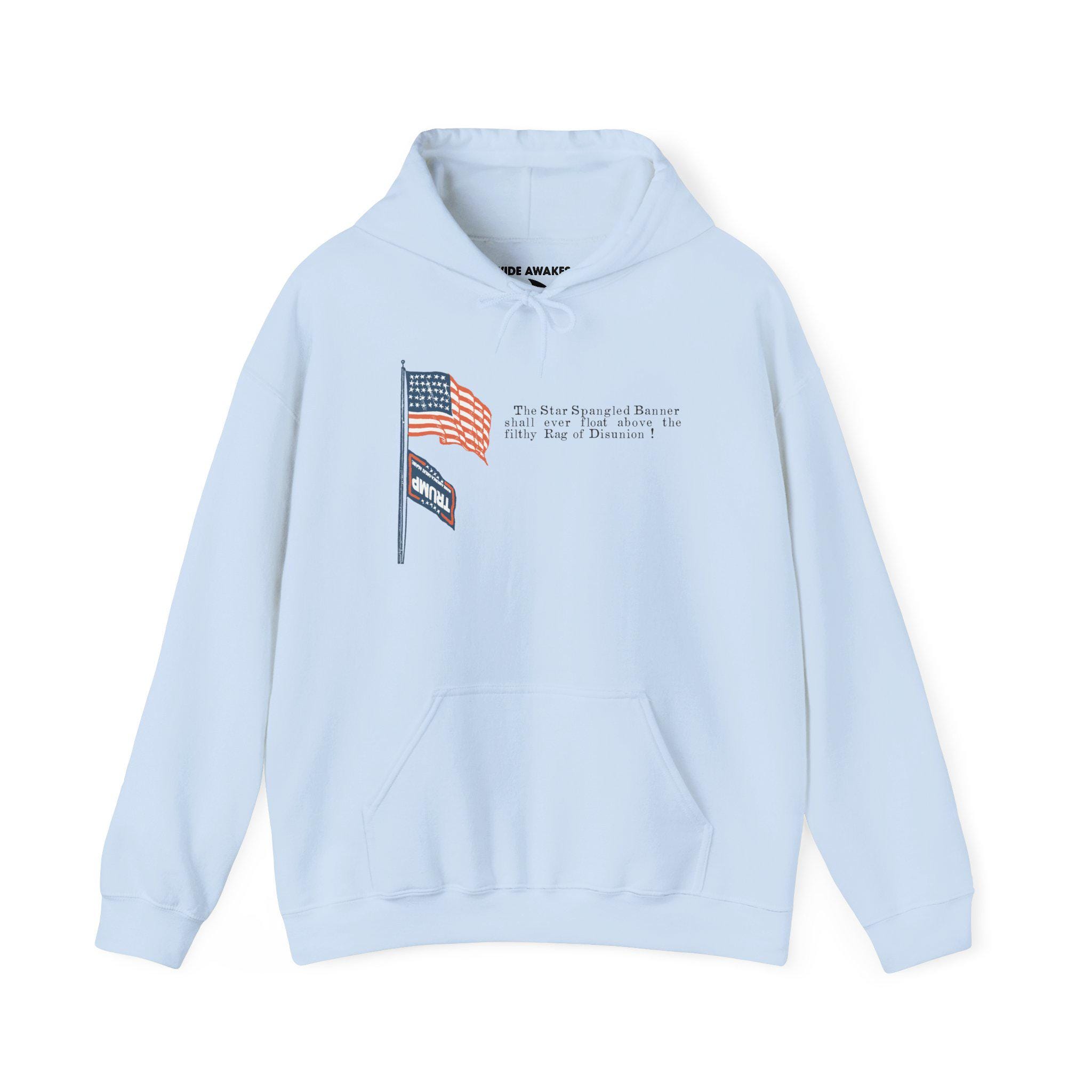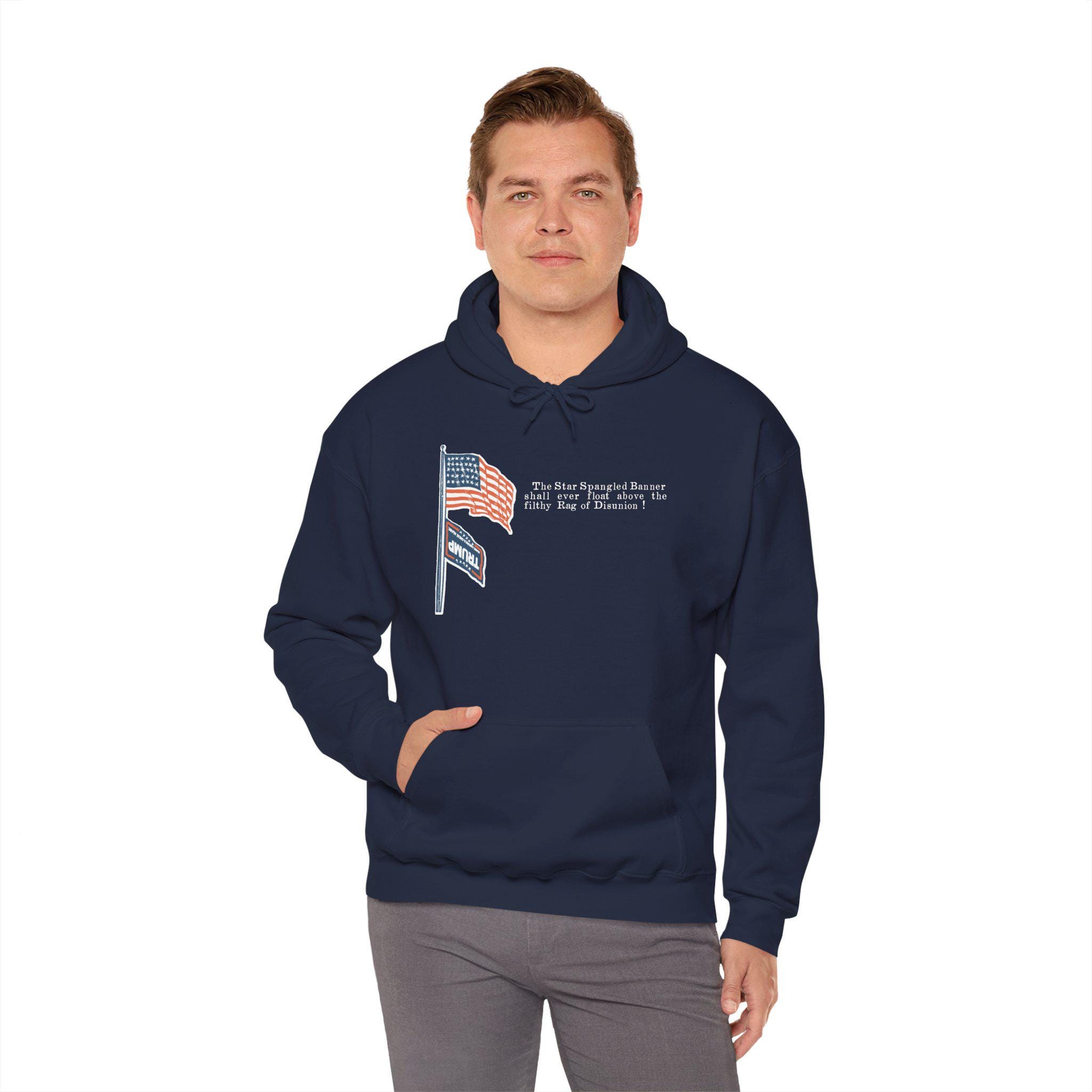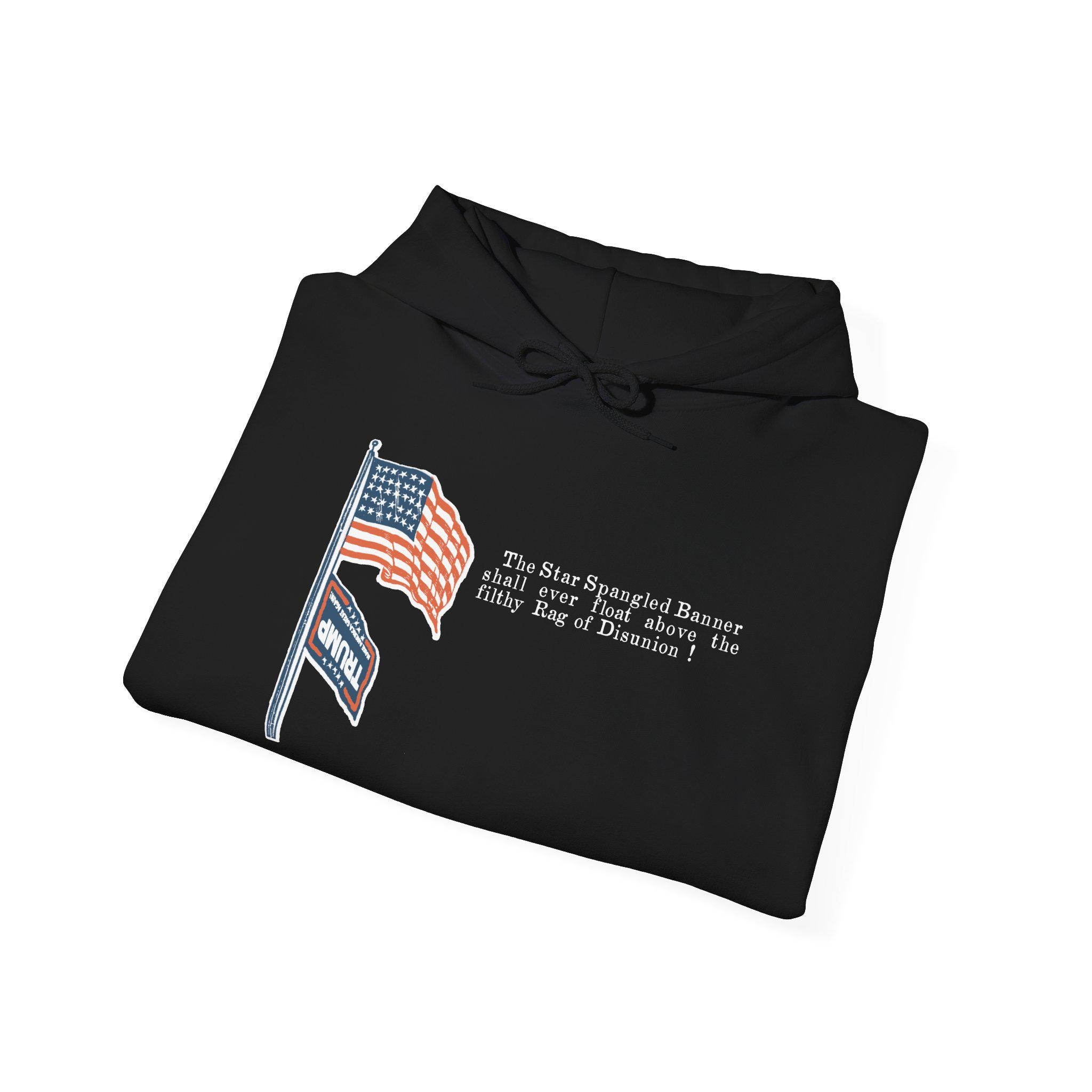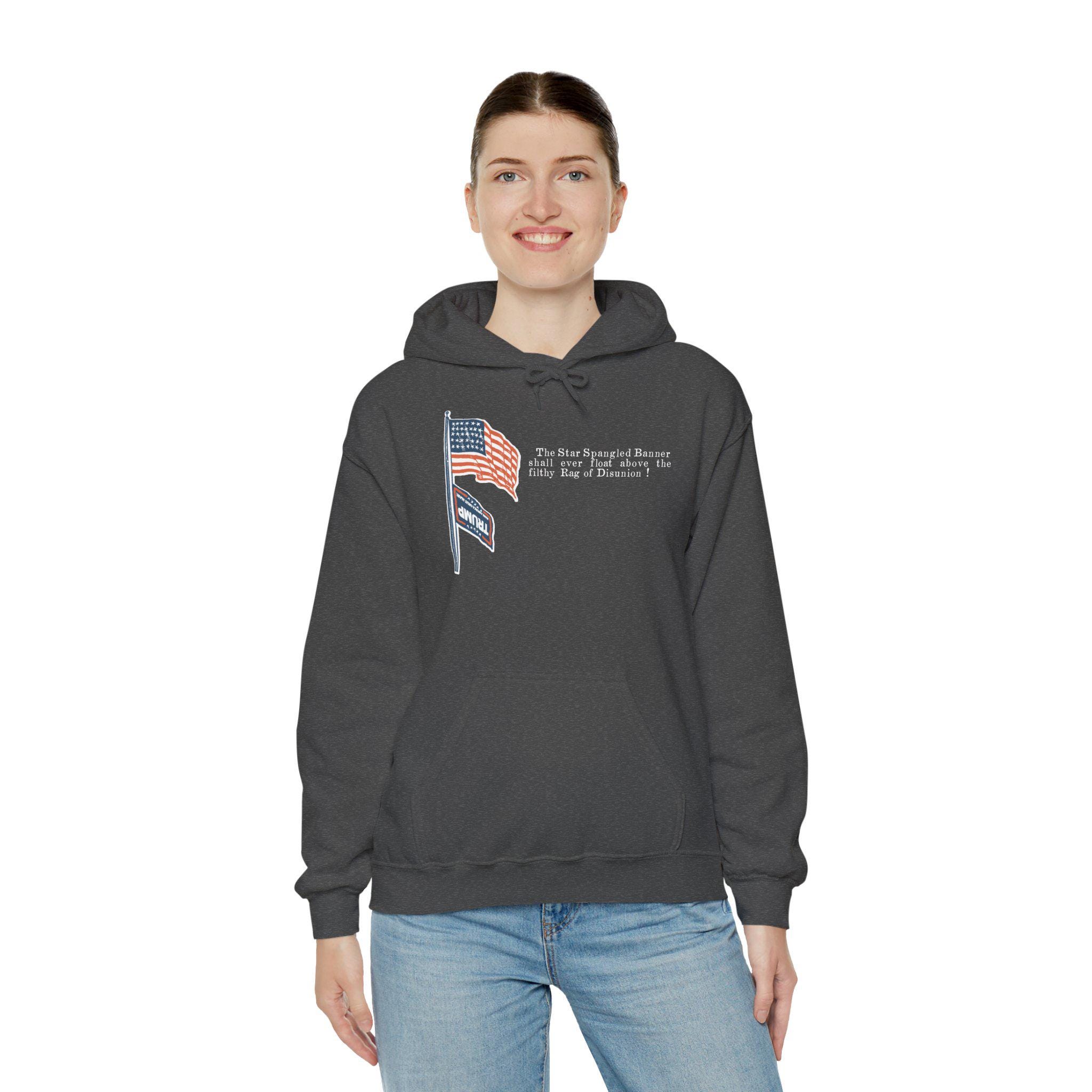 This warm and comfortable hoodie features a powerful design that uses a Civil War-era template to comment on today's politics. The original pro-Union stamp showed the Stars and Stripes flying over a dishonored Confederate flag. This version updates that "Rag of Disunion" with the MAGA flag, making a direct and unapologetic statement. With a soft fleece interior and a spacious front pocket, this is the perfect gear for anyone who believes in the Union and stands against the modern forces of division.