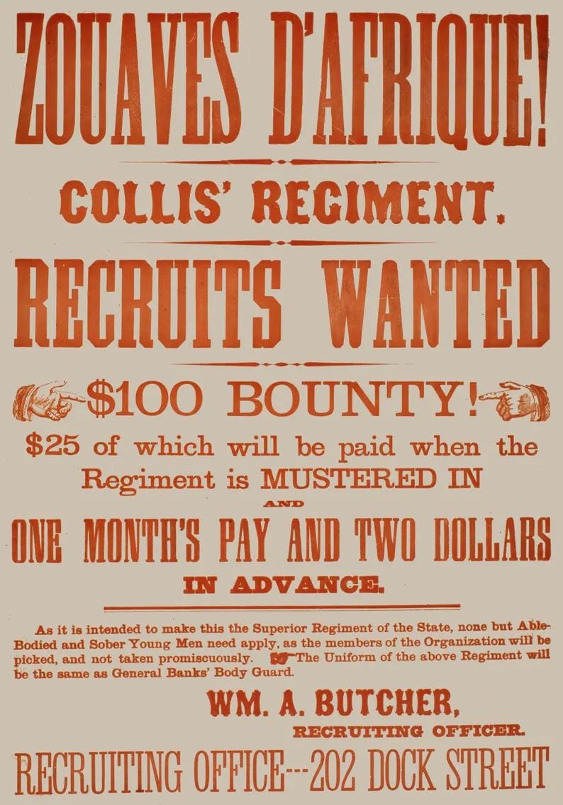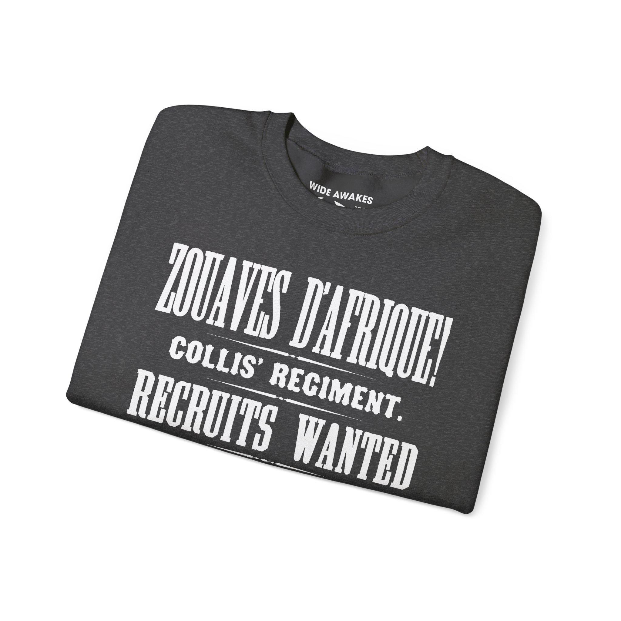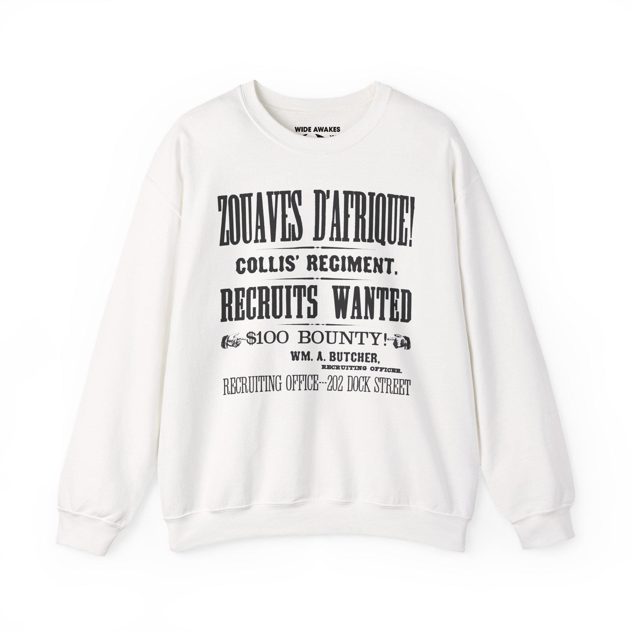 Stay warm this fall with a cozy crewneck sweatshirt that is also a piece of 19th-century design history. The artwork is an abbreviated version of a stunning, typography-focused recruitment poster for Philadelphia's famed Zouaves d'Afrique (Collis' Regiment). The design uses a variety of classic fonts to highlight the key details that would entice a new recruit: the elite unit's name, the bold declaration of "RECRUITS WANTED," and the eye-catching "$100 BOUNTY." It's a celebration of the printer's art and a tribute to the soldiers who answered the call.