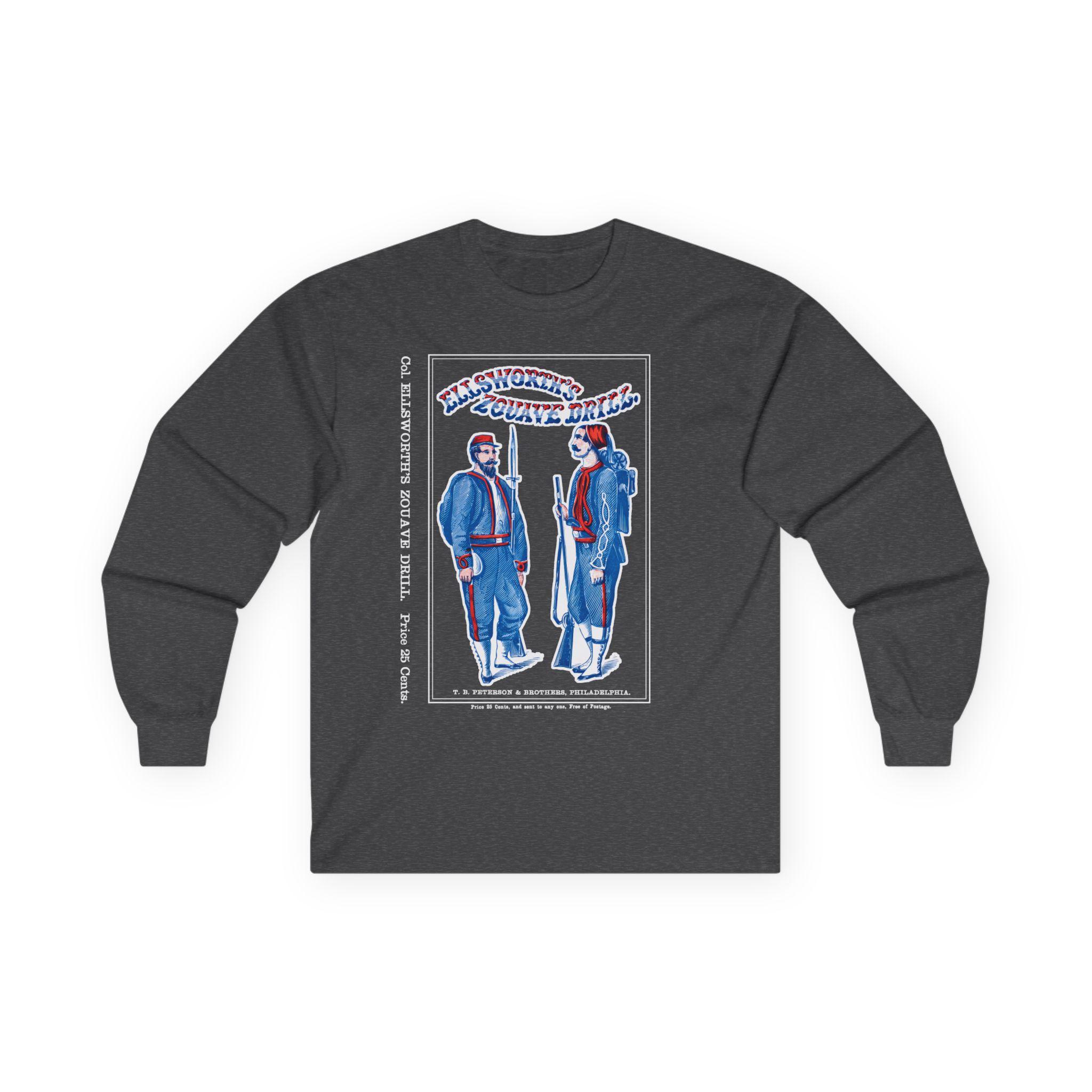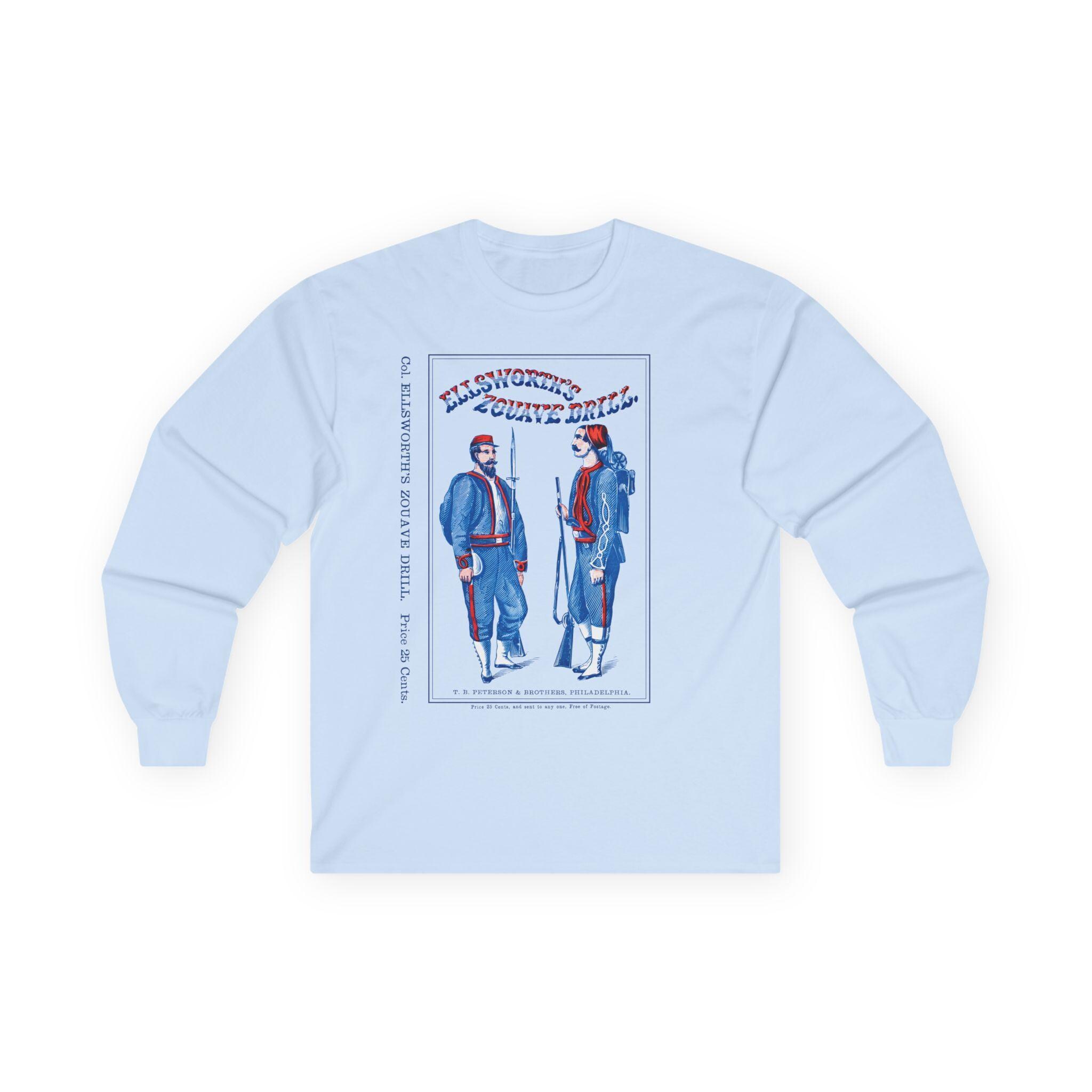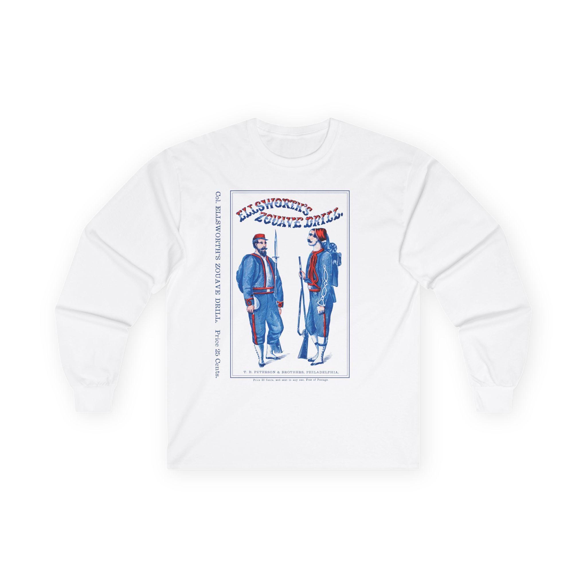 This comfortable longsleeve tee is the perfect layer for the fall and a unique conversation starter. The design reproduces the striking cover of "Ellsworth's Zouave Drill," a manual that helped shape the distinctive look and movements of these elite Civil War regiments. The artwork, with its stylized red, white, and blue text and attentive Zouave soldiers, is a fantastic piece of 19th-century graphic design. Even the original "25 Cents" price is preserved for a touch of authenticity.