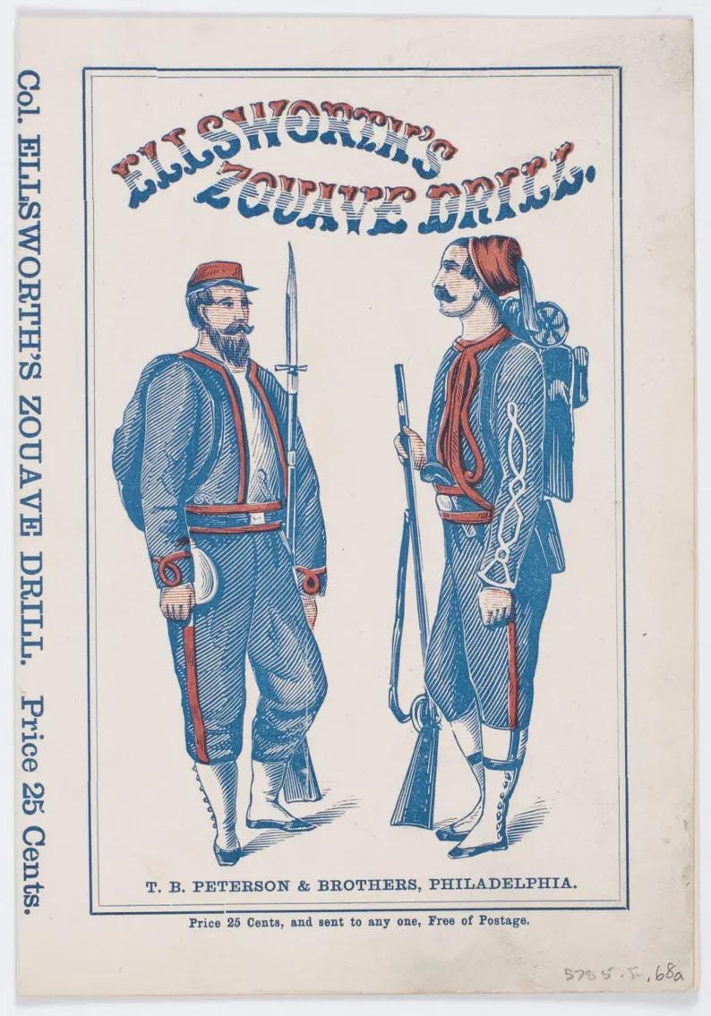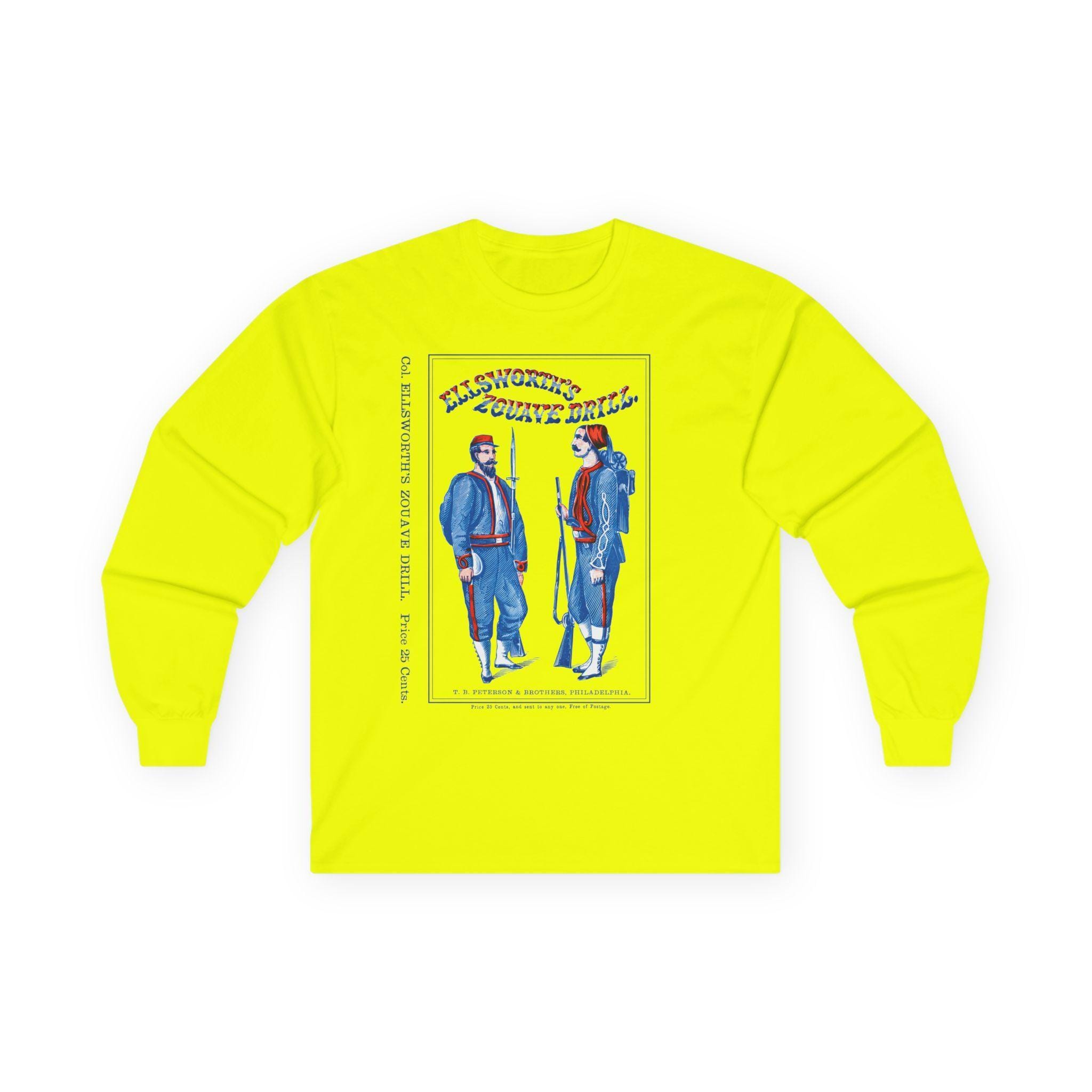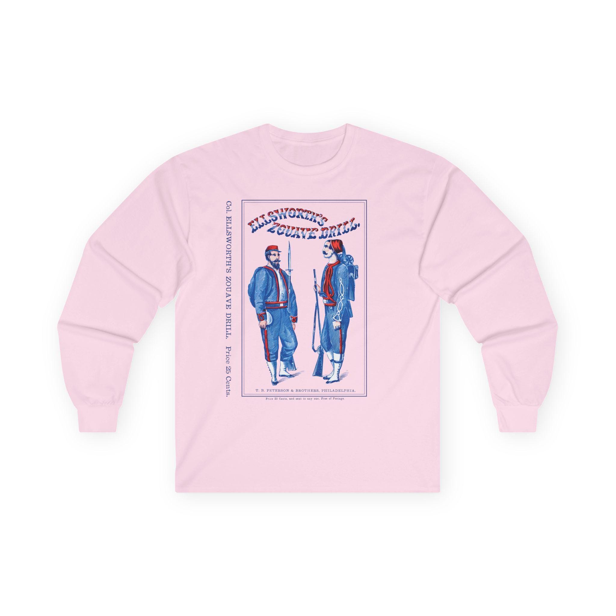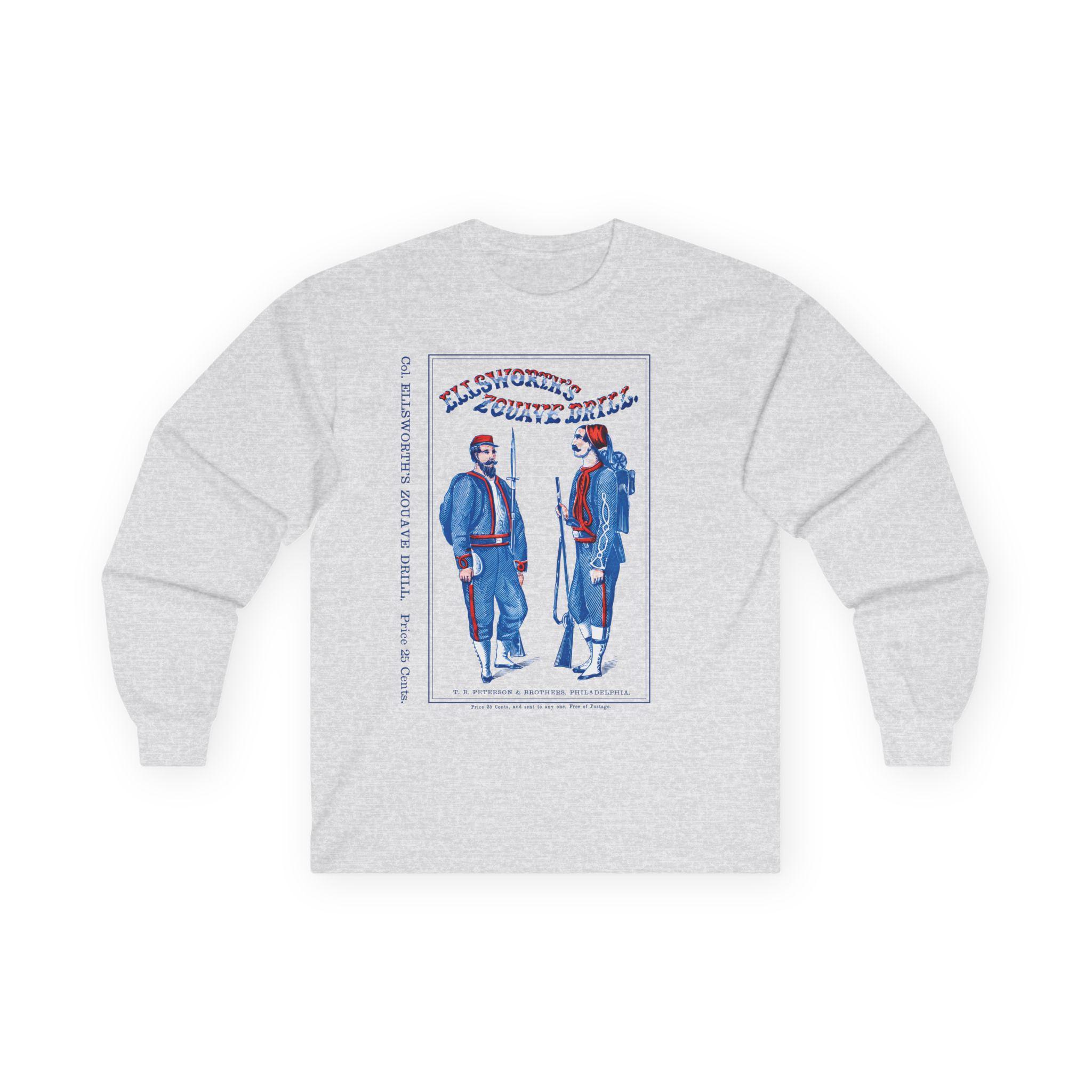 This comfortable longsleeve tee is the perfect layer for the fall and a unique conversation starter. The design reproduces the striking cover of "Ellsworth's Zouave Drill," a manual that helped shape the distinctive look and movements of these elite Civil War regiments. The artwork, with its stylized red, white, and blue text and attentive Zouave soldiers, is a fantastic piece of 19th-century graphic design. Even the original "25 Cents" price is preserved for a touch of authenticity.