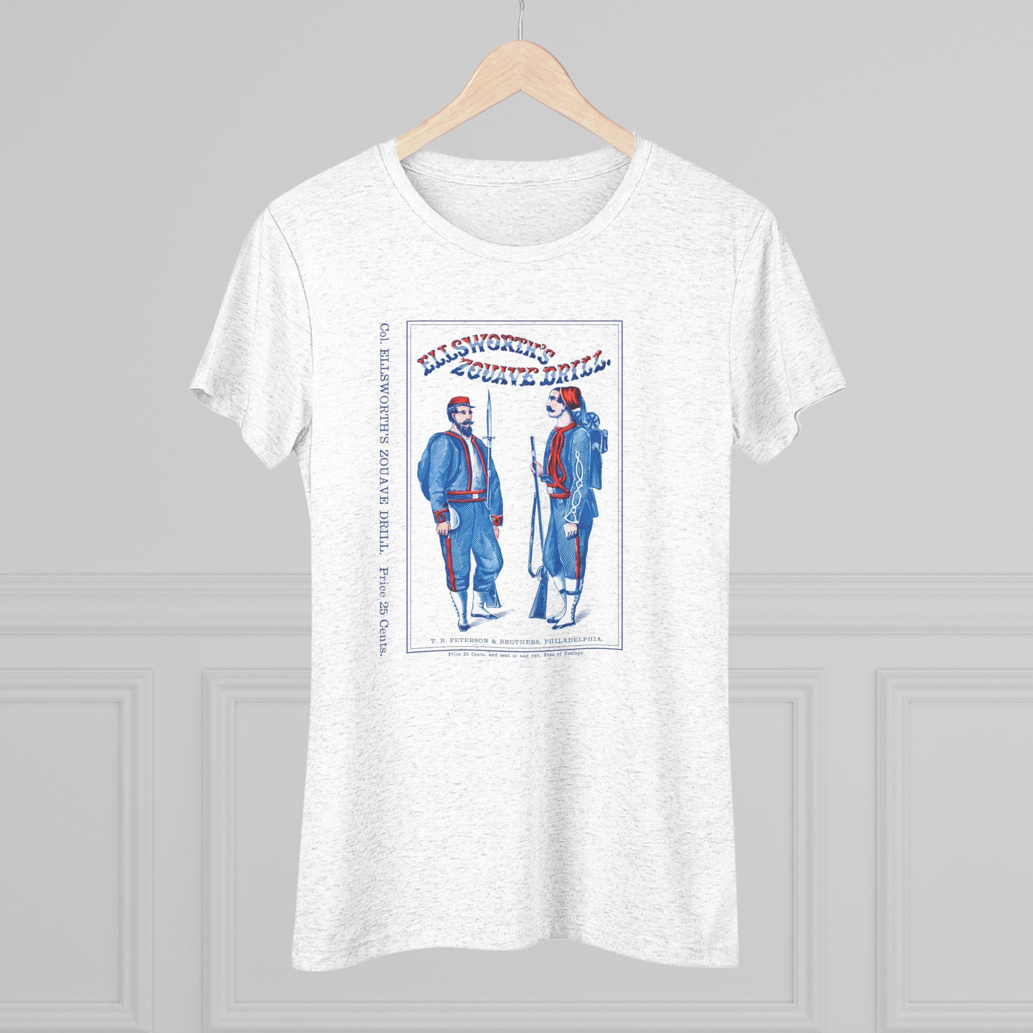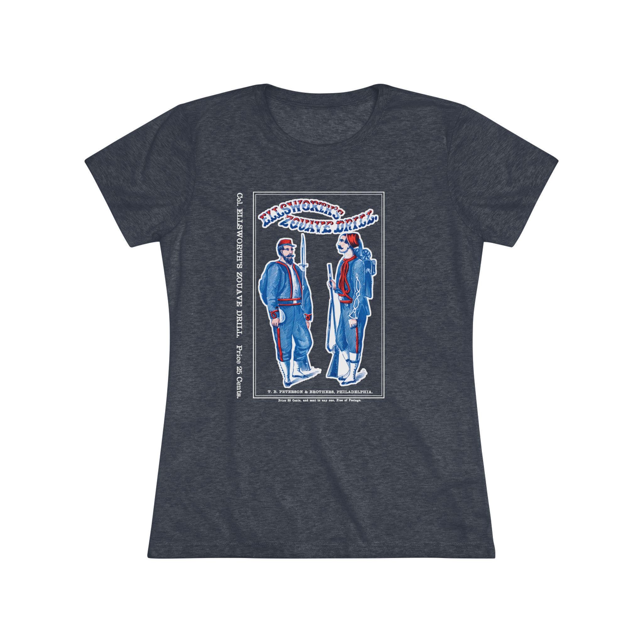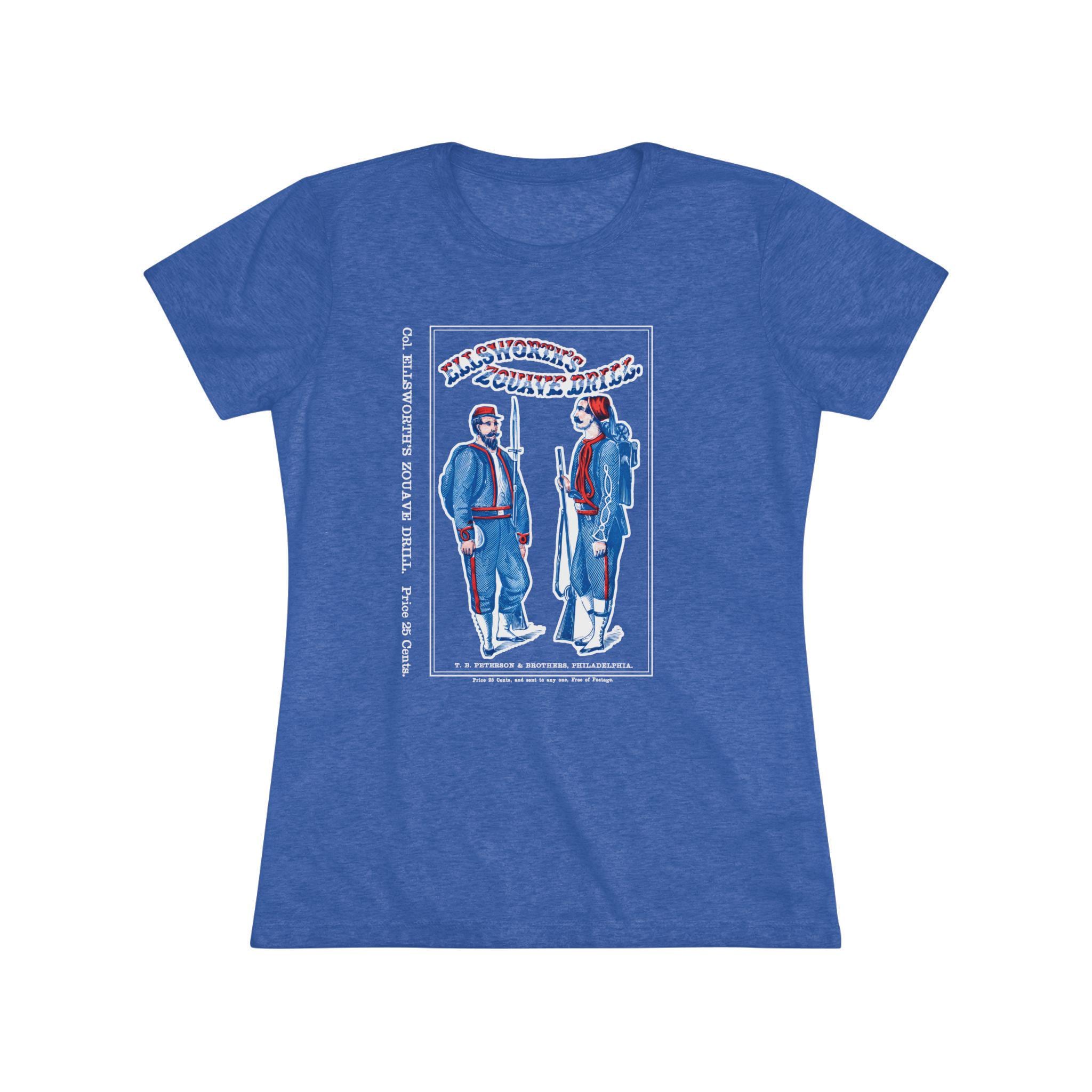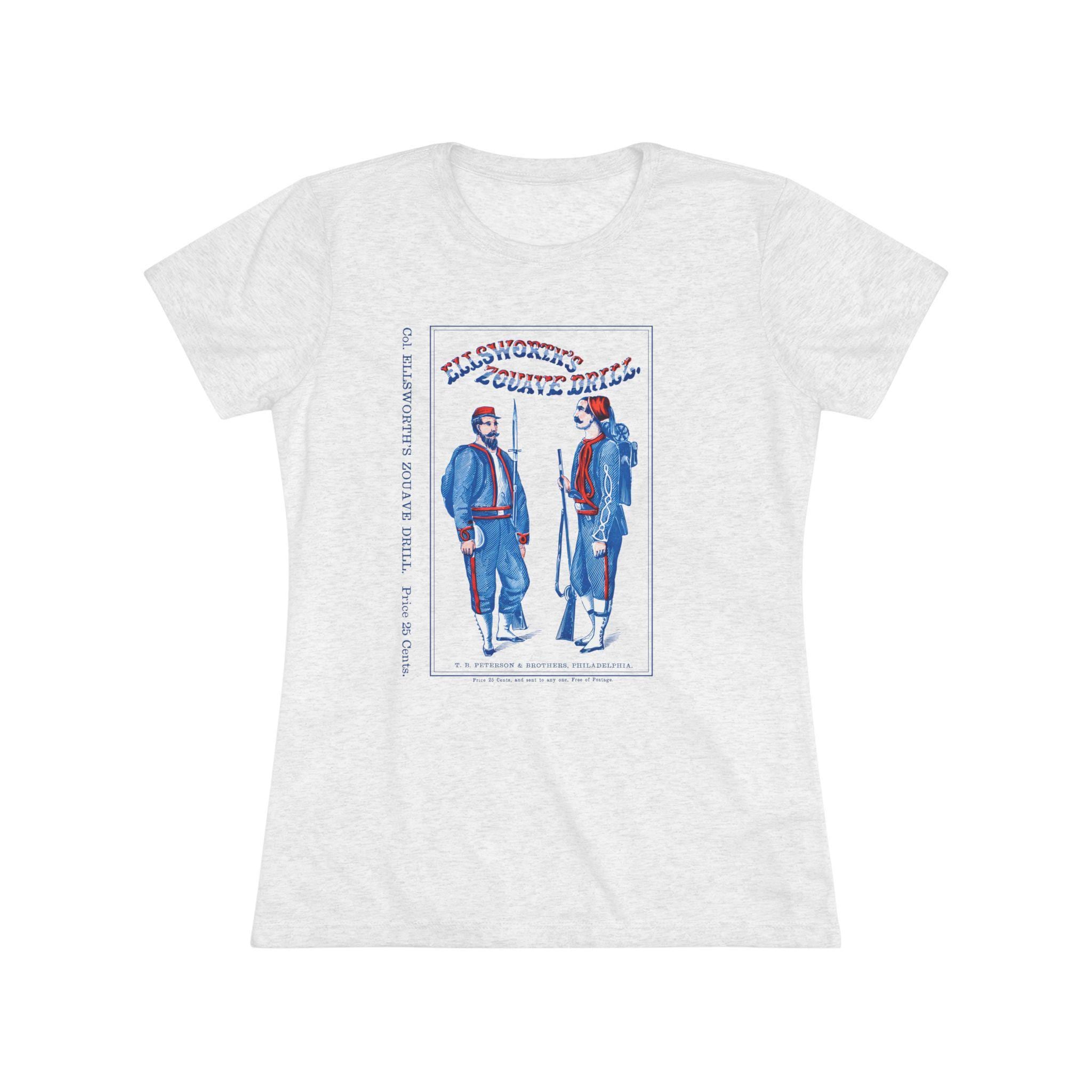 This women's t-shirt combines a deep cut of American military history with a comfortable and stylish fit. The design is the restored cover of "Ellsworth's Zouave Drill," an actual manual used to train the Union Army's most famously uniformed soldiers. The striking red, white, and blue typography and the images of the Zouaves make for a unique and eye-catching piece. This soft, contoured tee is a perfect way to wear a piece of authentic history from a famed Philadelphia publisher.