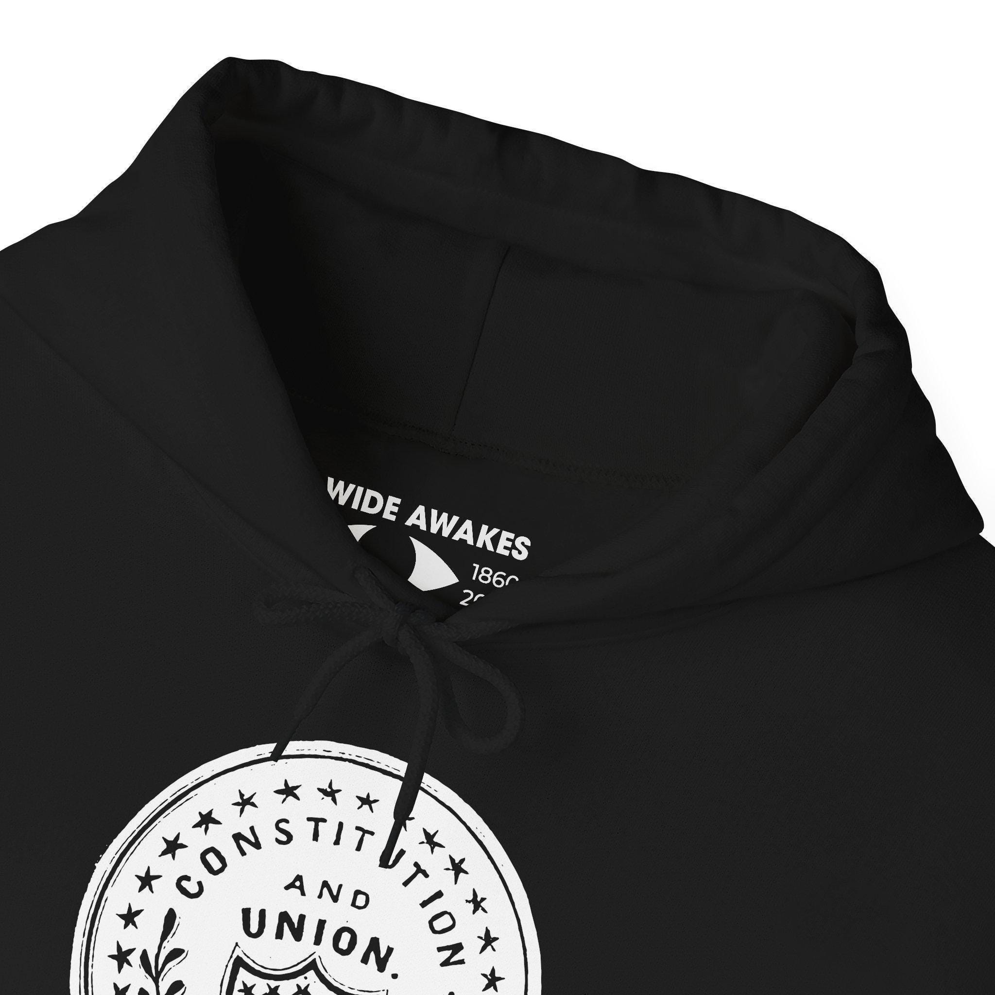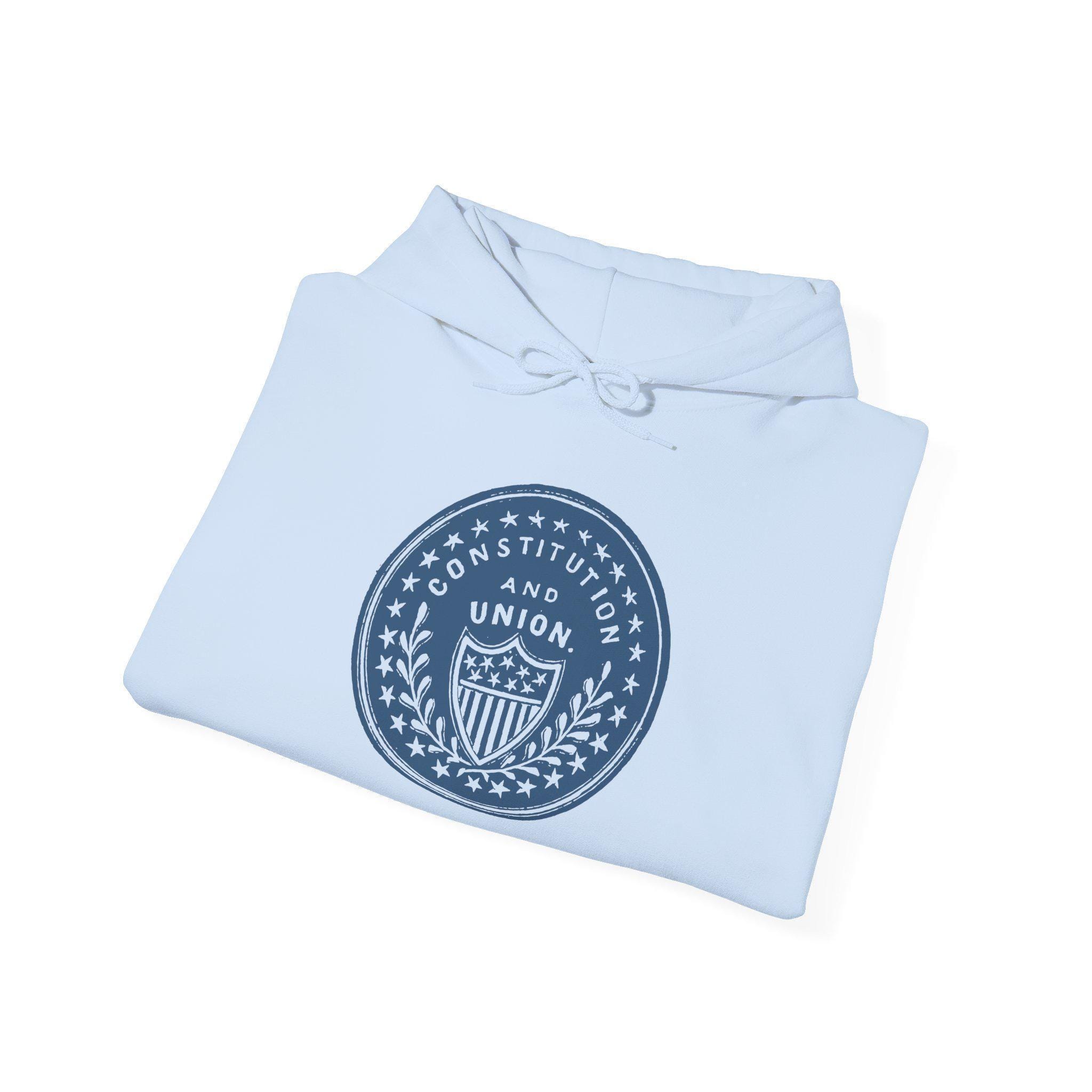 This comfortable and warm hoodie features a design taken from a pro-Union Civil War envelope stamp. During the 1860s, the phrase "CONSTITUTION AND UNION" was a constant refrain. It was the North's answer to secession, arguing that the conflict was not a war of aggression, but a legal and necessary action to preserve the nation as established by its founding law. With a soft fleece interior and a spacious front pocket, this hoodie is a wearable piece of core American political philosophy.