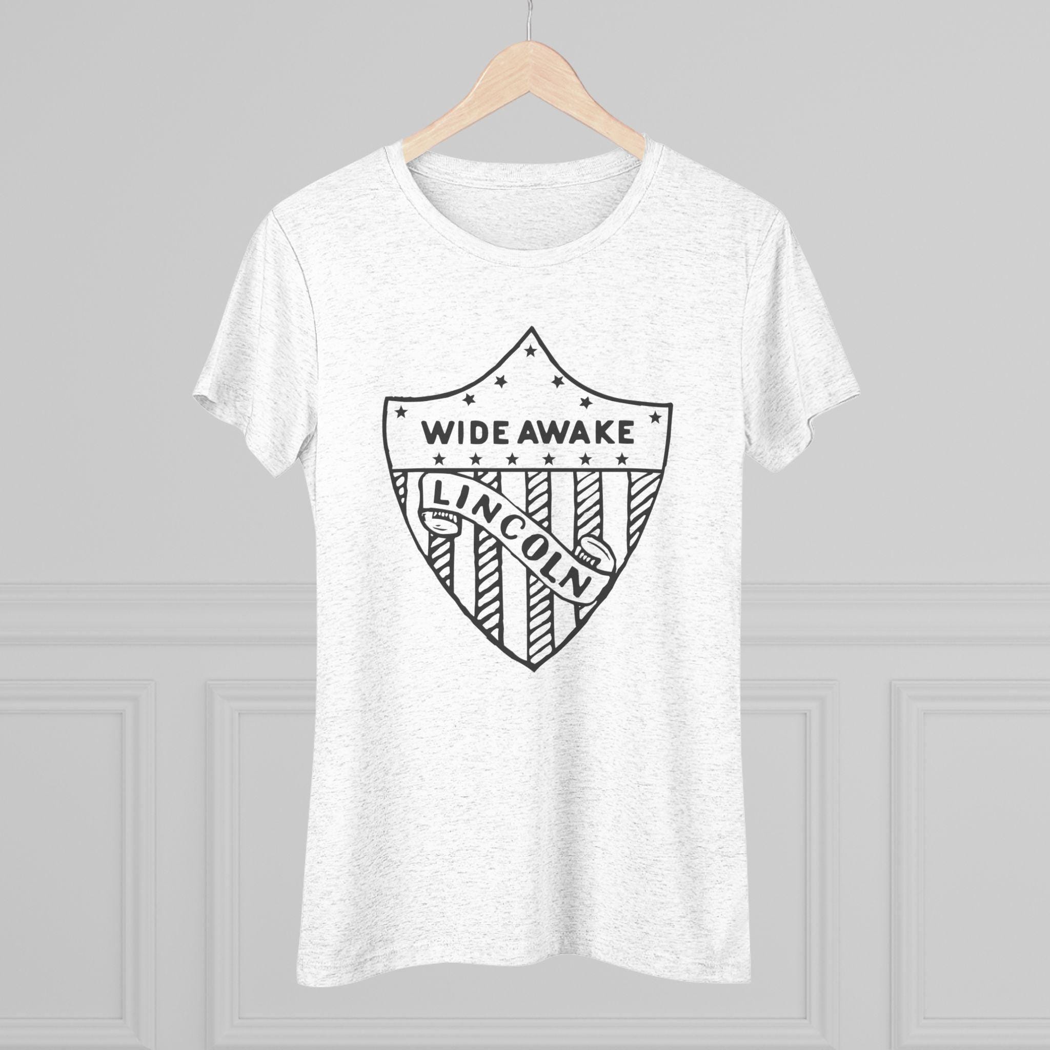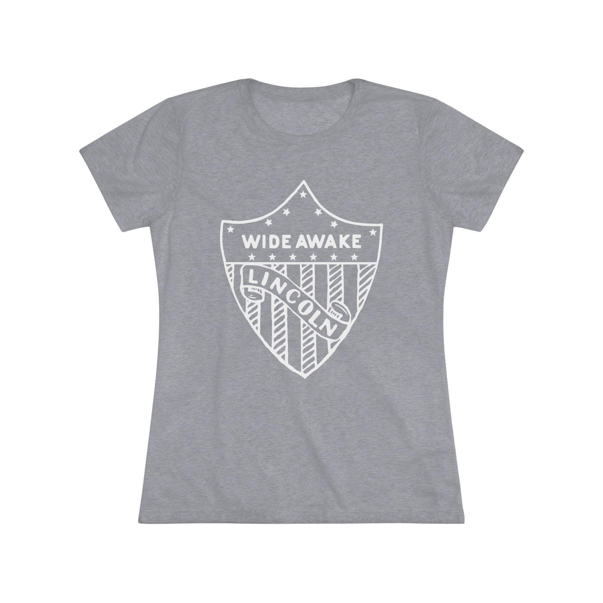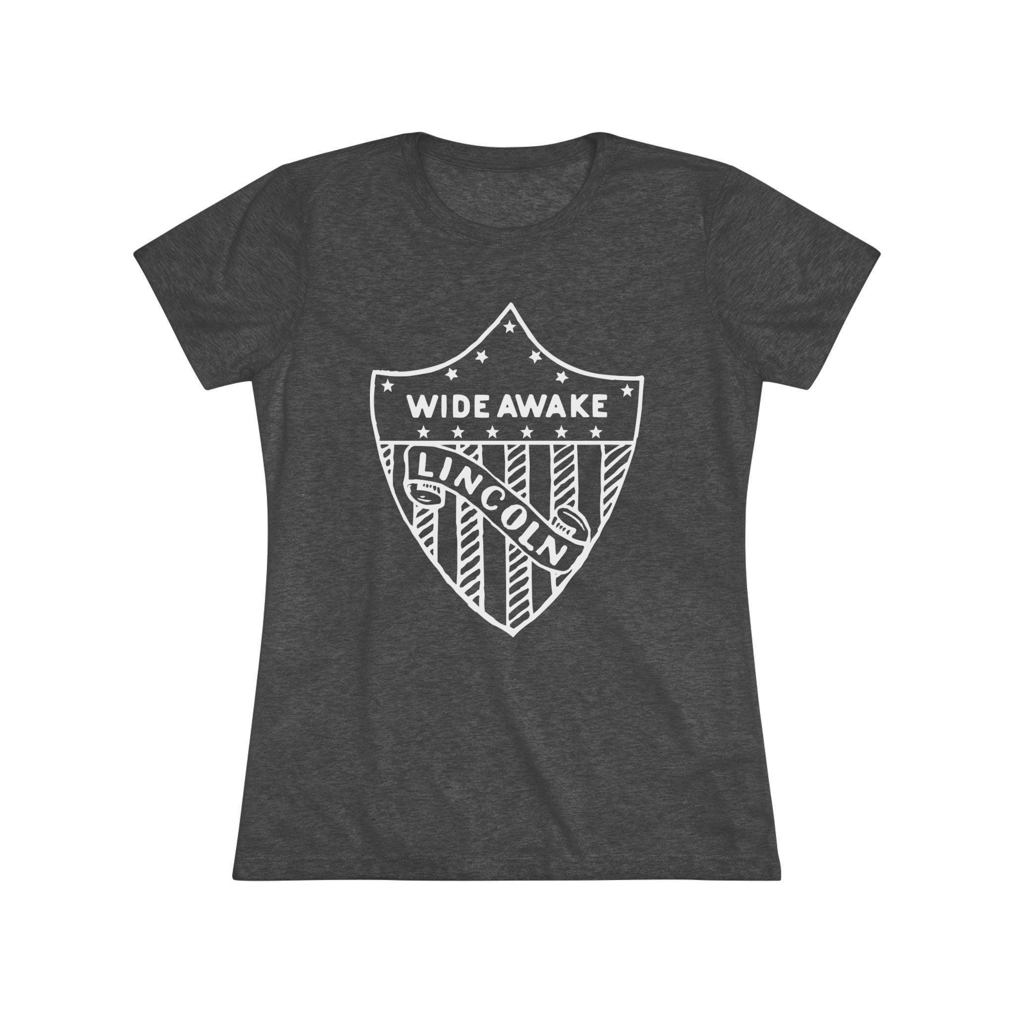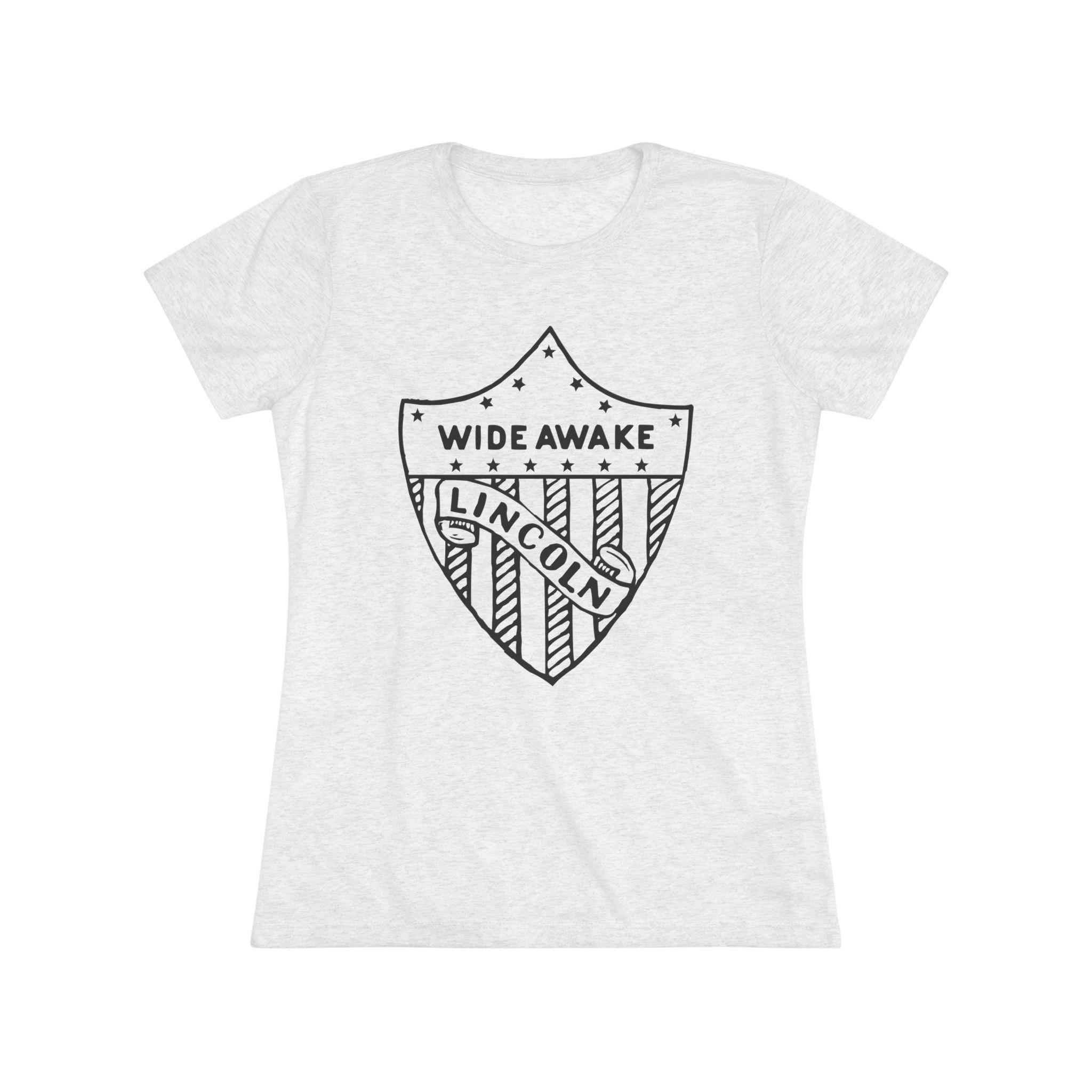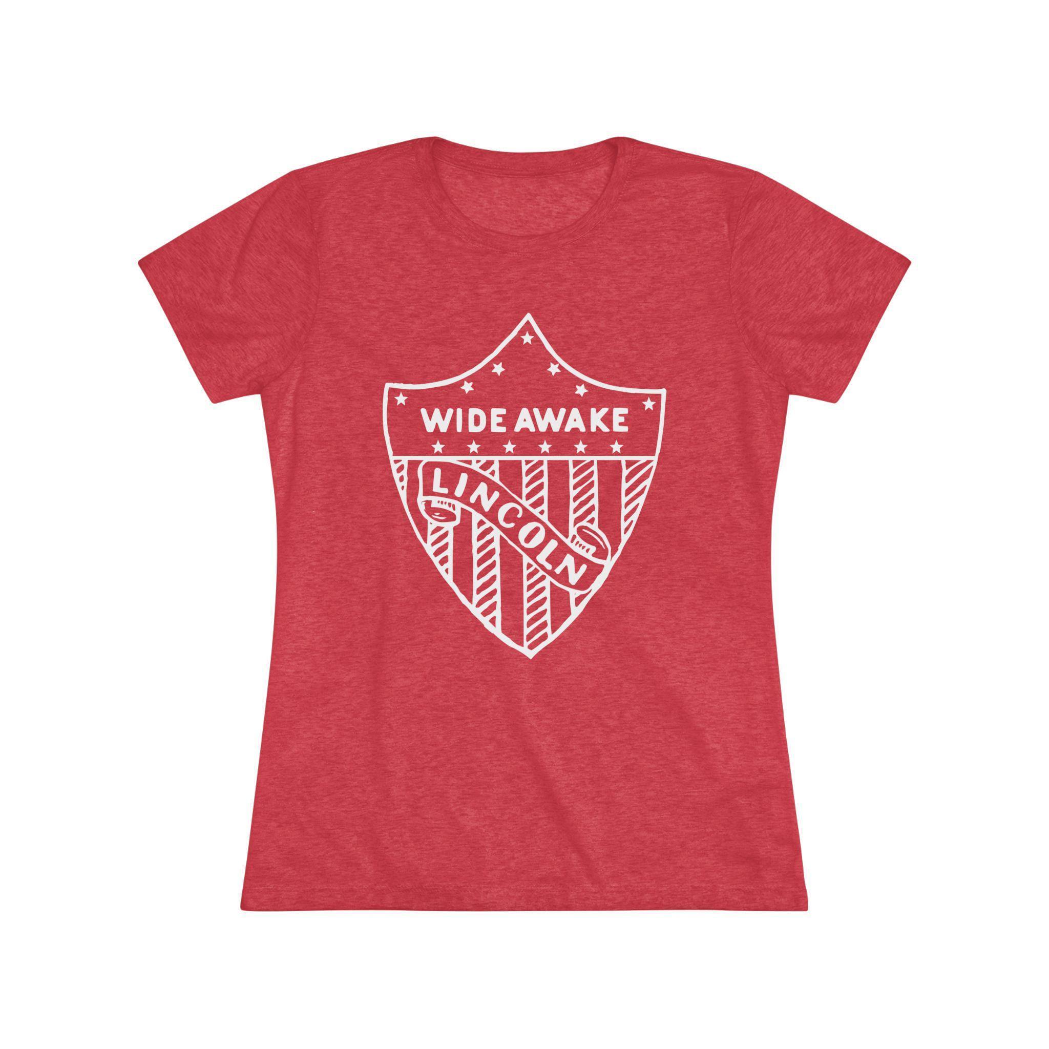This women's t-shirt combines a powerful piece of American political history with a comfortable and stylish fit. The design is a restored emblem from a pin worn by the Wide Awakes, the anti-slavery youth movement that helped elect Abraham Lincoln in 1860. The design masterfully blends a patriotic shi eld with the movement's name and their candidate's. This soft, contoured tee is a perfect way to wear a piece of profound history that speaks to the power of grassroots organizing.
