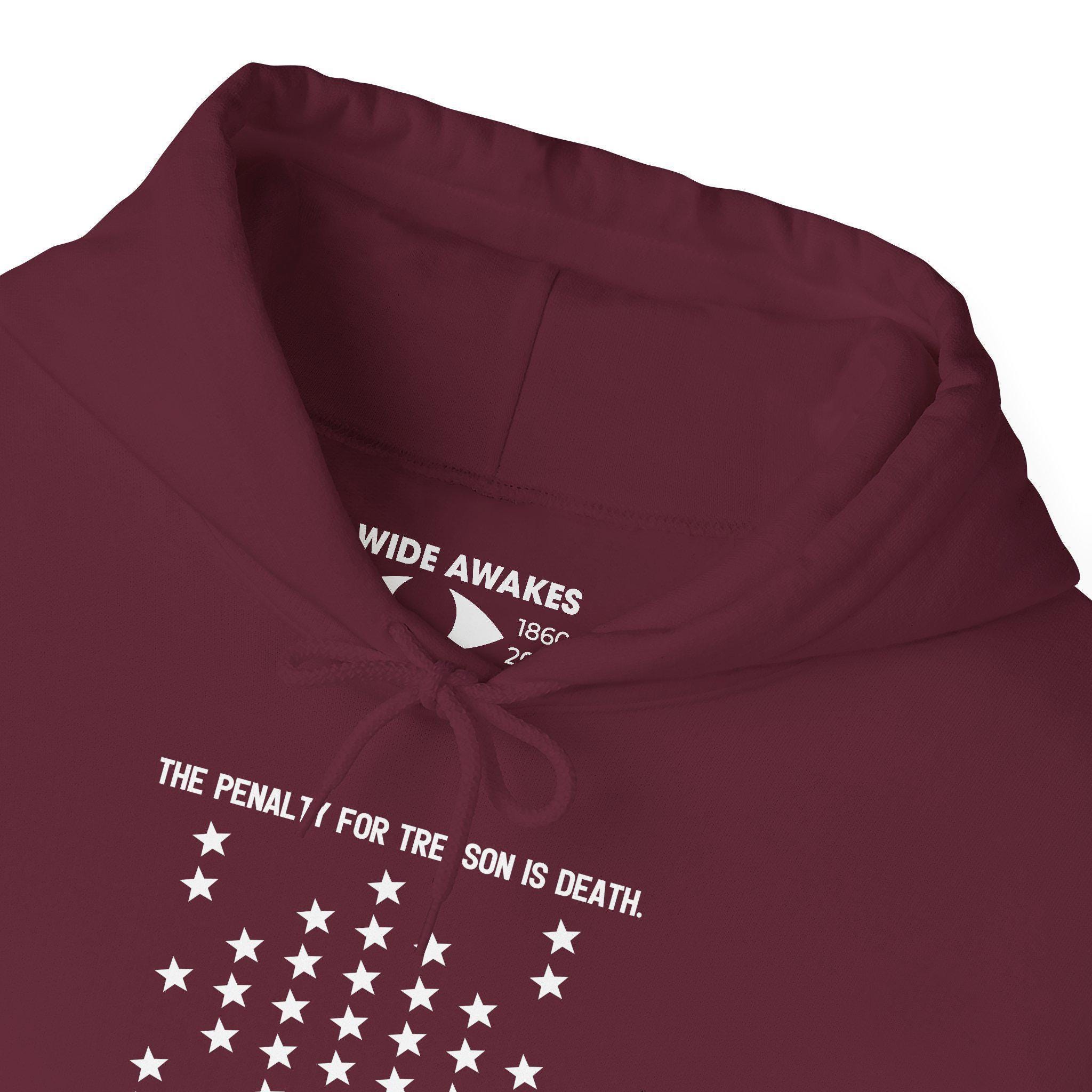 This comfortable and warm hoodie features a powerful pairing of historical symbols. The visual is the iconic, diamond-shaped 33-star canton of the Fort Sumter flag, a symbol of defiance from the first moments of the Civil War. Accompanying it is the fierce motto from a famous Civil War monument: "The Penalty For Treason is Death. No North No South The Union Forever." With a soft fleece interior and a spacious front pocket, this hoodie is a piece of wearable history that makes a bold and resolute statement about the cost of disunion and the importance of national unity.