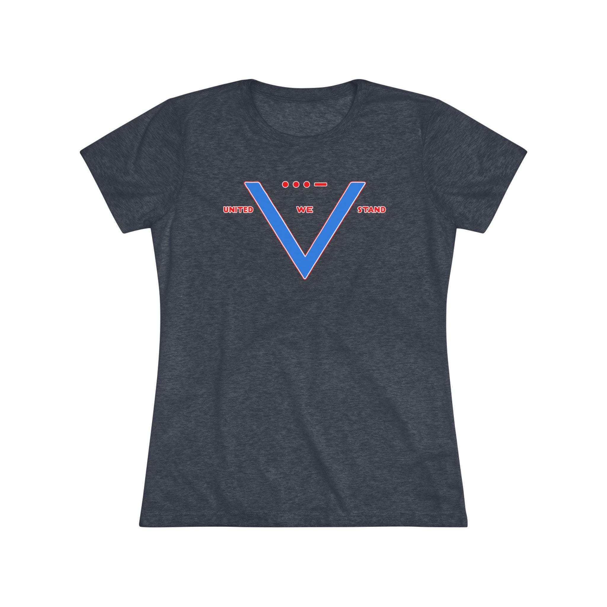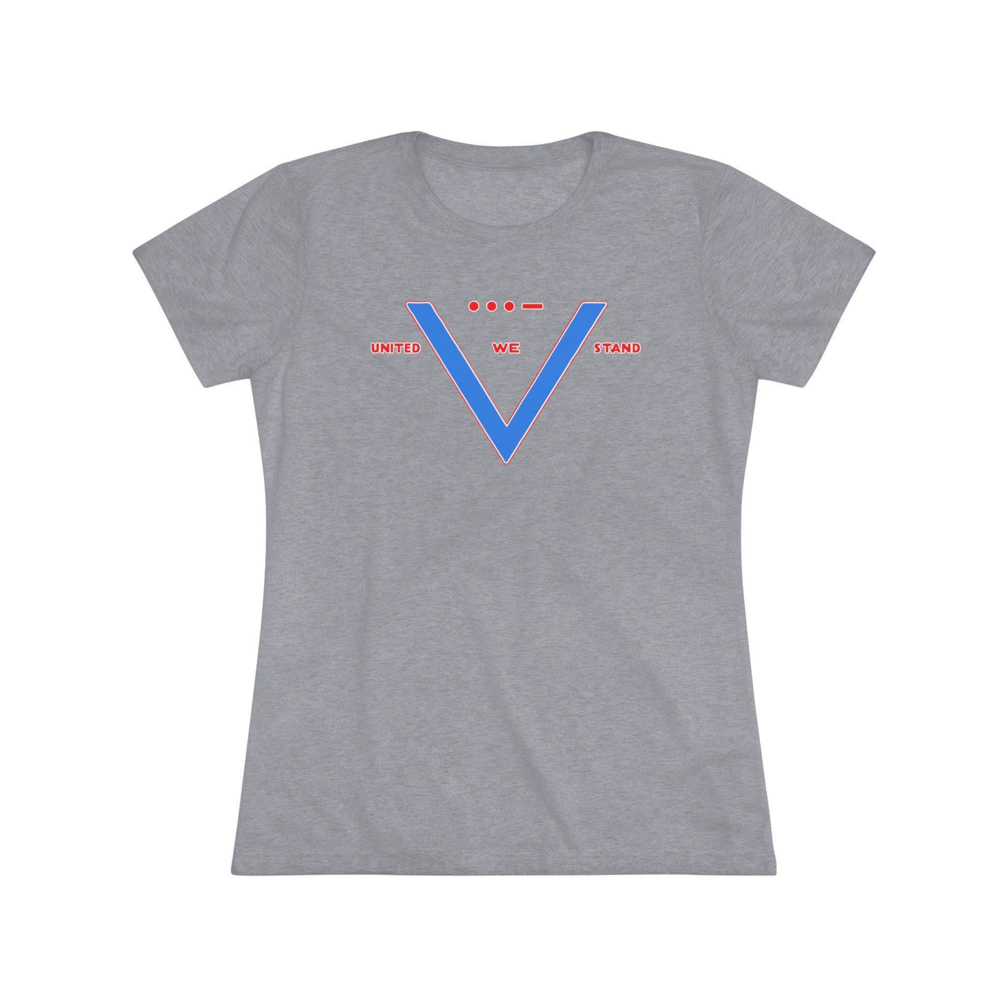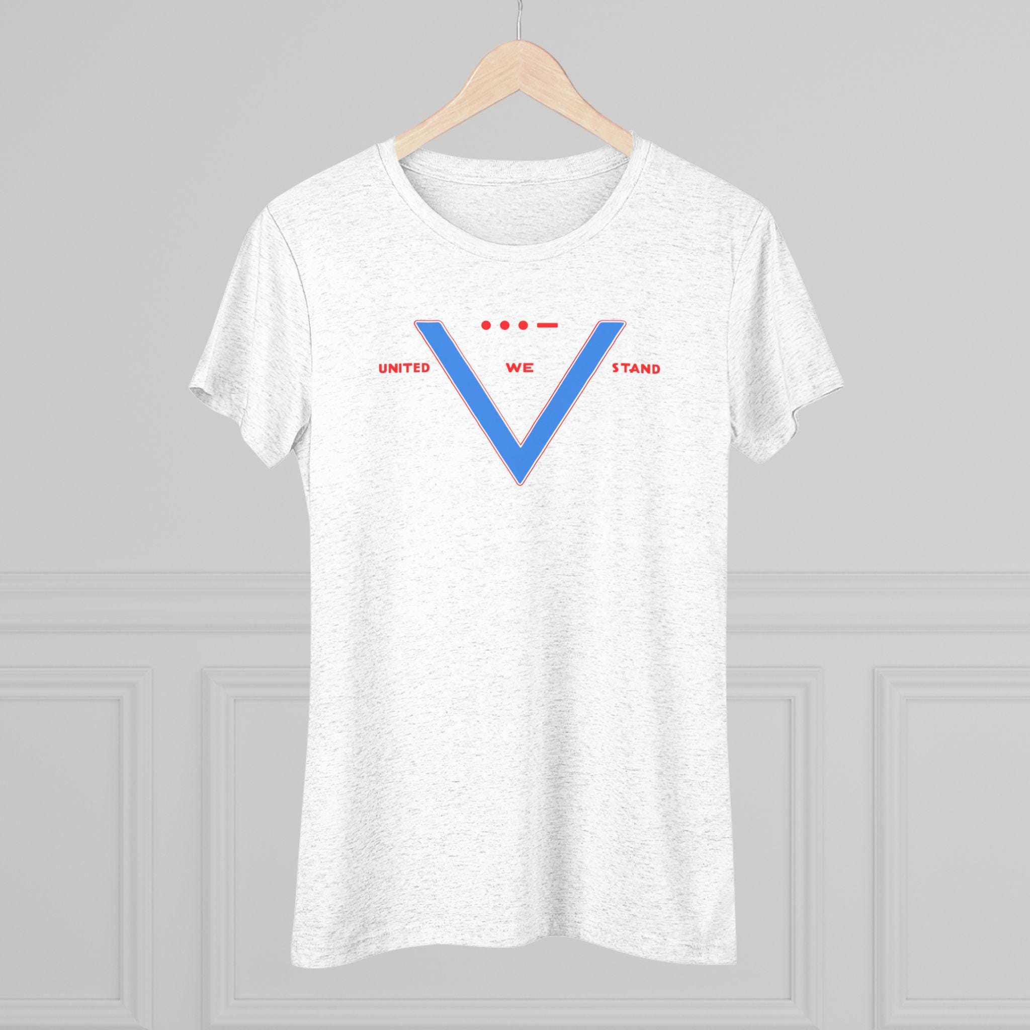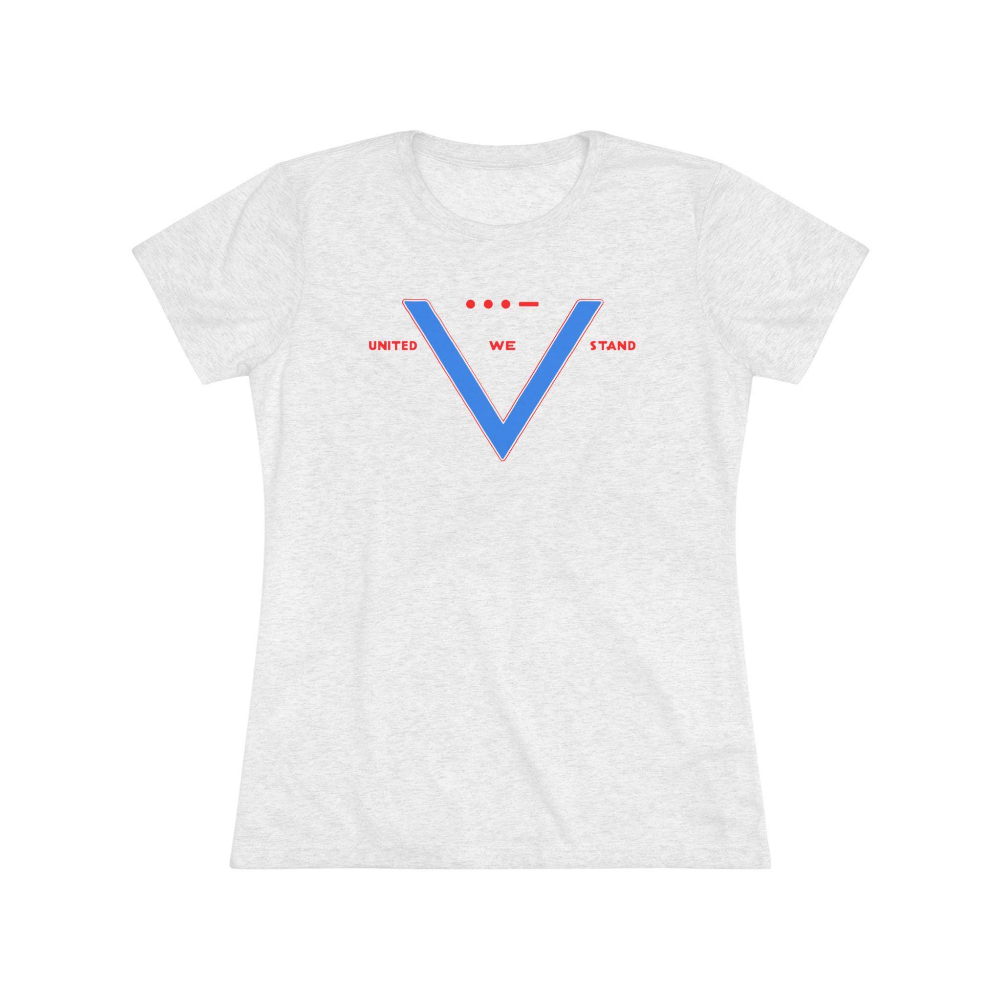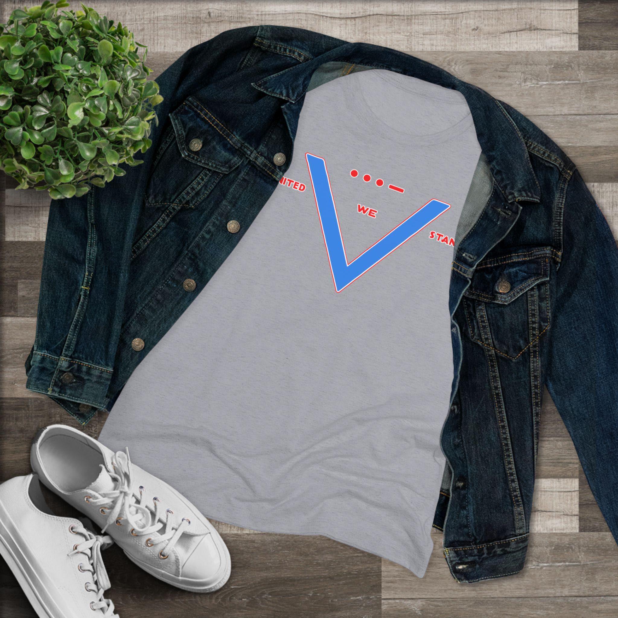 This women's t-shirt combines a powerful piece of American history with a comfortable and stylish fit. The design is a restored 1941 postcard from the height of the "V for Victory" campaign. It features the iconic "V" symbol, its Morse code representation, and the enduring motto, "UNITED WE STAND." This soft, contoured tee is a perfect way to wear a piece of profound history that speaks to the strength and resilience of a unified nation.