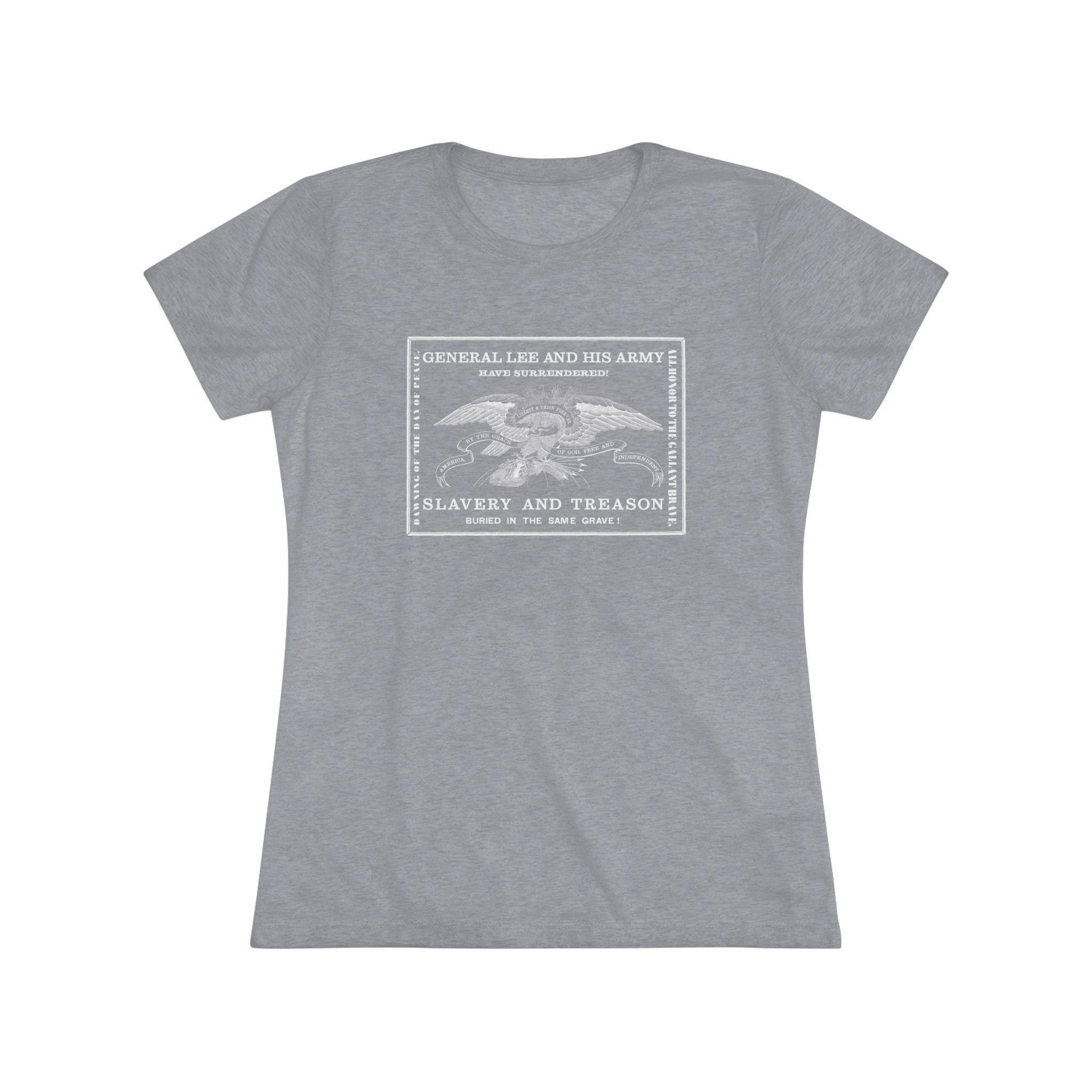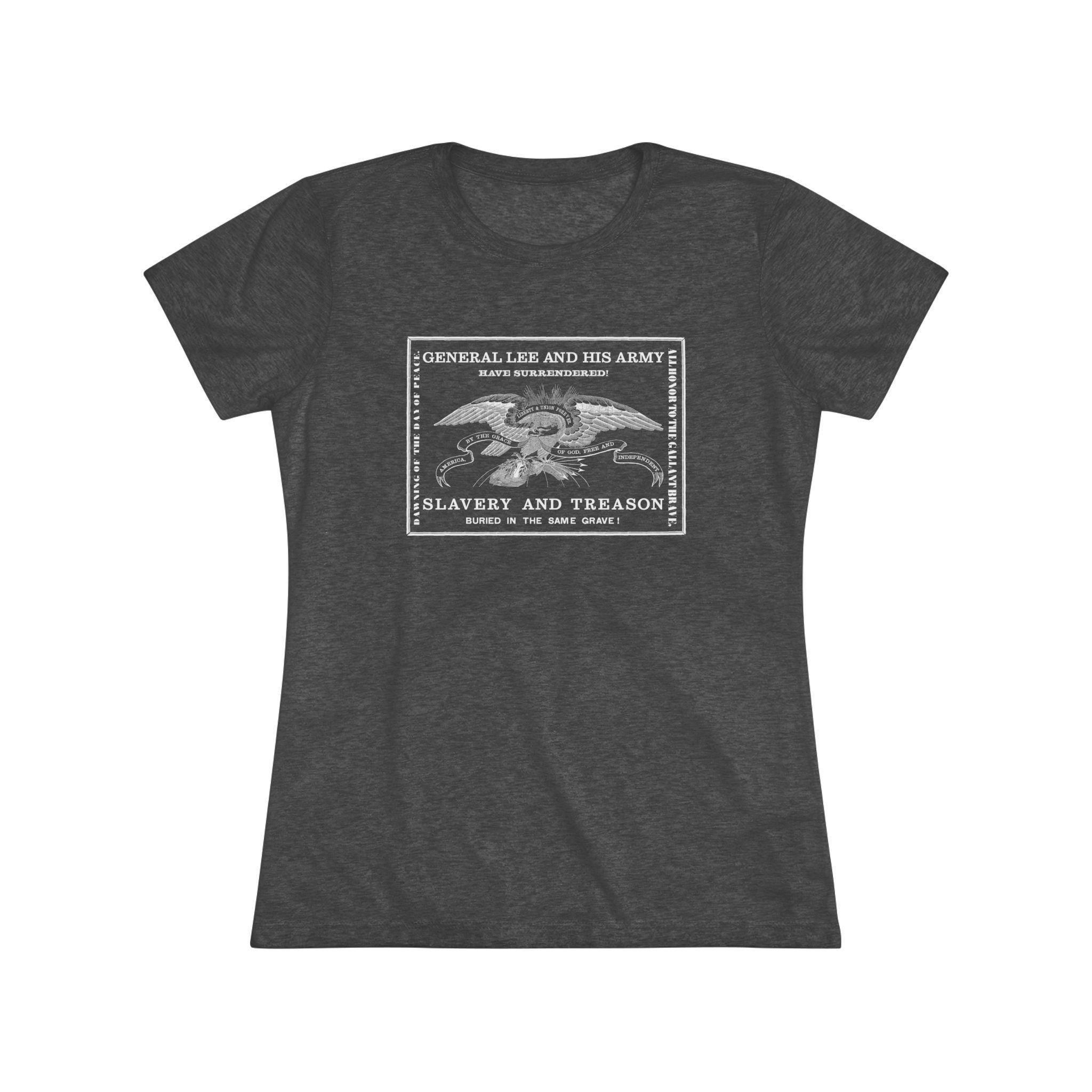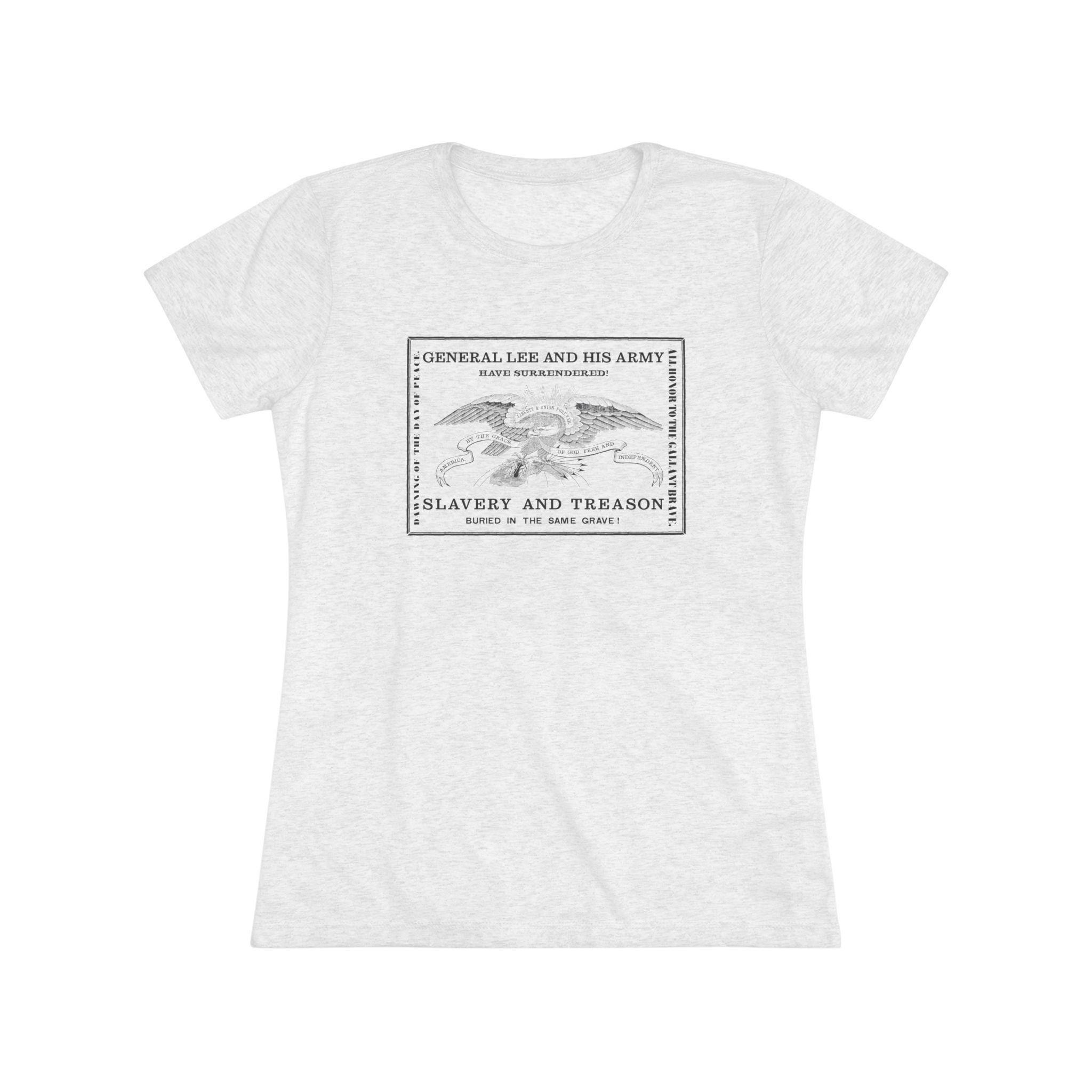 This women's t-shirt combines a powerful piece of American history with a comfortable and stylish fit. The design is a full, restored broadside from April 10, 1865, celebrating the surrender of Robert E. Lee and the end of the Civil War. The page is a jubilant collection of triumphant declarations, from "GENERAL LEE AND HIS ARMY HAVE SURRENDERED!" to "DAWNING OF THE DAY OF PEACE." This soft, contoured tee is a perfect way to wear a piece of profound history that speaks to a nation's hard-won victory for unity and freedom.
