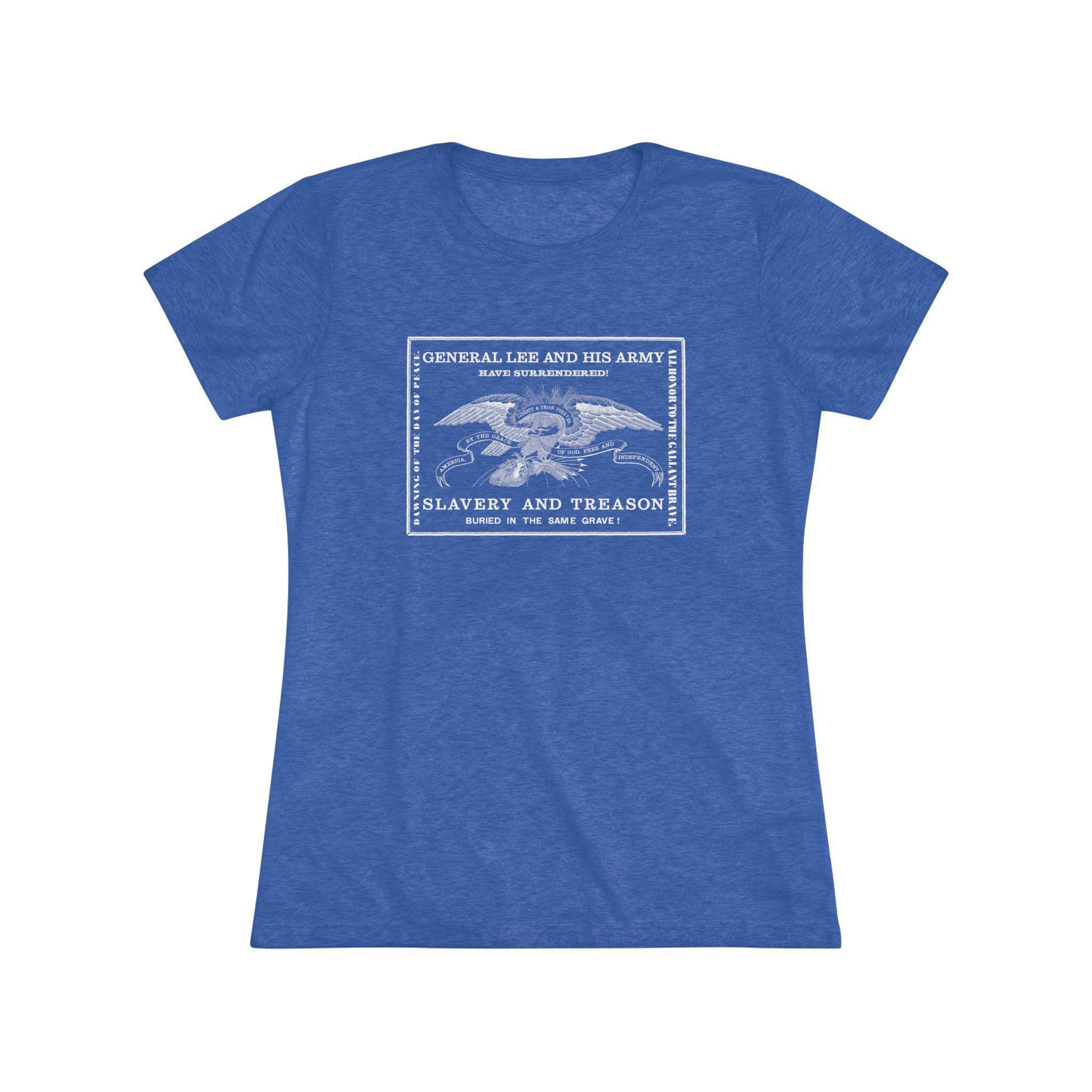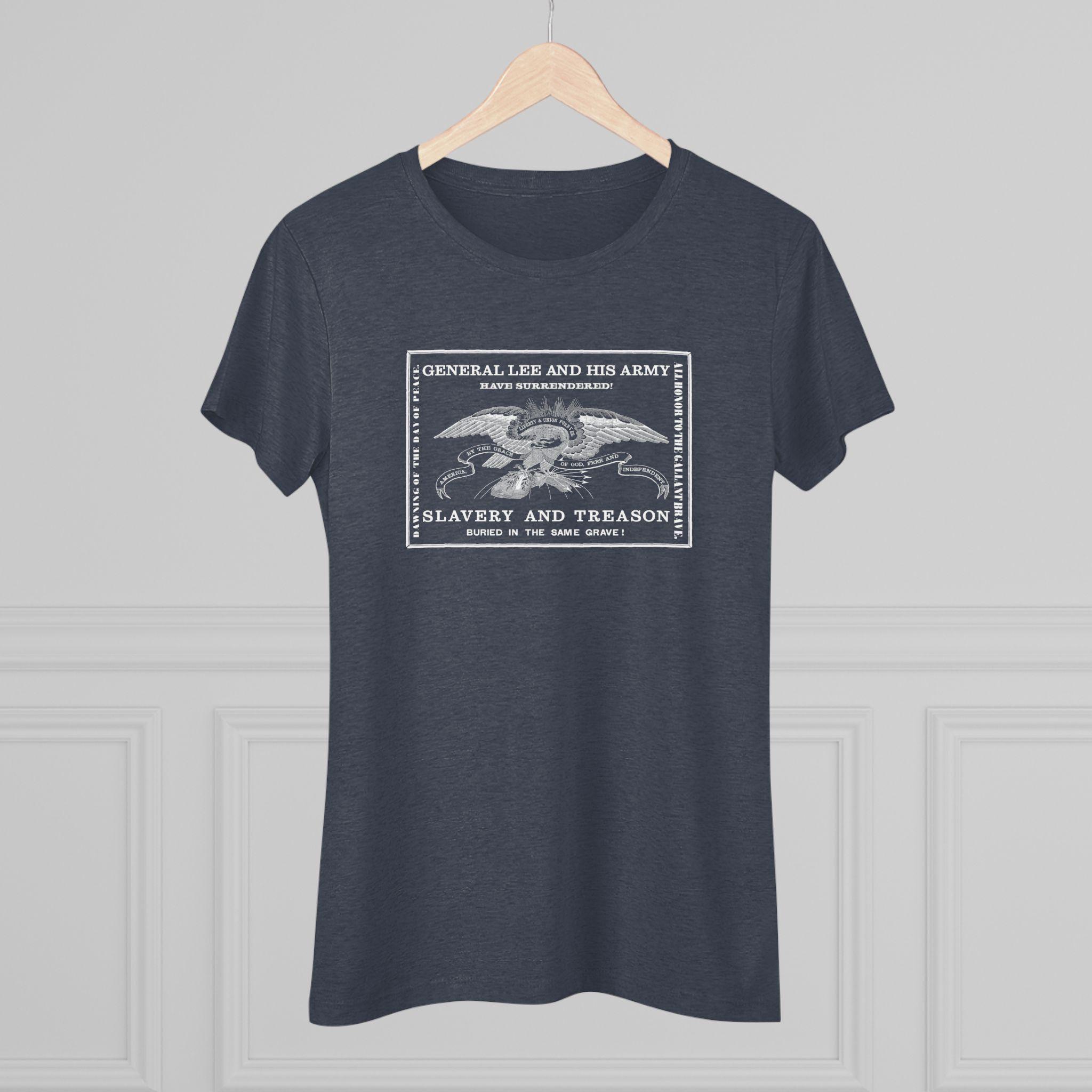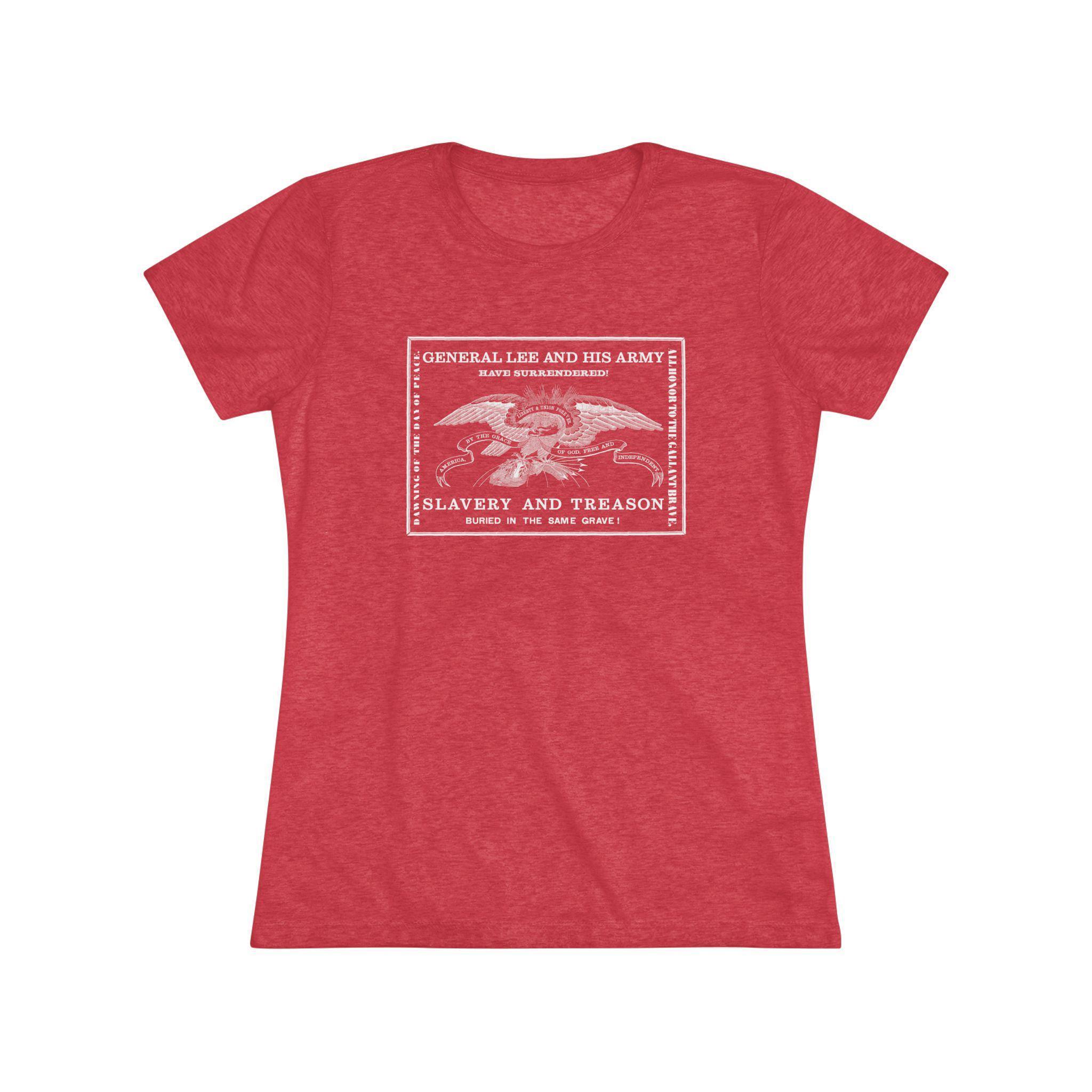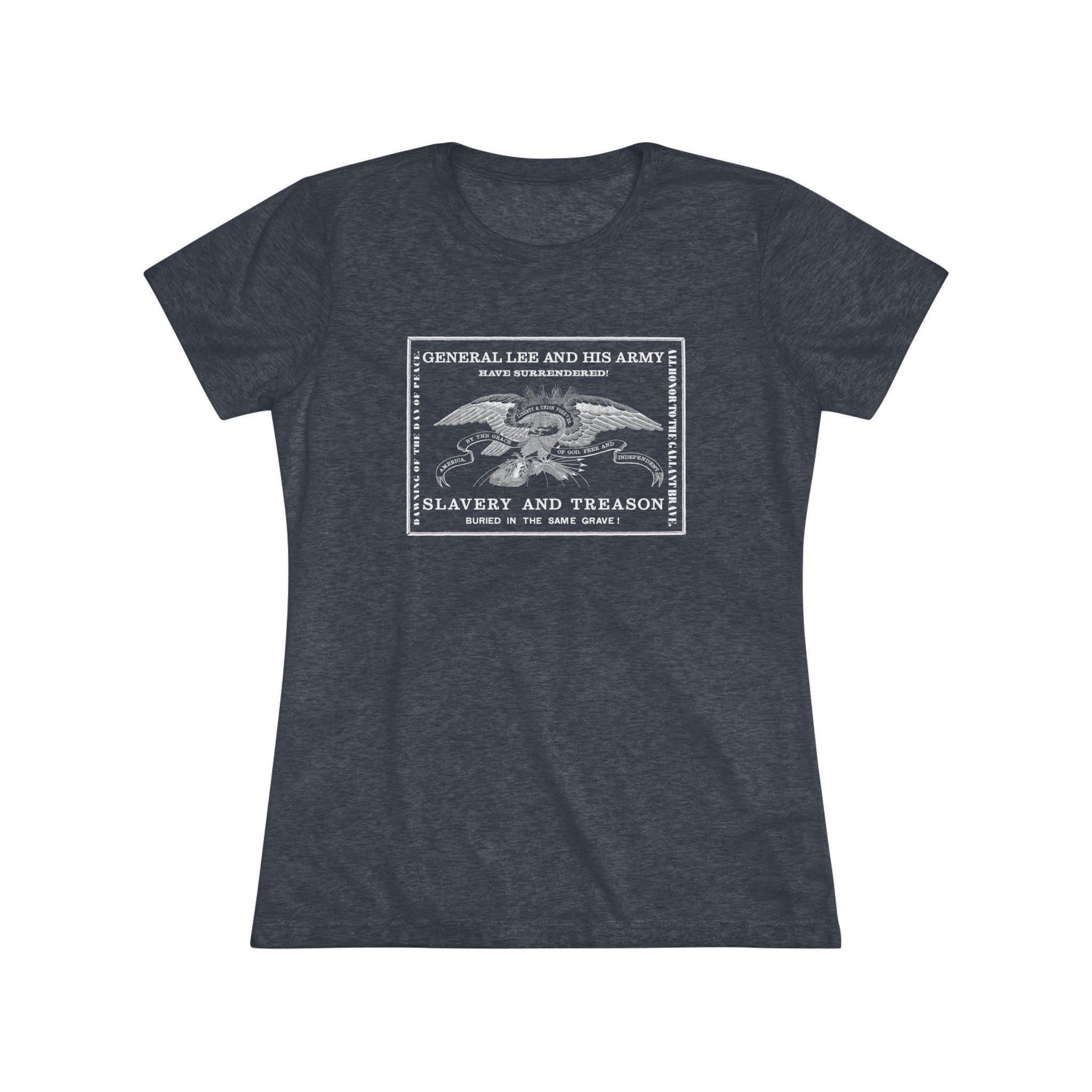 This women's t-shirt combines a powerful piece of American history with a comfortable and stylish fit. The design is a full, restored broadside from April 10, 1865, celebrating the surrender of Robert E. Lee and the end of the Civil War. The page is a jubilant collection of triumphant declarations, from "GENERAL LEE AND HIS ARMY HAVE SURRENDERED!" to "DAWNING OF THE DAY OF PEACE." This soft, contoured tee is a perfect way to wear a piece of profound history that speaks to a nation's hard-won victory for unity and freedom.