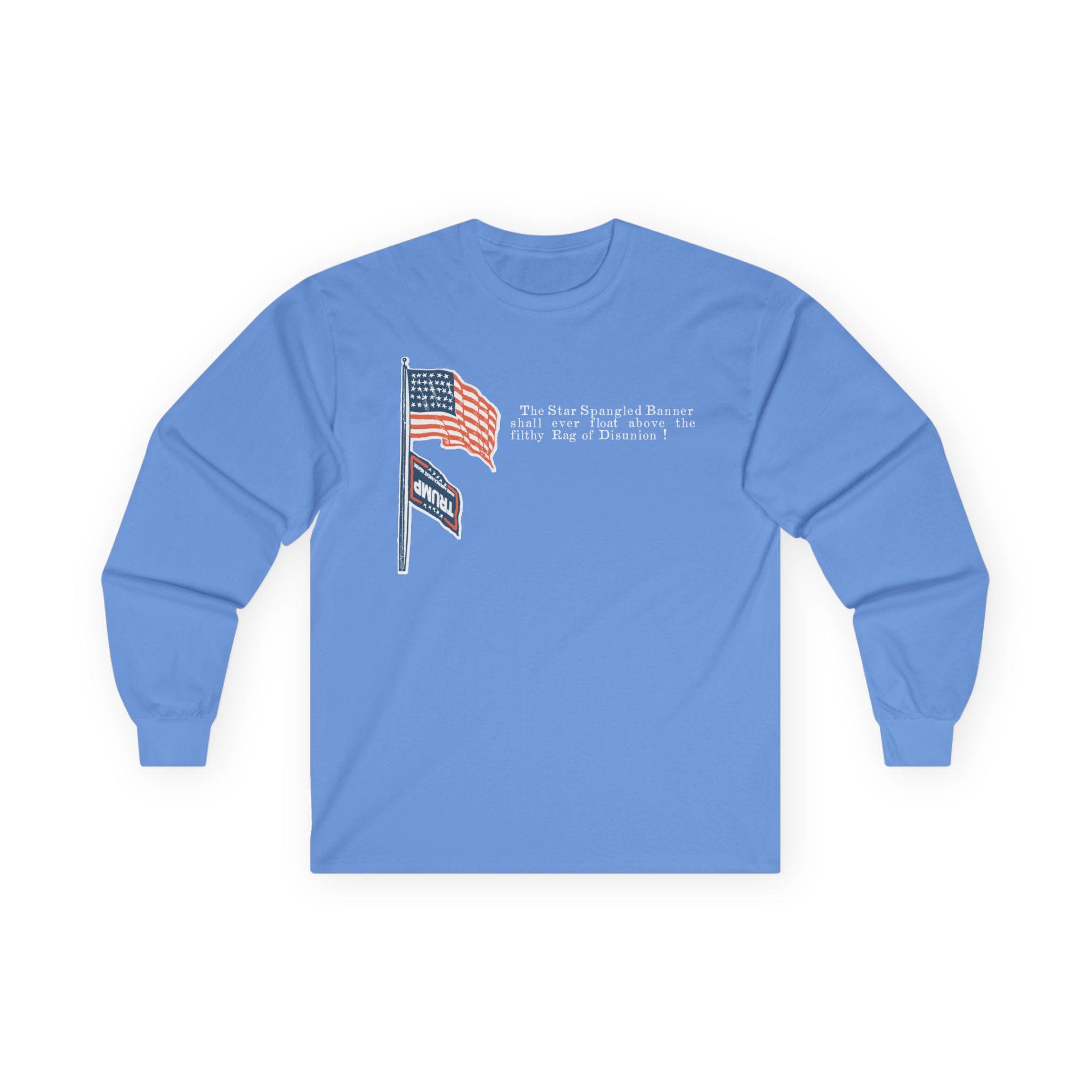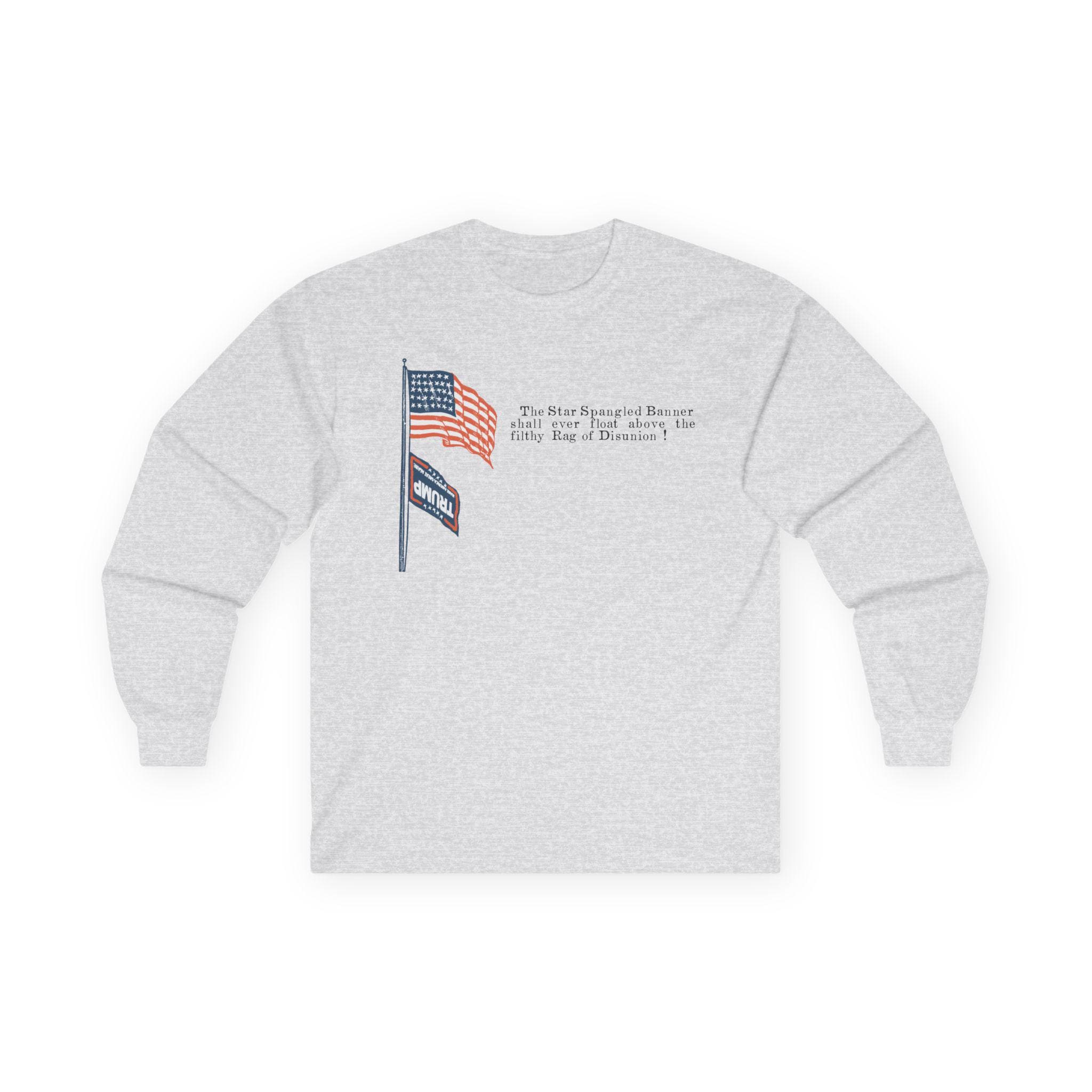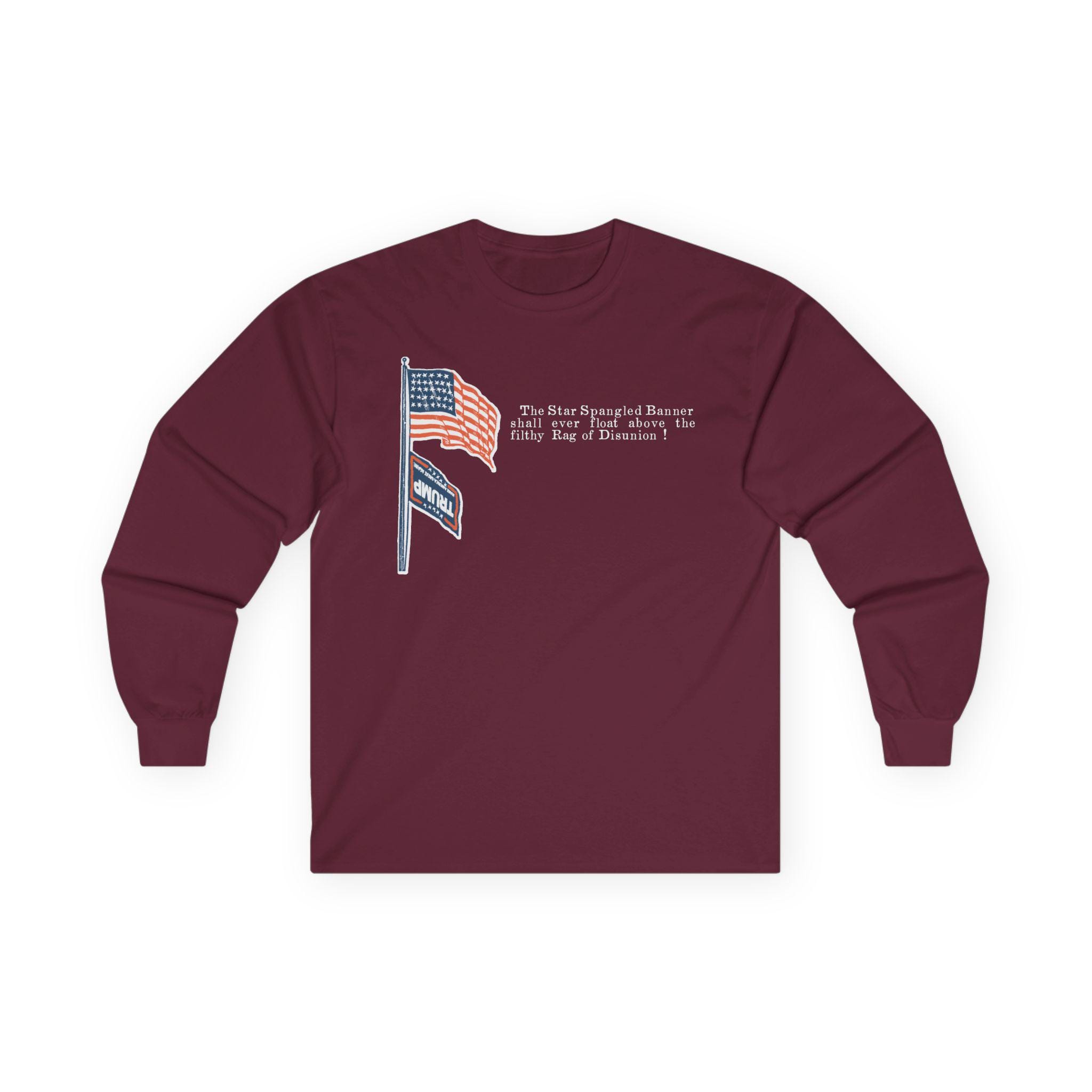 This comfortable longsleeve tee is the perfect layer for fall and a powerful piece of political art. The design is a modern take on a fiery piece of Civil War propaganda, replacing the original's Confederate "Rag of Disunion" with the modern MAGA flag, flying dishonored beneath the Stars and Stripes. It's a bold, historically-grounded statement for any proud patriot who believes in the true meaning of the American flag.