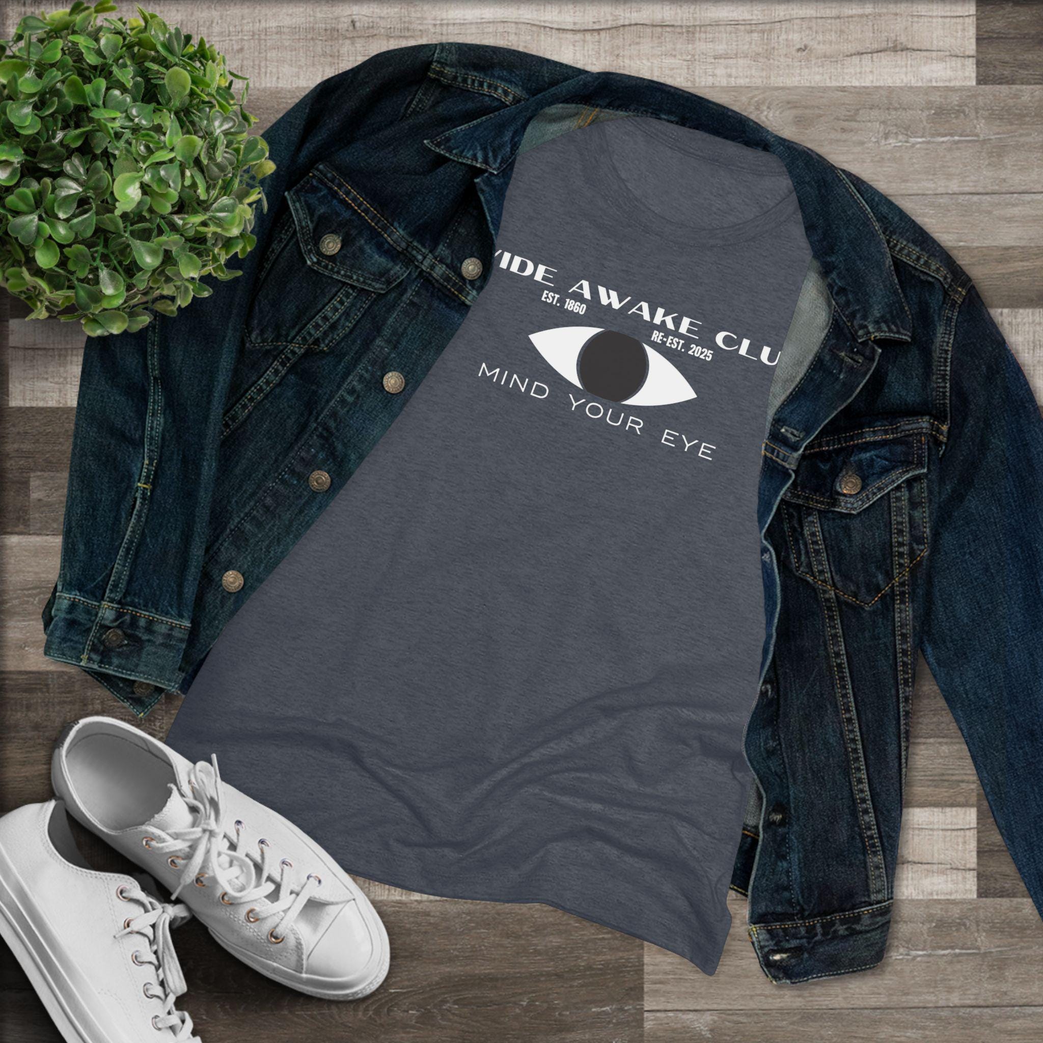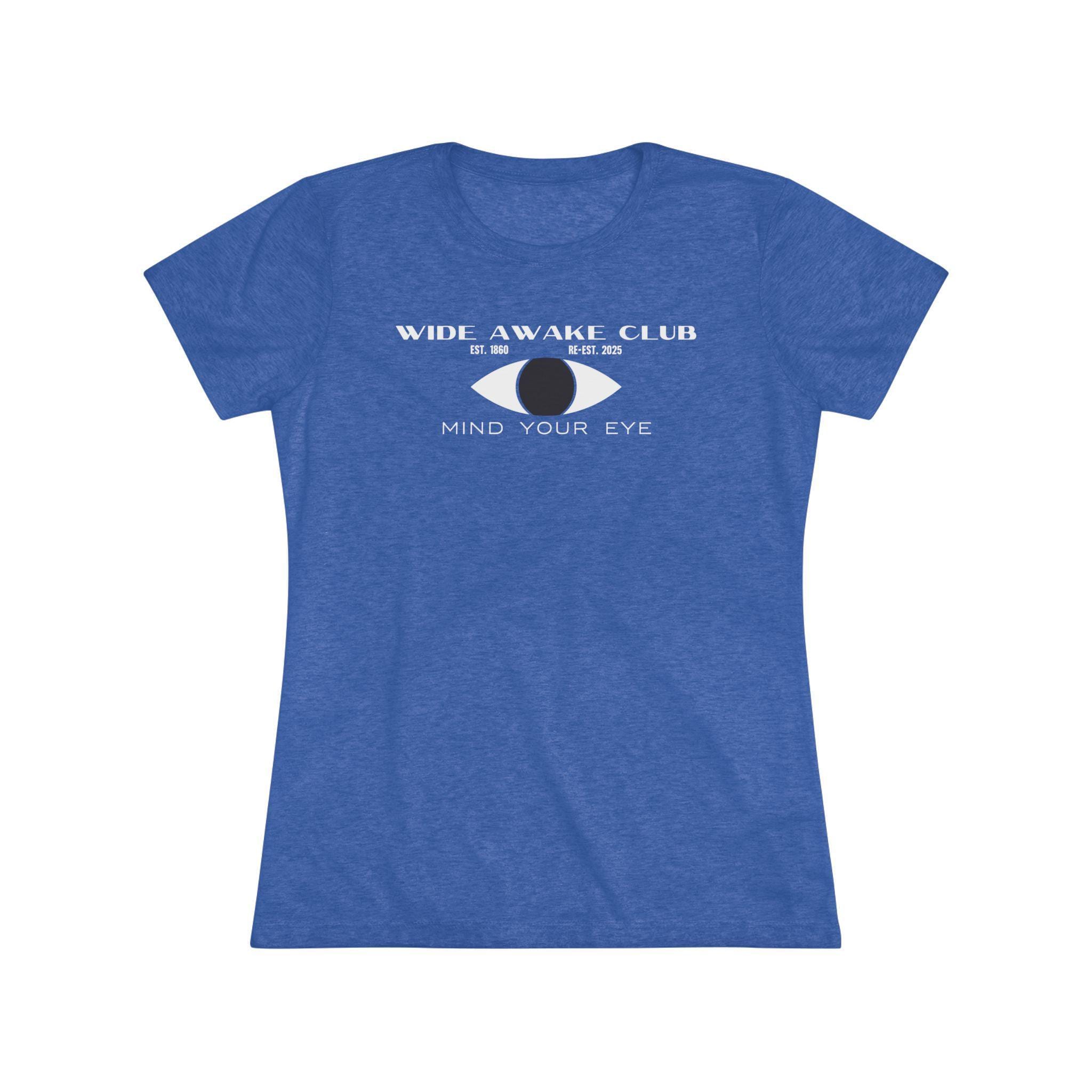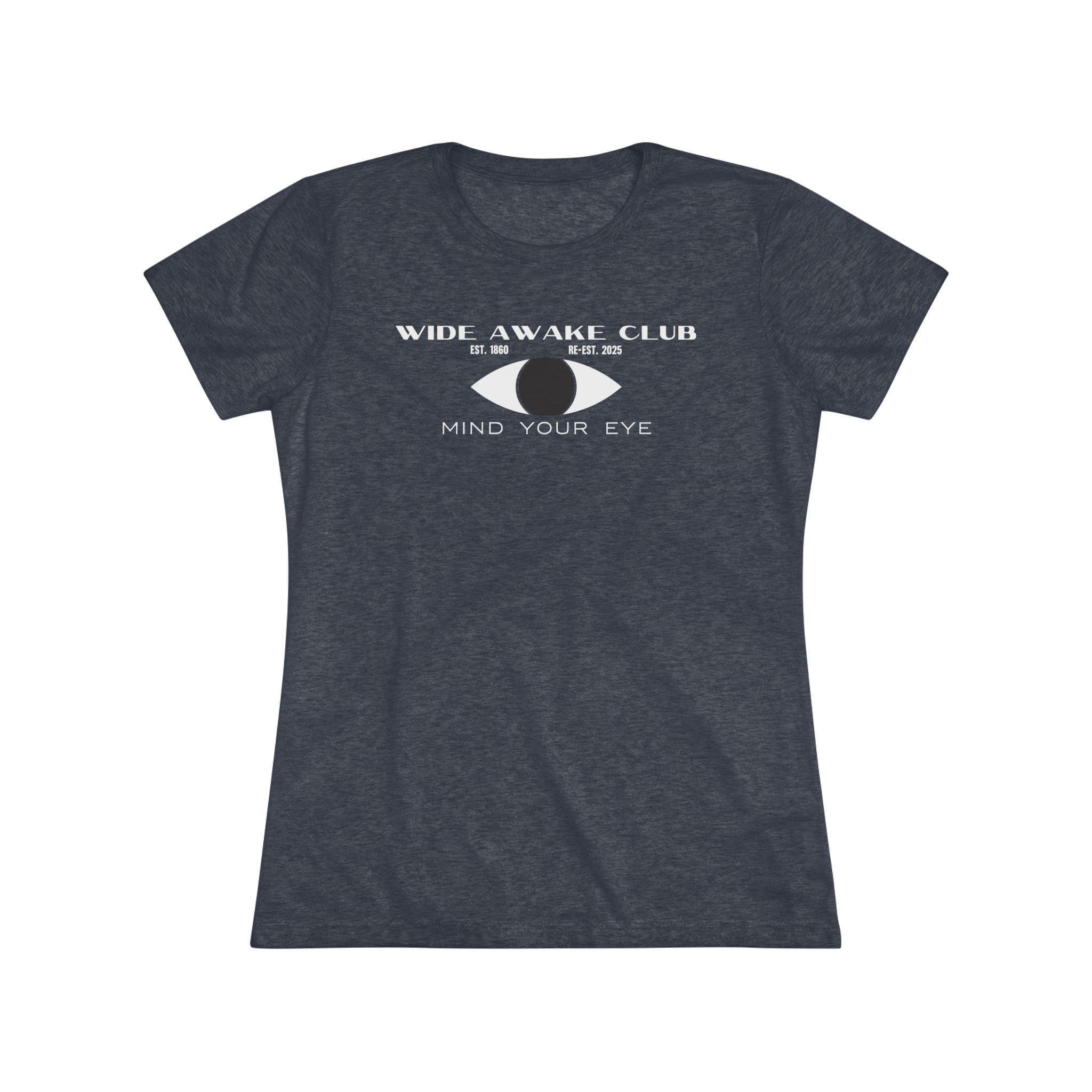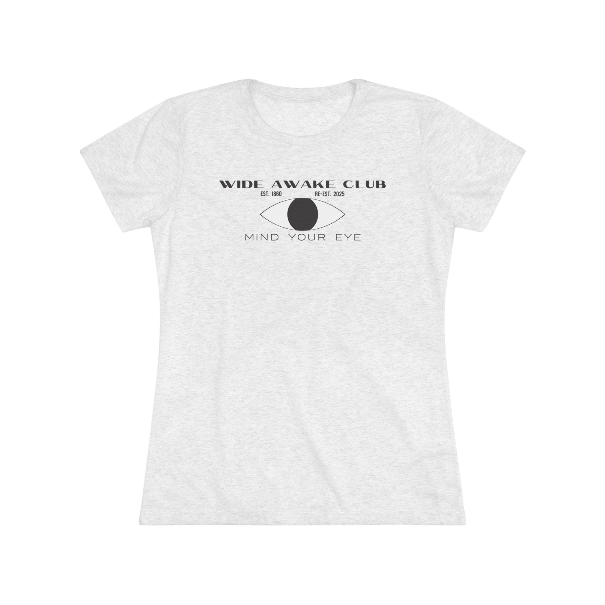This women's t-shirt combines a cool, retro design with a comfortable and stylish fit. The artwork reimagines the 1860s Wide Awakes as a secret society from the 1940s, with a classic Art Deco/Mid-Century logo lockup. The design features a stylized eye, the club's name and history, and the cryptic motto "MIND YOUR EYE." This soft, contoured tee is a perfect way to wear a piece of unique, anachronistic art that feels both historical and stylishly modern.