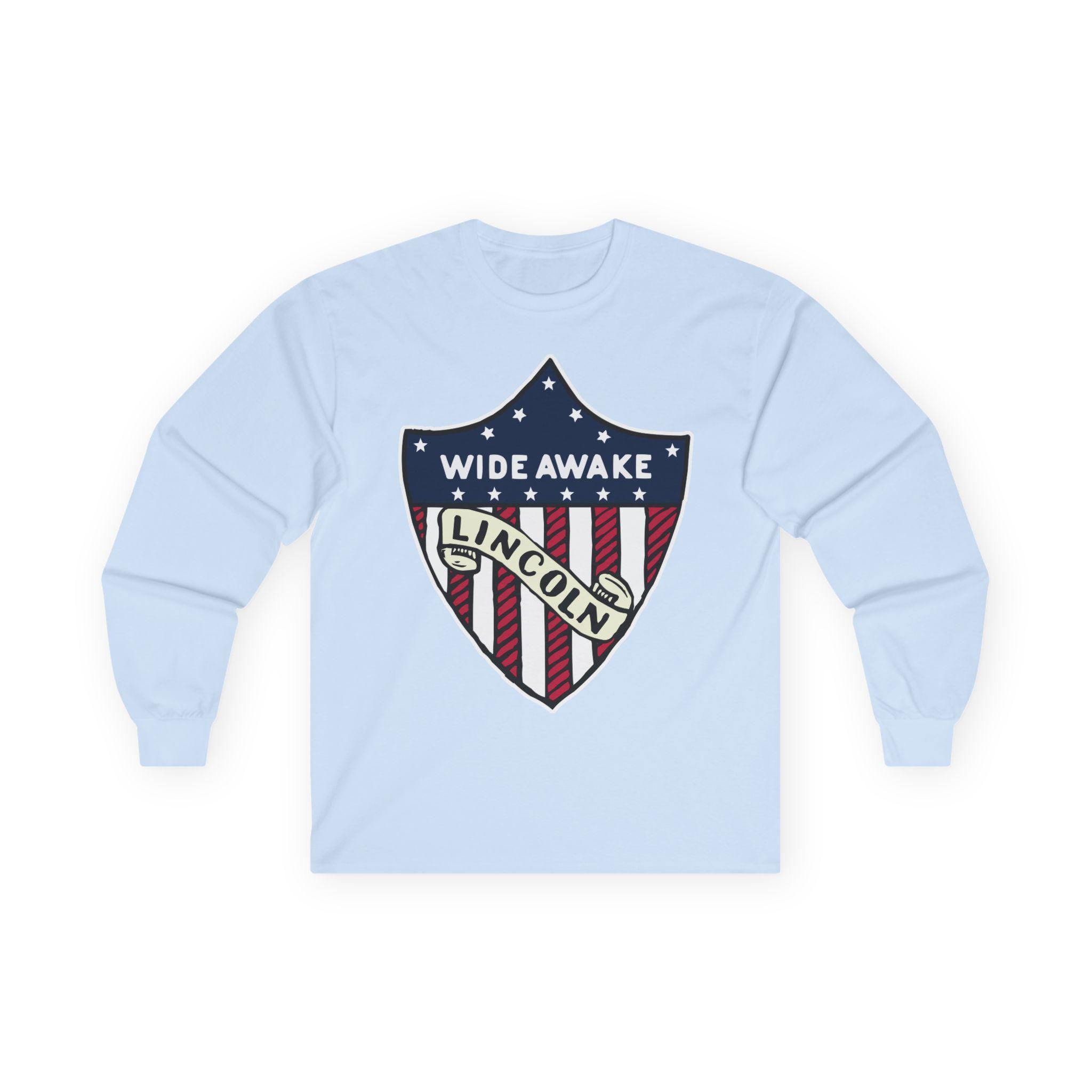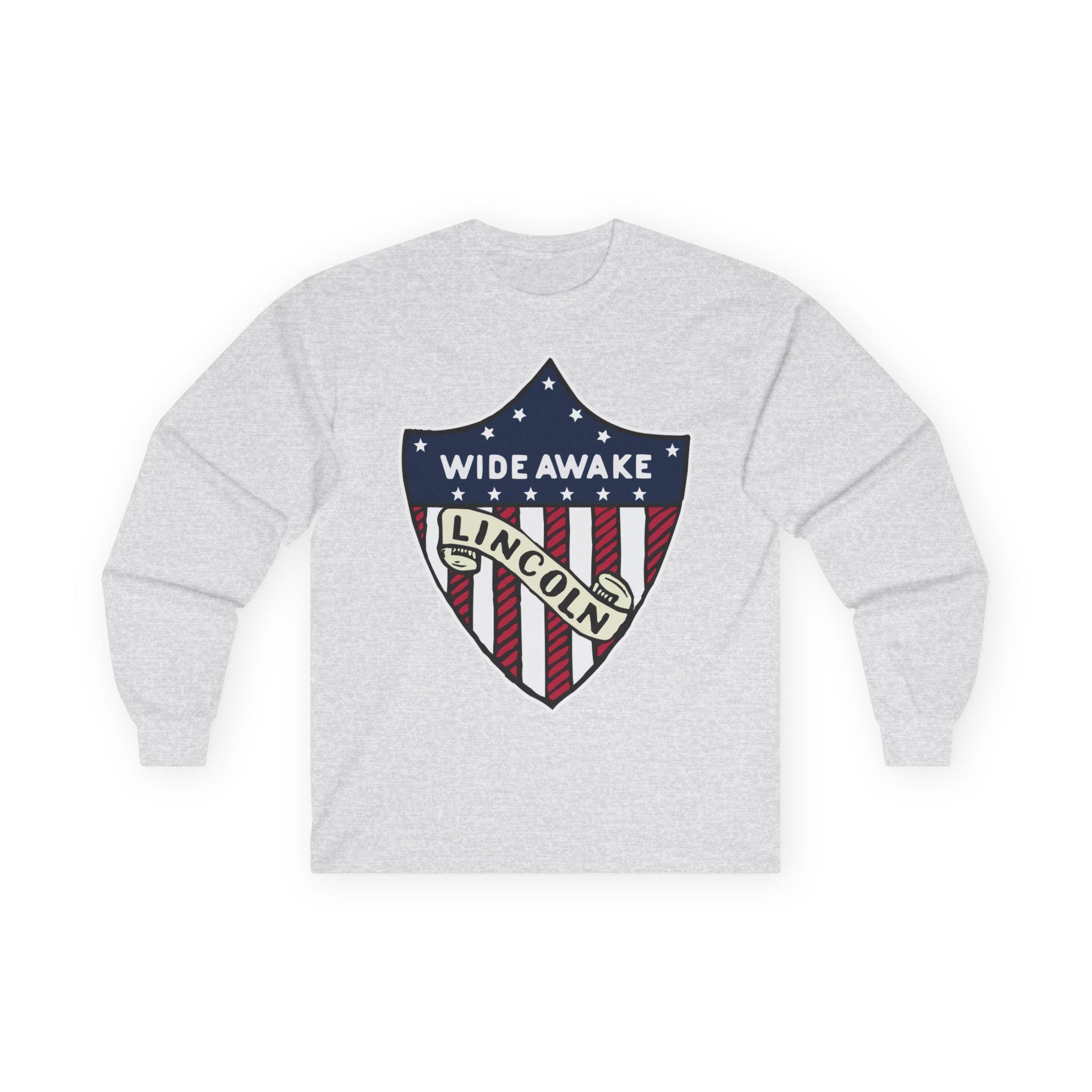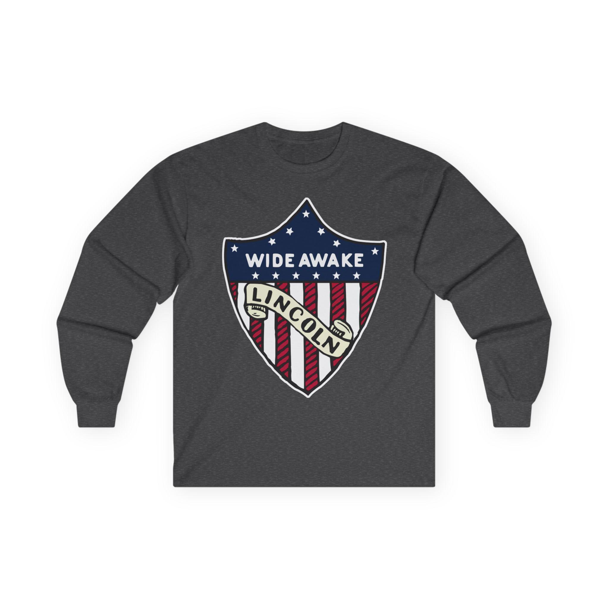 This comfortable longsleeve tee is the perfect layer for fall and a fantastic piece of authentic Americana. The design is taken from a real pin worn by the Wide Awakes during the pivotal 1860 election. It features their name and a clear endorsement for "LINCOLN" integrated into a classic American heraldic shie ld. It's a simple, powerful, and historically significant piece of political branding from one of America's most important youth movements.