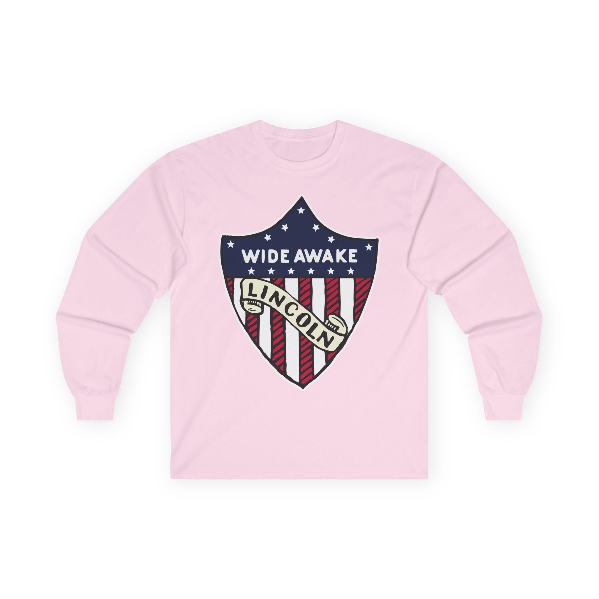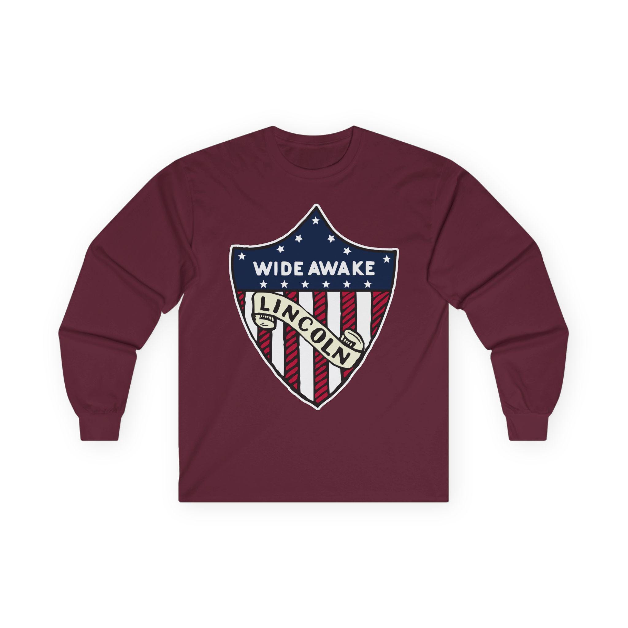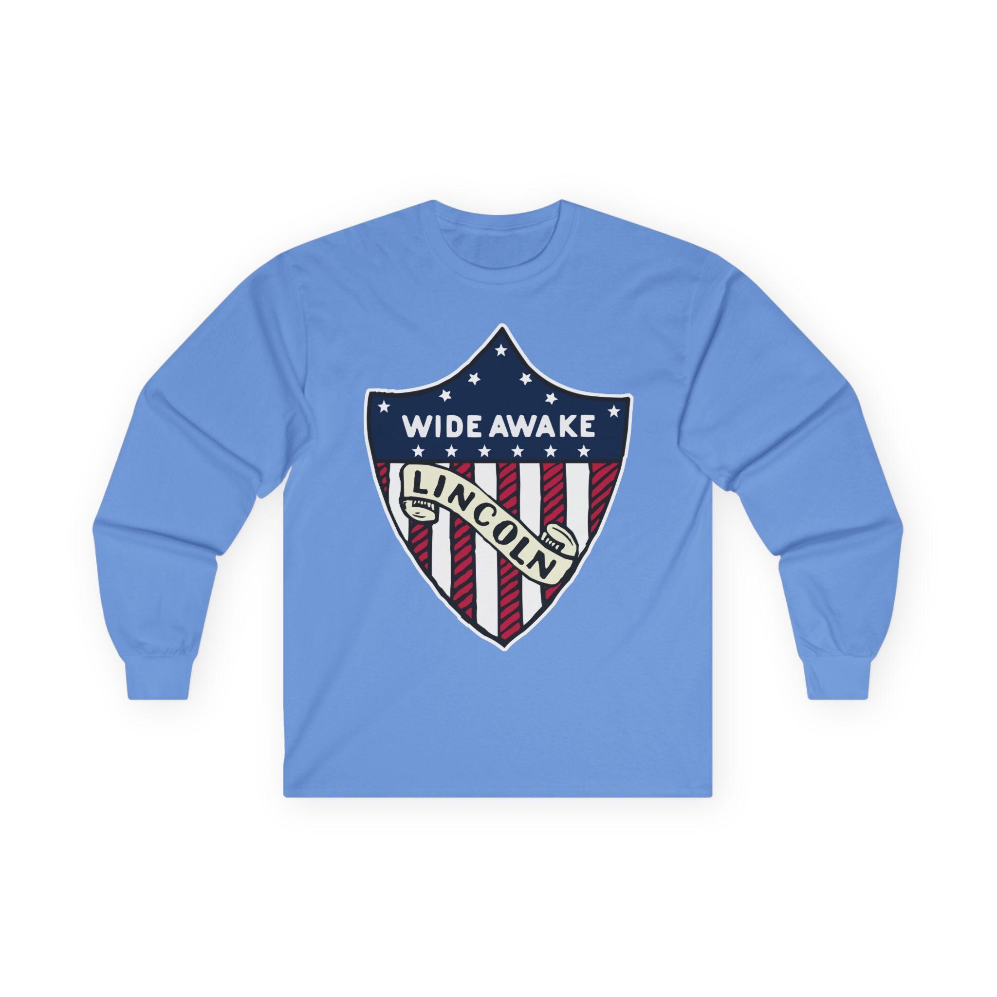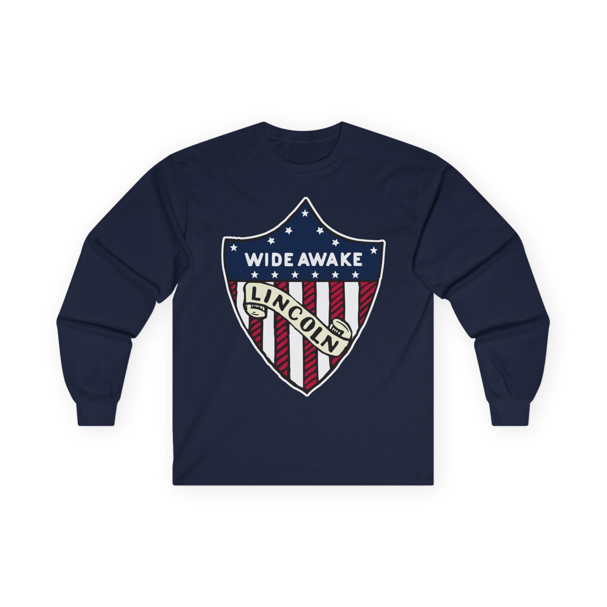 This comfortable longsleeve tee is the perfect layer for fall and a fantastic piece of authentic Americana. The design is taken from a real pin worn by the Wide Awakes during the pivotal 1860 election. It features their name and a clear endorsement for "LINCOLN" integrated into a classic American heraldic shie ld. It's a simple, powerful, and historically significant piece of political branding from one of America's most important youth movements.