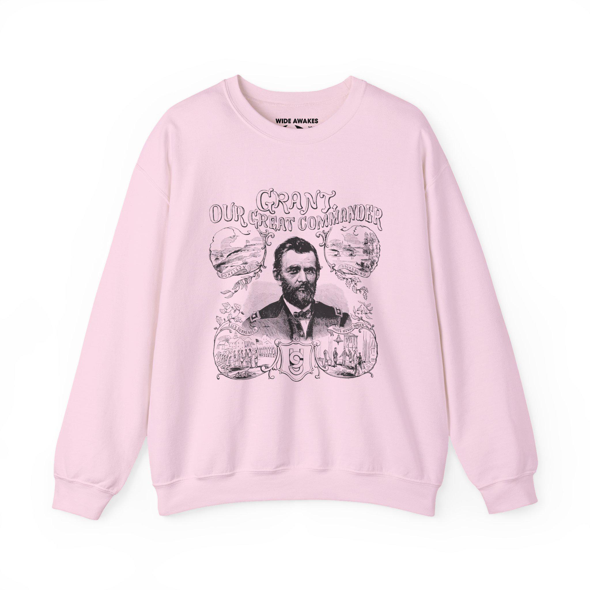Stay warm this fall with a cozy crewneck sweatshirt that celebrates General Grant's "greatest hits." The design, restored from the cover of a 19th-century piece of sheet music, is laid out just like a classic band tour shirt. A central portrait of Grant is surrounded by four vignettes of his most famous "venues": the battlefields of Fort Donelson and Vicksburg, the historic surrender at Appomattox Courthouse, and his ultimate destination, The White House. It's a fun, clever, and historically detailed piece for those chilly autumn nights.