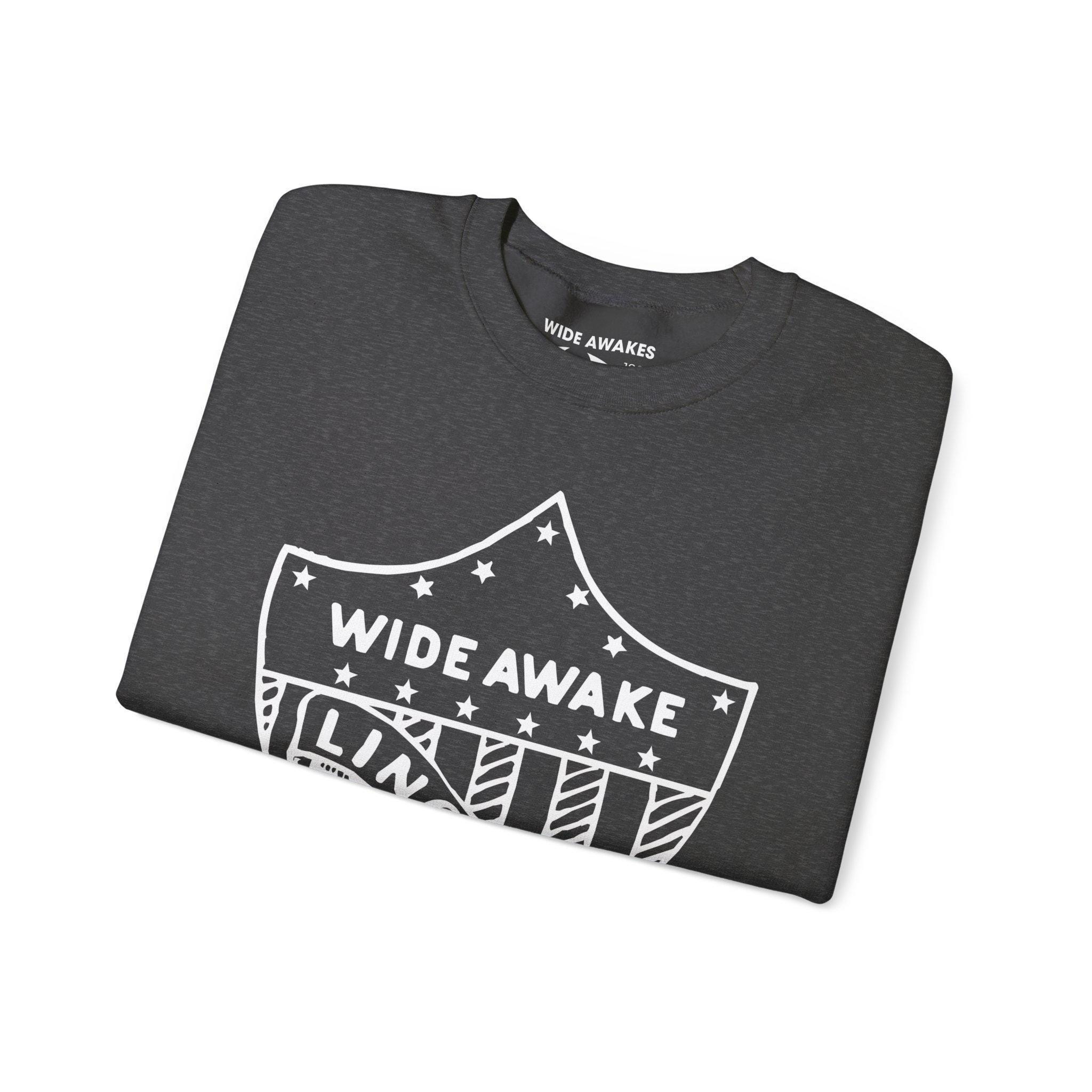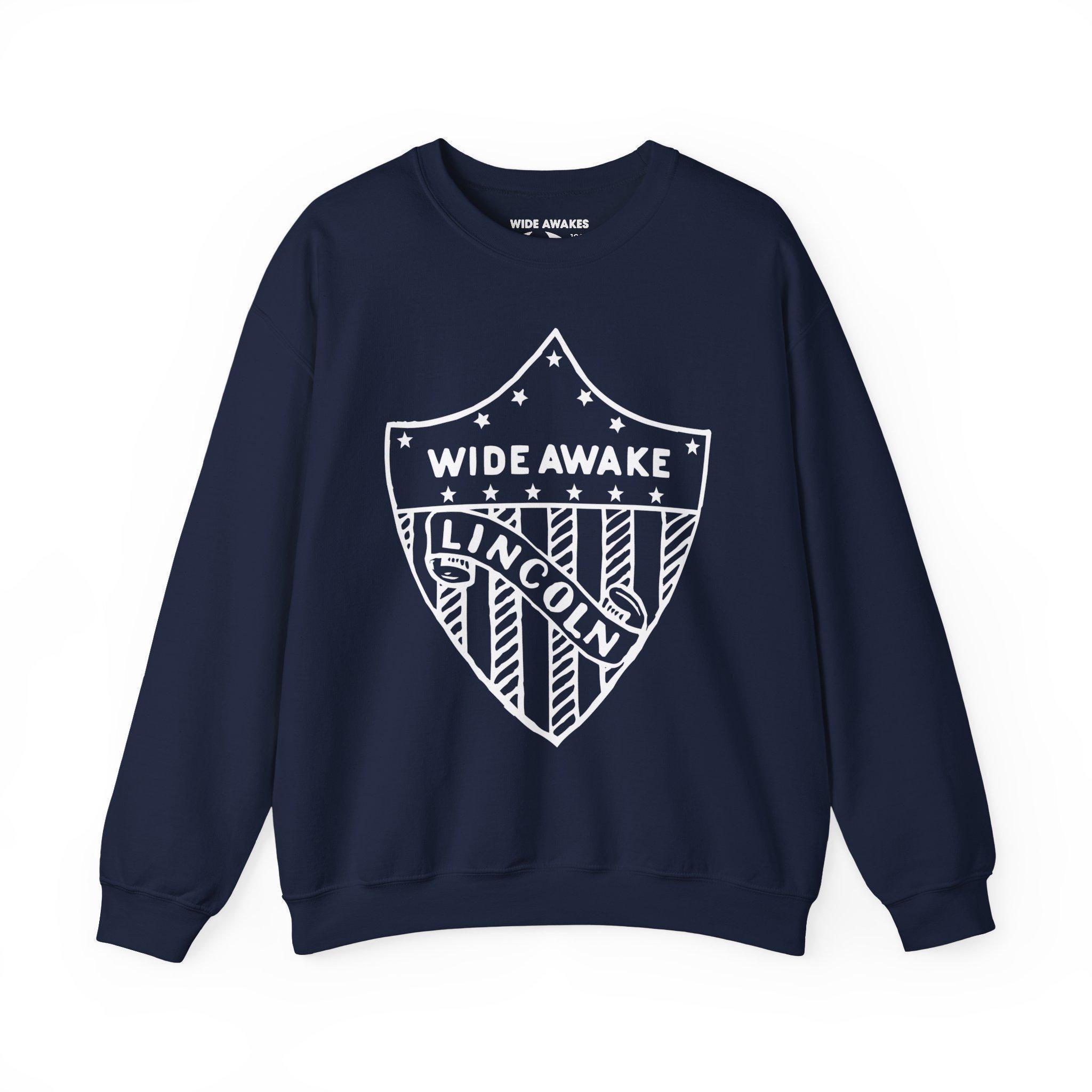 Stay warm this fall with a cozy crewneck sweatshirt featuring an authentic piece of American political history. The design is a restored emblem from a pin worn by the Wide Awakes in 1860. The powerful and effective design places the movement's name, "WIDE AWAKE," and their candidate, "LINCOLN," directly onto a patriotic American shie ld. It's a bold declaration of support from the anti-slavery youth movement that took the nation by storm. This comfortable sweatshirt is a perfect, stylish piece for any history enthusiast.