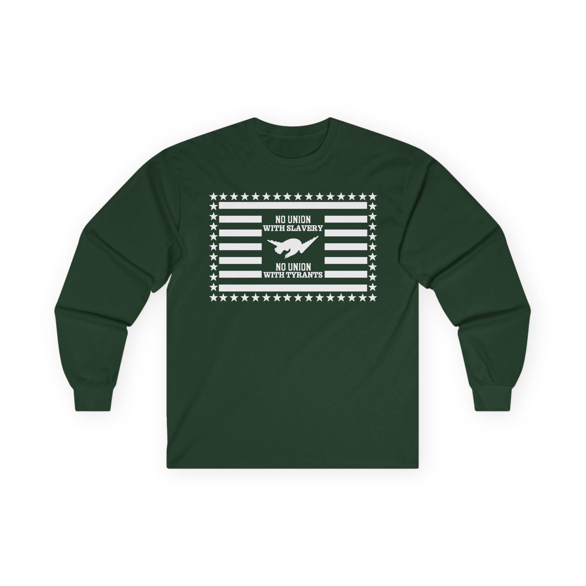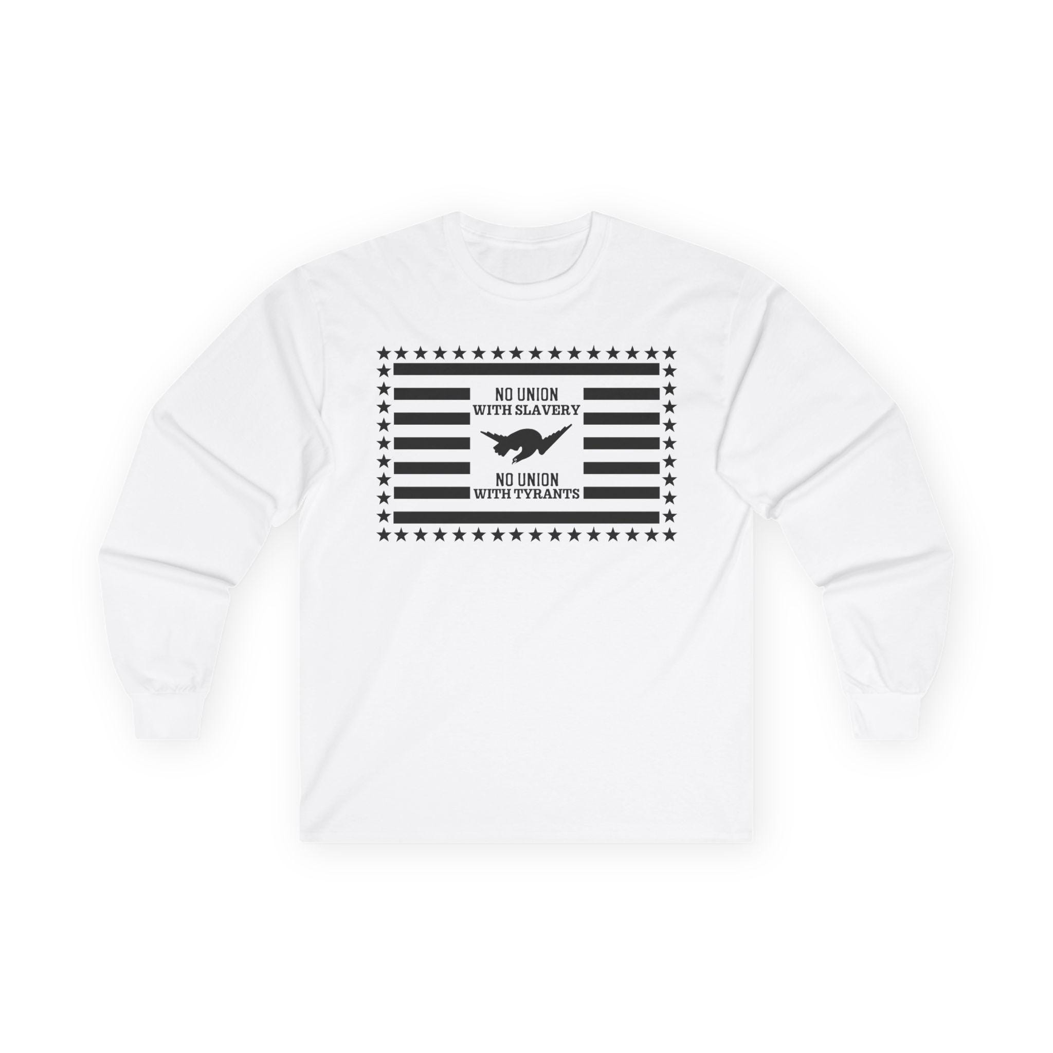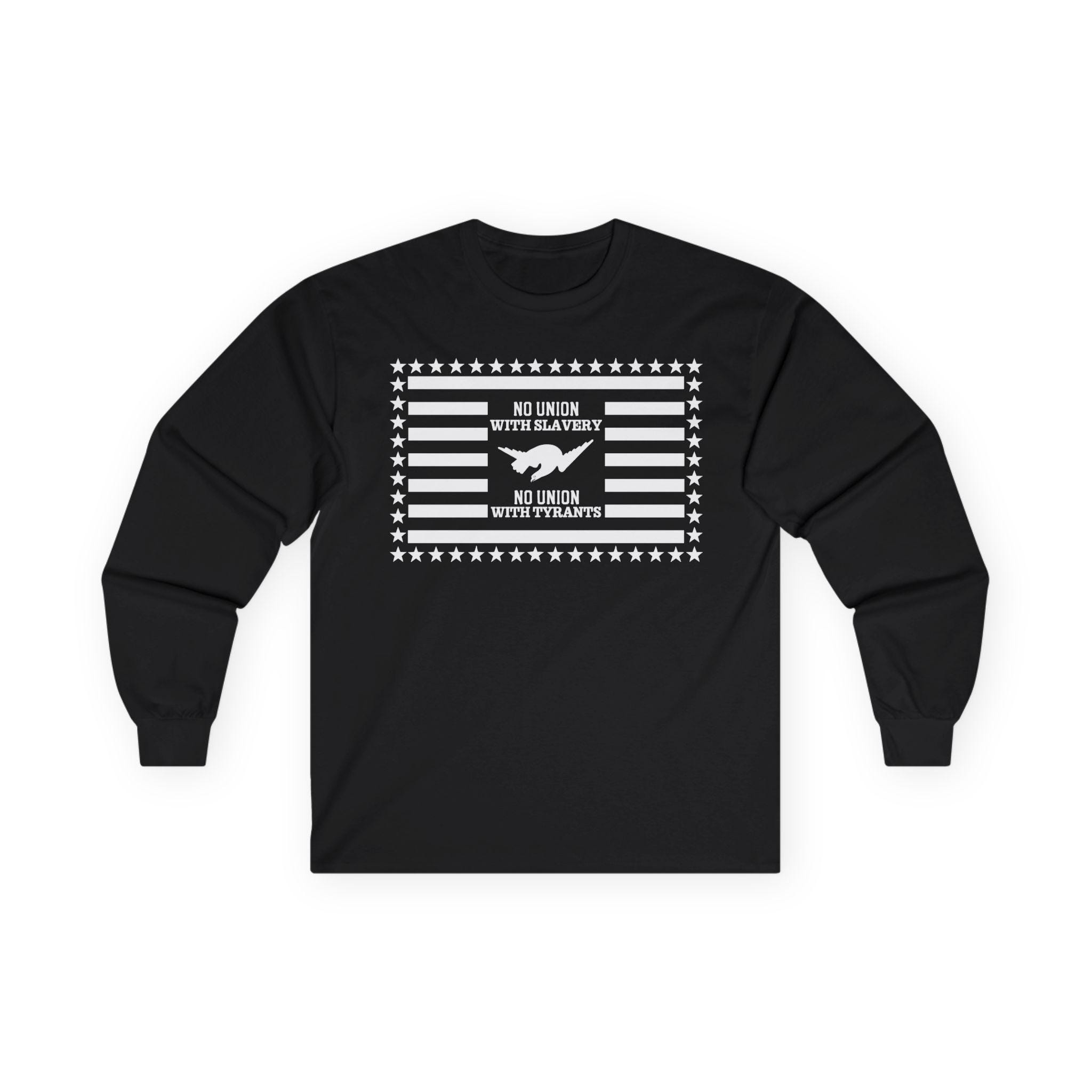This comfortable longsleeve tee is the perfect layer for fall and a powerful statement of principle. The design is a modern take on the stark, black-and-white "Abolitionist Flag" of the 1800s. We've updated it for today, creating an inclusive 50-star border and adding a second motto to connect the past with the present. The shirt carries a dual message against oppression, both historic and modern: "No Union with Slavery" and "No Union with Tyranny."