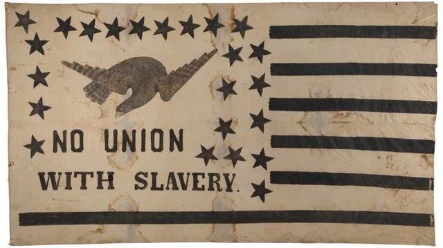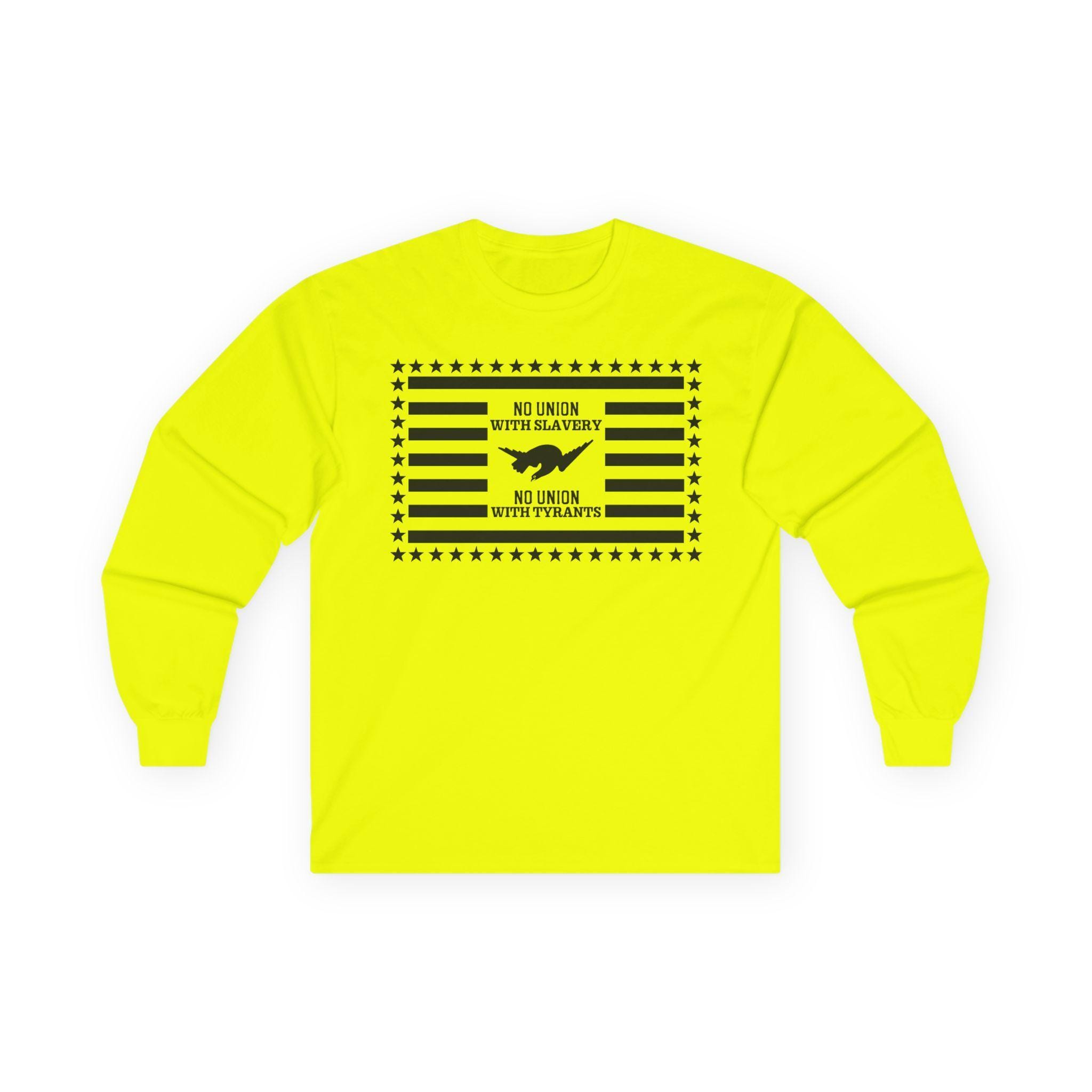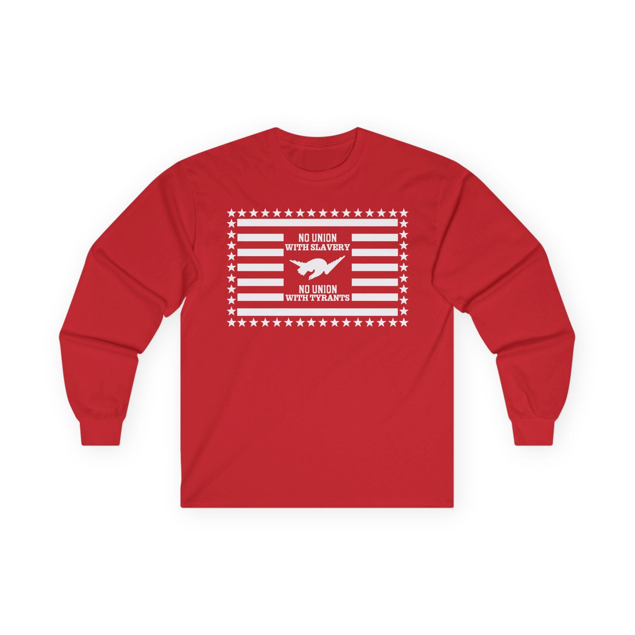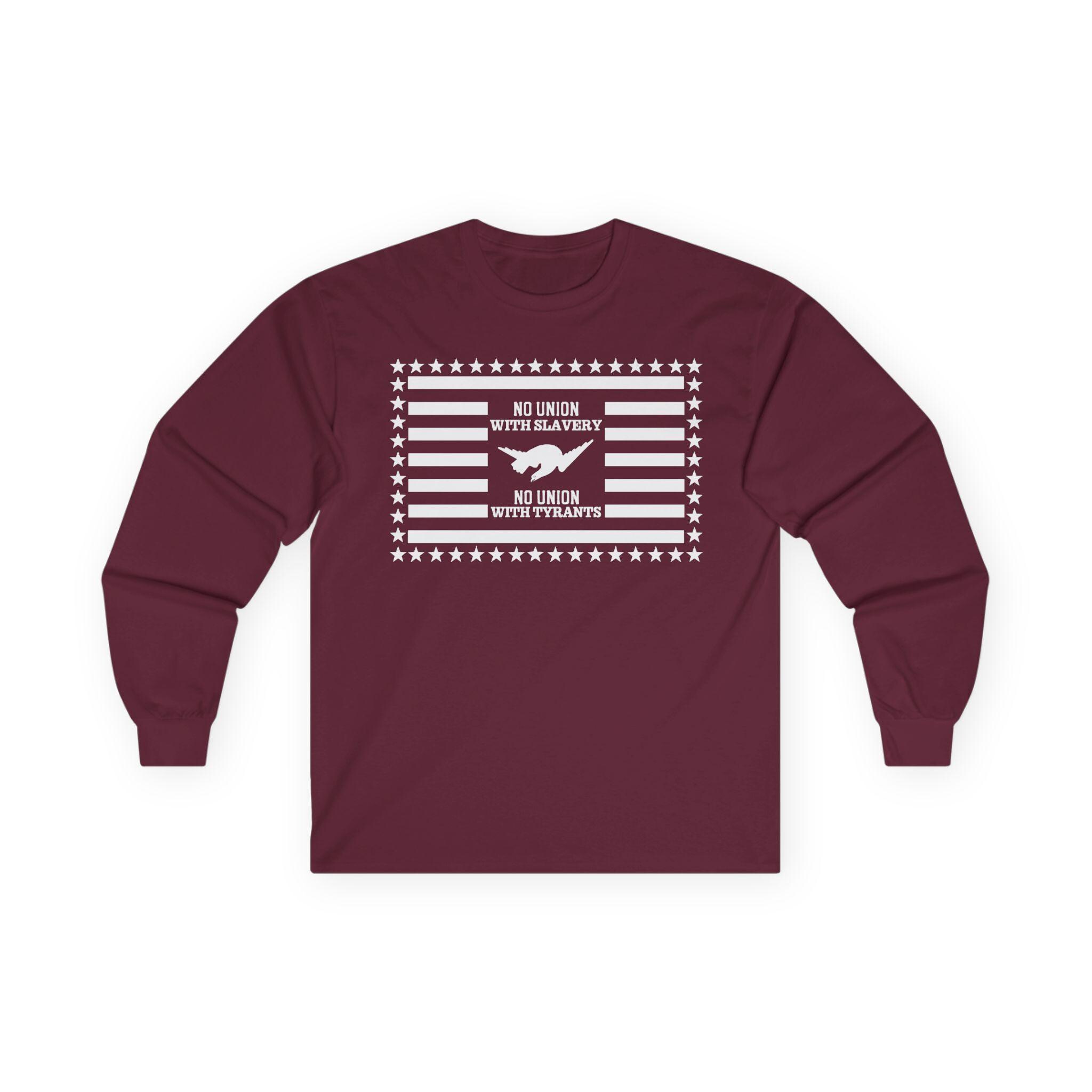 This comfortable longsleeve tee is the perfect layer for fall and a powerful statement of principle. The design is a modern take on the stark, black-and-white "Abolitionist Flag" of the 1800s. We've updated it for today, creating an inclusive 50-star border and adding a second motto to connect the past with the present. The shirt carries a dual message against oppression, both historic and modern: "No Union with Slavery" and "No Union with Tyranny."