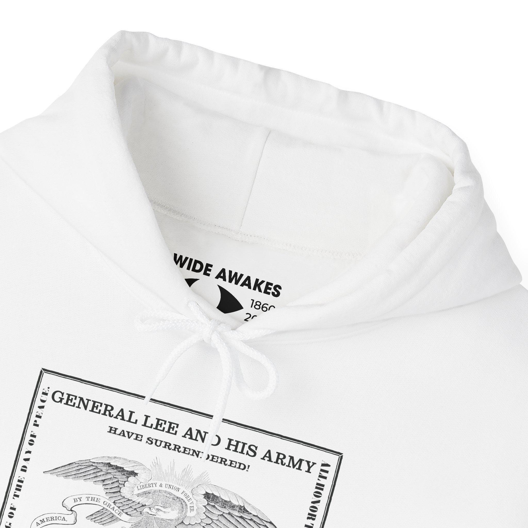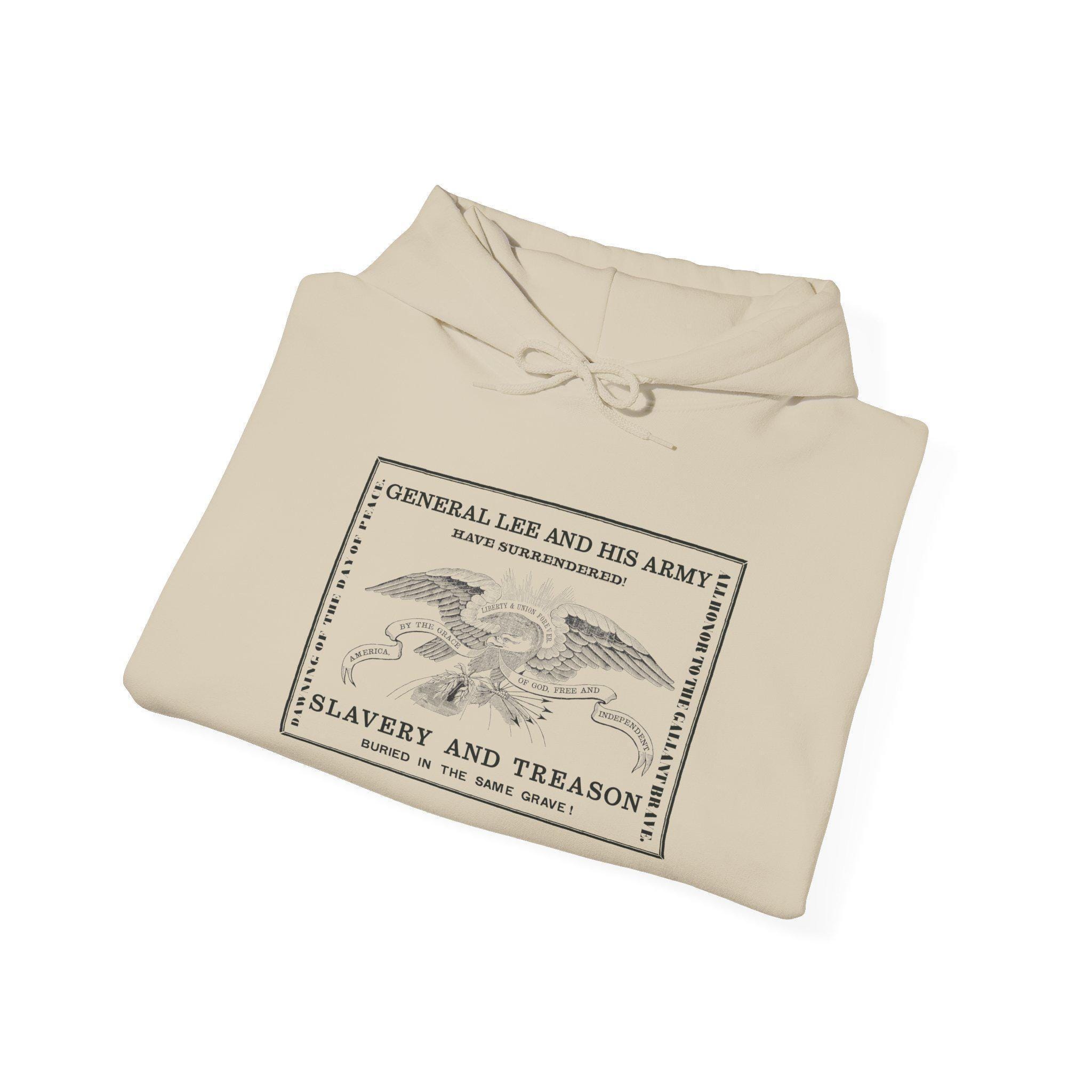 This comfortable and warm hoodie features a complete, restored page of celebration from the Albany Journal, printed the day after Lee's surrender in 1865. It's a powerful tribute to the end of the Civil War and the triumph of the Union. The design is rich with detail, from the central eagle proclaiming "LIBERTY & UNION FOREVER" to the bold declarations lining the frame, including "GENERAL LEE AND HIS ARMY HAVE SURRENDERED!" and "DAWNING OF THE DAY OF PEACE." With a soft fleece interior and a spacious front pocket, this hoodie is a piece of wearable history celebrating a nation's relief.