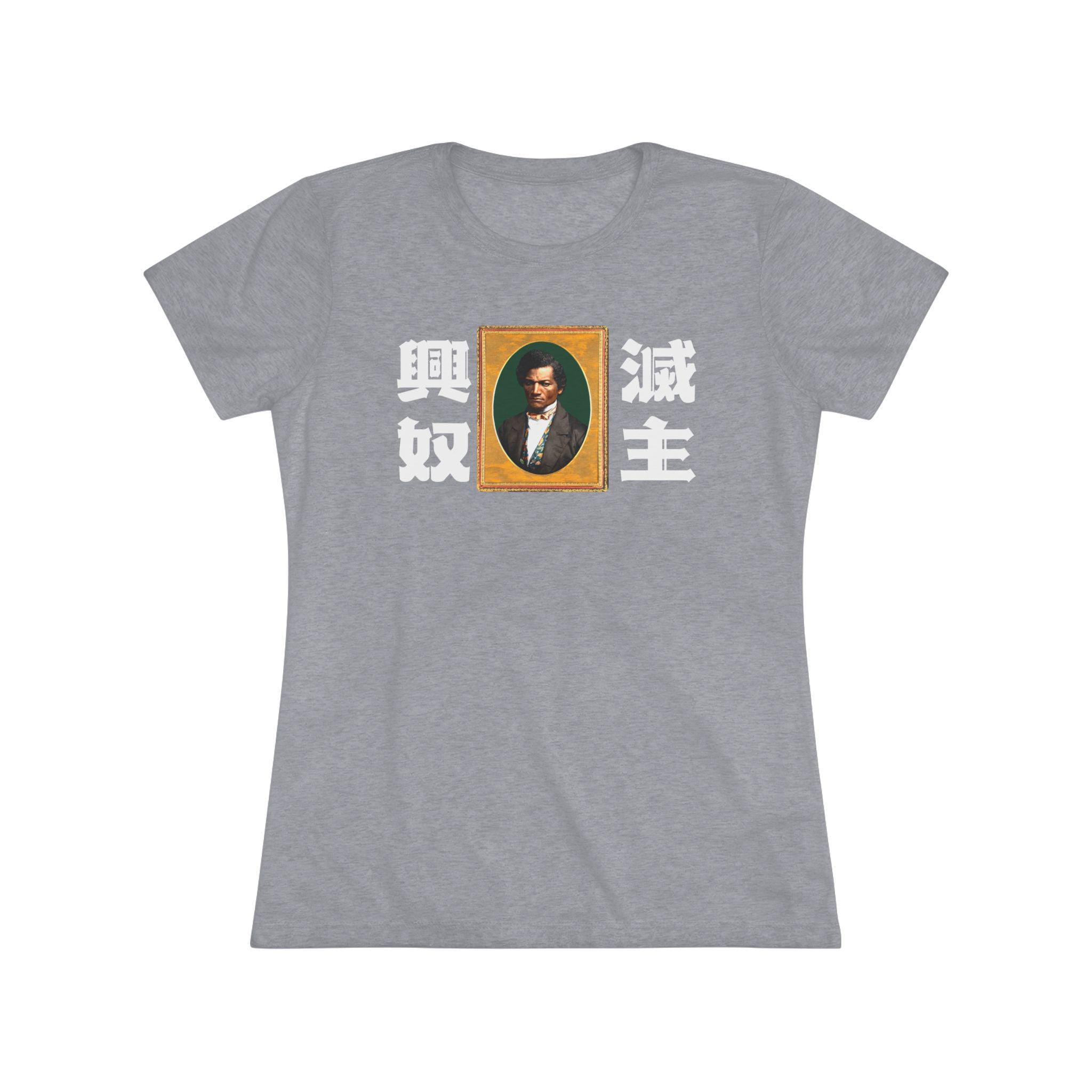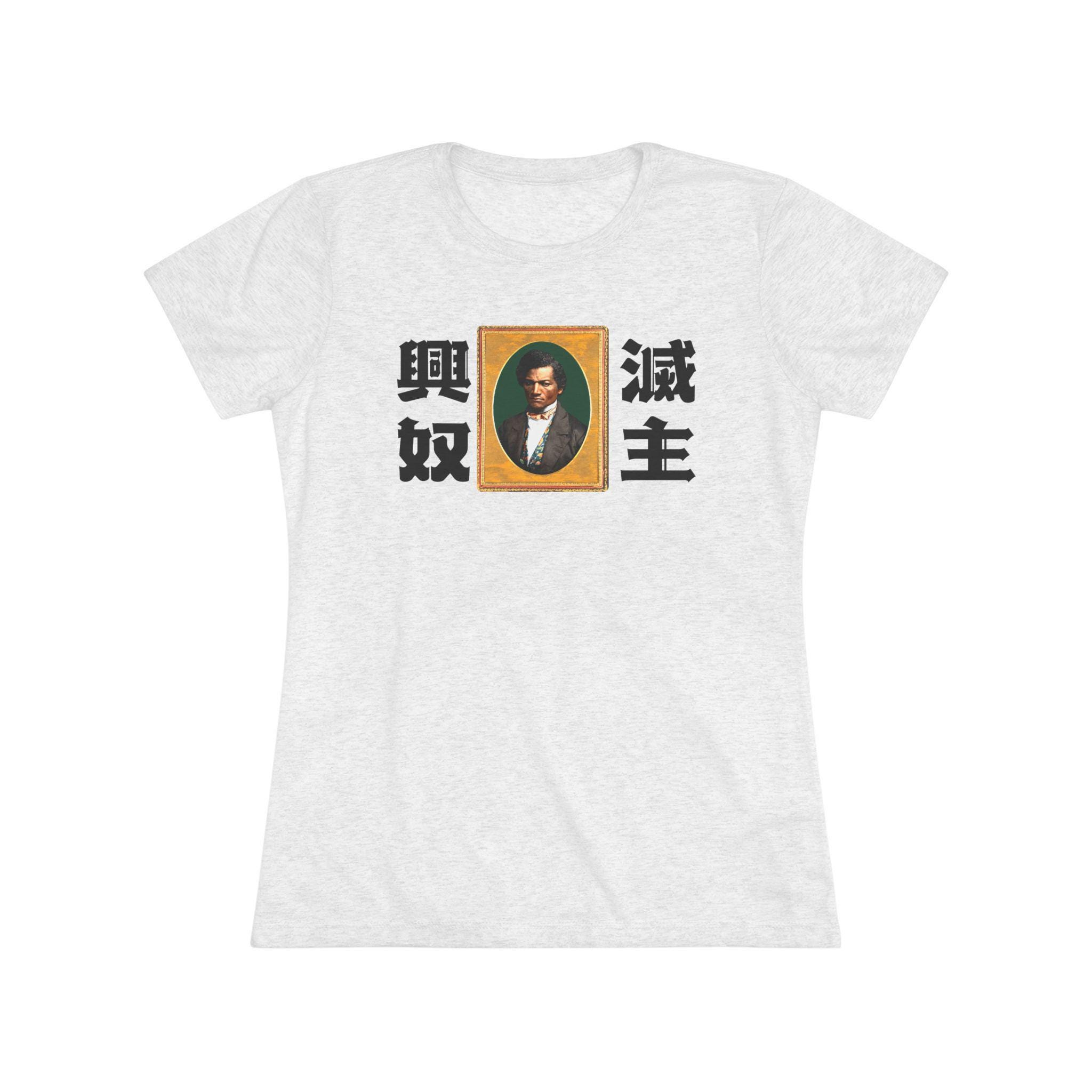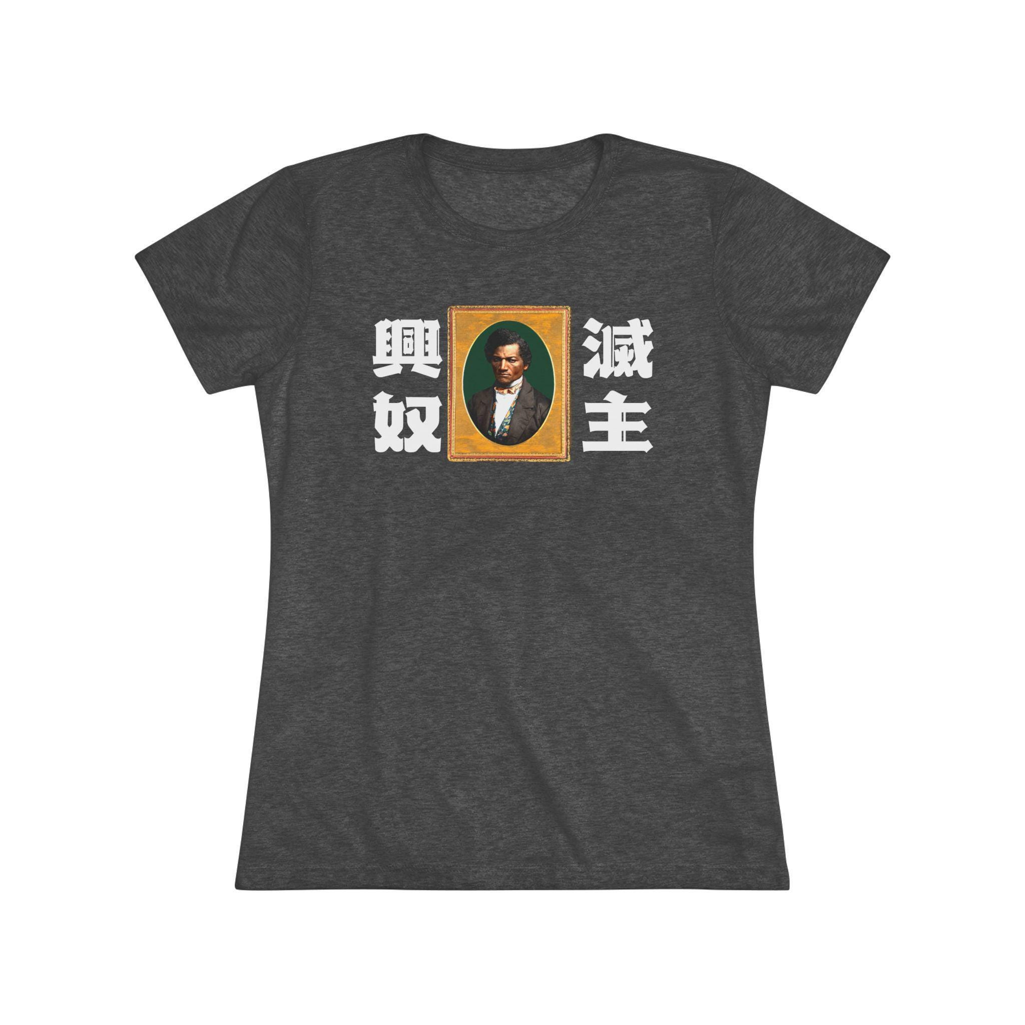 This women's t-shirt combines a powerful abolitionist message with a comfortable and stylish fit. The design features a classic, intense portrait of Frederick Douglass, paired with the stark Japanese yojijukugo 滅主興奴 (Messhu kōdo), a phrase that translates to "Death to the Master, Glory to the Slave." The unique, blackletter-inspired Japanese font adds a layer of artistic anachronism. This soft, contoured tee is a perfect way to wear a piece of profound and radical history.