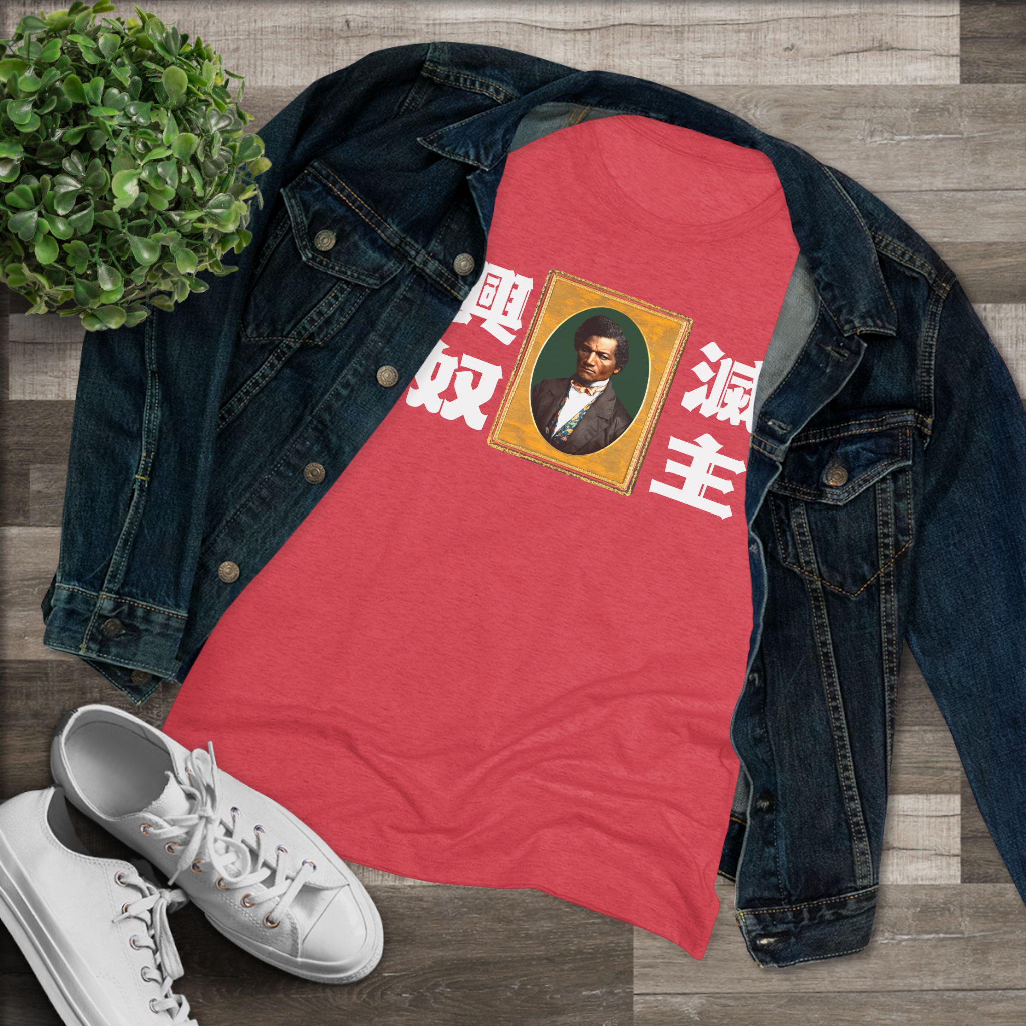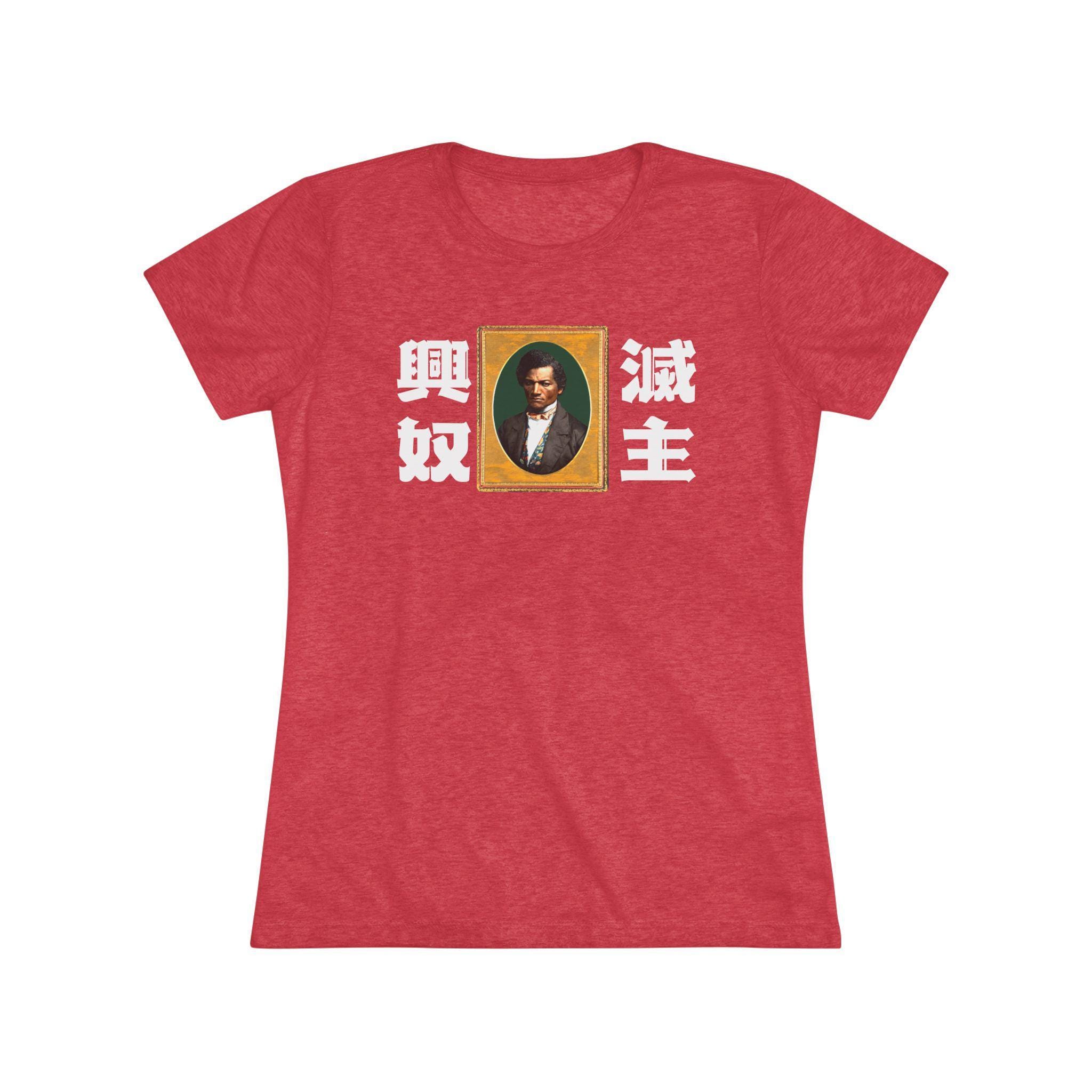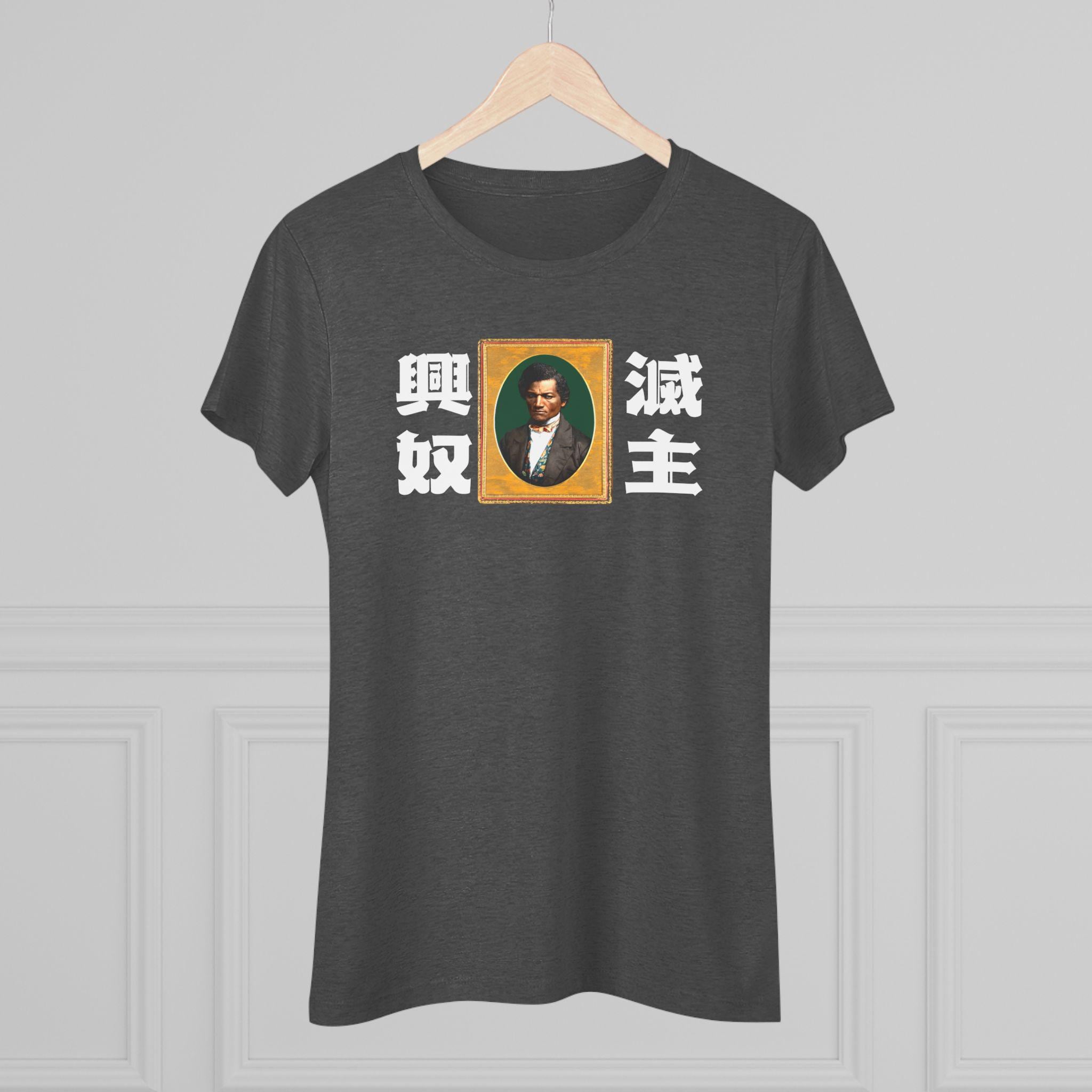 This women's t-shirt combines a powerful abolitionist message with a comfortable and stylish fit. The design features a classic, intense portrait of Frederick Douglass, paired with the stark Japanese yojijukugo 滅主興奴 (Messhu kōdo), a phrase that translates to "Death to the Master, Glory to the Slave." The unique, blackletter-inspired Japanese font adds a layer of artistic anachronism. This soft, contoured tee is a perfect way to wear a piece of profound and radical history.