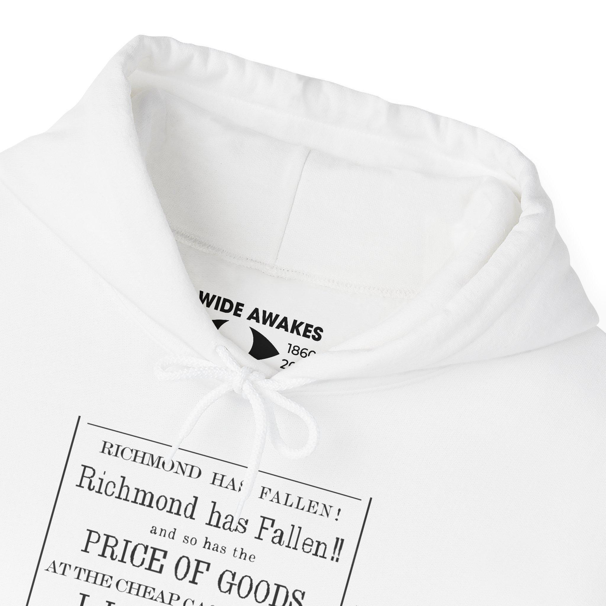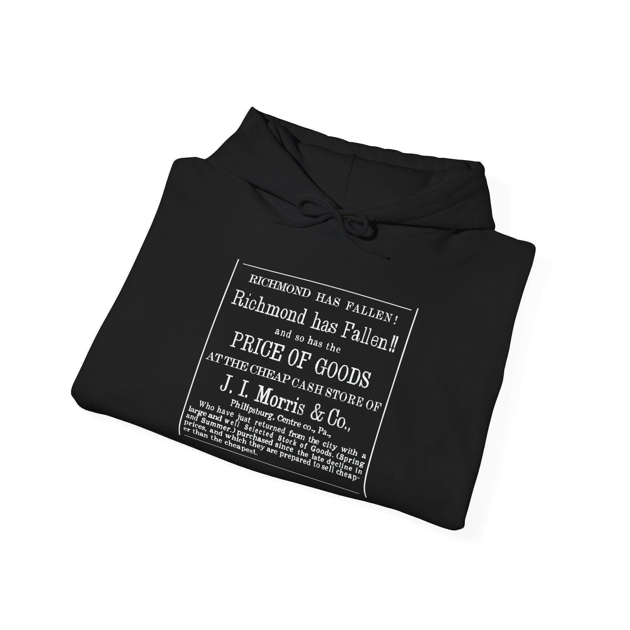 This warm and comfortable hoodie celebrates the end of the Civil War with a hilarious piece of local Pennsylvania history. The design is a faithful reproduction of an advertisement from the Raftsman's Journal, where J. I. Morris & Co.'s Cheap Cash Store cheekily announced that just as "RICHMOND HAS FALLEN!," so too had their prices. In fact, they promised to be "cheaper than the cheapest." With a soft fleece interior and a spacious front pocket, this hoodie is a piece of wearable satire for anyone who appreciates the witty, commercial spirit of 19th-century America.