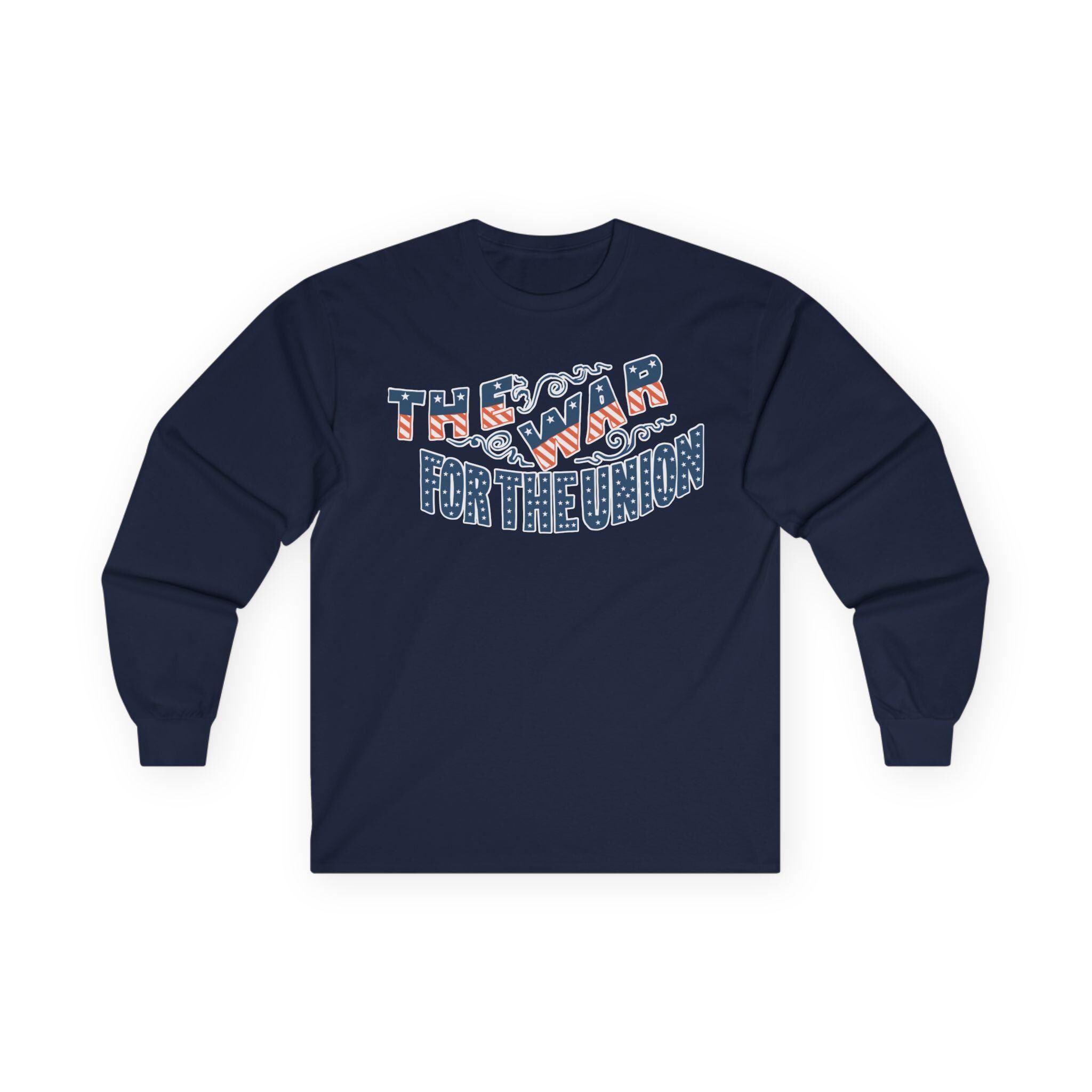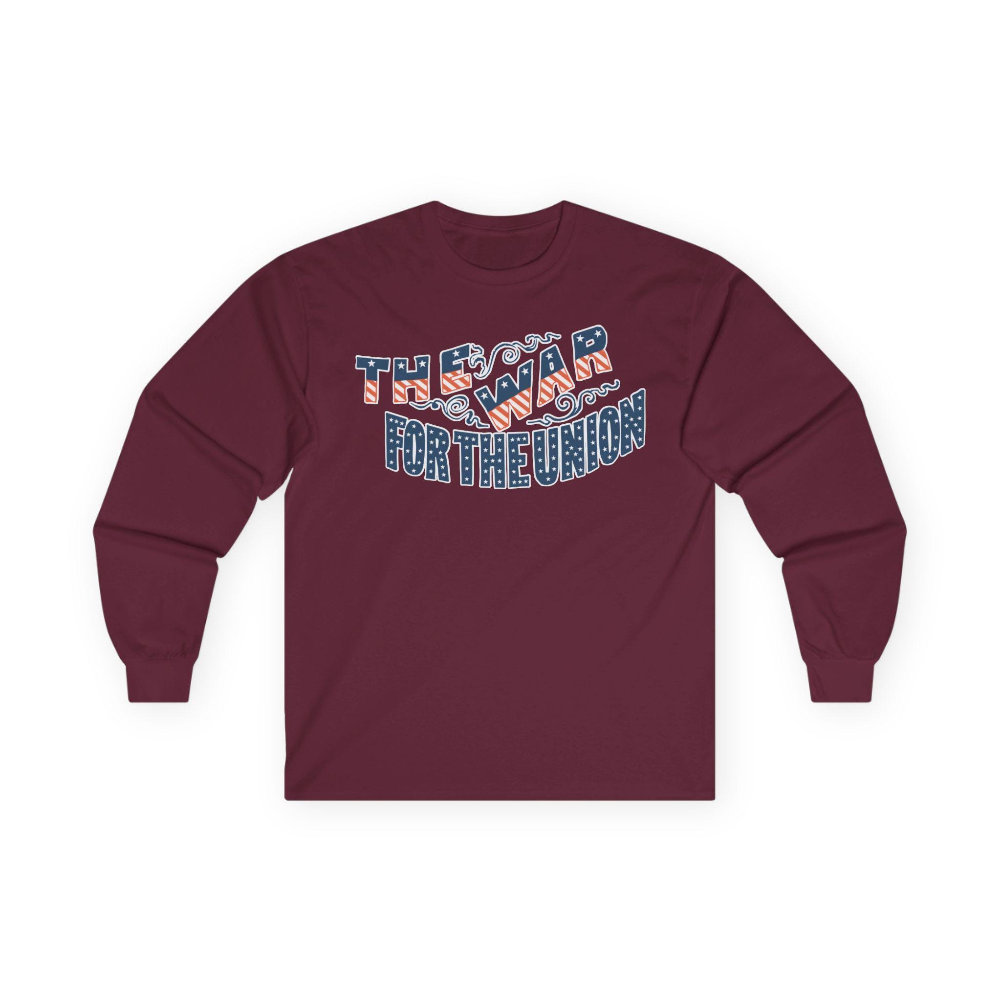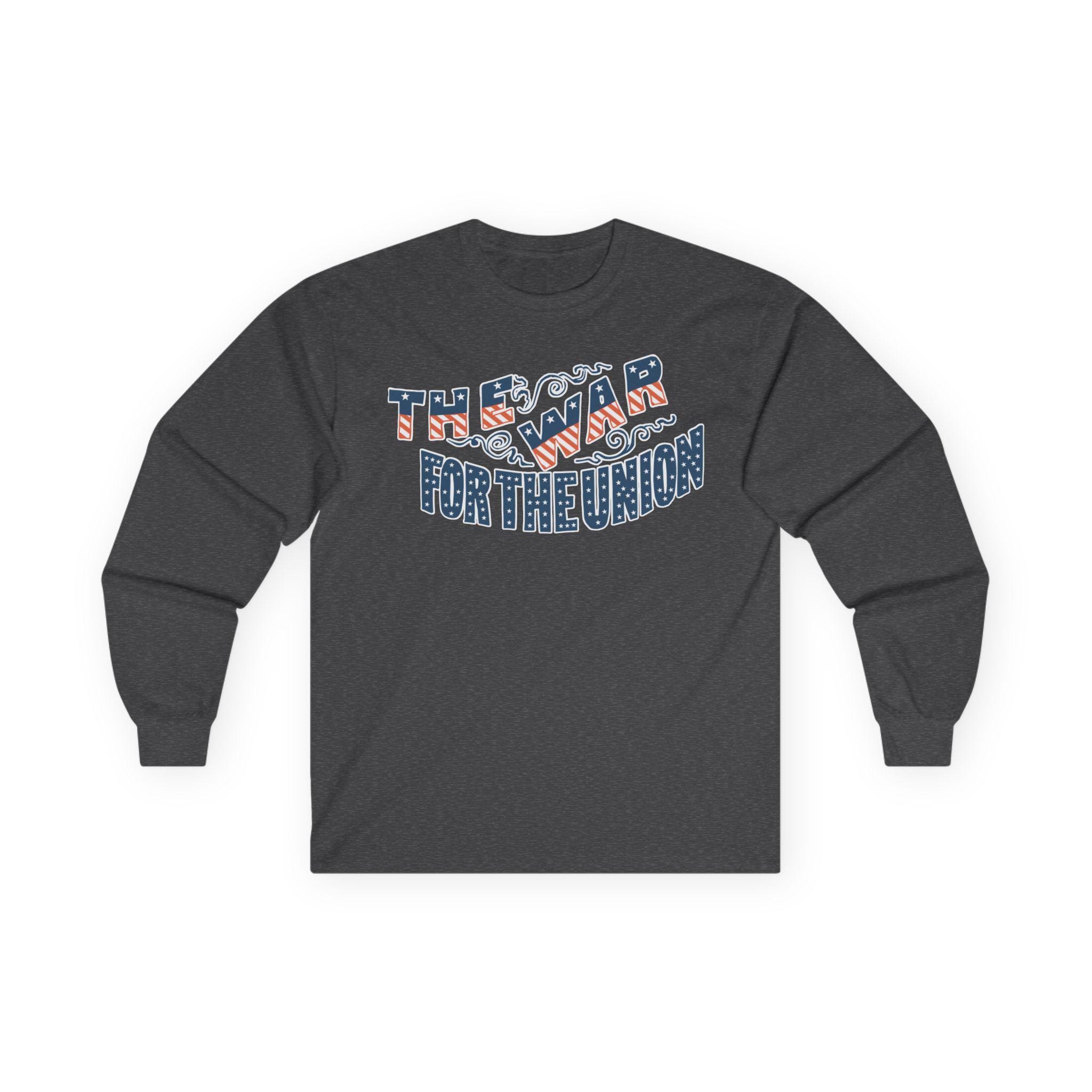 This comfortable longsleeve tee features a restored design from a patriotic pro-Union envelope stamp from the Civil War era. The slogan "THE WAR FOR THE UNION" is presented in a dynamic, ornate style. The letters themselves are cleverly filled with the pattern of the American flag—stars on a blue field and red and white stripes. Perfect for layering in the cooler fall weather, it's a visually stunning and historically authentic piece of Americana.