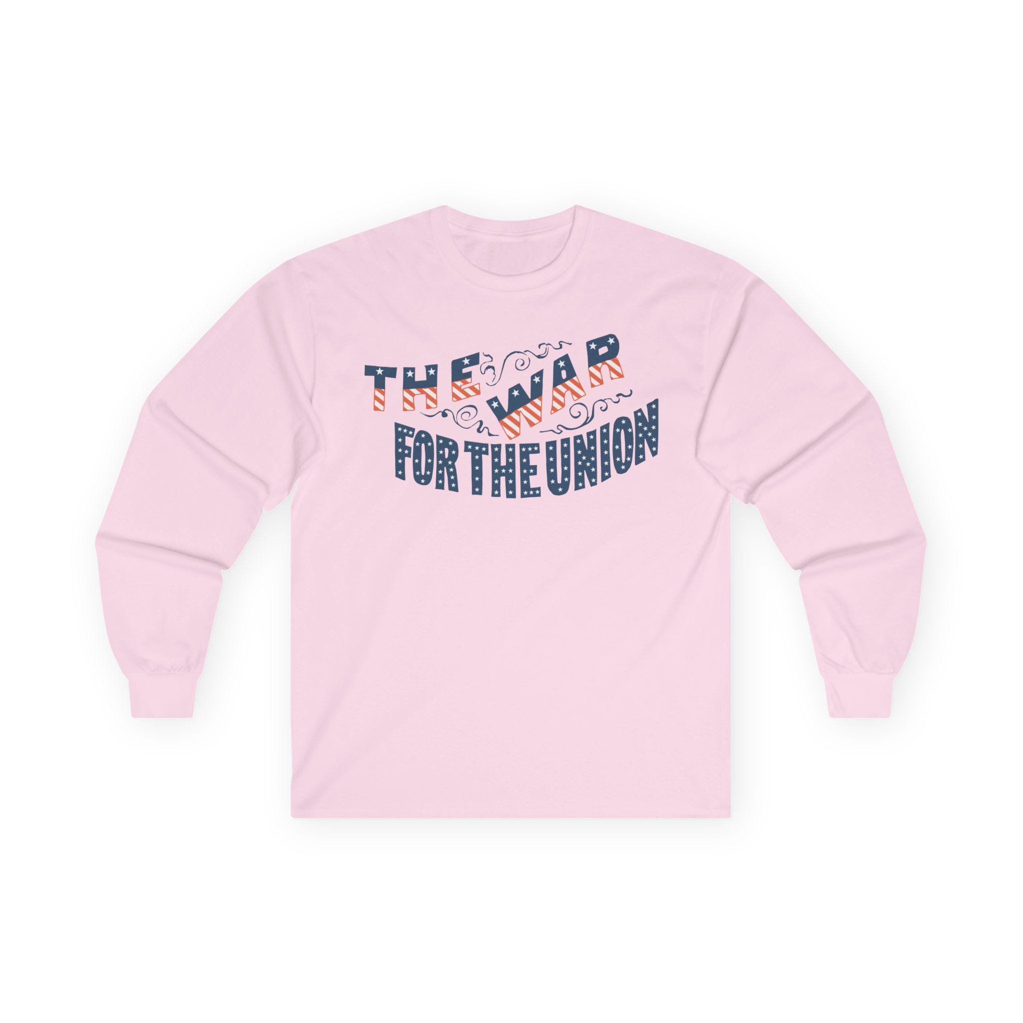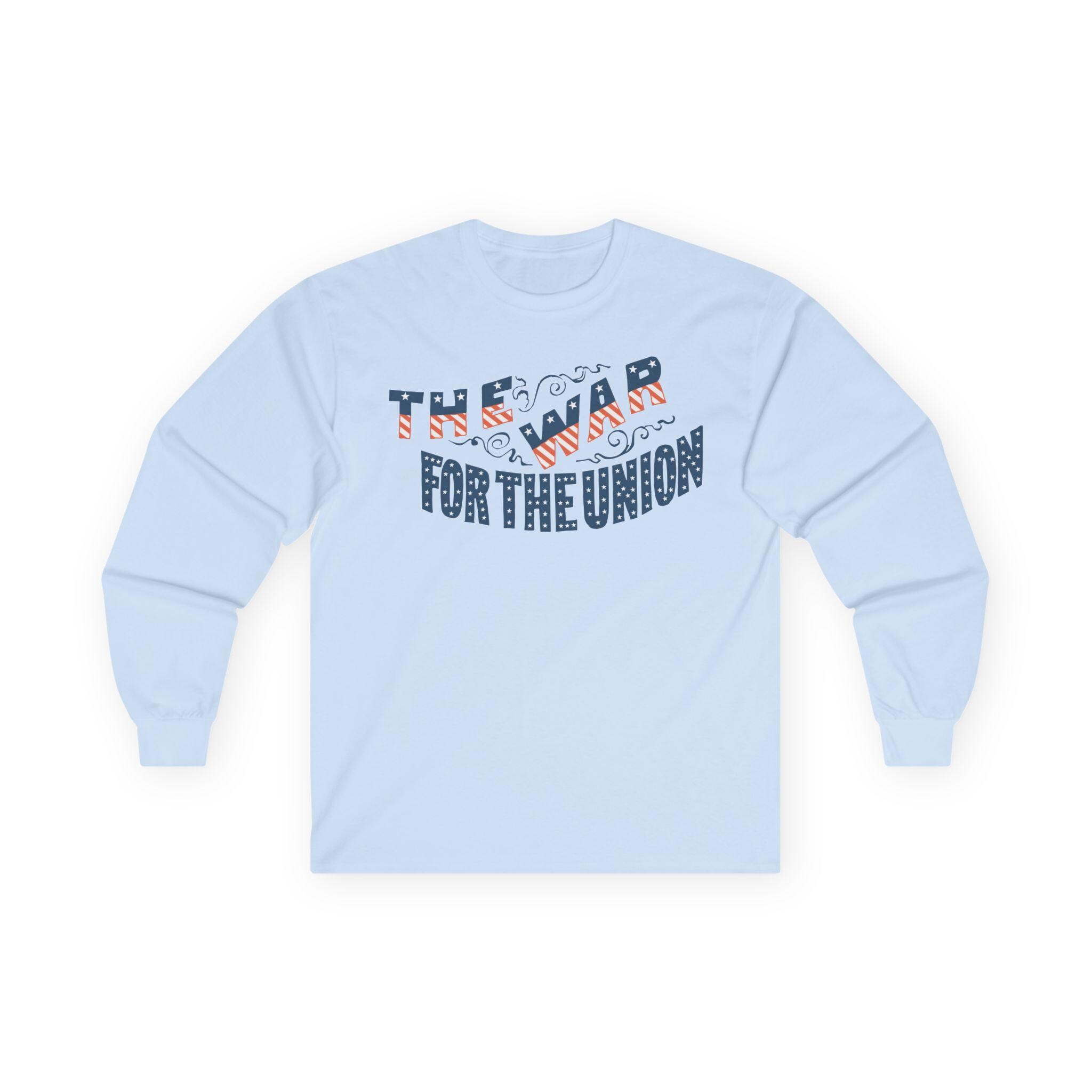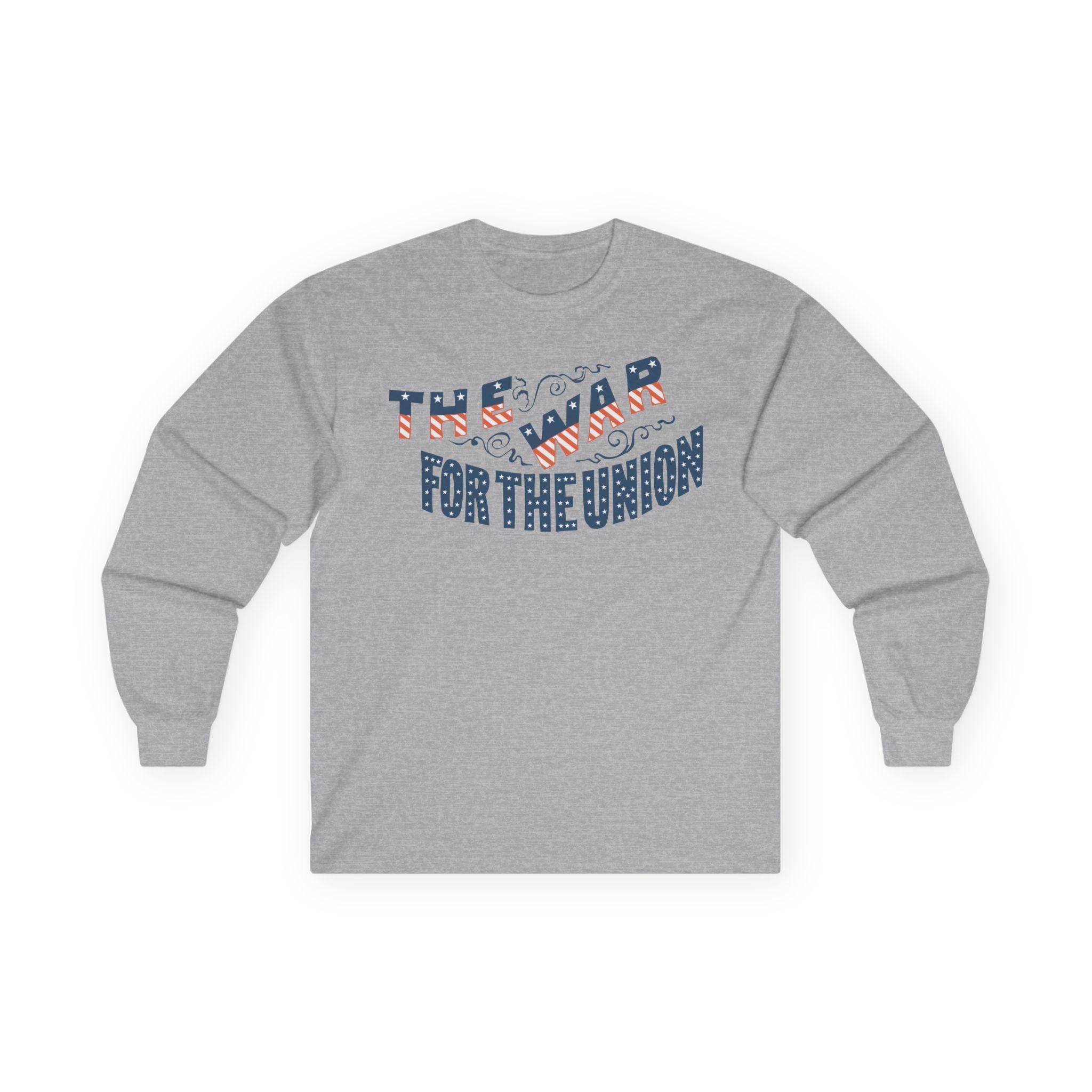 This comfortable longsleeve tee features a restored design from a patriotic pro-Union envelope stamp from the Civil War era. The slogan "THE WAR FOR THE UNION" is presented in a dynamic, ornate style. The letters themselves are cleverly filled with the pattern of the American flag—stars on a blue field and red and white stripes. Perfect for layering in the cooler fall weather, it's a visually stunning and historically authentic piece of Americana.