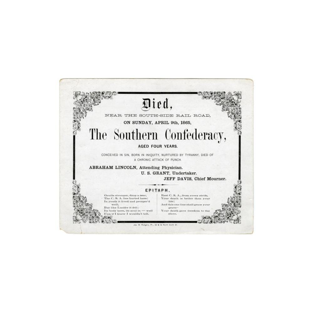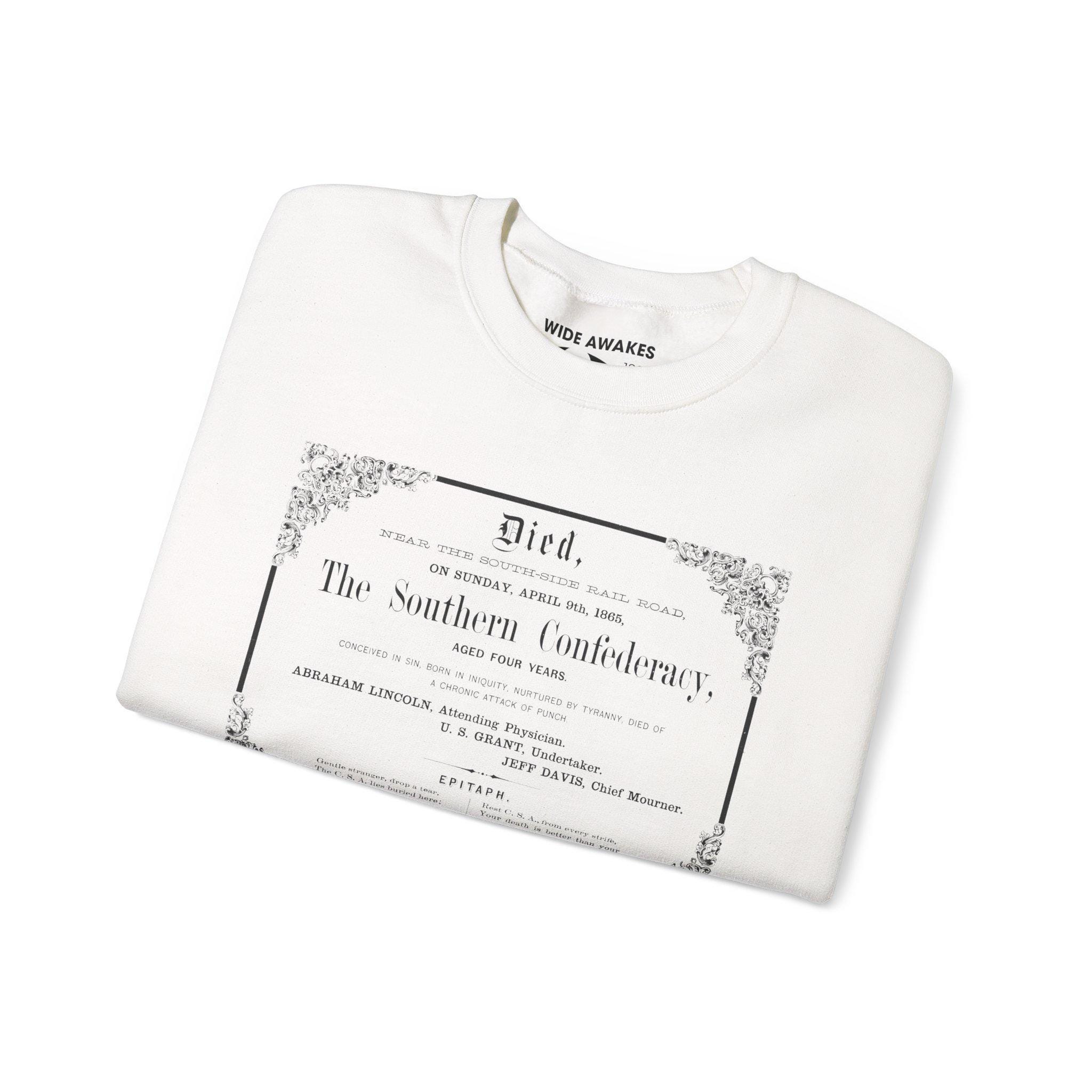 Stay cozy this fall with a crewneck sweatshirt that features one of the wittiest pieces of satire from the Civil War era. This design is a restored "Death Certificate" for the Confederacy, celebrating its demise in April 1865. The humor is sharp and layered: the cause of death is listed as a "chronic attack of punch," while Lincoln and Grant are named as the attending physician and undertaker, respectively. It's a complete, triumphant historical document, right down to the final epitaph. This comfortable sweatshirt is perfect for any history buff with a dark sense of humor.