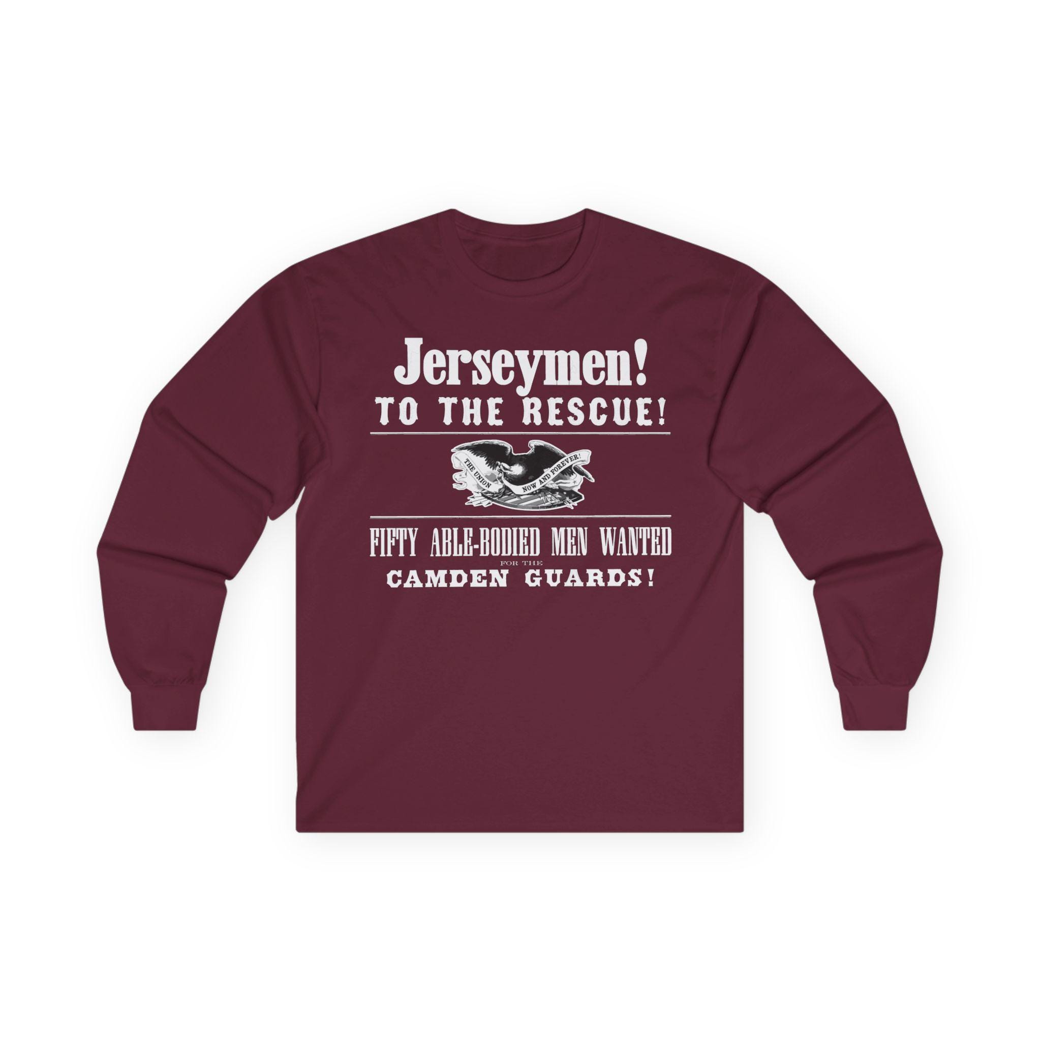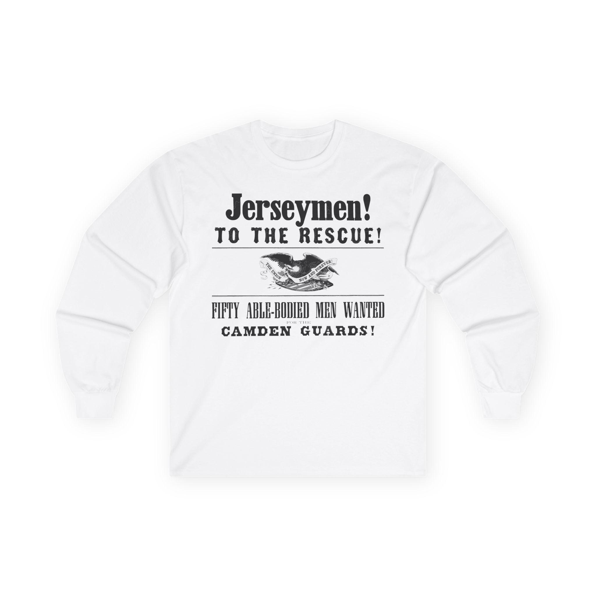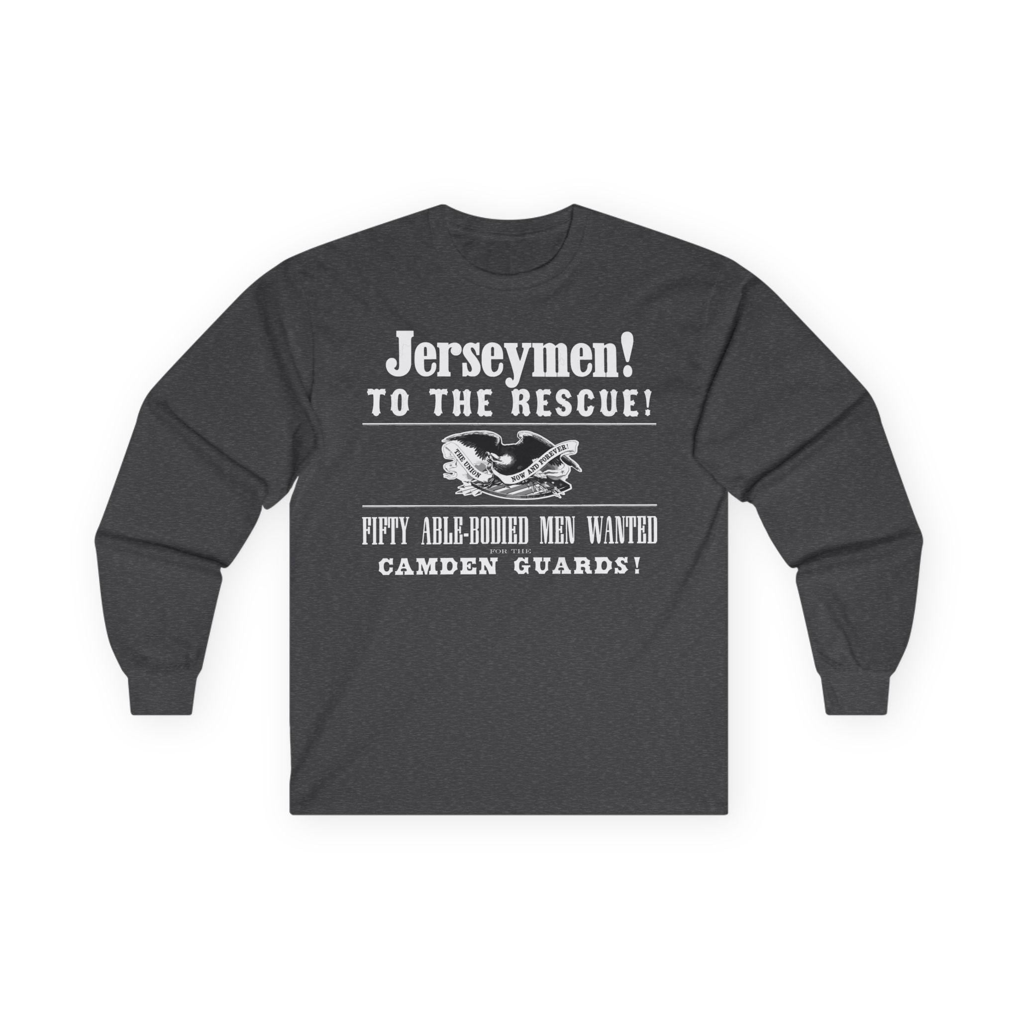 This comfortable longsleeve tee features the key graphical elements from a real Civil War poster calling the "Jerseymen! To the Rescue!" The design includes the title of the "Camden Guards" and the original illustration of a Union eagle with the motto "THE UNION NOW AND FOREVER!" It's the perfect shirt for layering in the cooler weather, a stylish and powerful piece of local New Jersey history for any Civil War enthusiast.