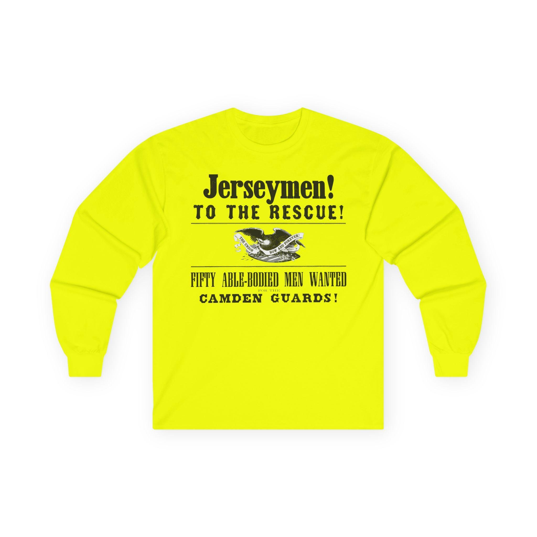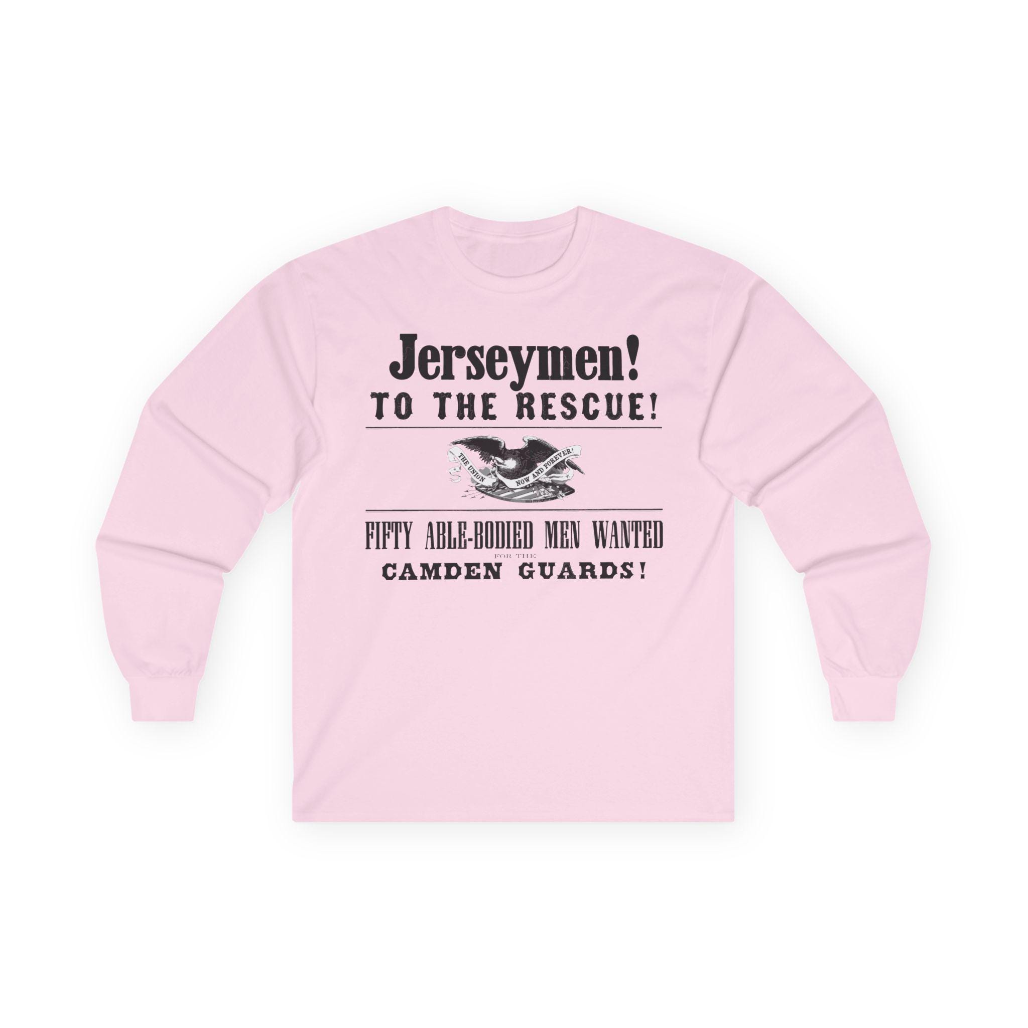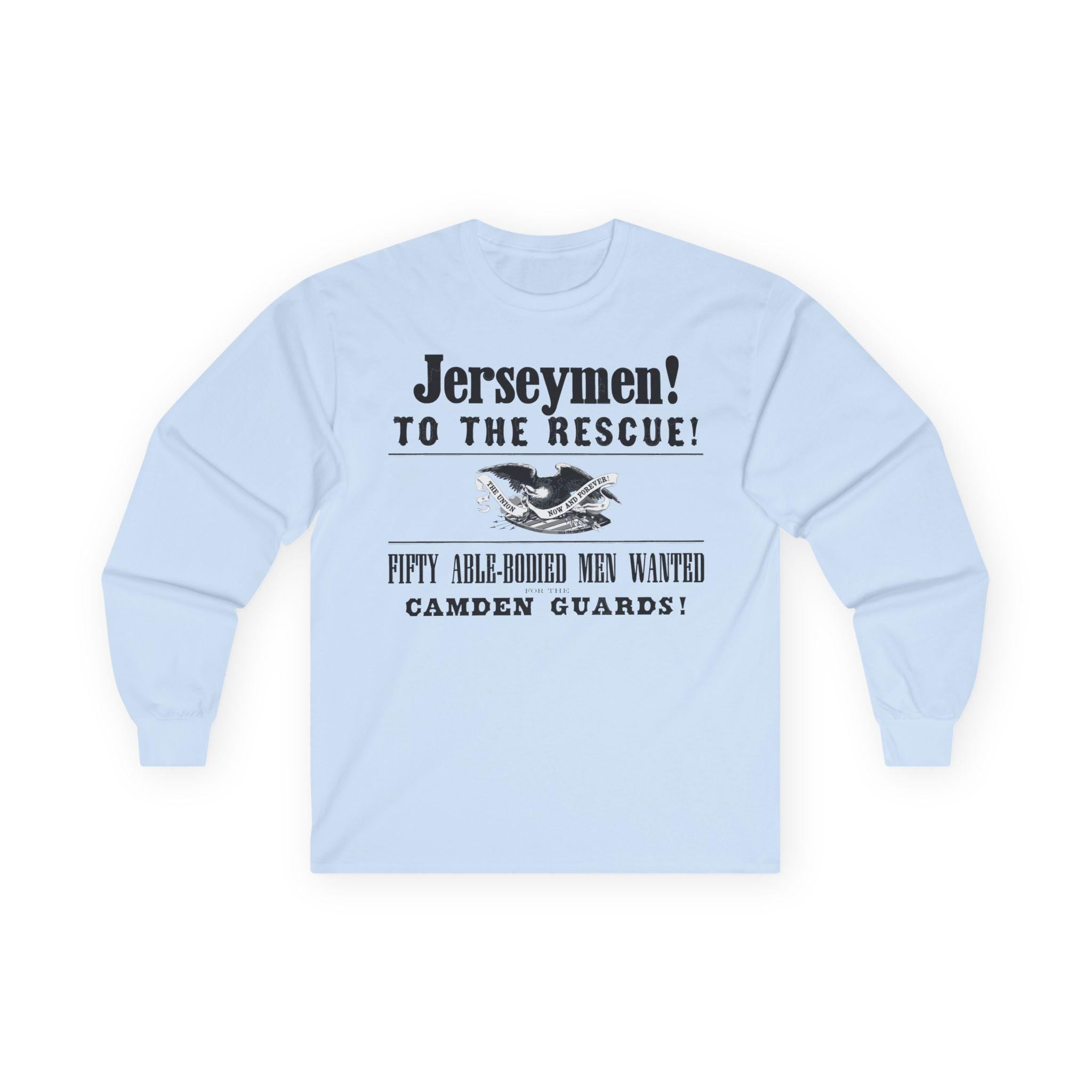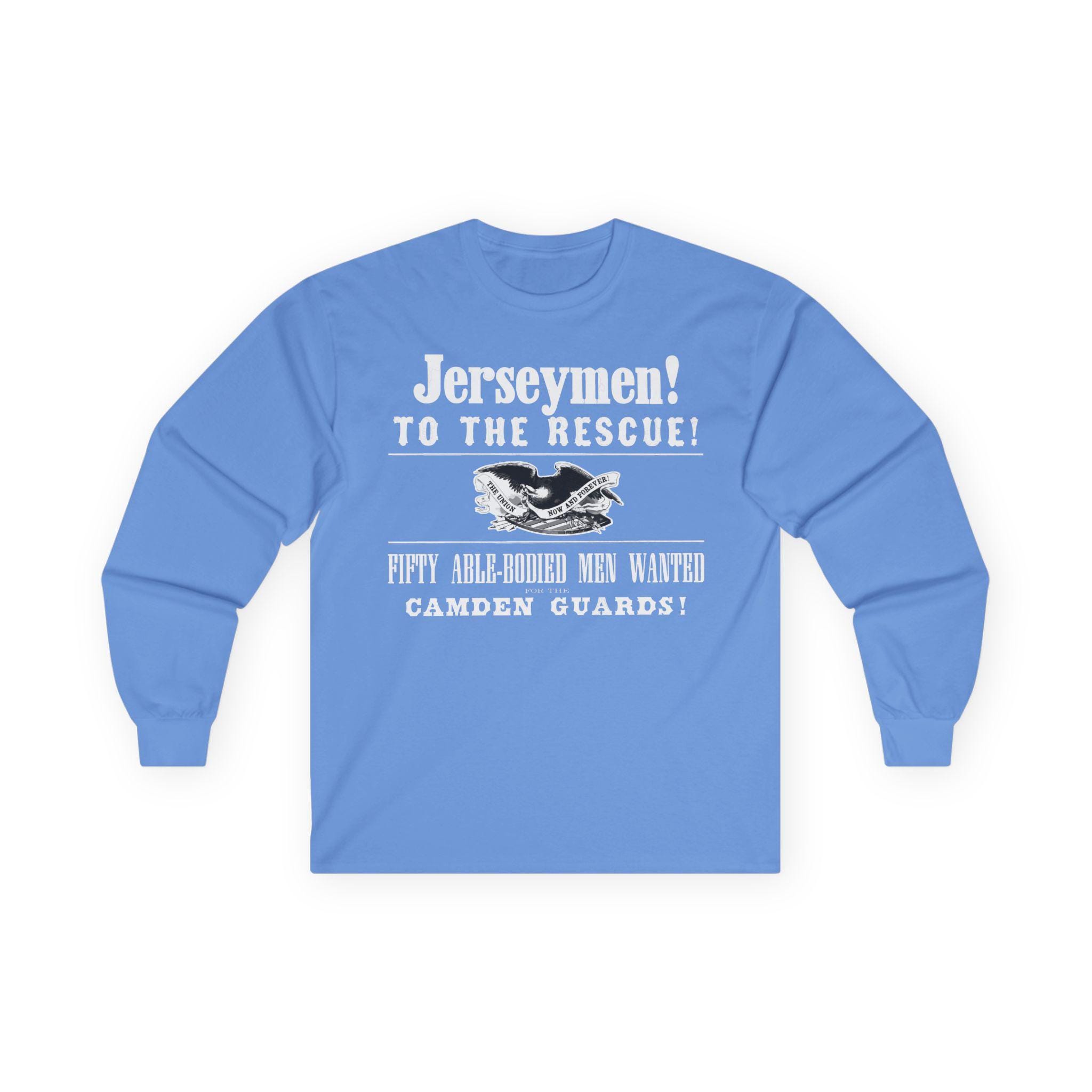 This comfortable longsleeve tee features the key graphical elements from a real Civil War poster calling the "Jerseymen! To the Rescue!" The design includes the title of the "Camden Guards" and the original illustration of a Union eagle with the motto "THE UNION NOW AND FOREVER!" It's the perfect shirt for layering in the cooler weather, a stylish and powerful piece of local New Jersey history for any Civil War enthusiast.