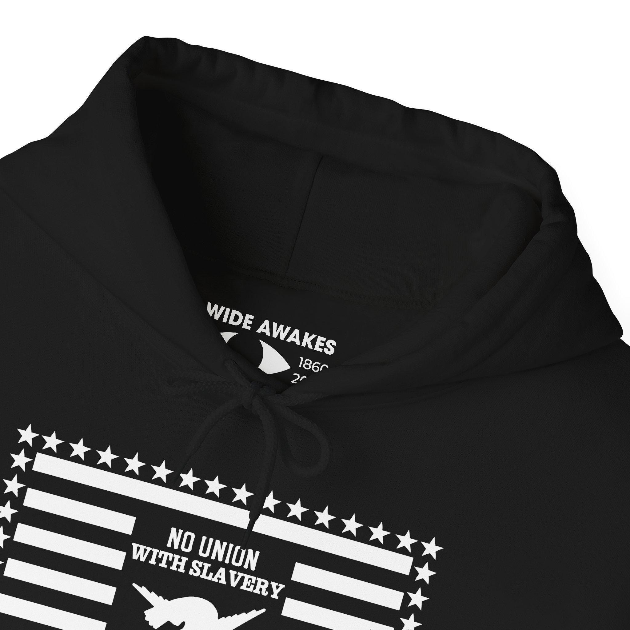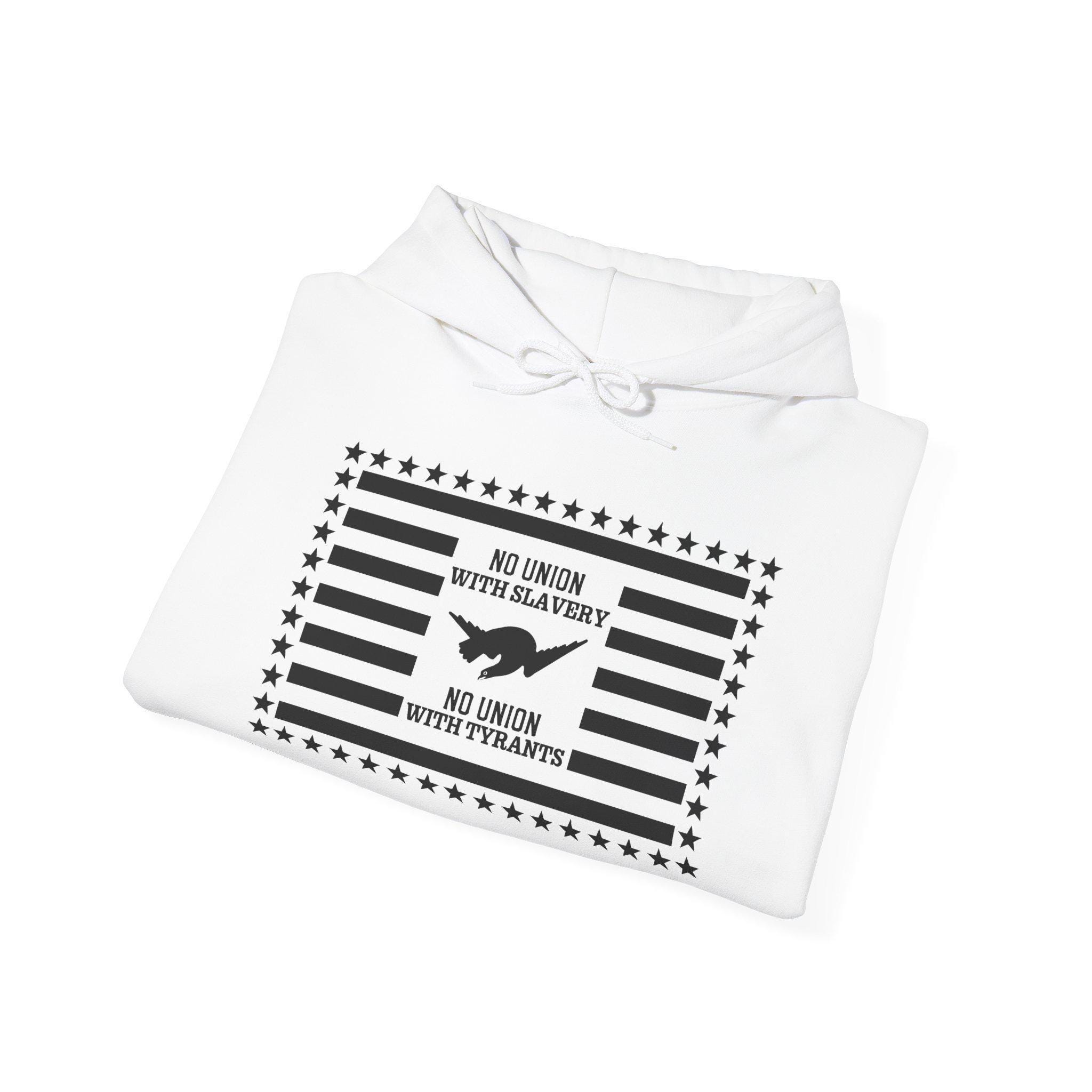 This comfortable and warm hoodie features a thoughtful redesign of a radical 19th-century protest symbol. Based on the "Abolitionist Flag," this version updates the original's exclusionary star field with an inclusive 50-star border. It also expands the message, pairing the historic declaration "No Union with Slavery" with a vital modern one: "No Union with Tyranny." With a soft fleece interior and a spacious front pocket, this hoodie is a piece of wearable art that argues the abolitionist spirit is still required in the ongoing fight against all forms of oppression. Product features - Spacious kangaroo pouch pocket for warmth and practicality - Adjustable drawstring hood with color-matched cord - Knitted without side seams for a smooth, attractive finish - Comfortable medium-heavy fabric blend: 50% cotton, 50% polyester - Ethically produced, with OEKO-TEX certified dyes for low environmental impact.