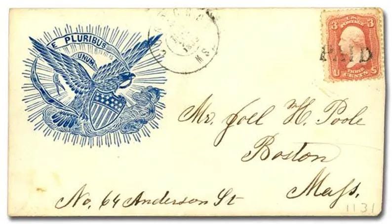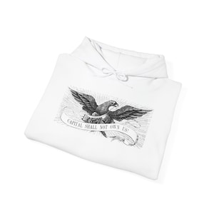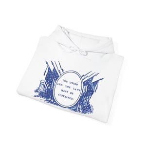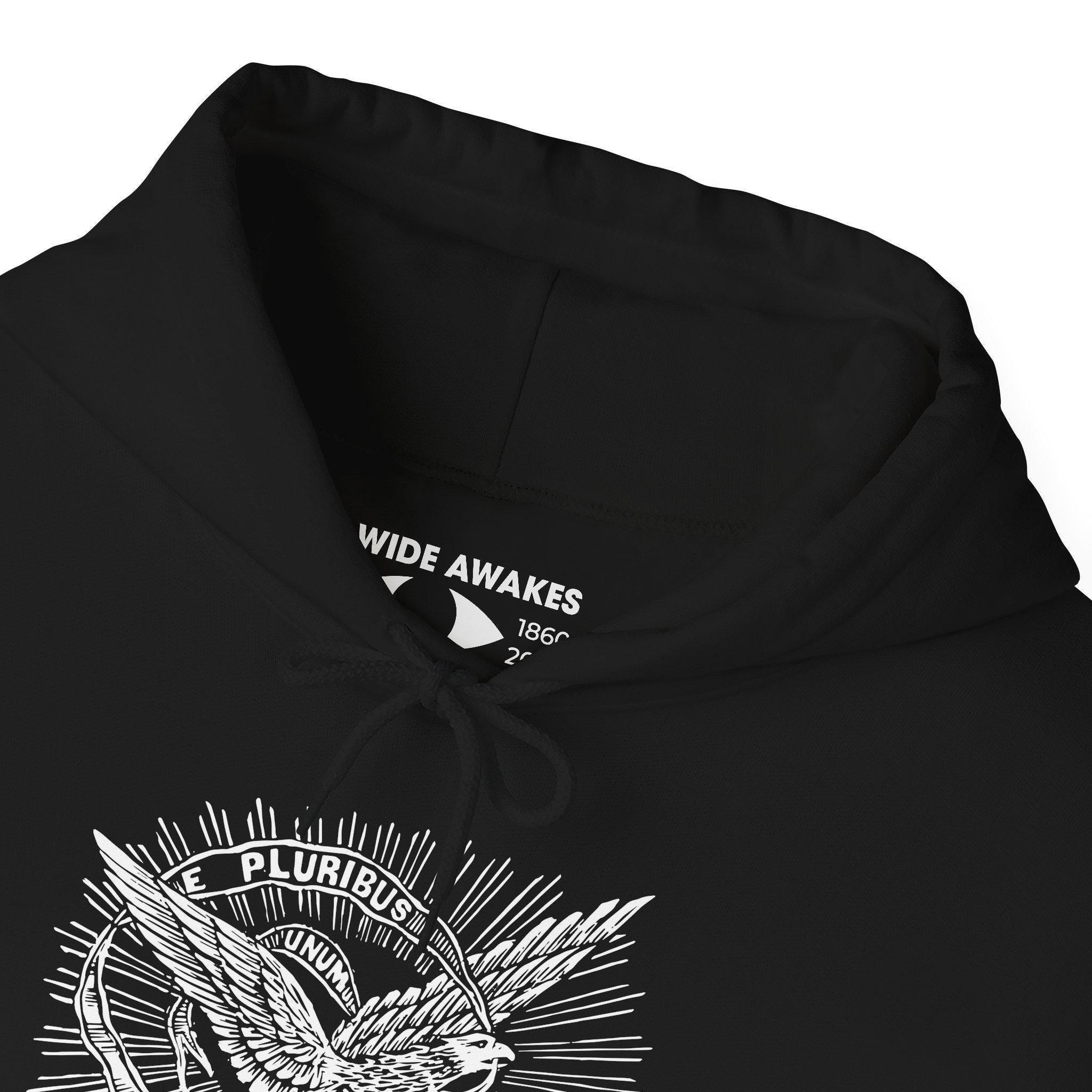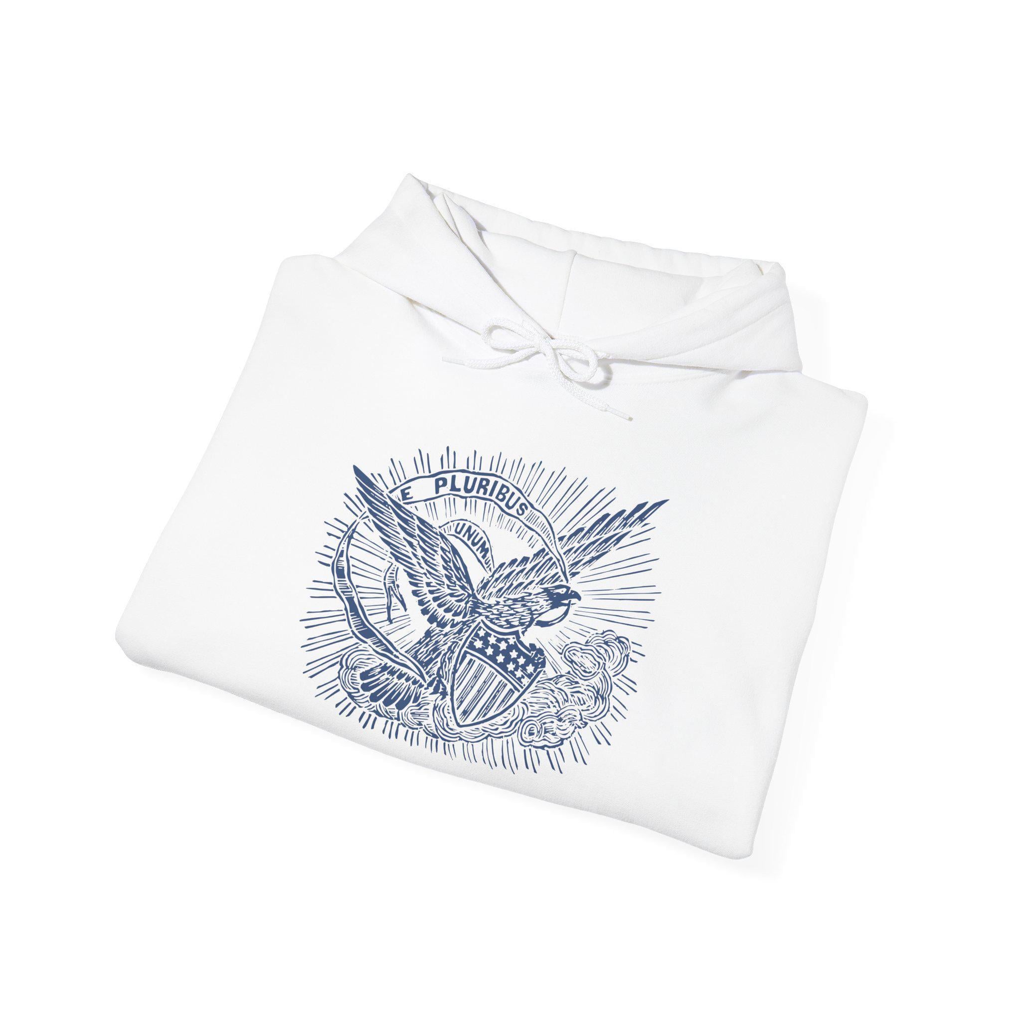 This comfortable and warm hoodie features a beautifully restored design from a pro-Union envelope stamp, a popular form of everyday patriotism during the Civil War. The artwork is a classic piece of 19th-century Americana, featuring a majestic American eagle flying above the clouds. Clutched in its beak is a banner with the United States' traditional motto: "E PLURIBUS UNUM"—a Latin phrase meaning "Out of many, one." With a soft fleece interior and a spacious front pocket, this hoodie is a practical and powerful tribute to the idea that our nation's strength comes from its people.