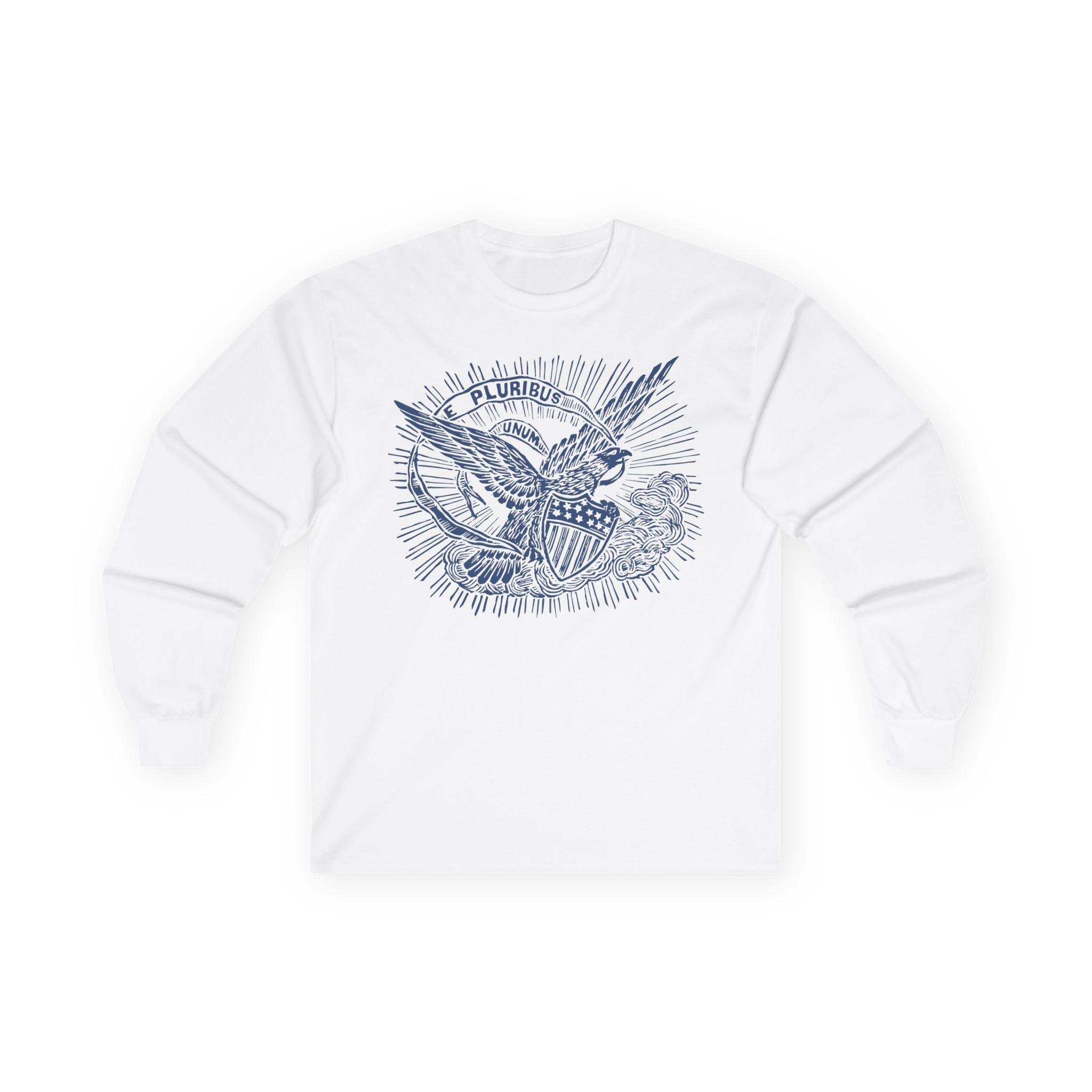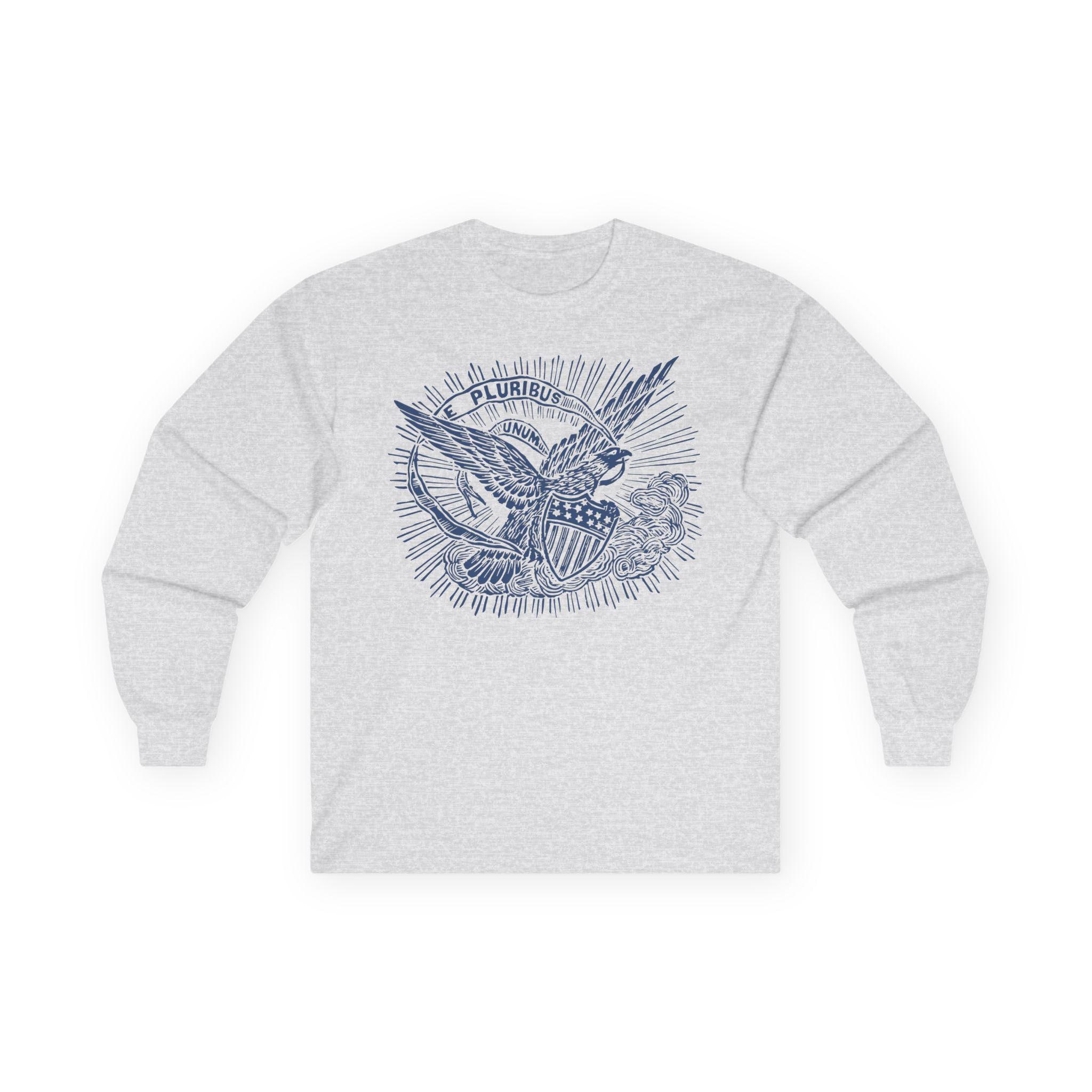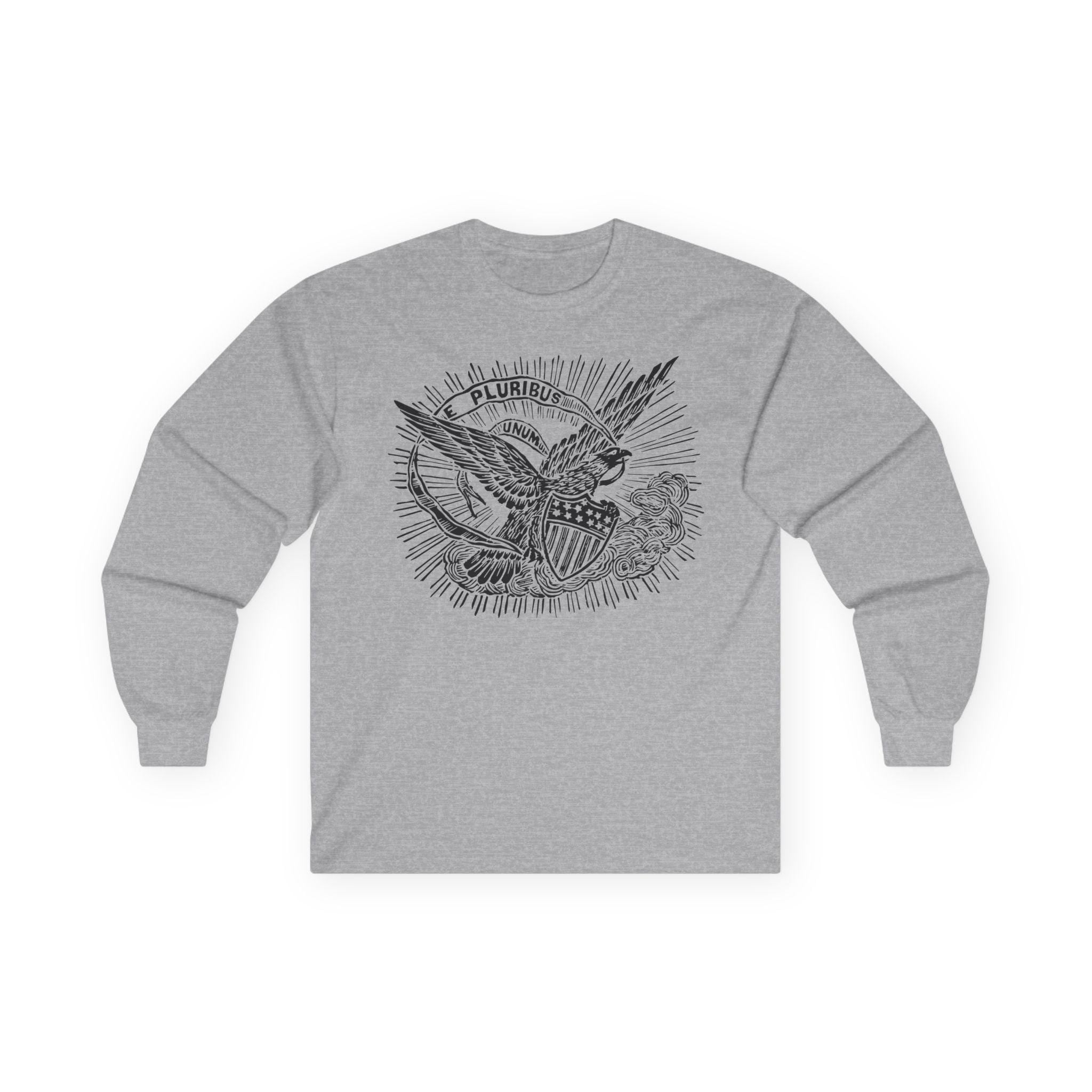 This comfortable longsleeve tee features a timeless statement of American unity, restored from an authentic 1860s pro-Union envelope stamp. The powerful imagery of the eagle, bathed in heavenly light, reinforces the nation's guiding principle. The banner's message, "E PLURIBUS UNUM" ("Out of many, one"), was a declaration against division and a promise of a unified future during the nation's most trying time. It's a perfect shirt for layering in the fall, offering a stylish and historically significant message that is always relevant.