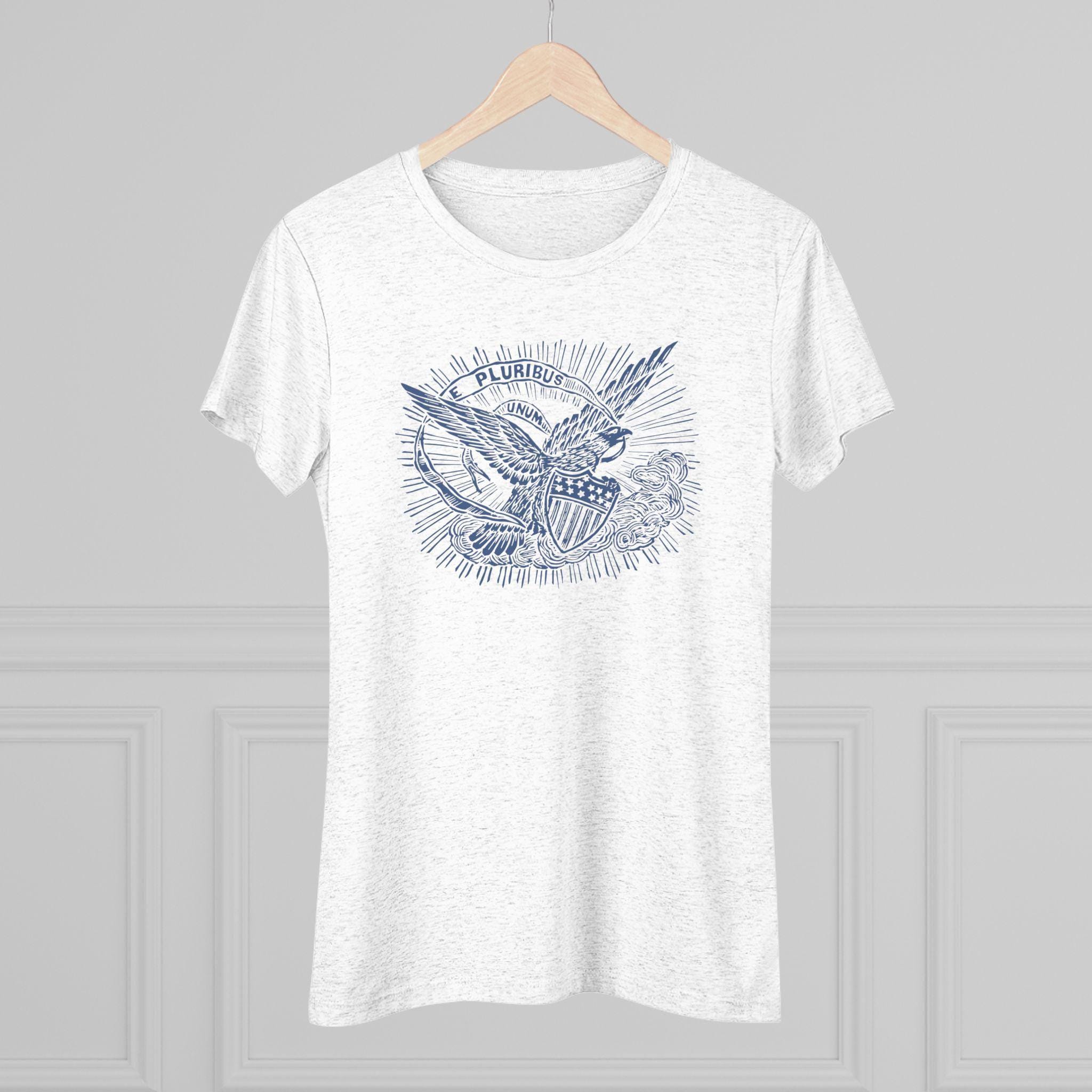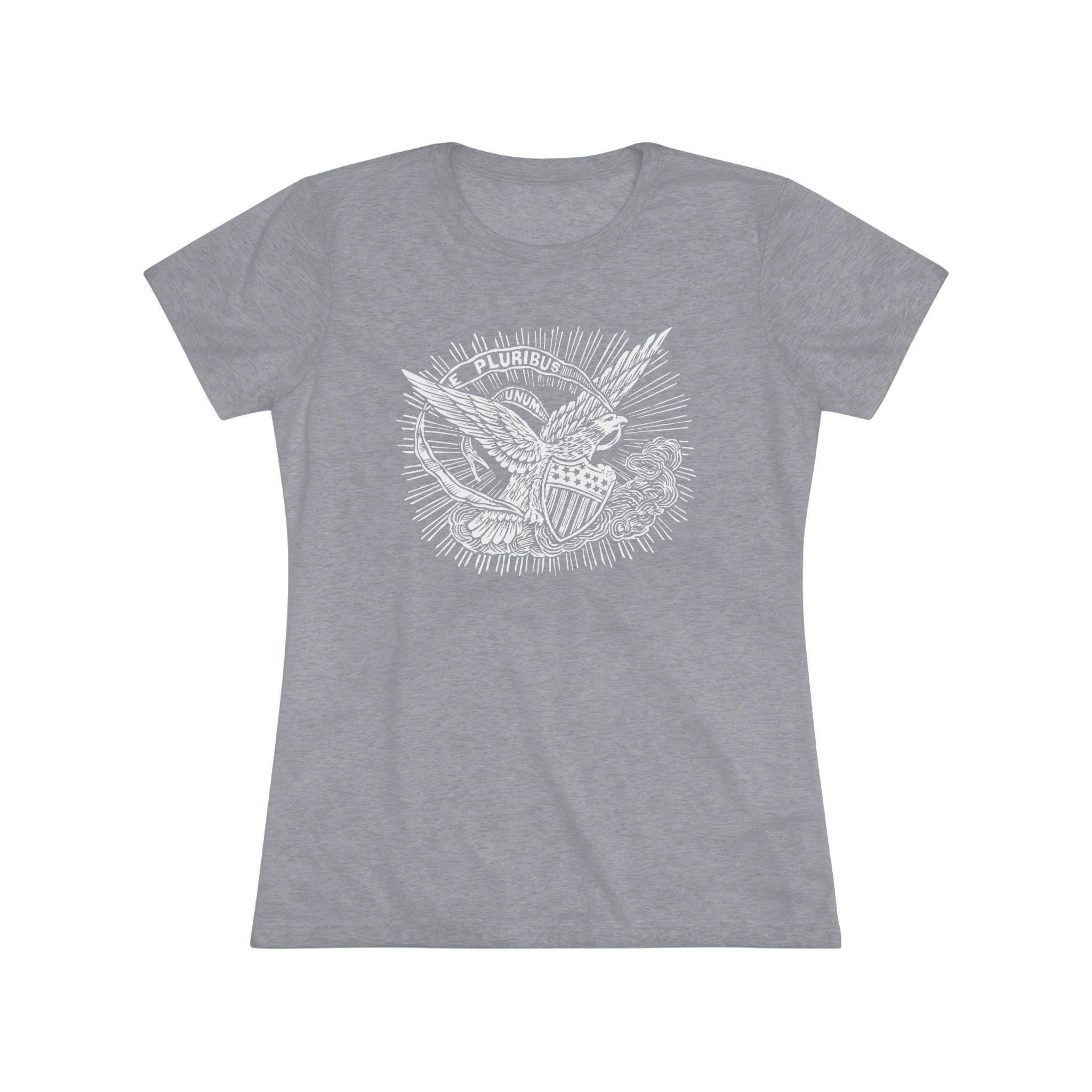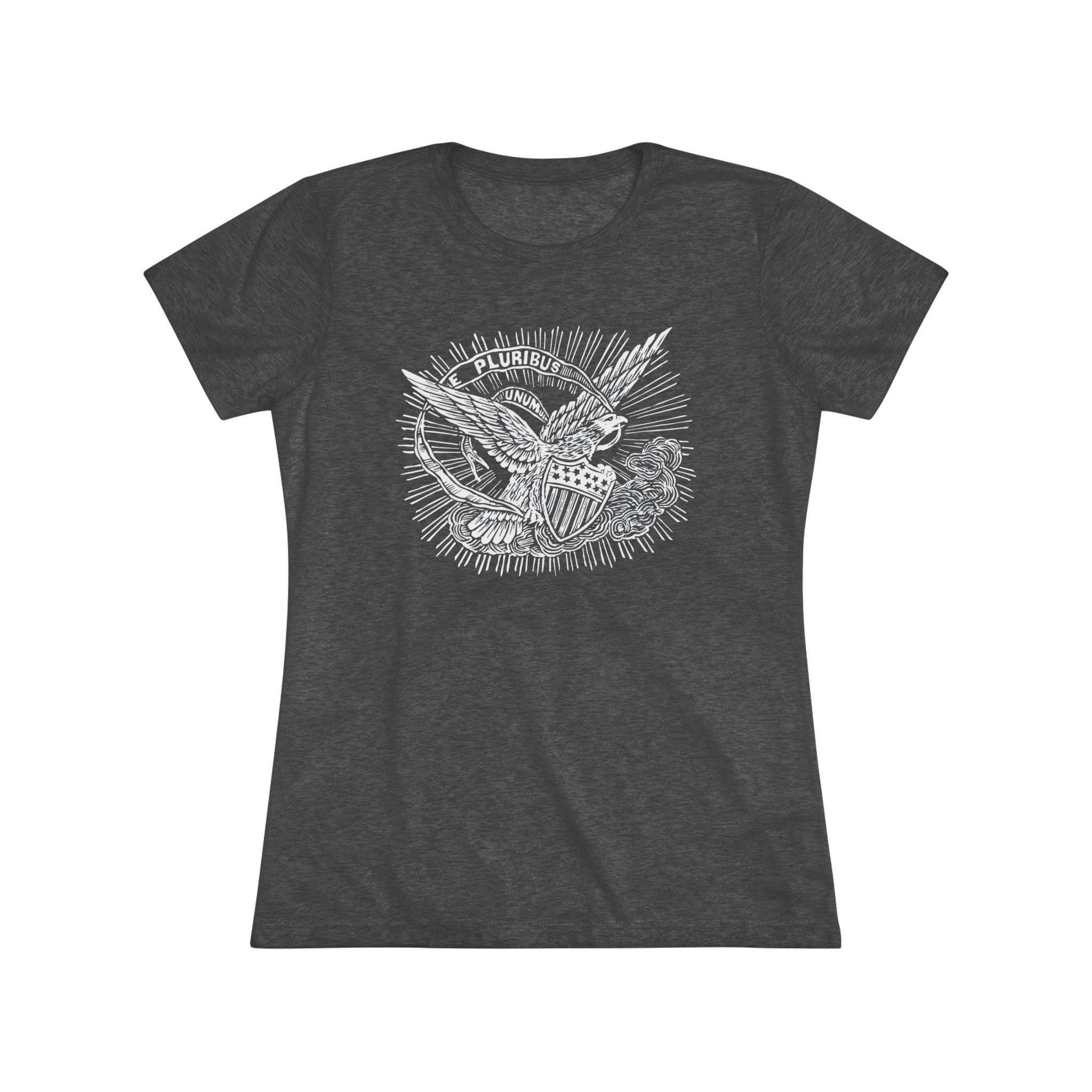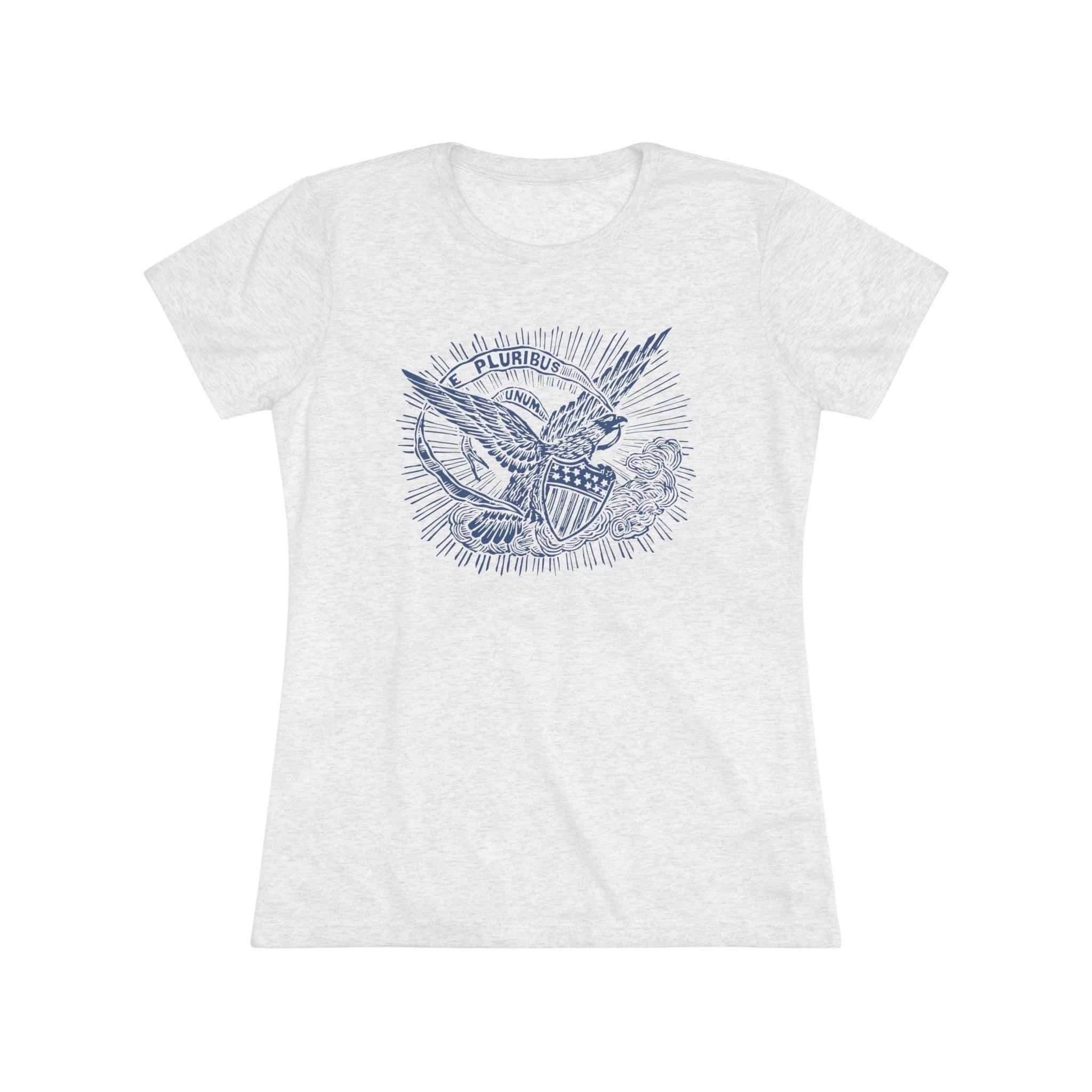 This women's t-shirt combines a powerful, positive message from American history with a comfortable and stylish fit. The design is restored from a pro-Union envelope stamp from the Civil War era, featuring a majestic eagle carrying a banner with the motto "E PLURIBUS UNUM" ("Out of many, one"). It's a beautiful and profound statement about the strength that comes from unity. This soft, contoured tee is a perfect way to wear a piece of classic Americana that celebrates one of the nation's most important ideals.