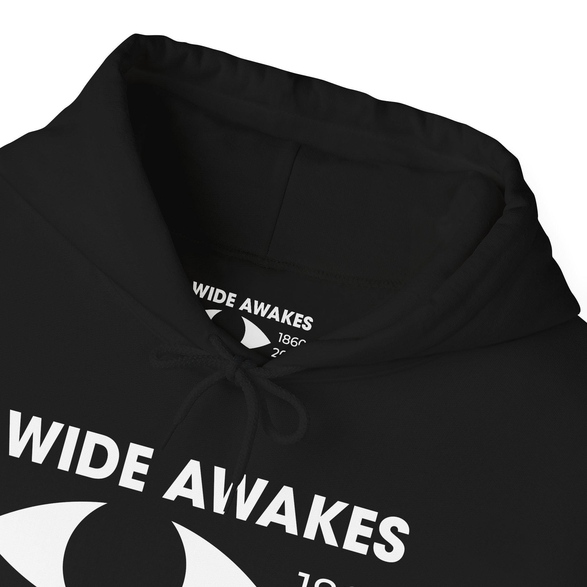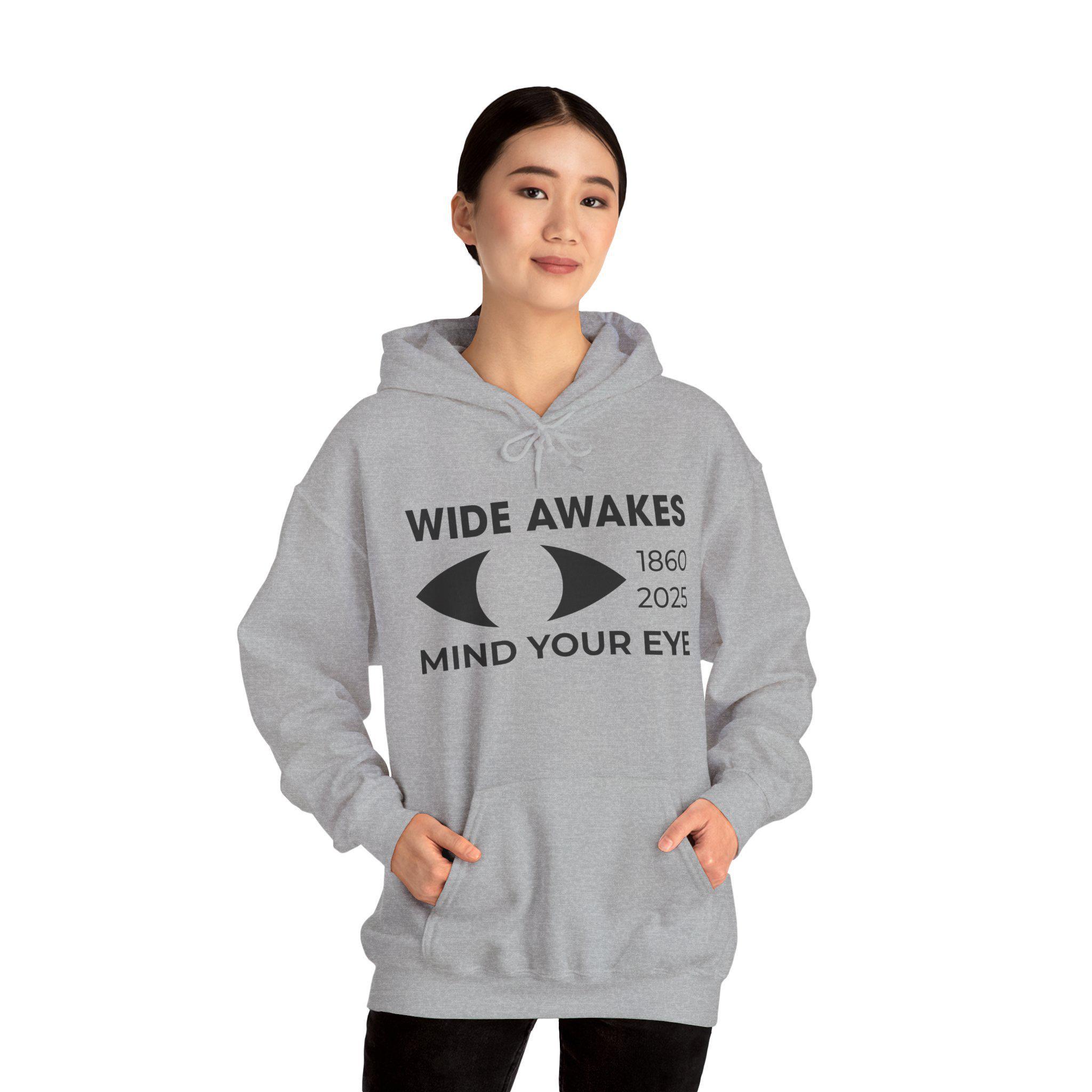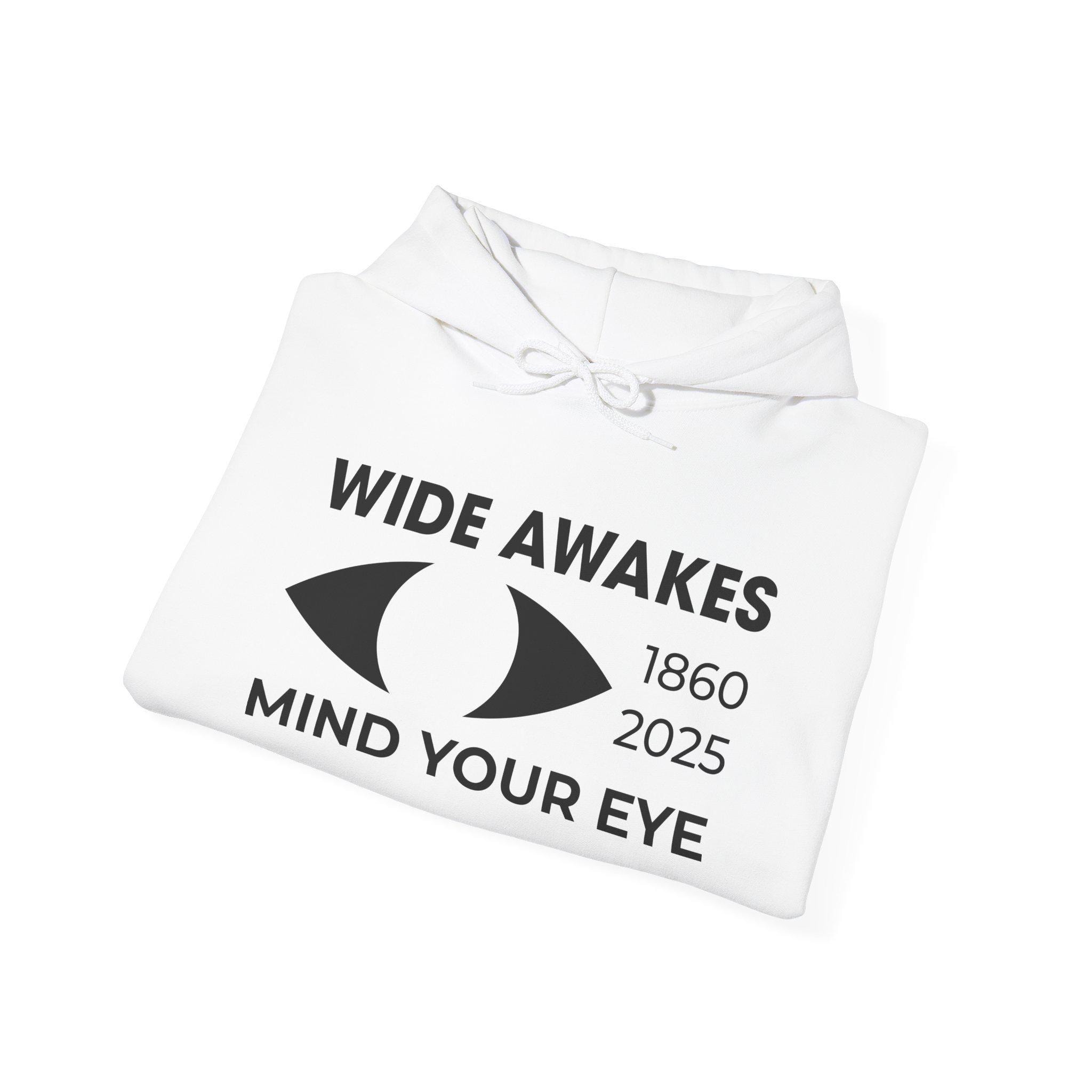 This comfortable and warm hoodie features a powerful, minimalist logo that reimagines the 19th-century Wide Awakes for today's political battles. The design is a clean, modern lockup featuring the WIDE AWAKES title, the "awake" eye symbol, the dates 1860 / 2025, and the essential warning: MIND YOUR EYE. With a soft fleece interior and a spacious front pocket, this hoodie is the perfect gear for anyone who identifies with the historic, vigilant spirit of this legendary American movement.