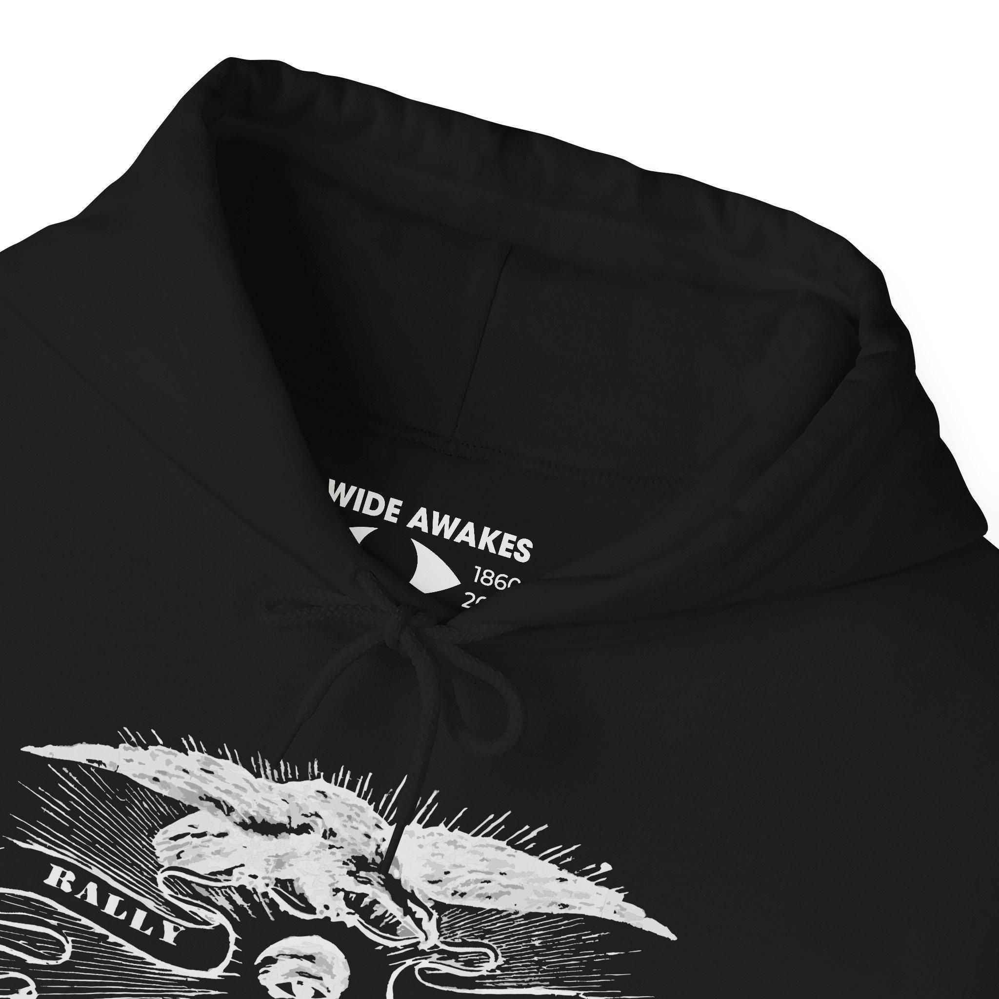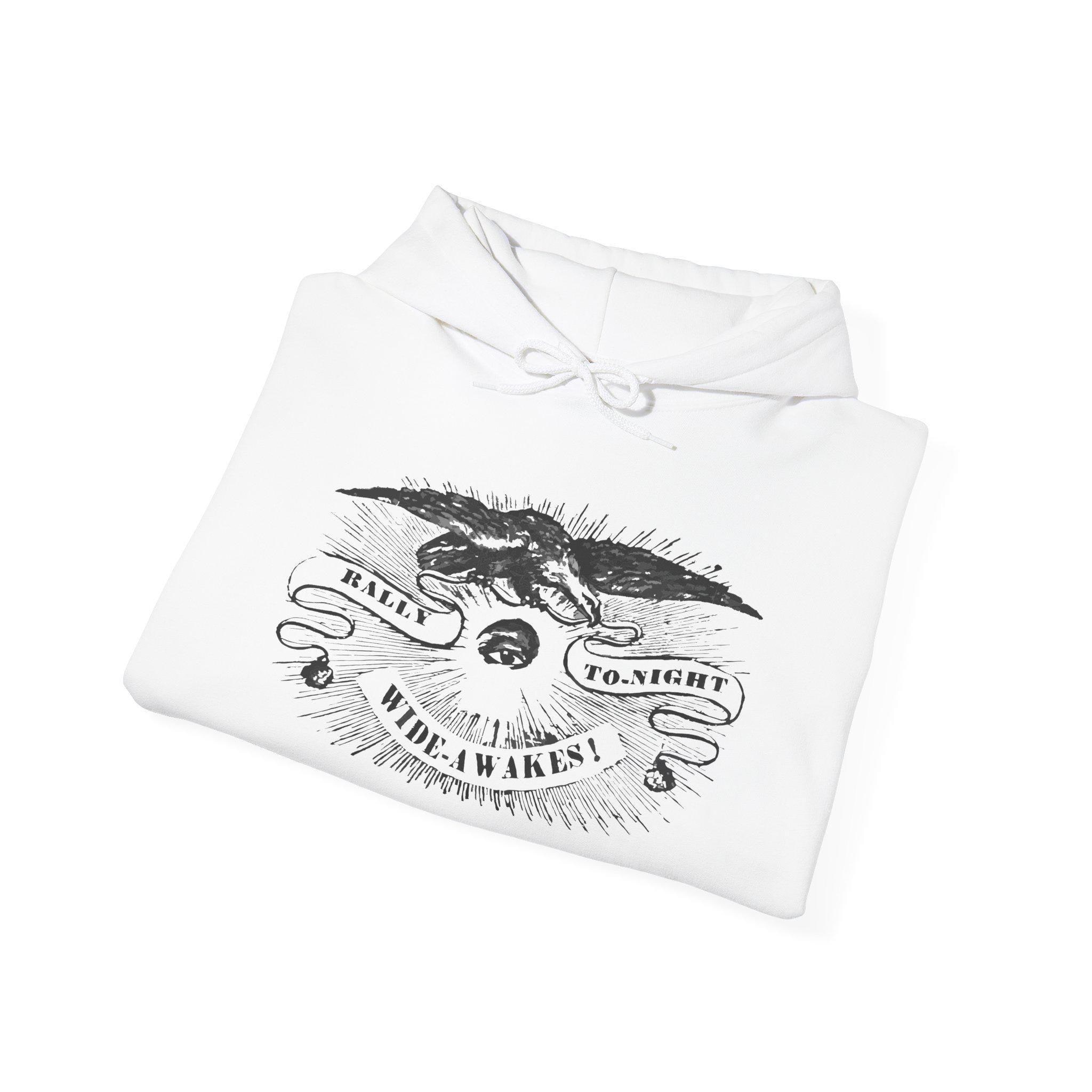 Answer the call with this powerful and warm hoodie, featuring an authentic political announcement from over 160 years ago. The all-seeing eye of vigilance. The eagle of the Republic. This striking etched illustration captures the passion and urgency of the Wide Awakes, the anti-slavery youth movement that helped elect Abraham Lincoln. We've restored this graphic from a real October 5, 1860 edition of the Hartford Courant, preserving the historic detail and the immediacy of its message: "RALLY TO-NIGHT, WIDE AWAKES!" With a soft fleece interior and spacious front pocket, it’s a timeless call for civic action and a unique piece of wearable history.