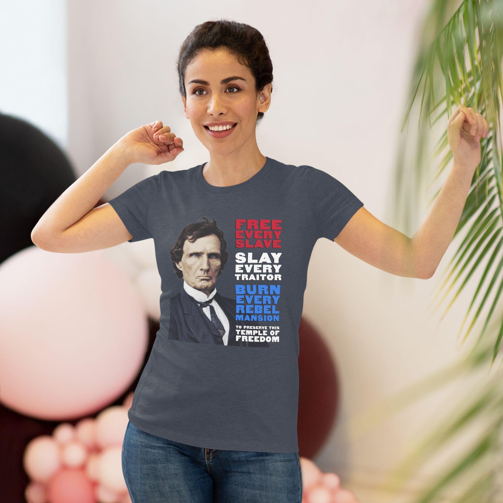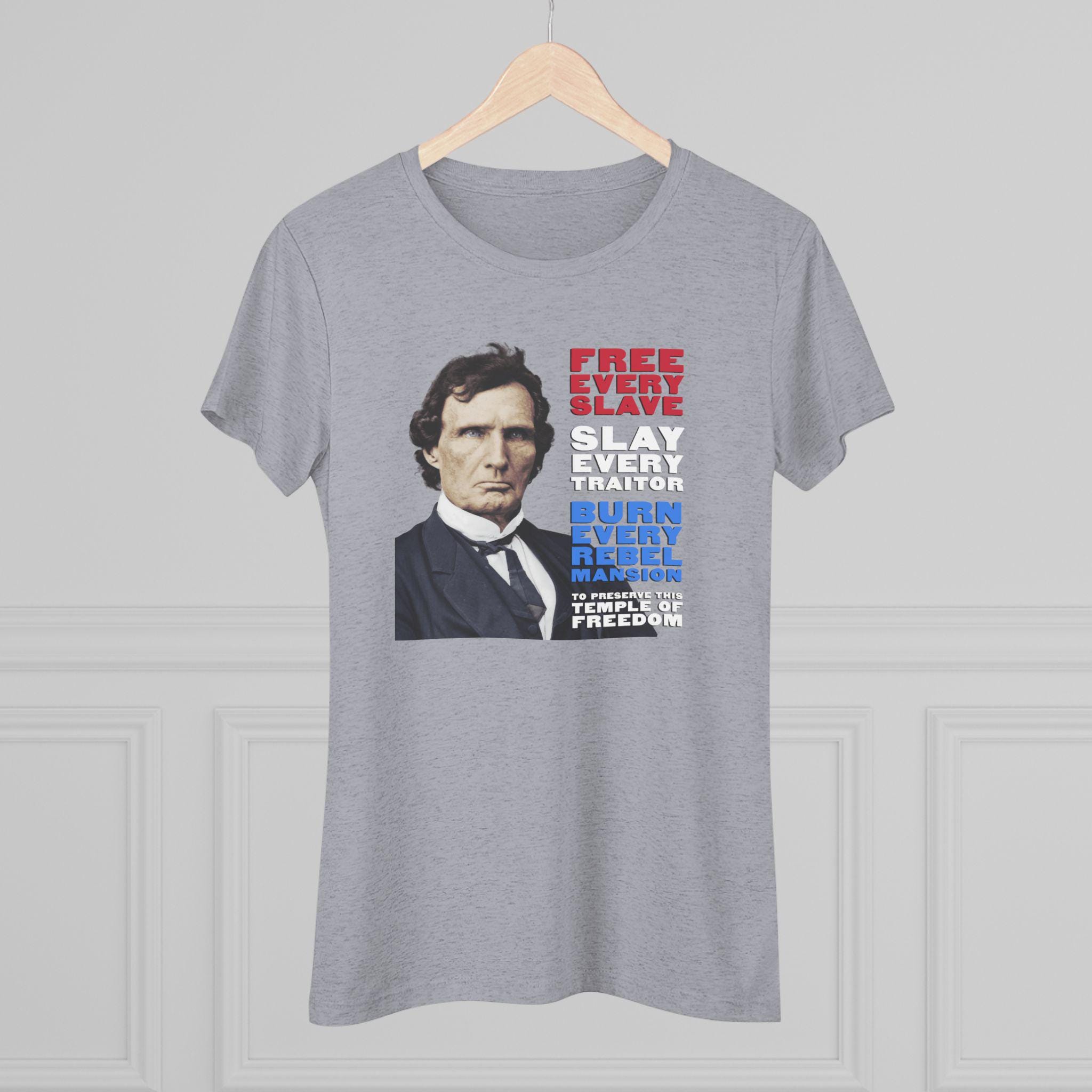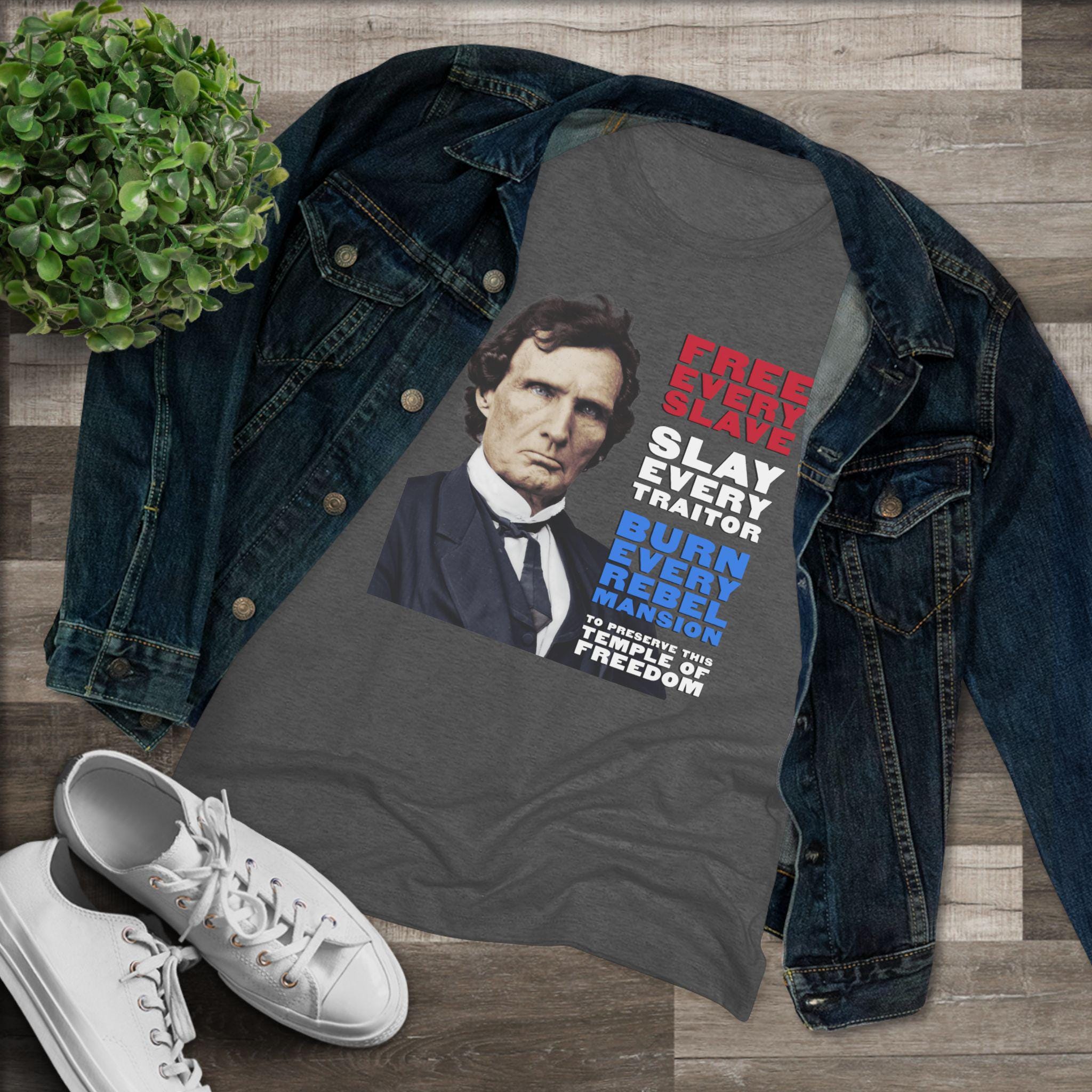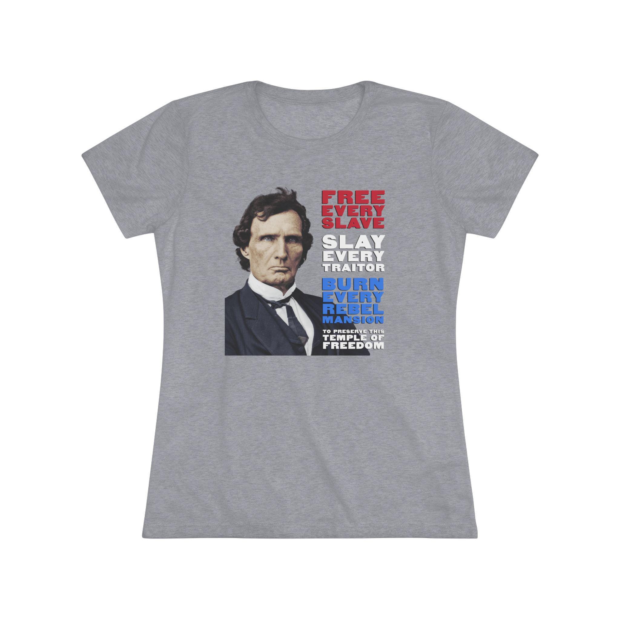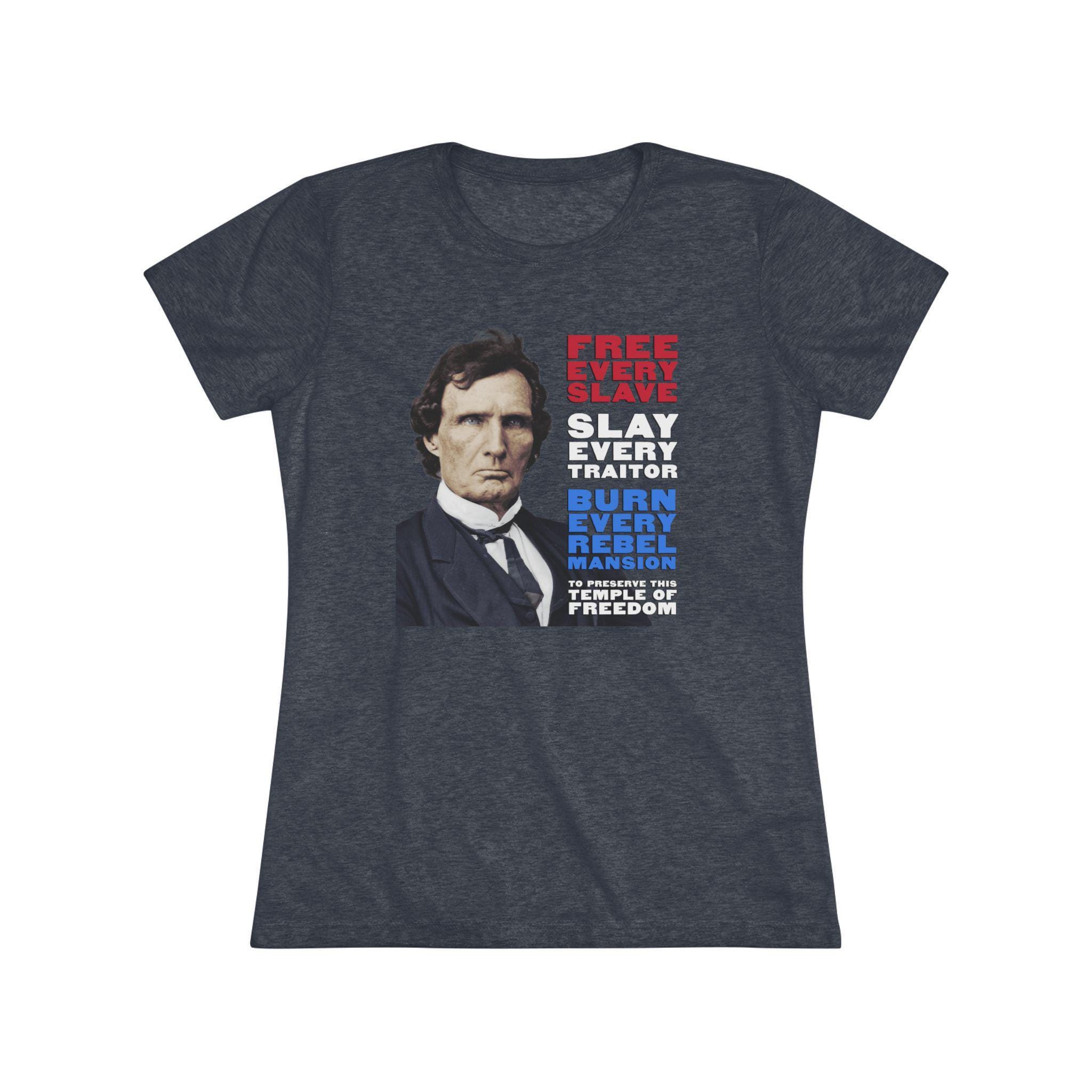 This women's t-shirt combines a powerful historical statement with a comfortable and stylish fit. It features a striking, colorized portrait of Thaddeus Stevens, the formidable Radical Republican, whose fierce expression complements his equally fierce paraphrased quote. Rendered in patriotic red, white, and blue, the message is clear: "FREE EVERY SLAVE, SLAY EVERY TRAITOR, BURN EVERY REBEL MANSION, TO PRESERVE THIS TEMPLE OF FREEDOM." This soft, contoured tee is a perfect way to wear a piece of profound American history that speaks to the necessity of unwavering commitment in the fight for justice and freedom.