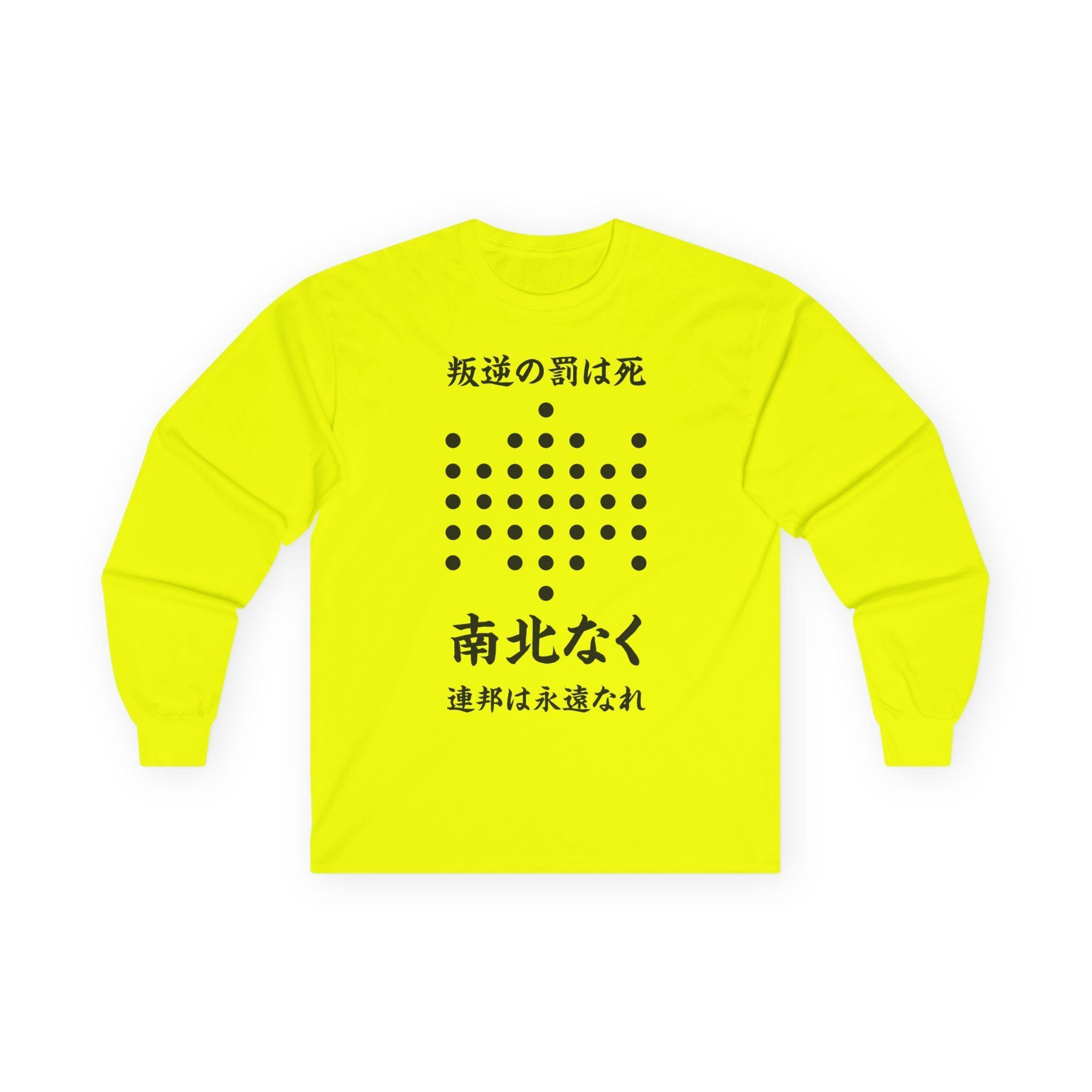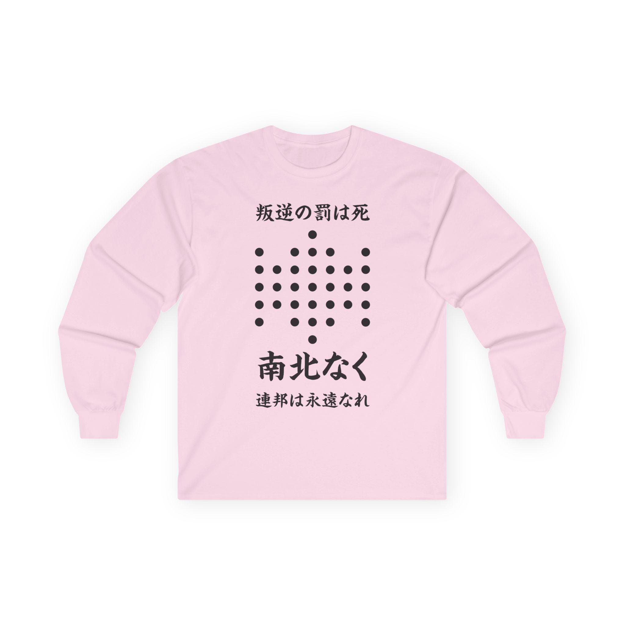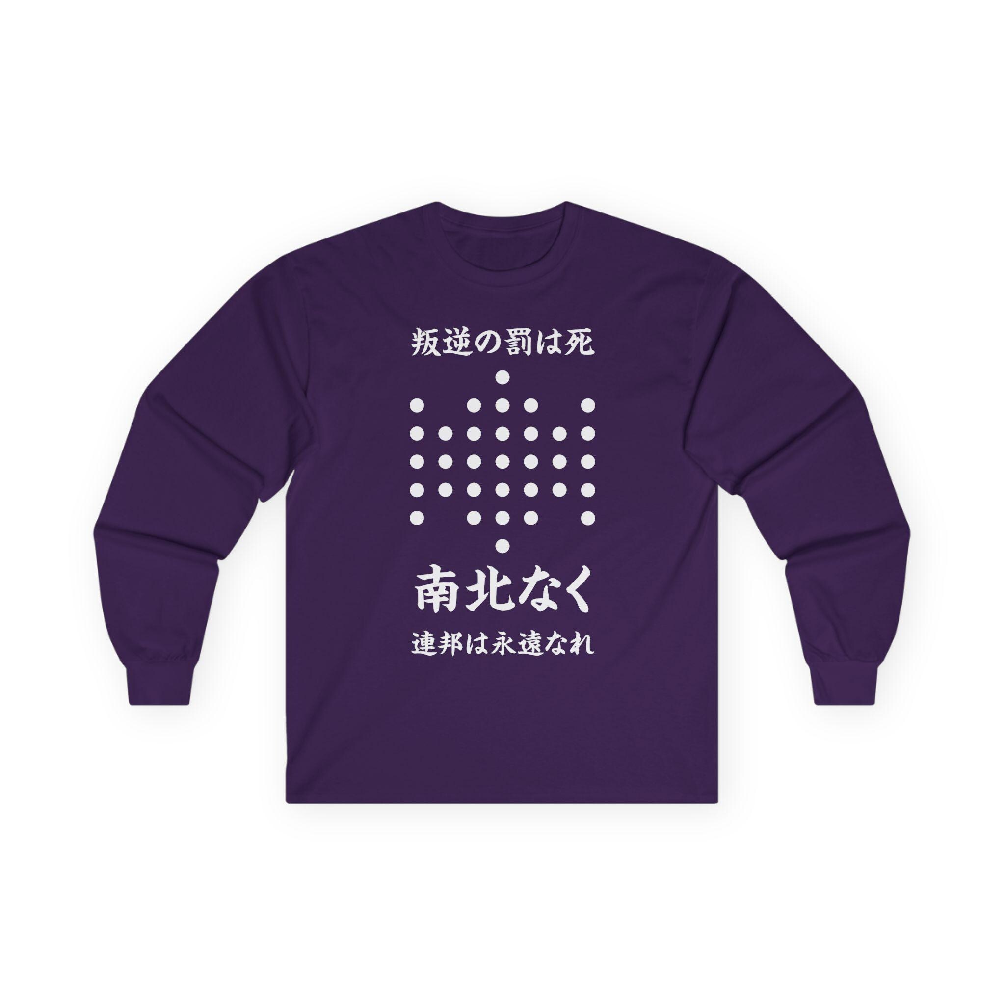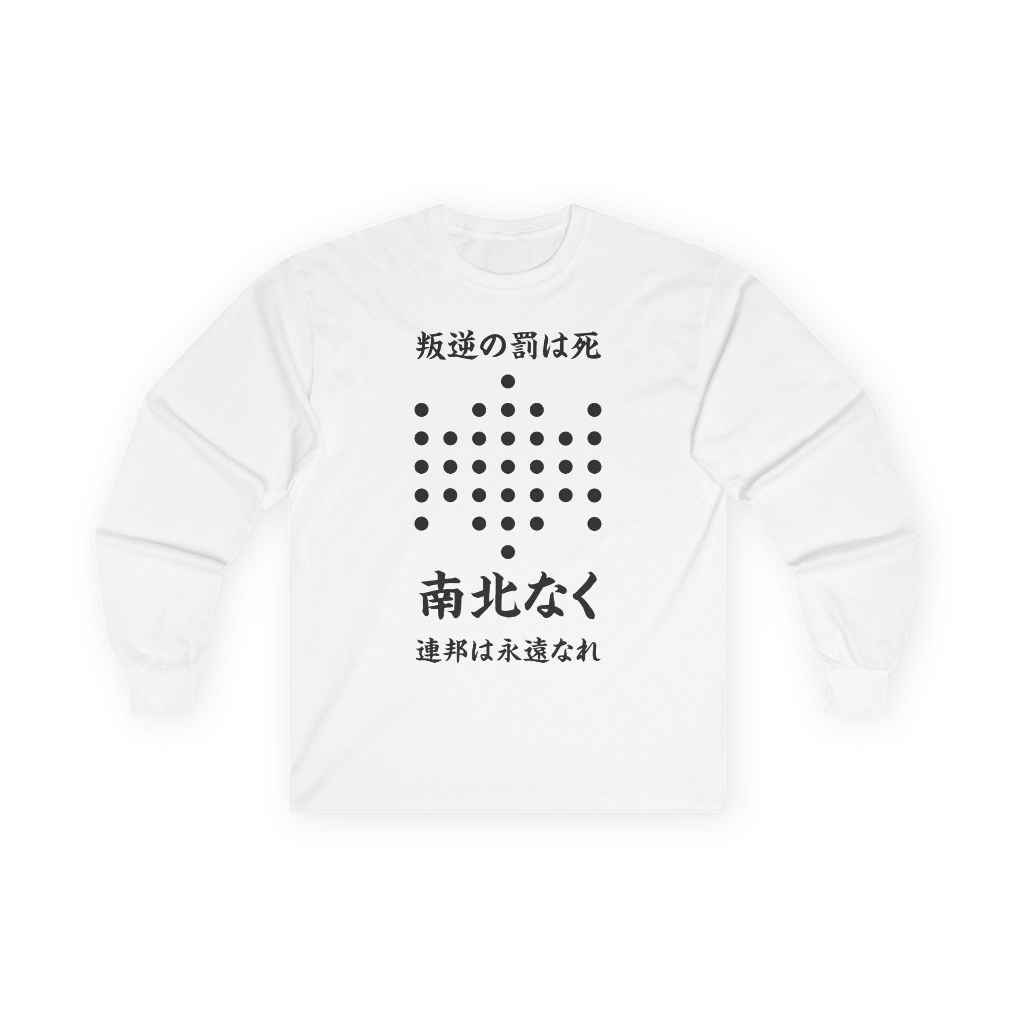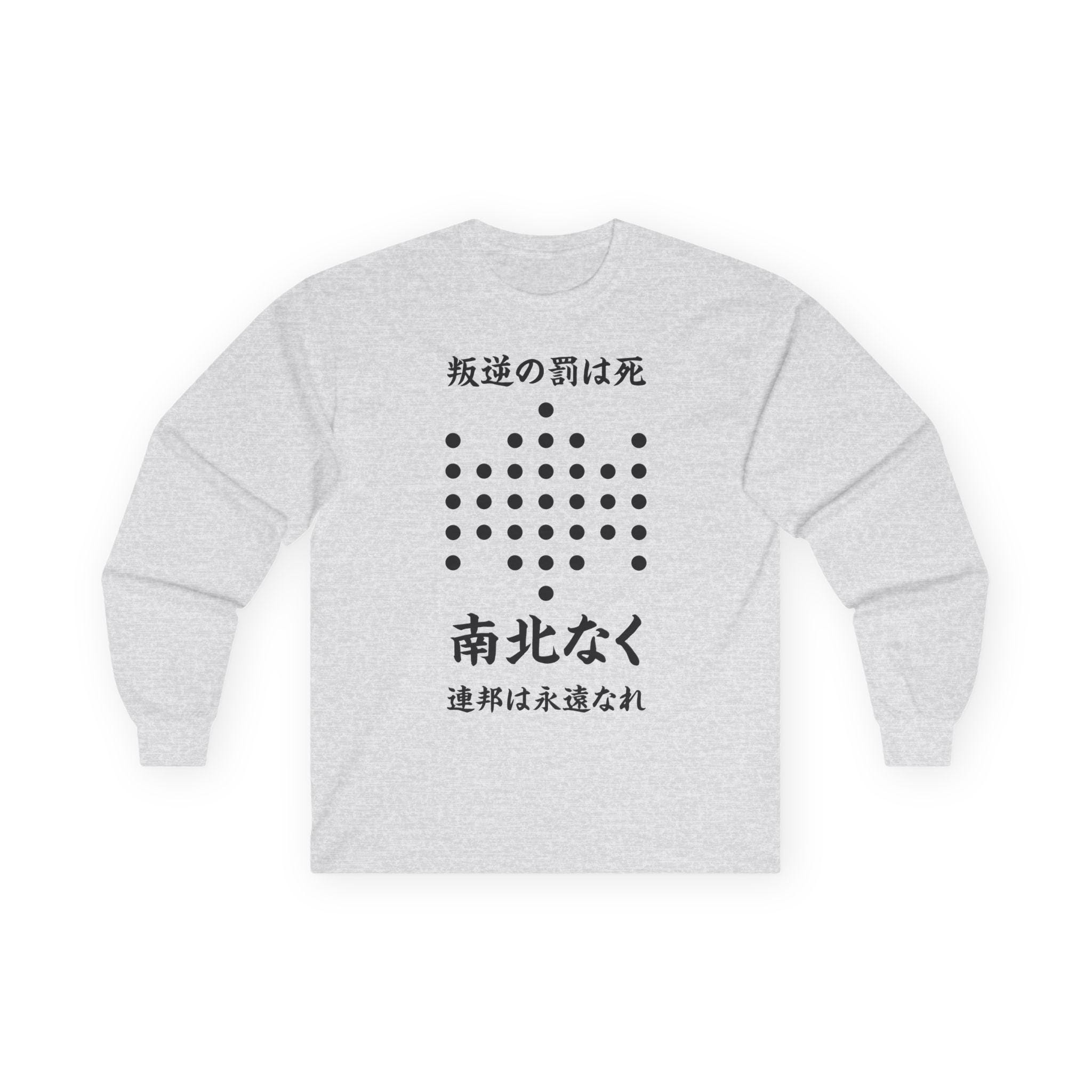 This comfortable longsleeve tee is a profound work of anachronism, asking: How would the core ideals of the Union cause be expressed through the design language of Meiji-era Japan? The result is this stunning design, which reimagines the Fort Sumter 33-star canton with the simple, elegant circular stars of Japanese art. The piece is completed with a Japanese translation of a fierce pro-Union motto. Perfect for layering in the fall, this shirt is a unique tribute to the power of ideas to transcend time and place.
