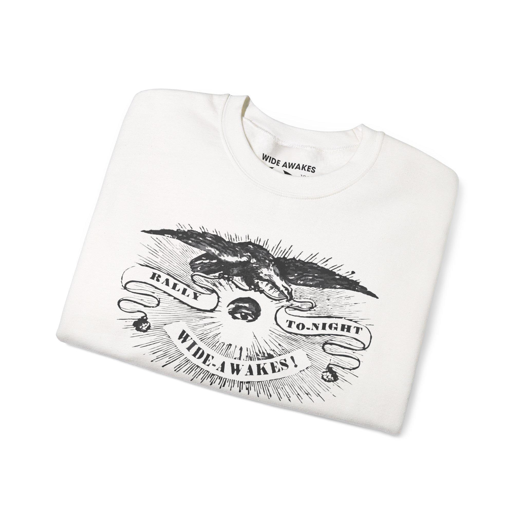 Stay warm this fall with a cozy crewneck sweatshirt that features a genuine piece of American political history. The design is a carefully restored illustration pulled directly from the pages of the Hartford Courant newspaper, dated October 5, 1860. The artwork is a classic piece of 19th-century political art: a vigilant, all-seeing eye radiates light, watched over by a determined American eagle. The banner's urgent message, "RALLY TO-NIGHT, WIDE AWAKES!," was a real call to action for the pro-Lincoln youth movement just weeks before the pivotal election.