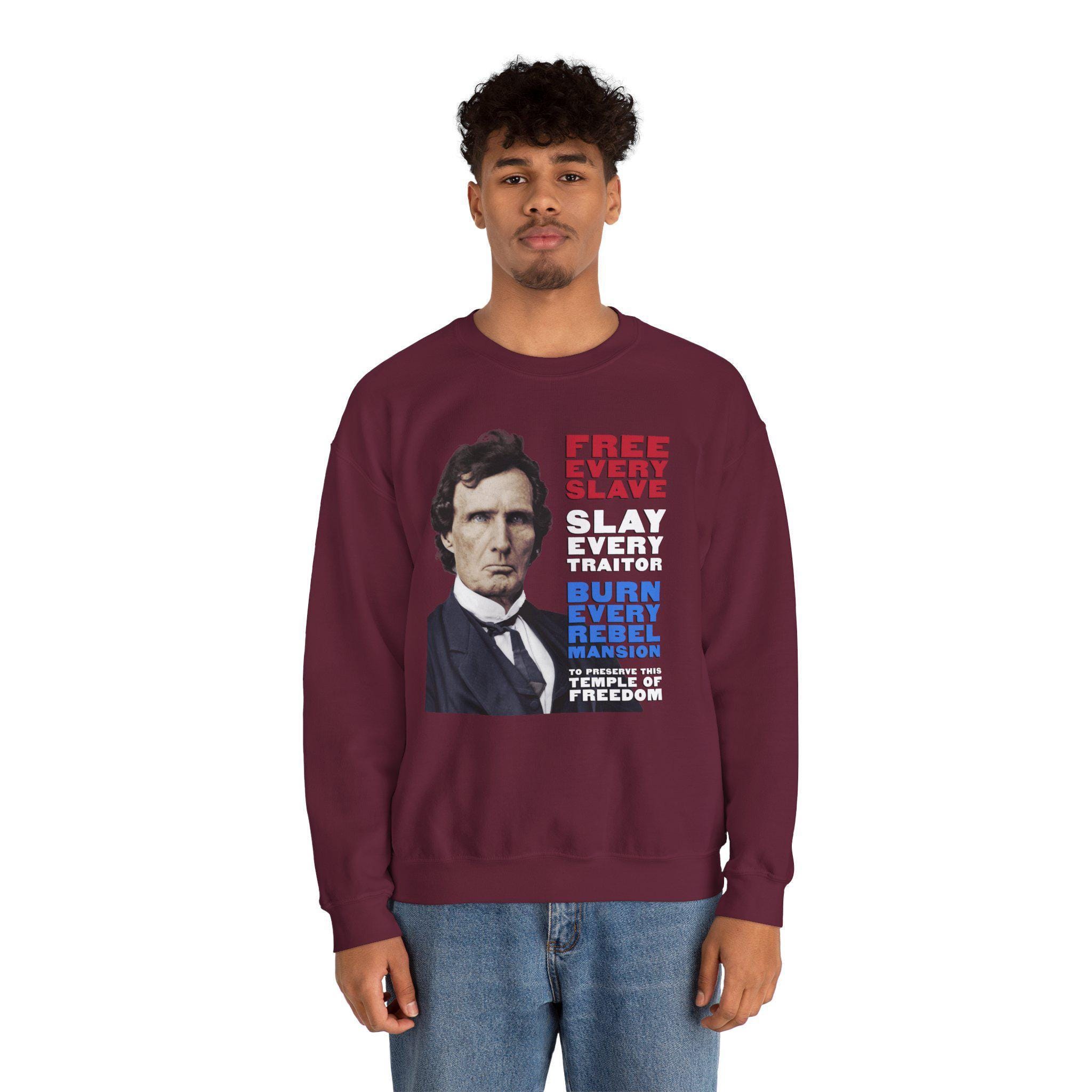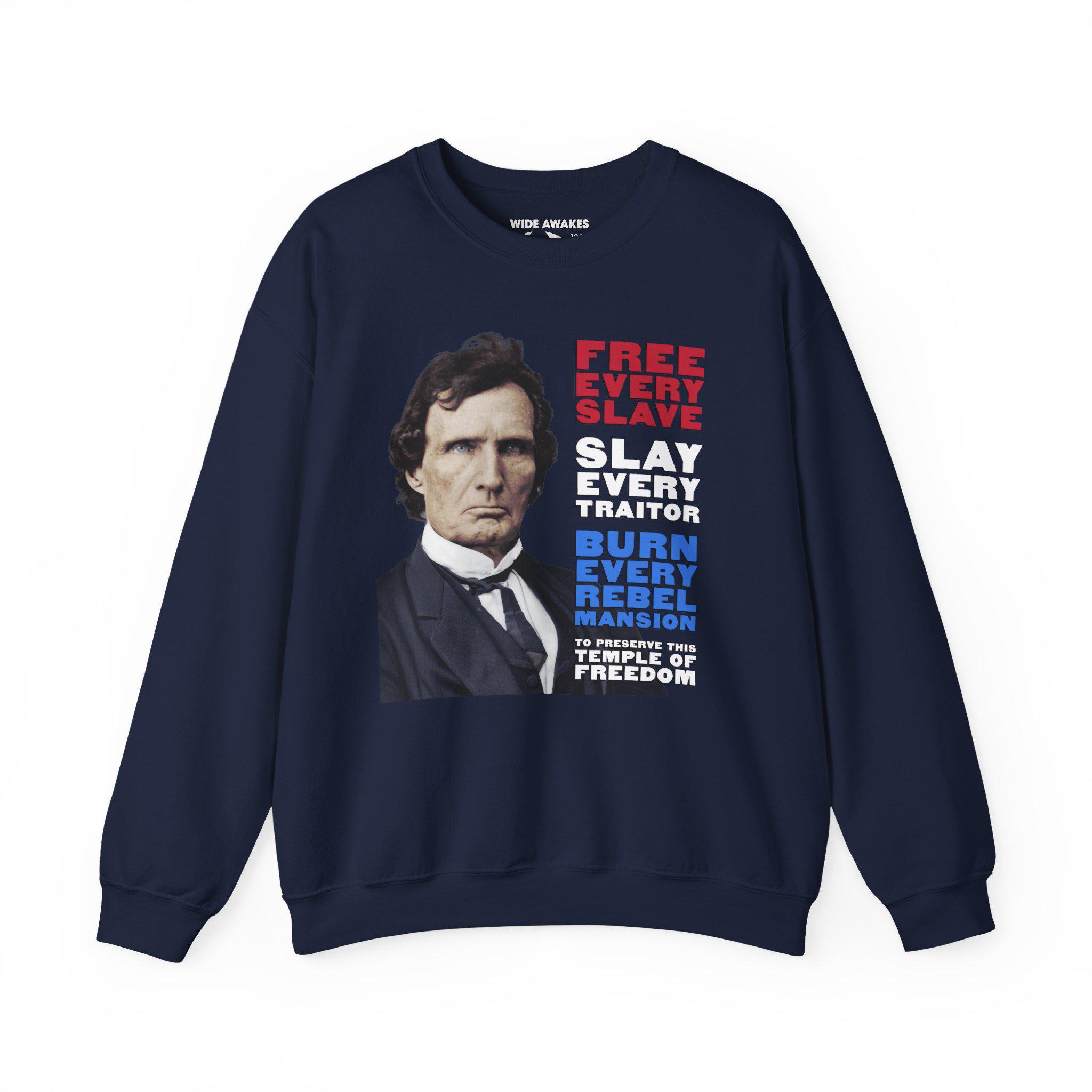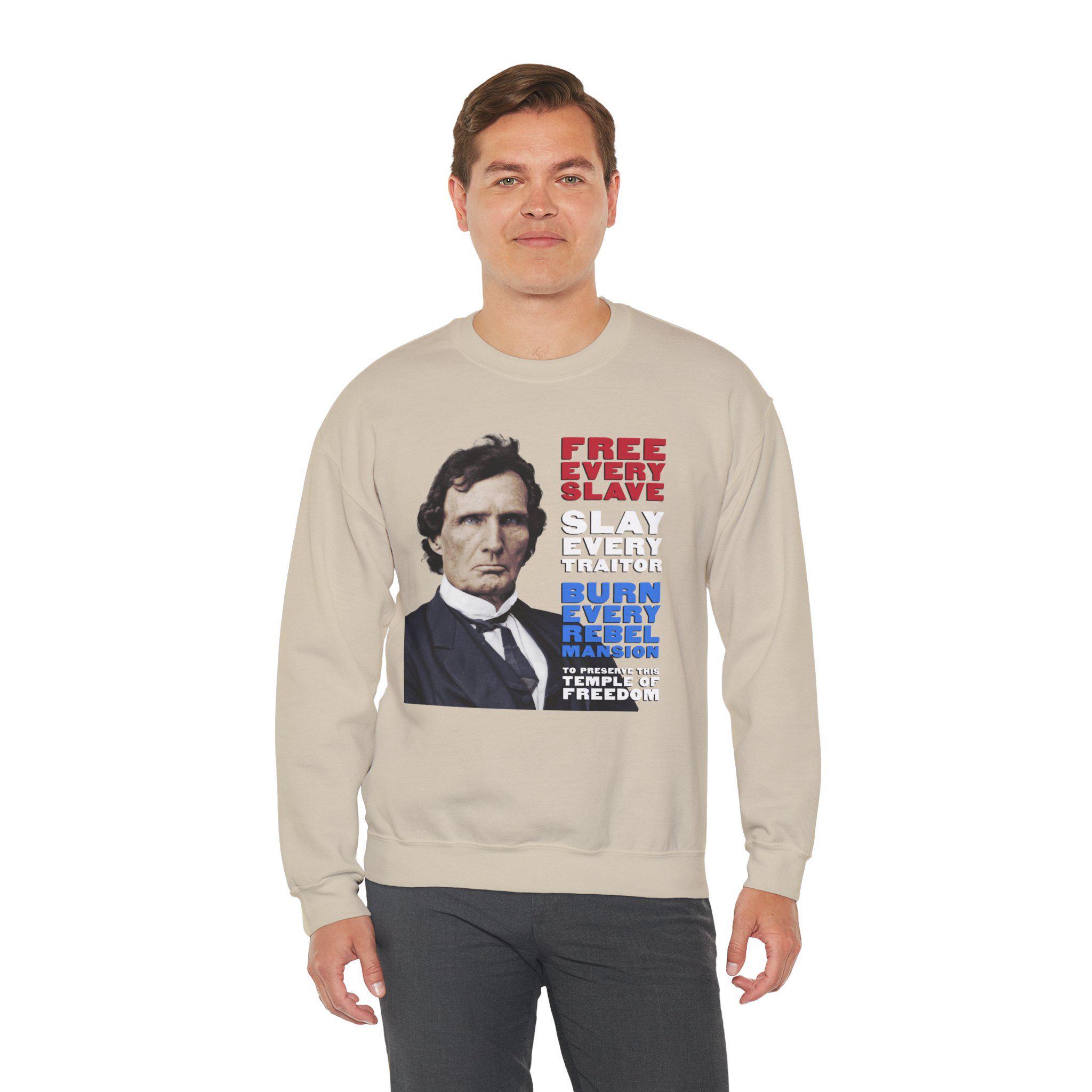 Stay cozy this fall with a crewneck sweatshirt that embodies the fierce resolve of Thaddeus Stevens. The design features a striking, colorized portrait of the Radical Republican leader, whose determined expression complements his legendary conviction. His paraphrased quote, in bold red, white, and blue, leaves no room for doubt: "FREE EVERY SLAVE, SLAY EVERY TRAITOR, BURN EVERY REBEL MANSION, TO PRESERVE THIS TEMPLE OF FREEDOM." It’s a powerful historical statement for anyone who believes that freedom, justice, and the Union must be defended with absolute resolve, no matter the cost.