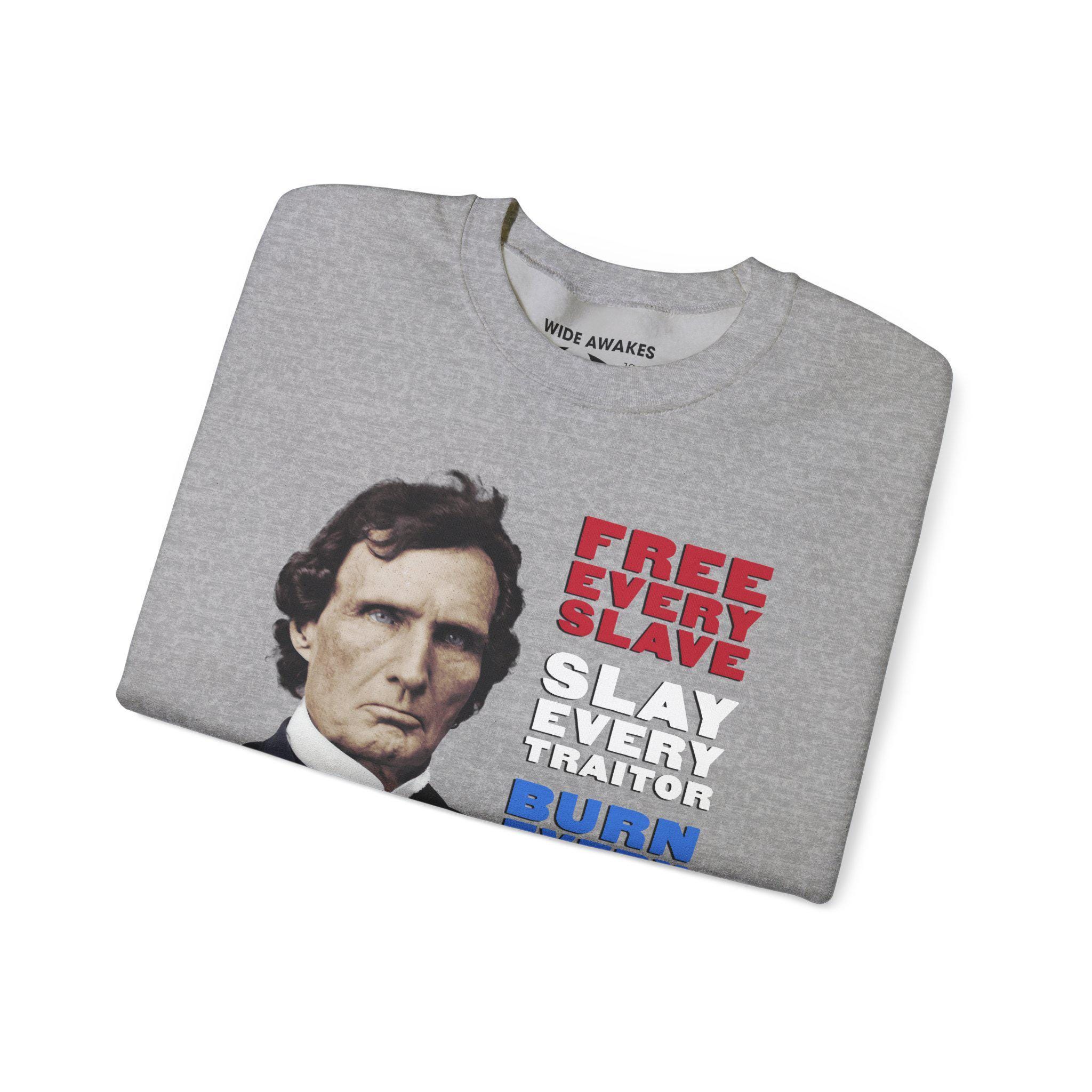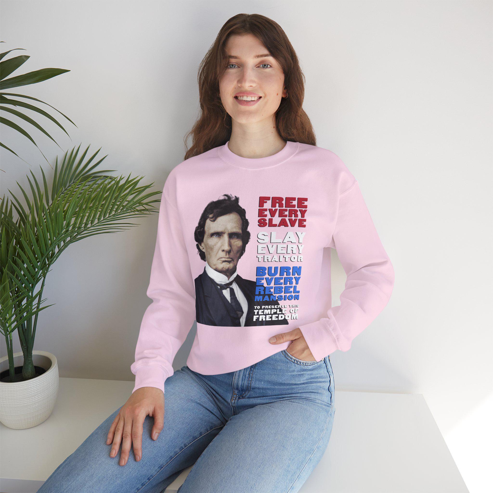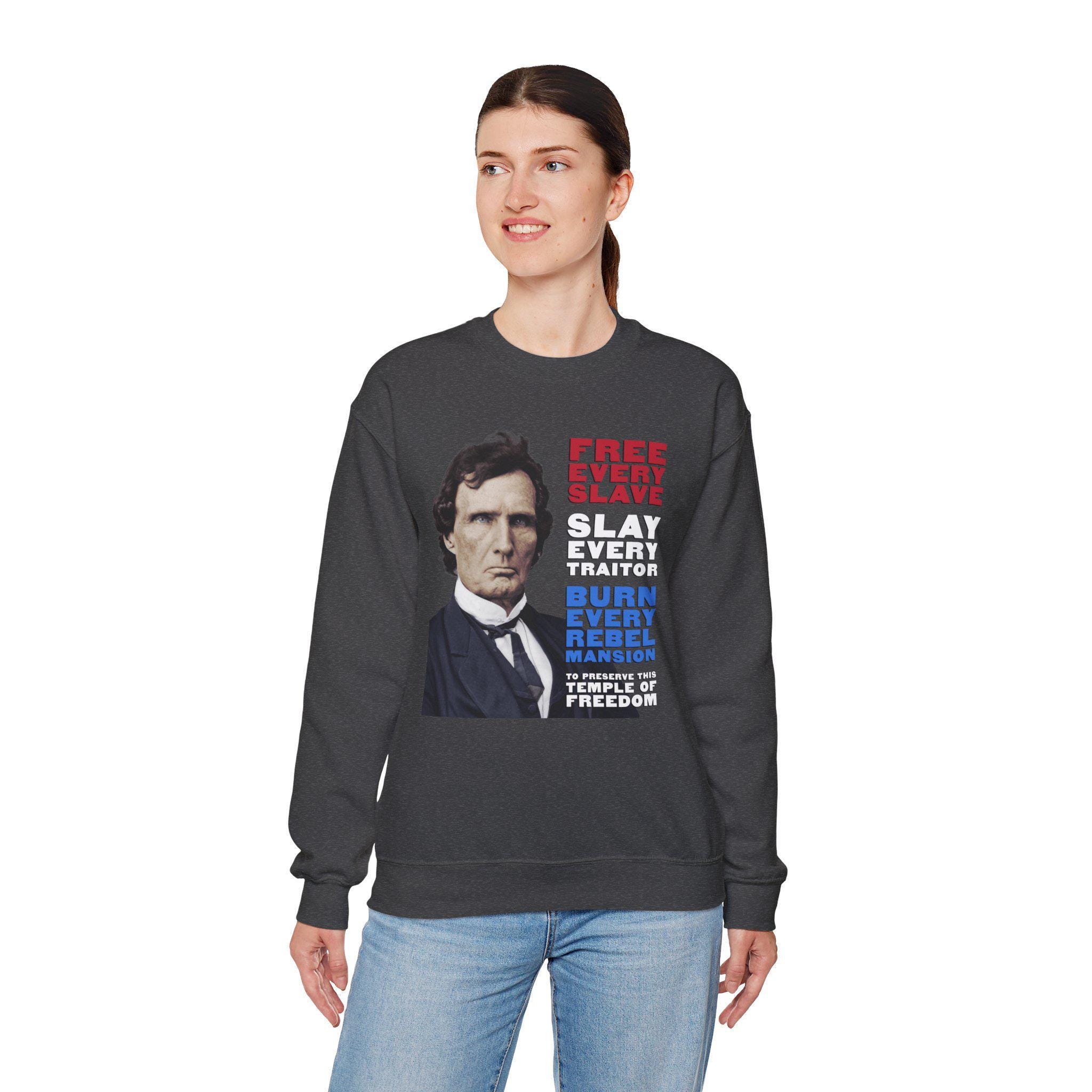 Stay cozy this fall with a crewneck sweatshirt that embodies the fierce resolve of Thaddeus Stevens. The design features a striking, colorized portrait of the Radical Republican leader, whose determined expression complements his legendary conviction. His paraphrased quote, in bold red, white, and blue, leaves no room for doubt: "FREE EVERY SLAVE, SLAY EVERY TRAITOR, BURN EVERY REBEL MANSION, TO PRESERVE THIS TEMPLE OF FREEDOM." It’s a powerful historical statement for anyone who believes that freedom, justice, and the Union must be defended with absolute resolve, no matter the cost.