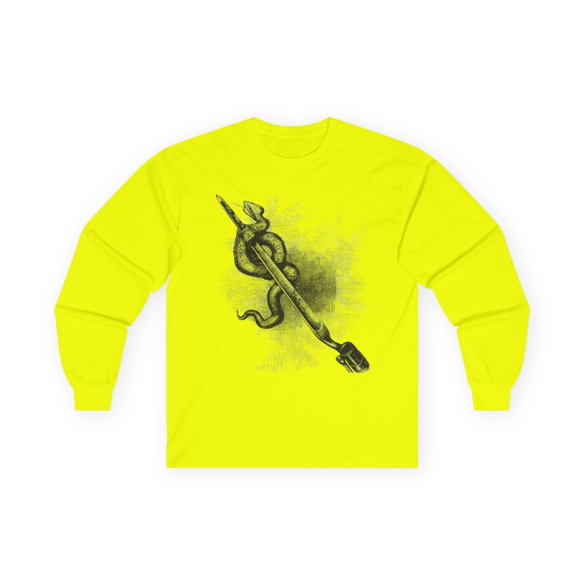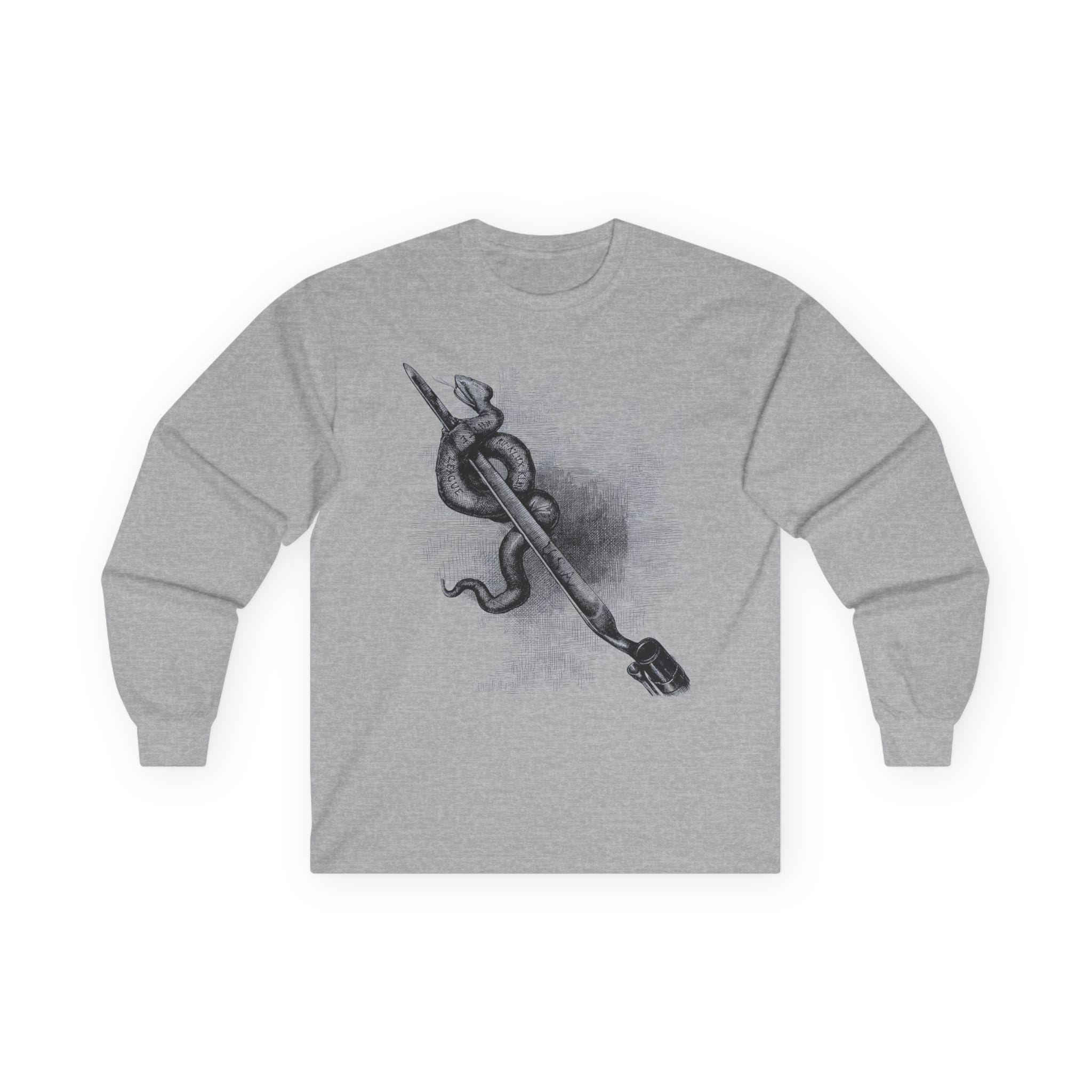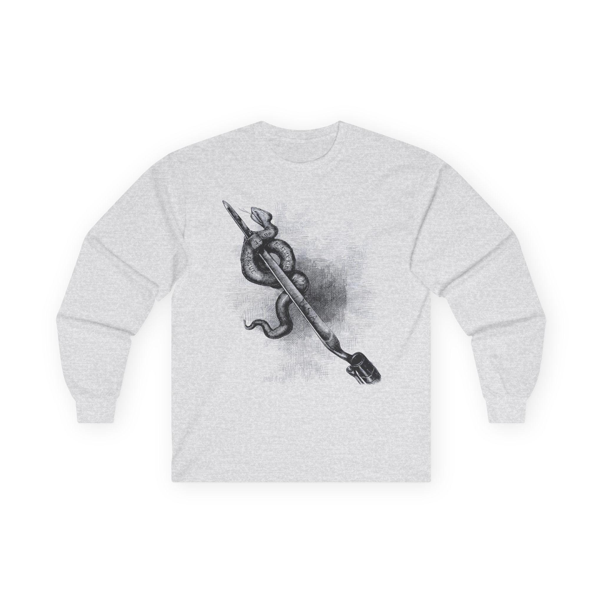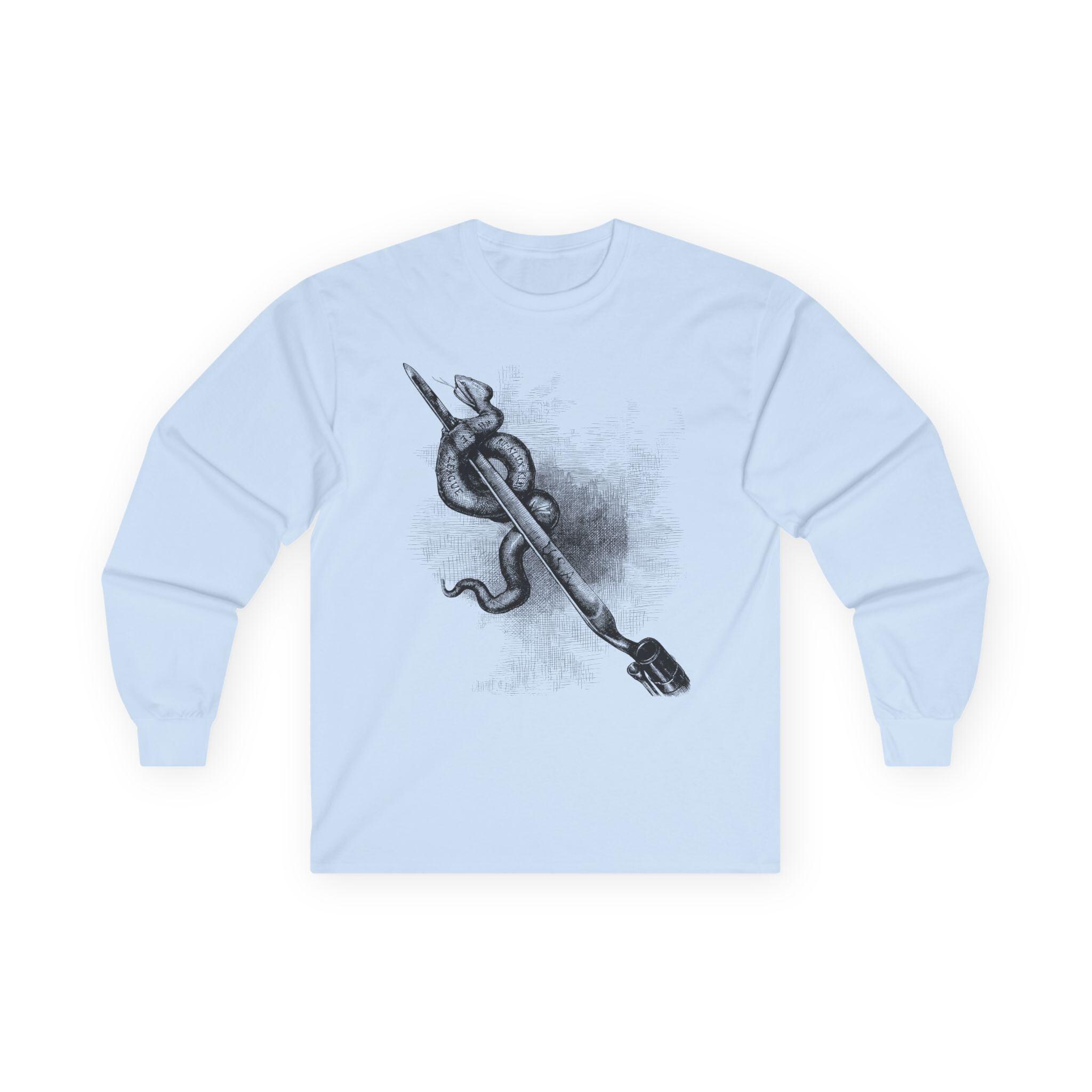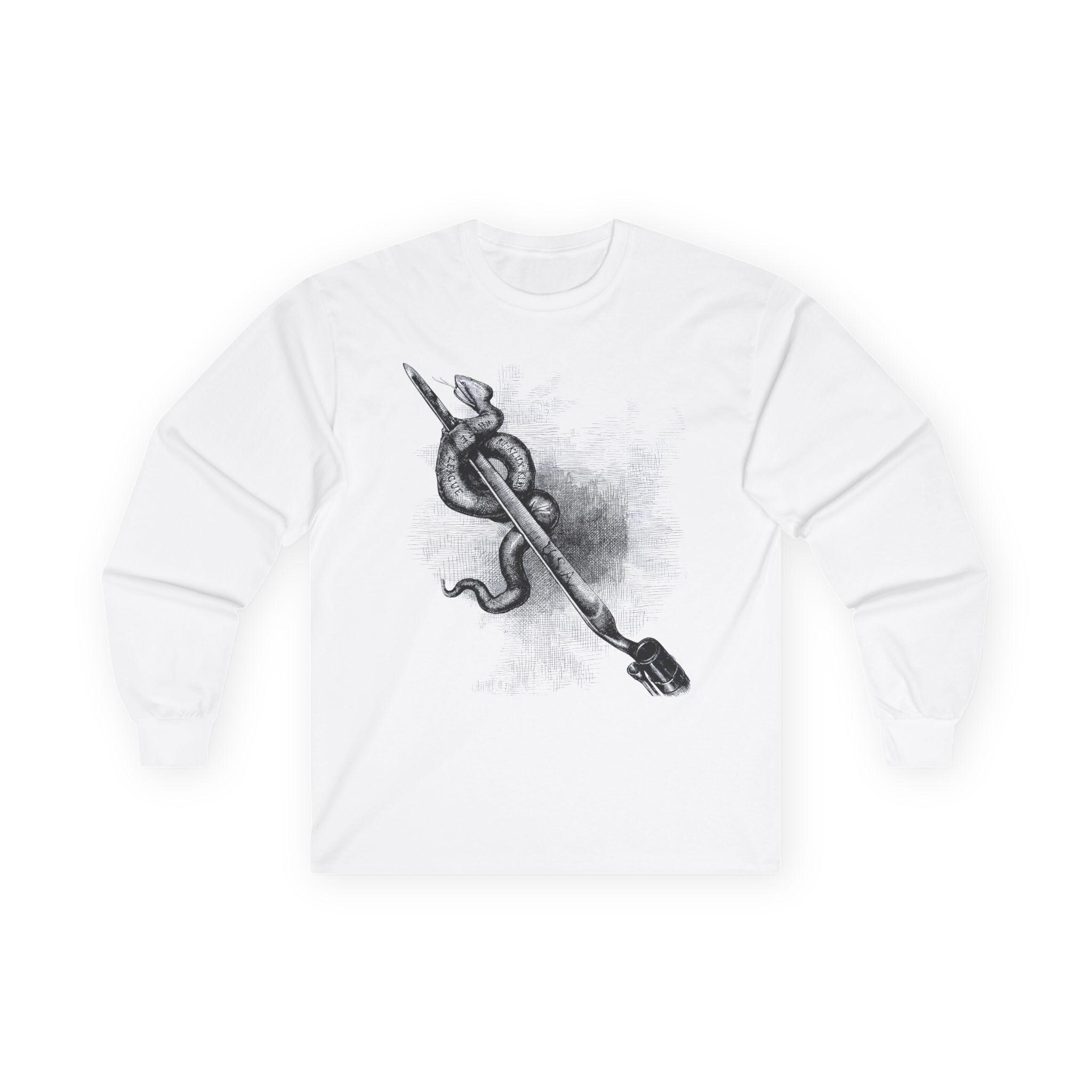 This comfortable longsleeve tee is a perfect layer for the fall and a powerful statement year-round. It features a restored illustration from an 1876 issue of Harper's Weekly by the legendary Thomas Nast. The art is a direct, uncompromising statement against domestic terrorism, showing a Union bayonet destroying a serpent labeled with the names of white supremacist terror groups like the Ku-Klux Klan. It's a piece of American history that remains profoundly relevant, a wearable tribute to the ongoing fight for civil rights.