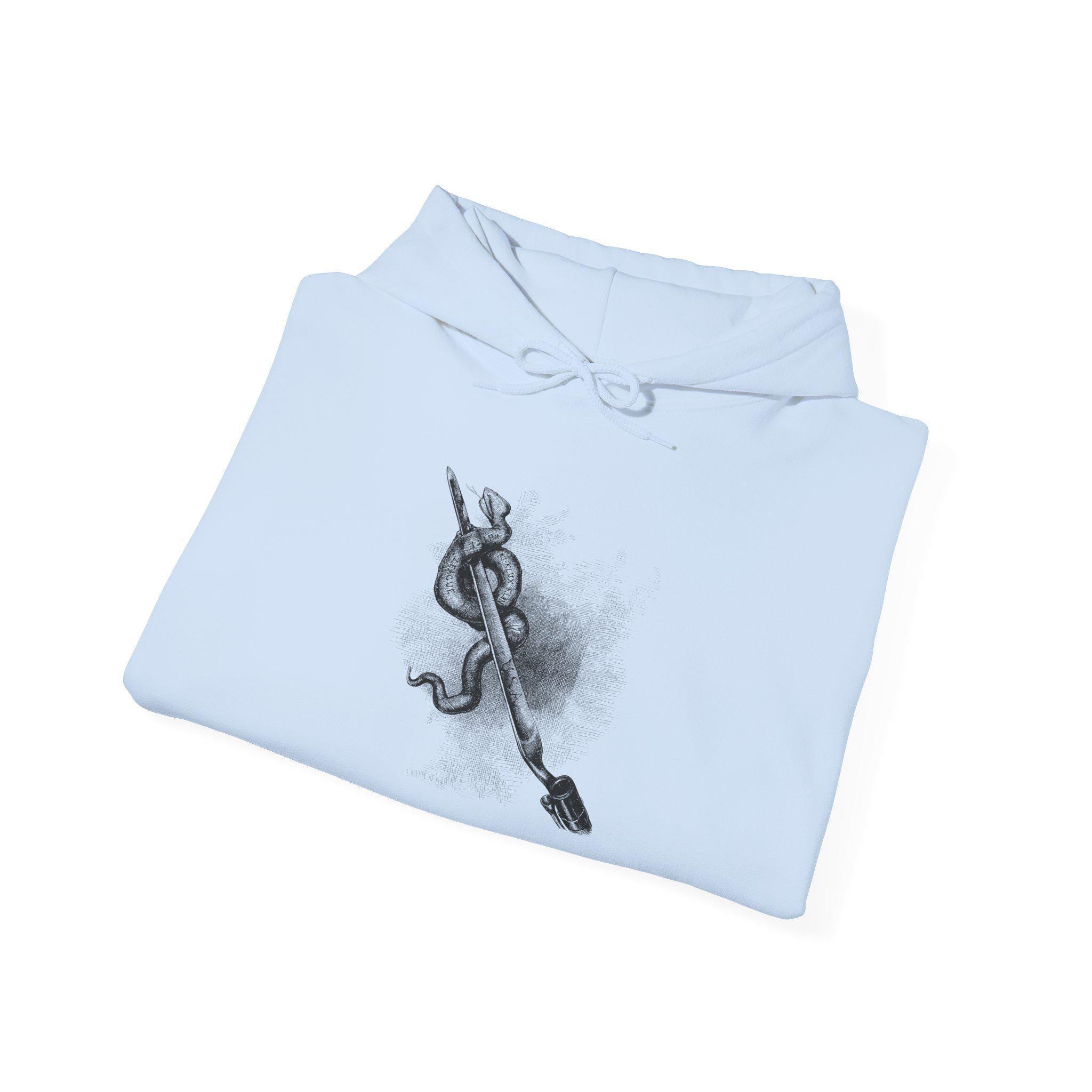 This warm and comfortable hoodie features a legendary piece of American political art by the great Thomas Nast. This cartoon, from a post-Civil War issue of Harper's Weekly, visualizes the ongoing battle for the soul of the nation. Nast depicts the various white supremacist terror groups of the Reconstruction era as a single, monstrous serpent being destroyed by a bayonet of federal authority. It's a powerful argument that the fight for the Union and its ideals did not end at Appomattox. With a soft fleece interior and a spacious front pocket, this is a practical and principled piece of wearable history.