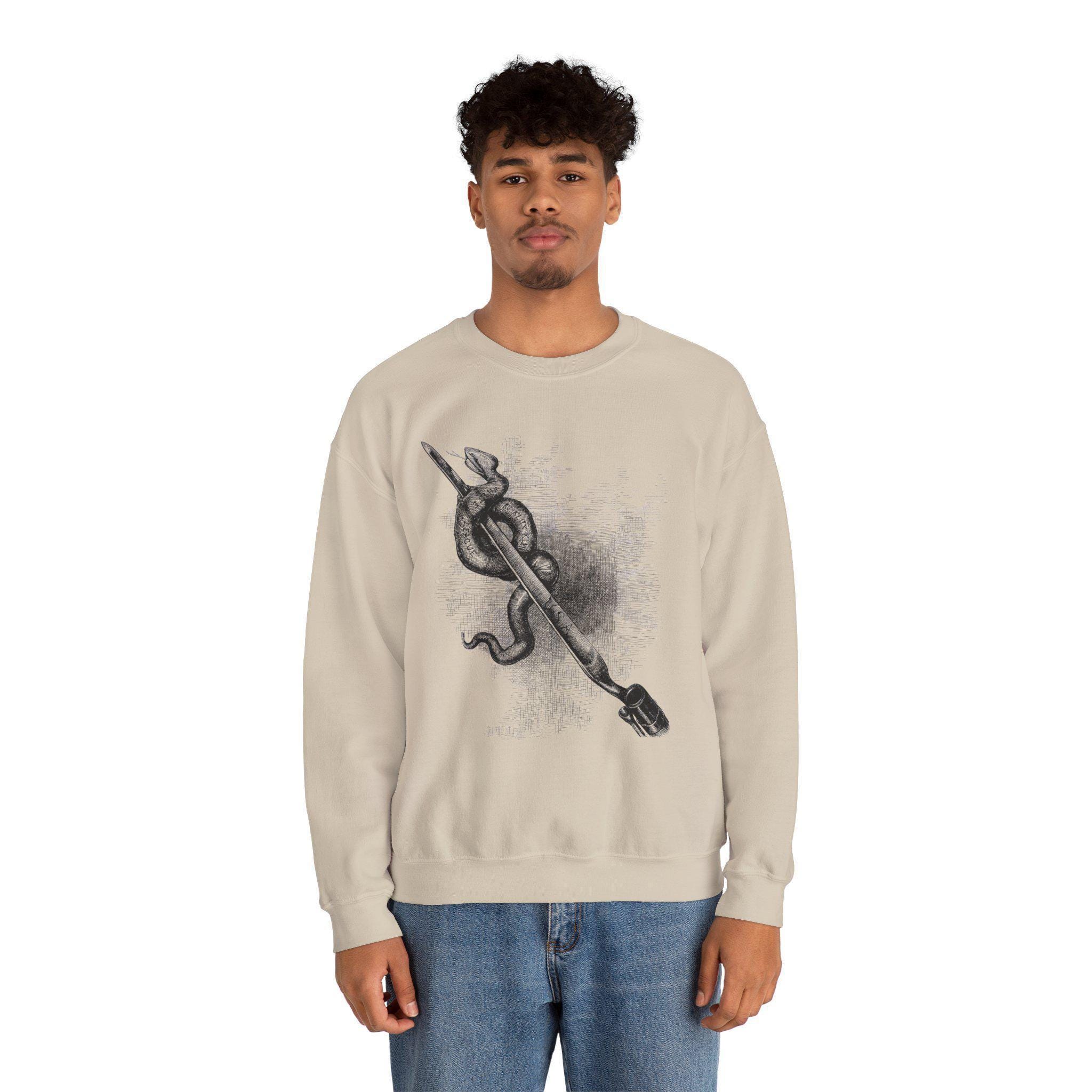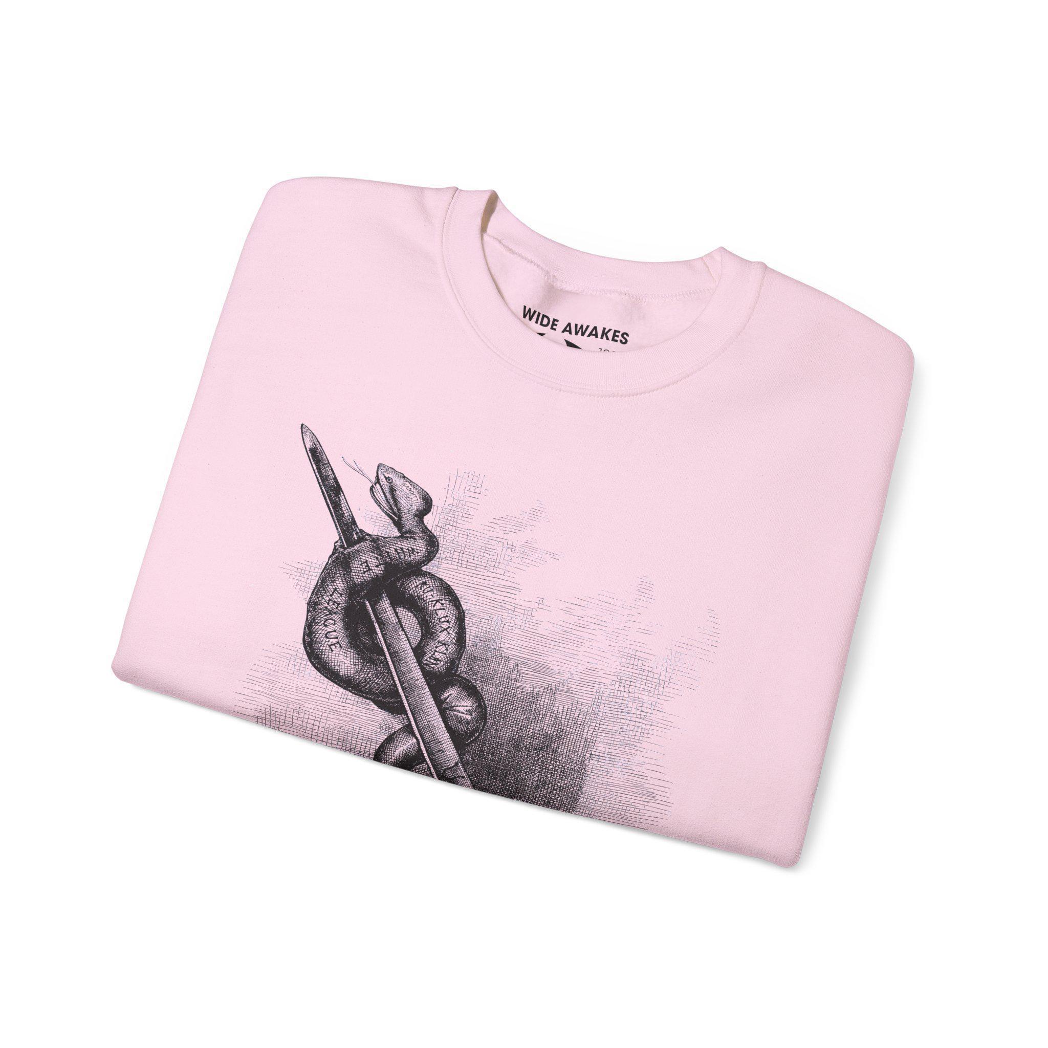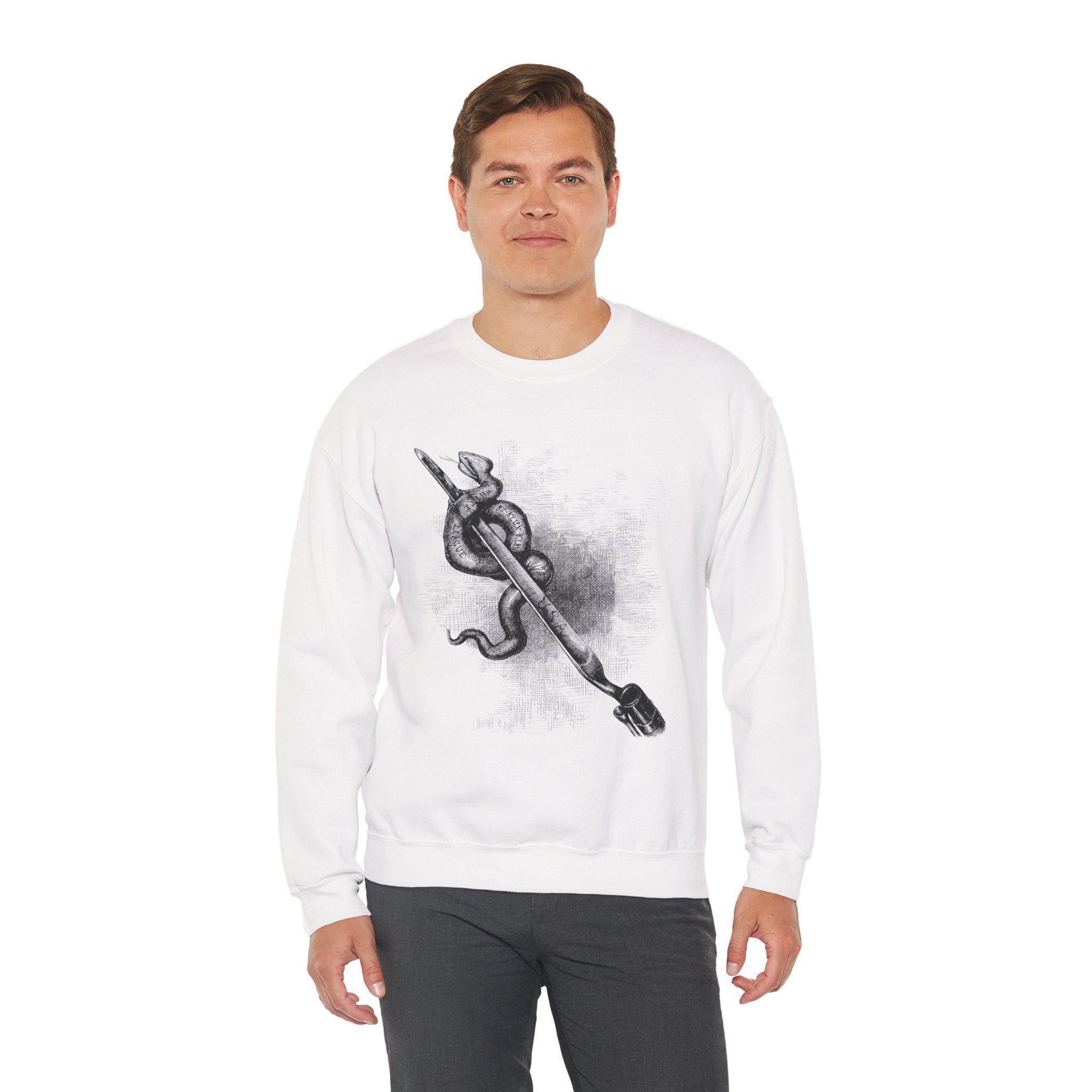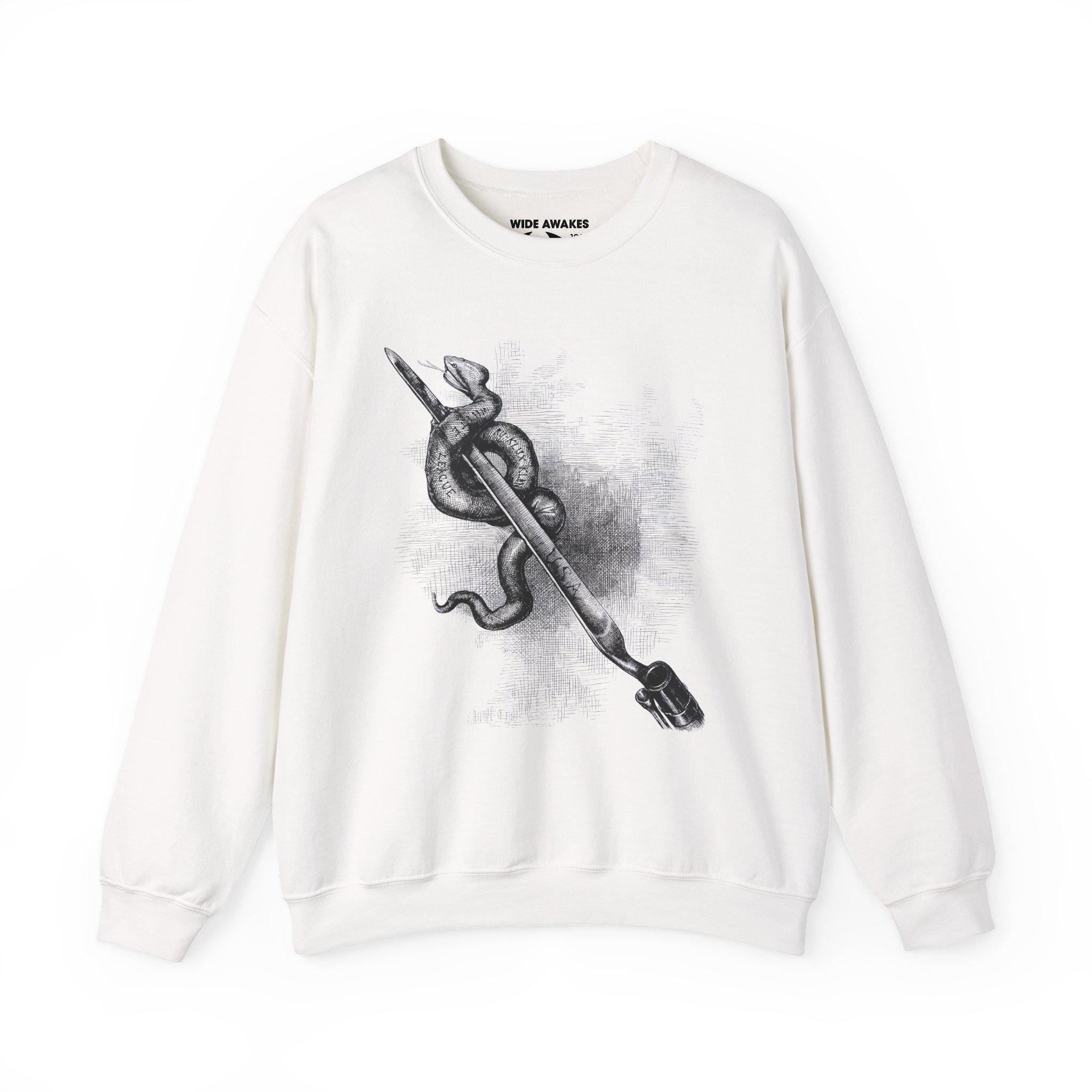 Stay warm this fall with a powerful and historically significant piece of American political art. This cozy crewneck sweatshirt features a restored illustration by the legendary cartoonist, Thomas Nast. Originally published in 1876, this image is a stark, direct metaphor for the necessary fight against white supremacist terror during the Reconstruction era. It depicts a Union bayonet—representing the power and authority of the United States government—decisively skewering a serpent labeled with the names of terror groups, including the "Ku-Klux Klan." It is a timeless and uncompromising statement that there can be no quarter given to organized hatred. Product features - Knit in one piece to reduce fabric waste and enhance design allure. - Highly elastic ribbed knit collar that retains its shape. - Constructed for adults with a focus on comfort and durability. - Crafted from ethically sourced materials with safety-certified dyes. - Multiple embroidery options available for a personalized touch.