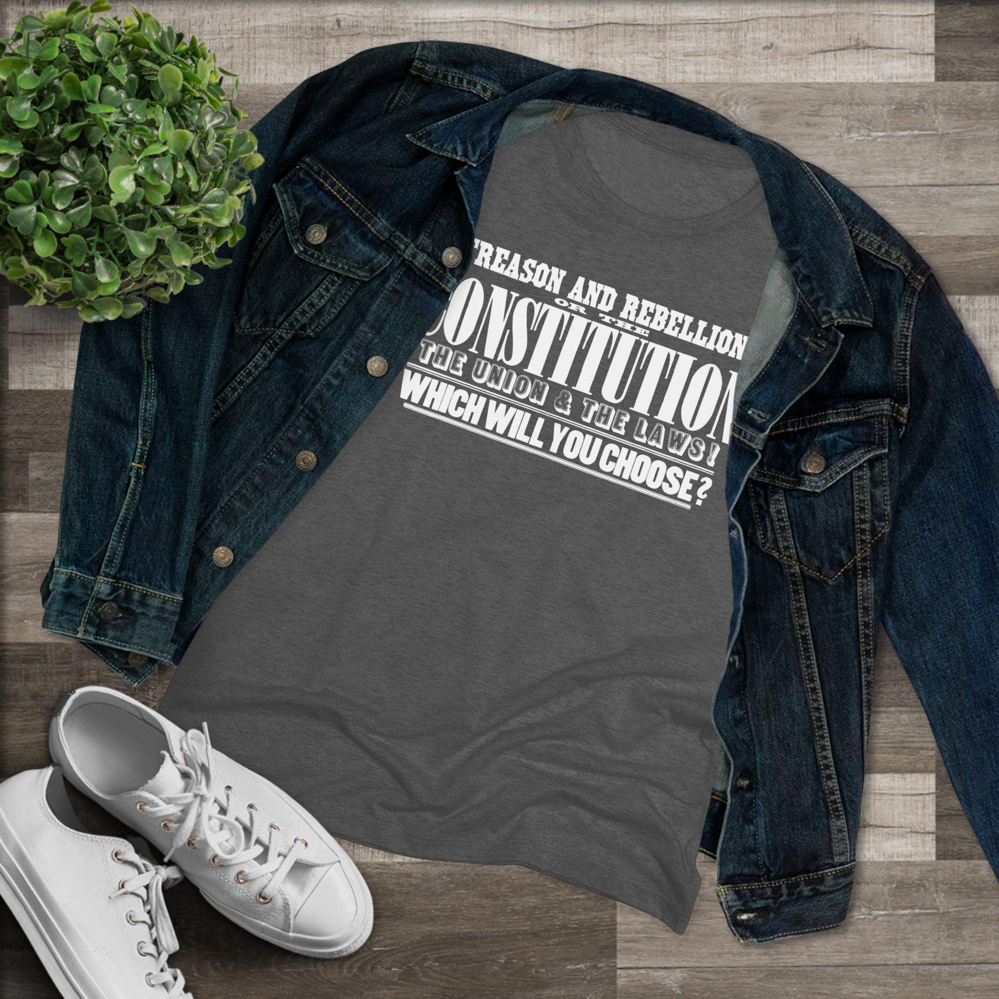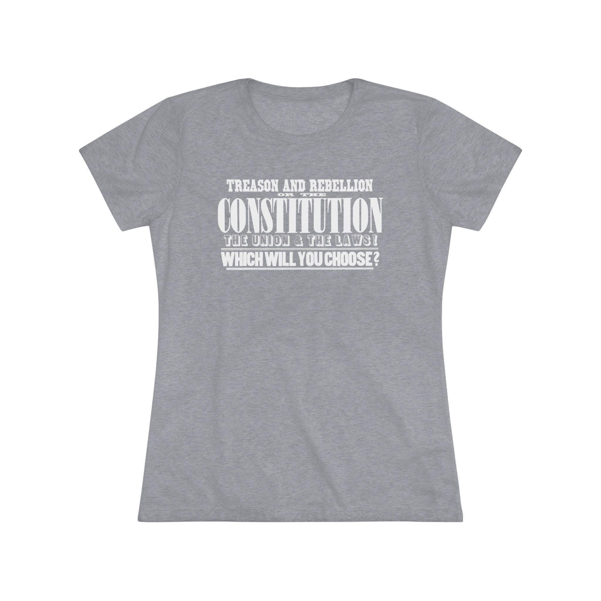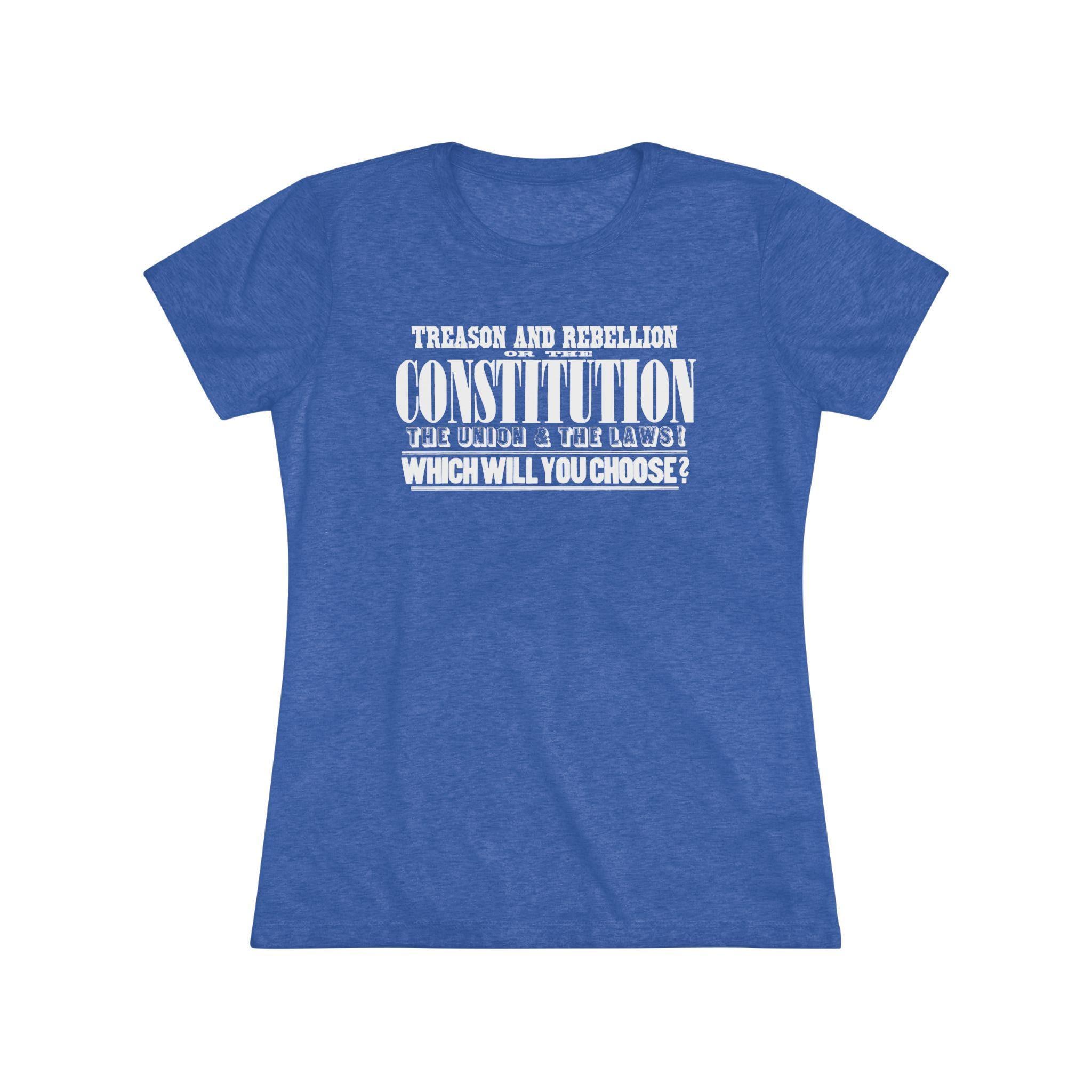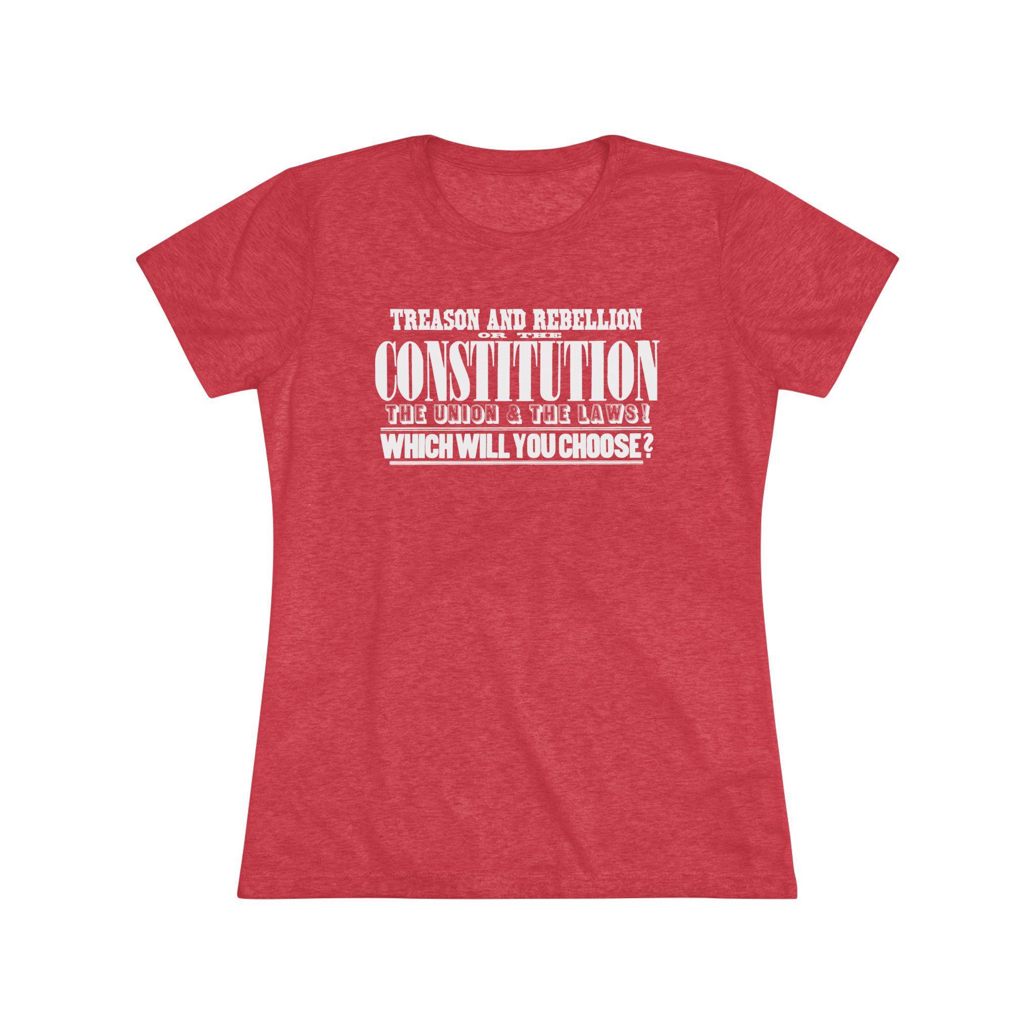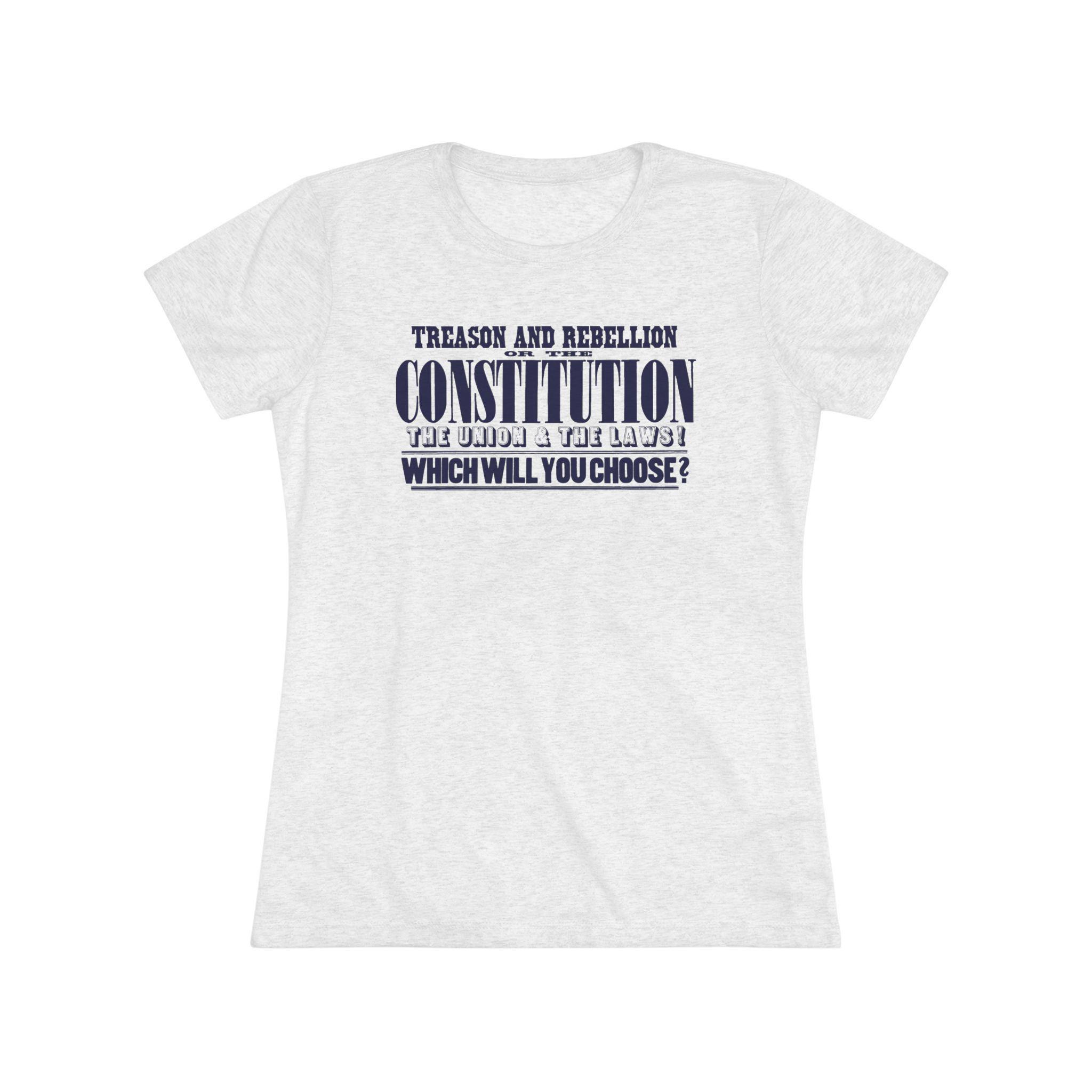 This women's t-shirt combines a powerful, historically significant message with a comfortable and stylish fit. The design is taken from a real 1861 Civil War rally poster and poses a fundamental American question in a beautiful 19th-century wood type. It asks every citizen to choose between "Treason and Rebellion" and "The Constitution, The Union & The Laws." This soft, contoured tee is a perfect way to wear a piece of profound history that speaks directly to the core principles of the nation.
