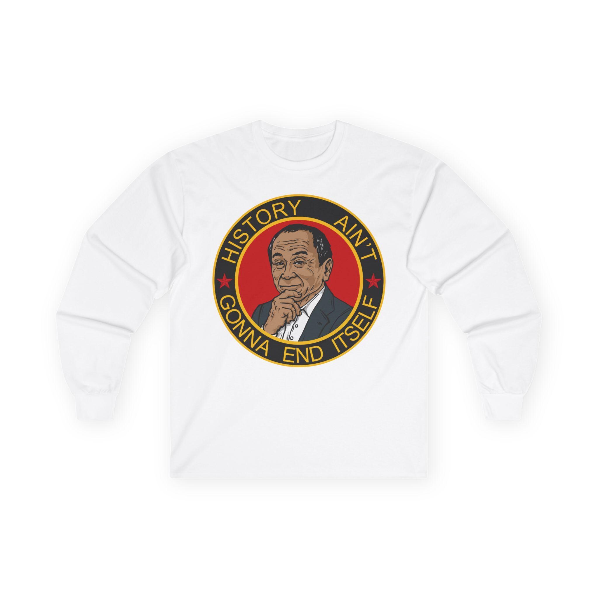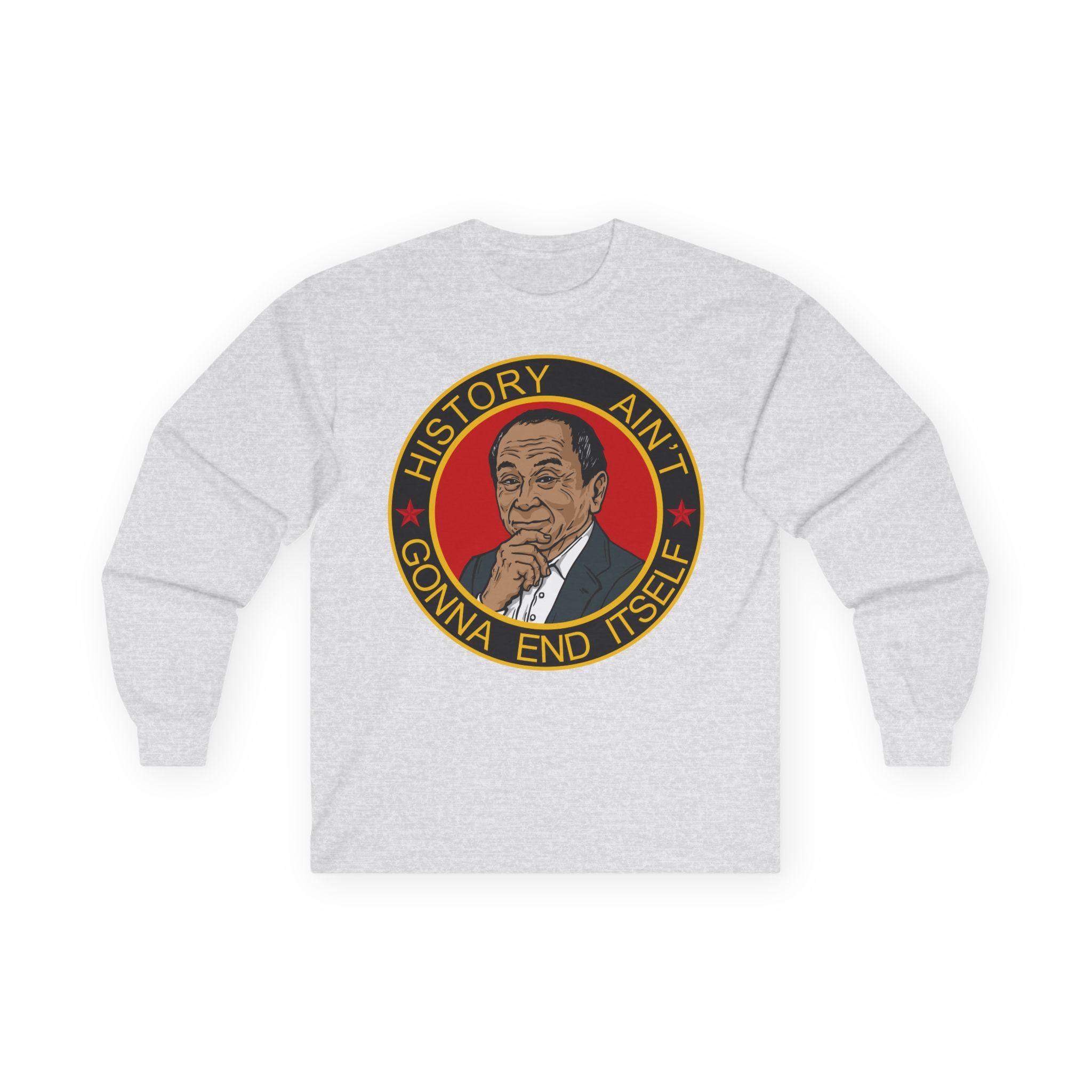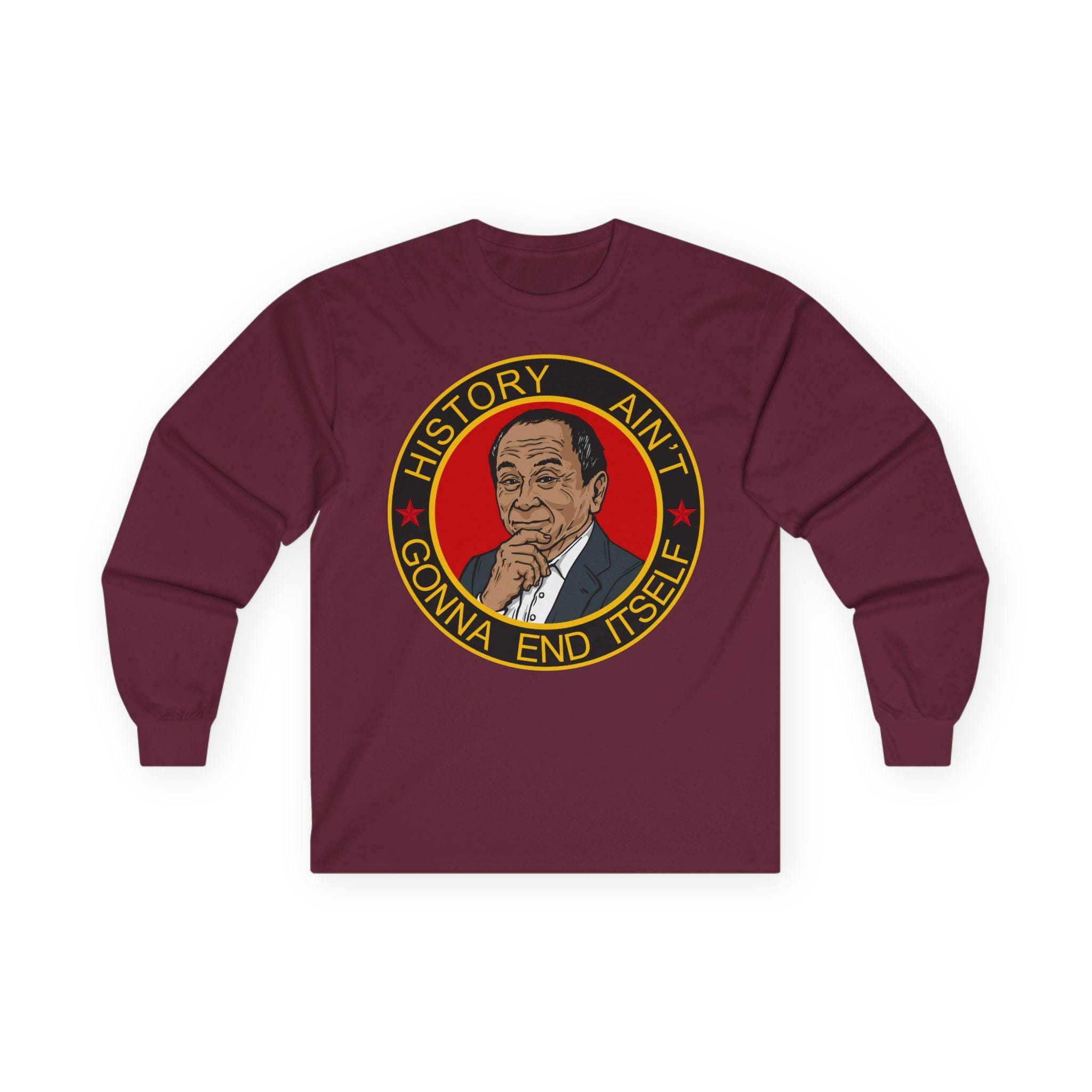 This comfortable longsleeve tee is a subtle and intelligent piece that celebrates the deeper warning within a famous political theory. The design features a pensive portrait of a certain philosopher, acknowledging that the fight isn't over. The motto "HISTORY AIN'T GONNA END ITSELF" serves as a call to action, perfect for layering in the fall, reminding us that peace and democracy must be actively defended from those who would restart history for their own glory.