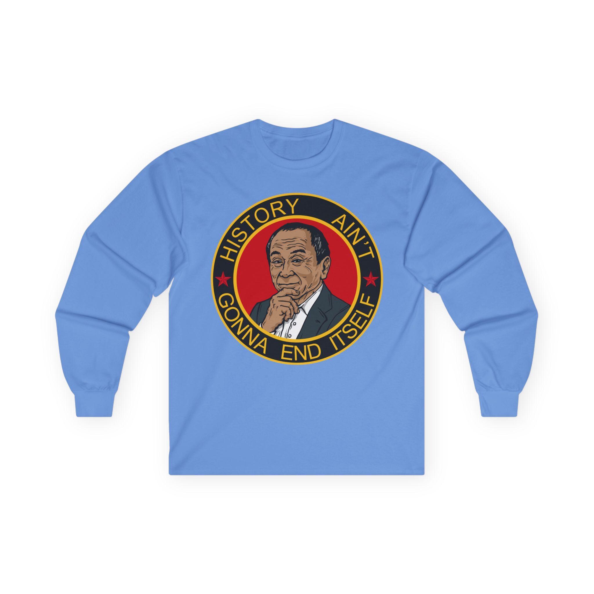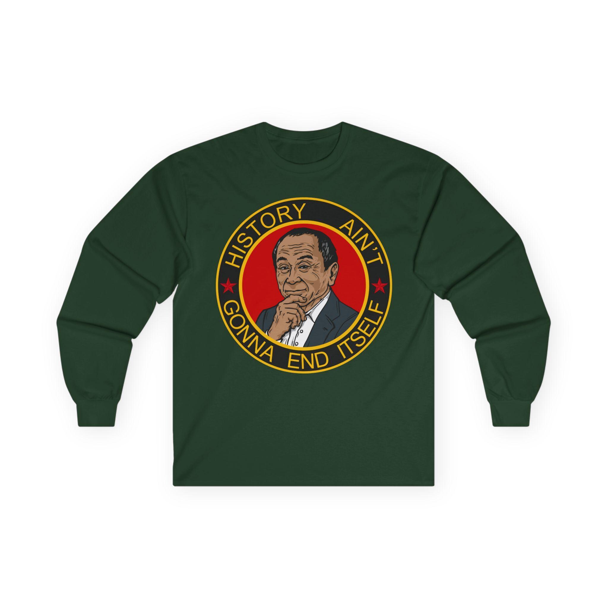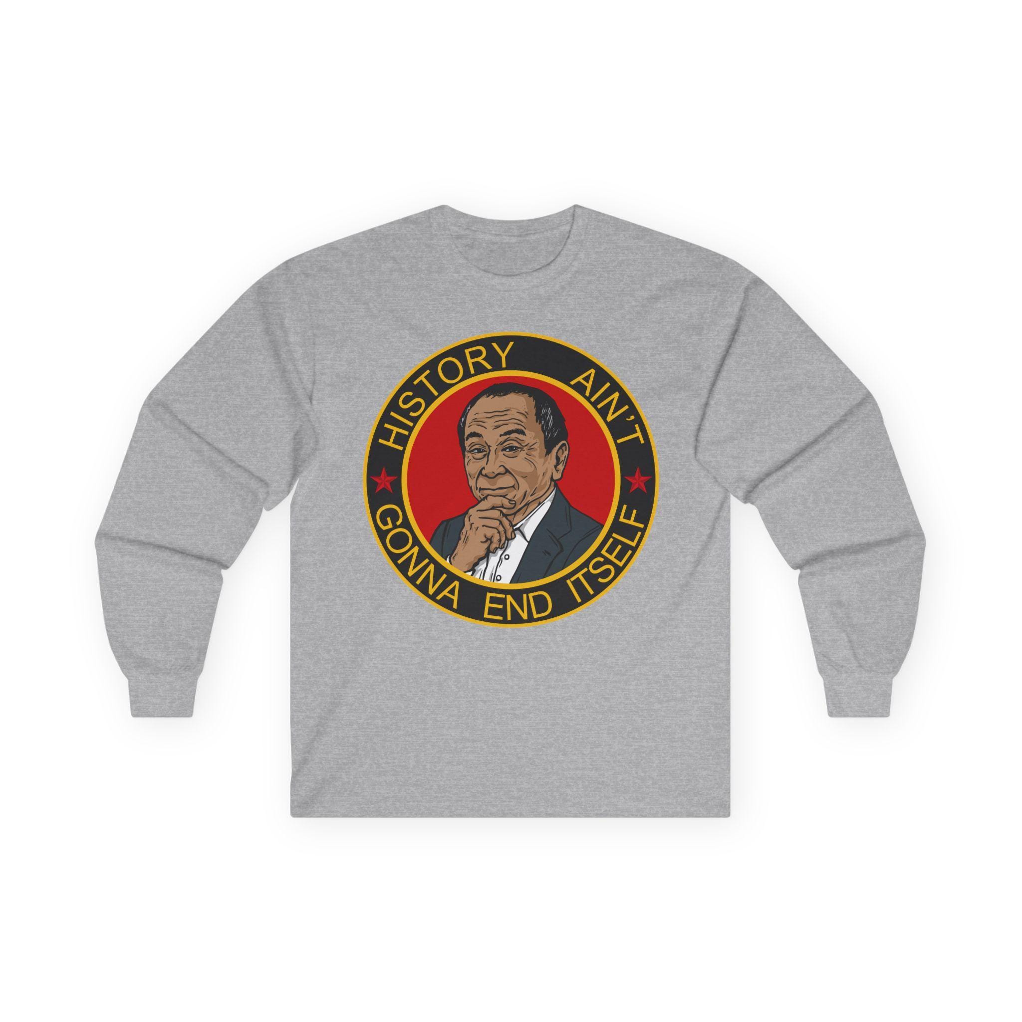 This comfortable longsleeve tee is a subtle and intelligent piece that celebrates the deeper warning within a famous political theory. The design features a pensive portrait of a certain philosopher, acknowledging that the fight isn't over. The motto "HISTORY AIN'T GONNA END ITSELF" serves as a call to action, perfect for layering in the fall, reminding us that peace and democracy must be actively defended from those who would restart history for their own glory.