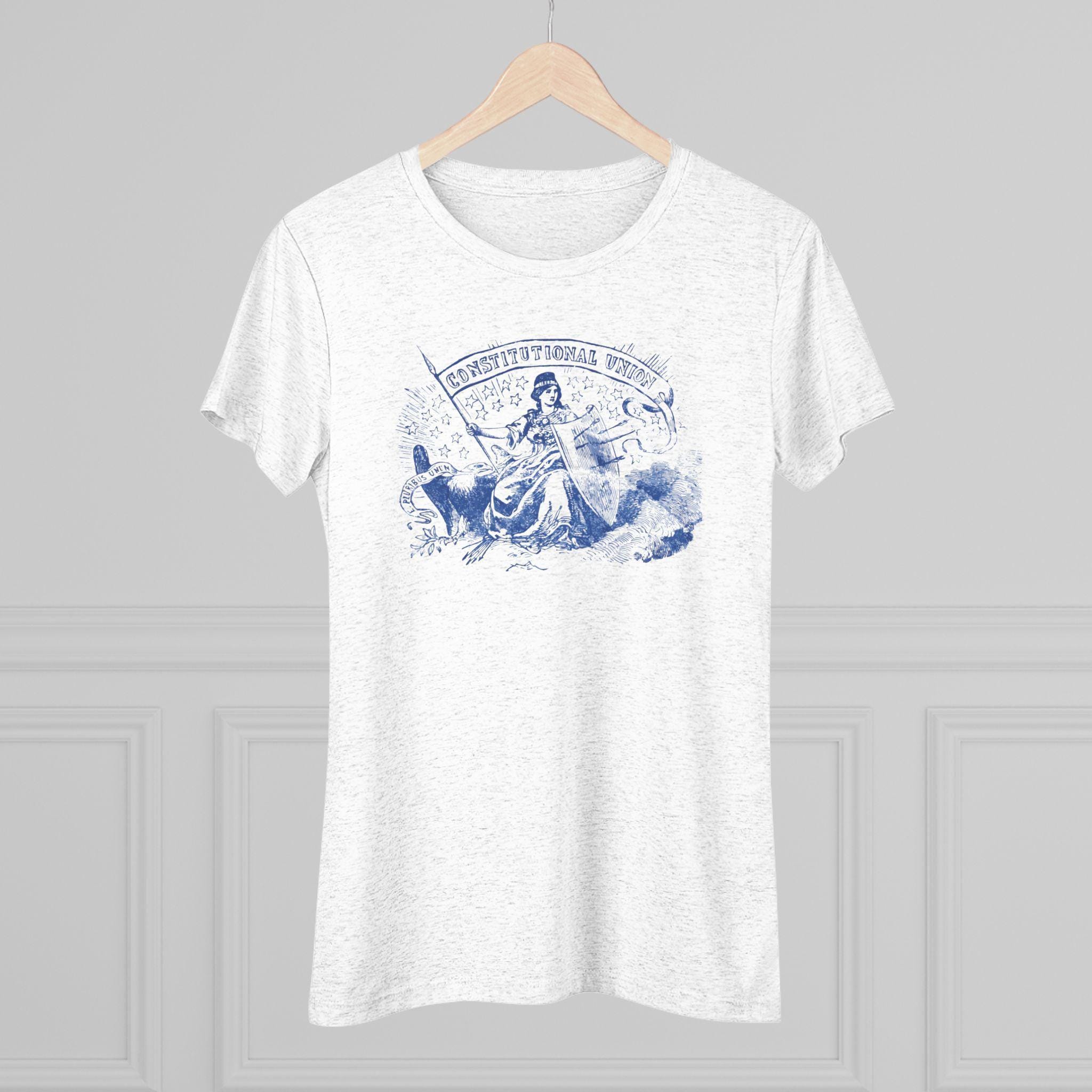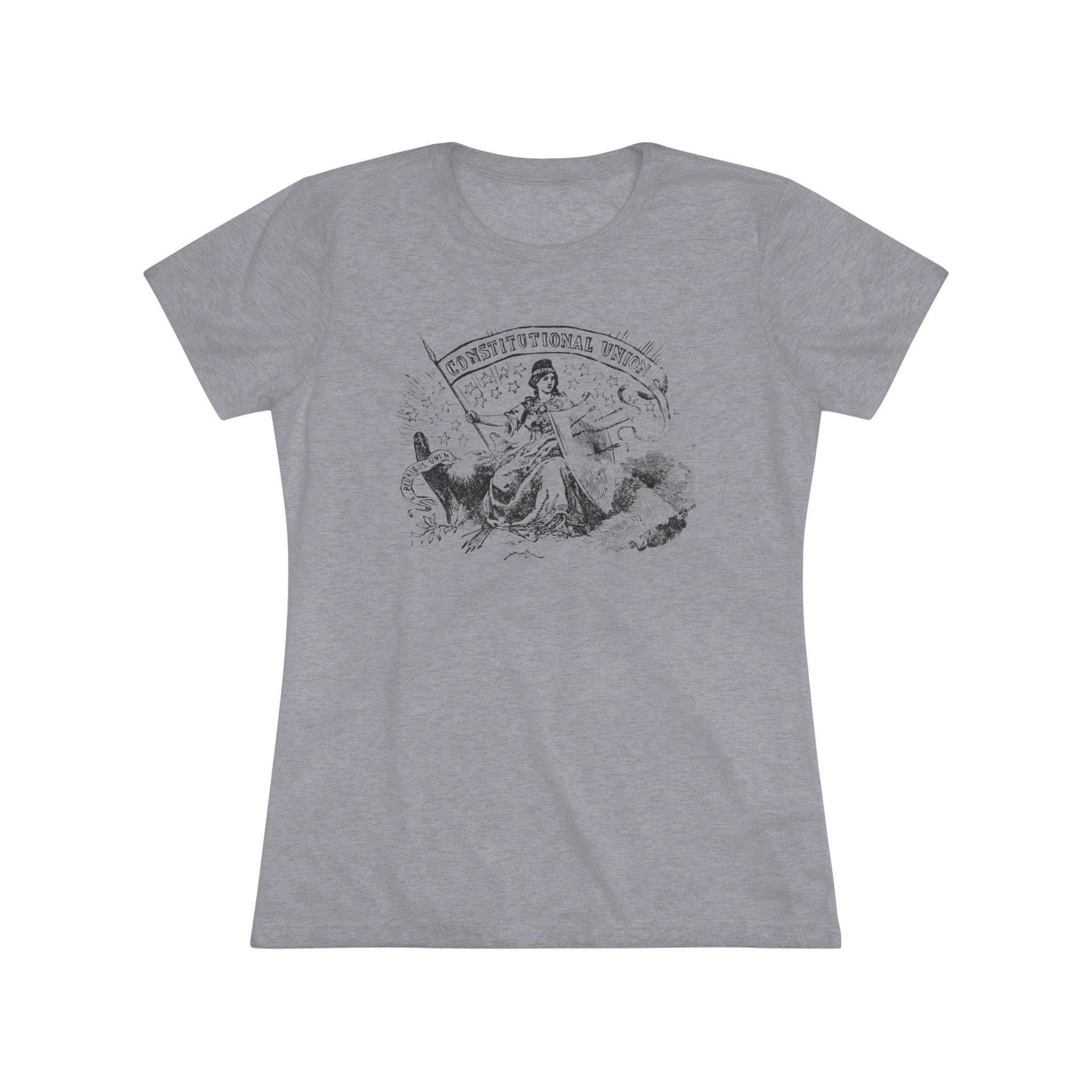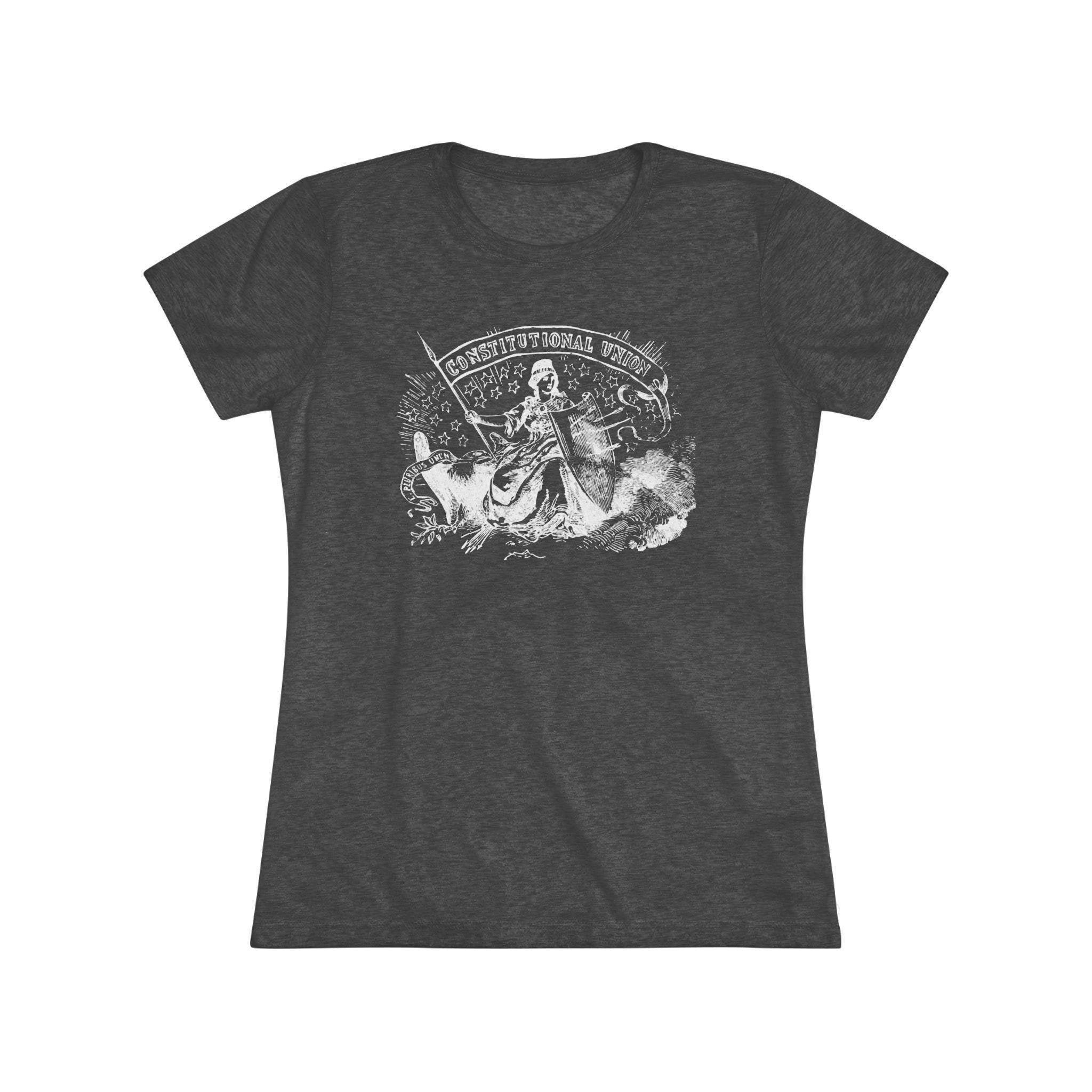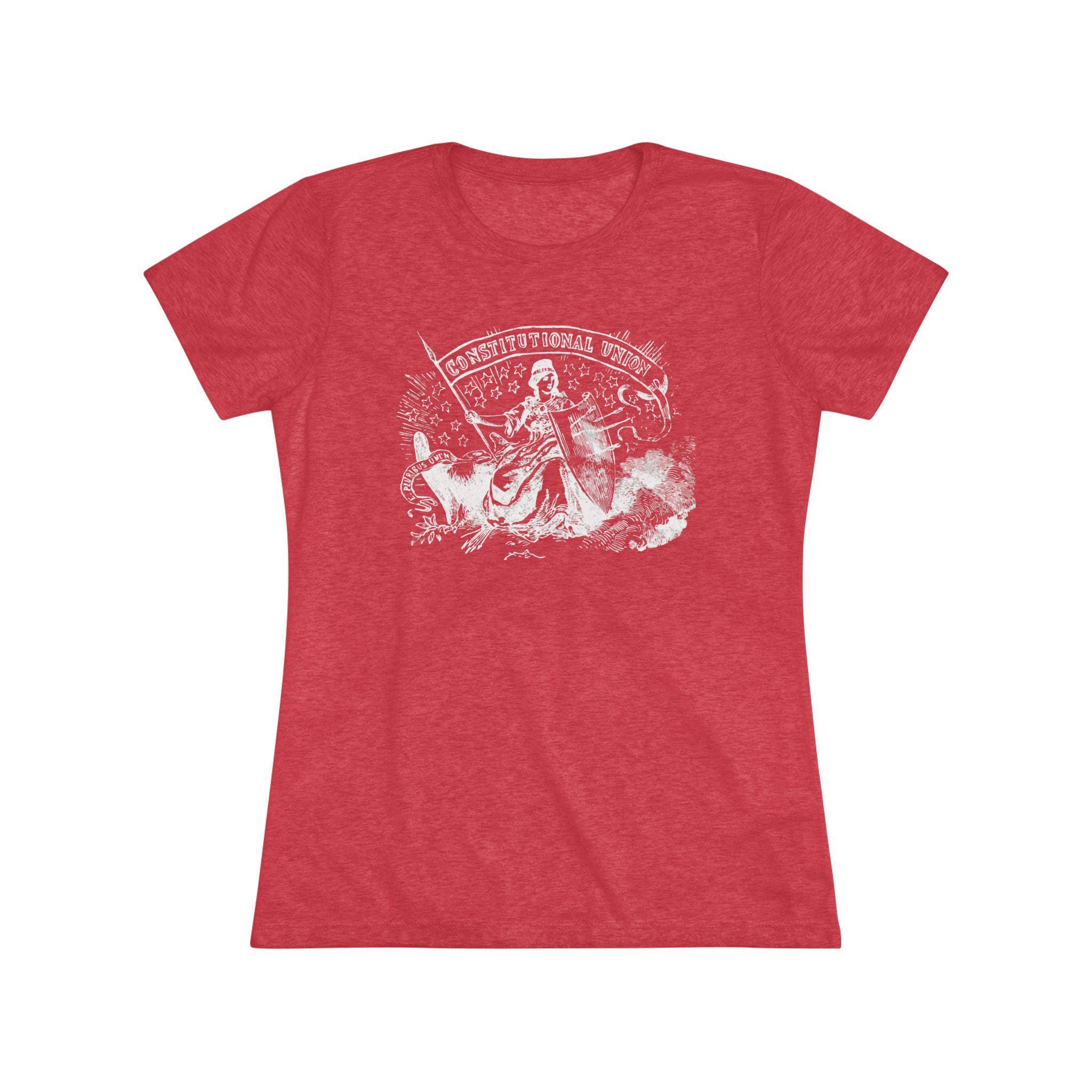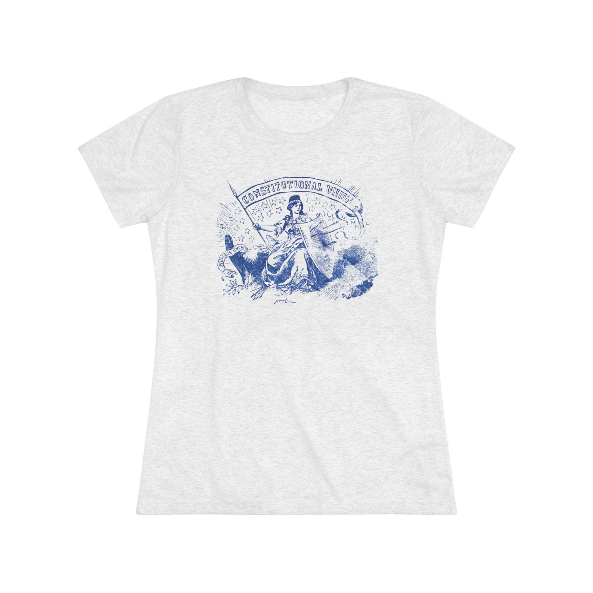 This women's t-shirt combines a powerful historical allegory with a comfortable and stylish fit. The design, restored from a pro-Union stamp, depicts the figure of Freedom protecting the American eagle even after her shield has been pierced by arrows—a symbol of the nation's resilience. The design carries two powerful mottos: "CONSTITUTIONAL UNION" and "E PLURIBUS UNUM." This soft, contoured tee is a perfect way to wear a piece of profound history that speaks to the enduring strength of American ideals.